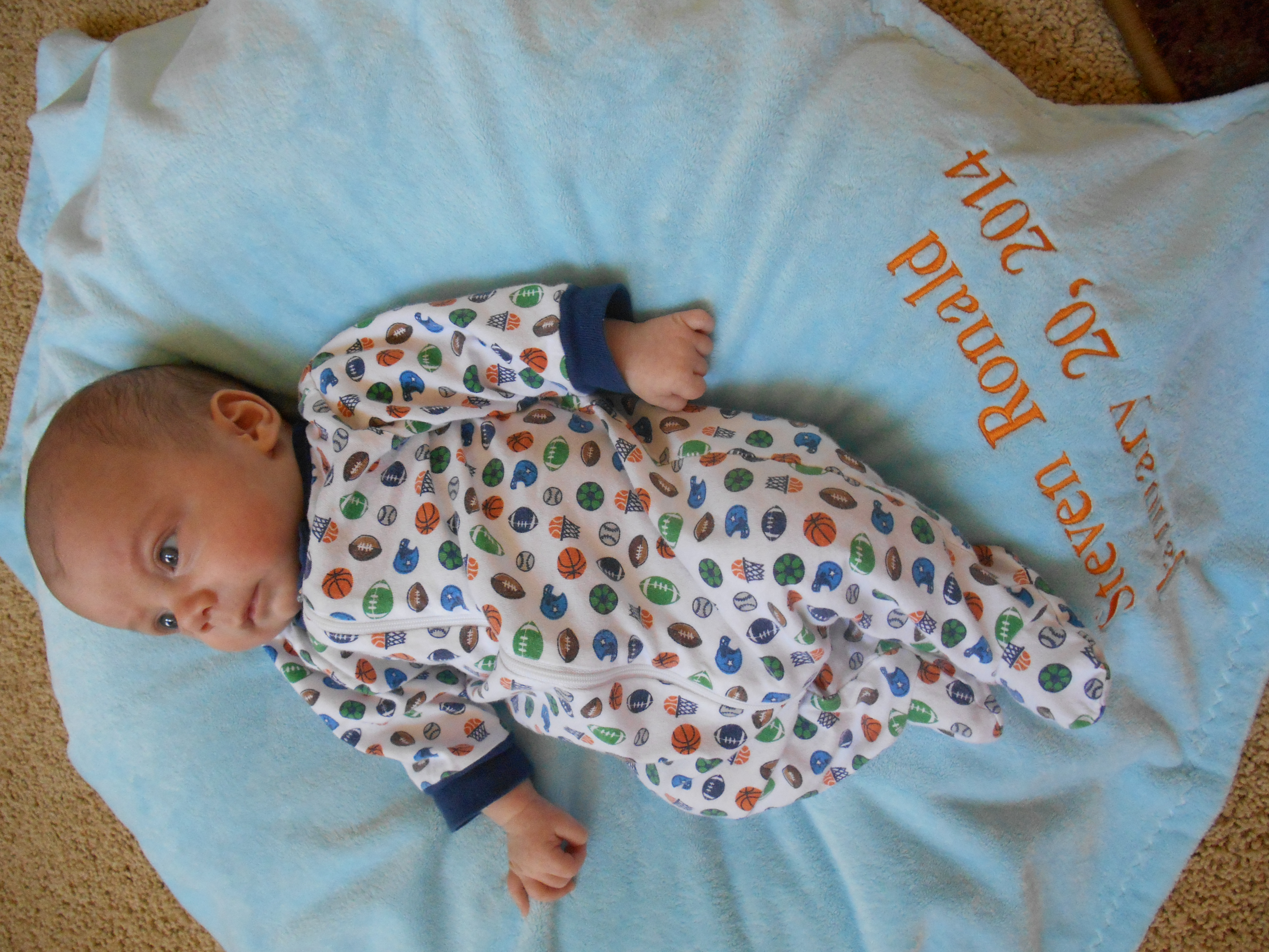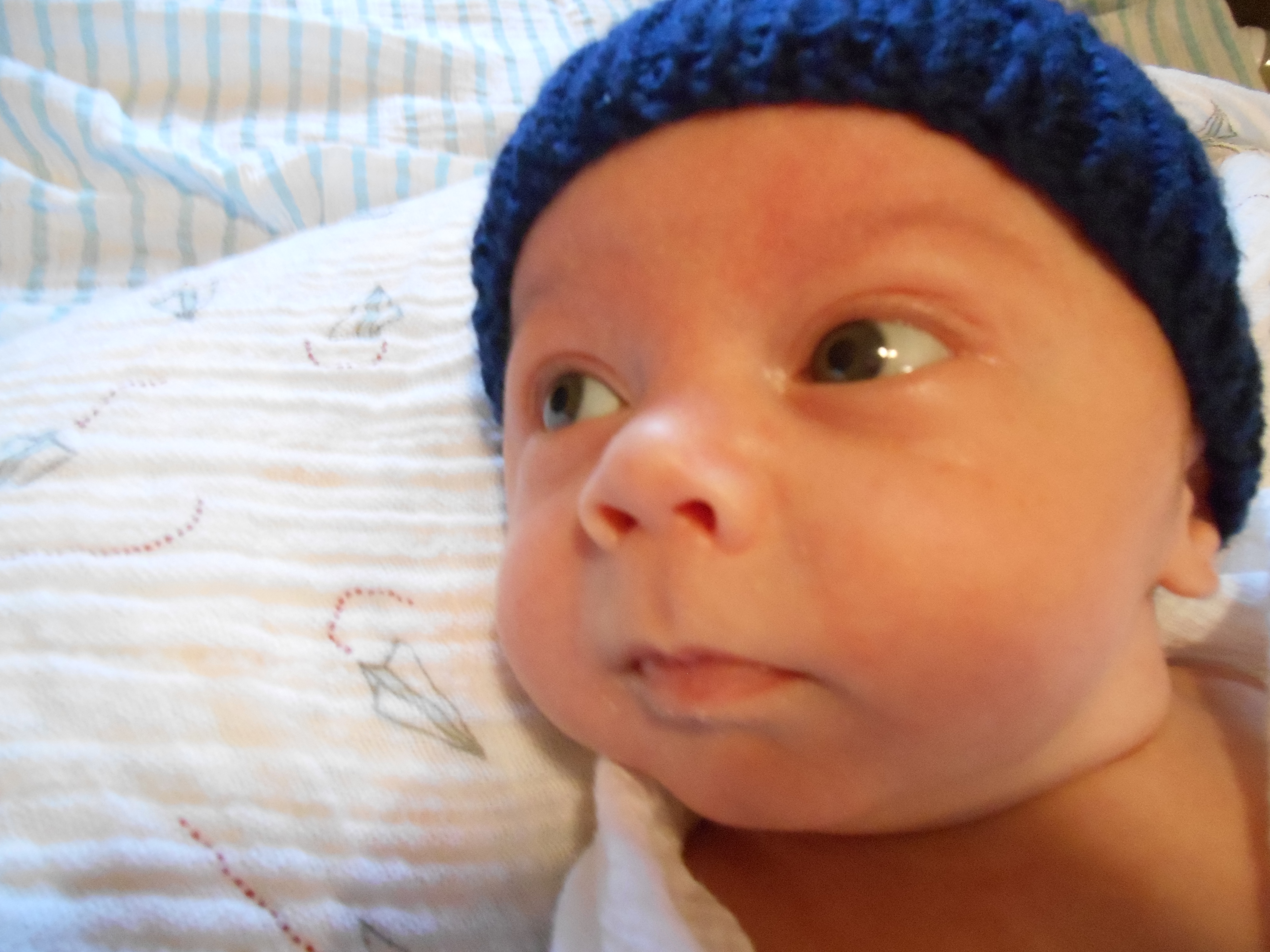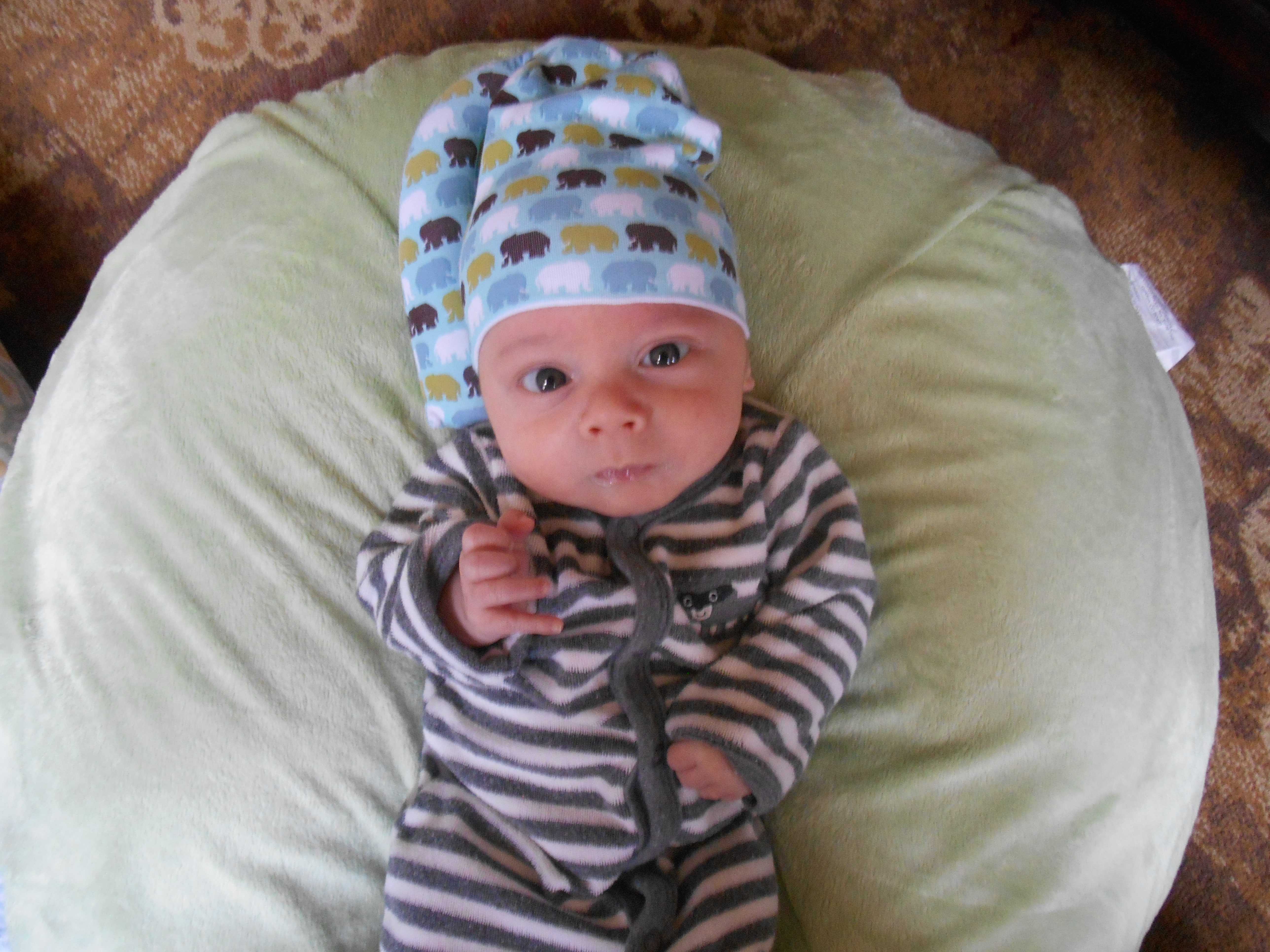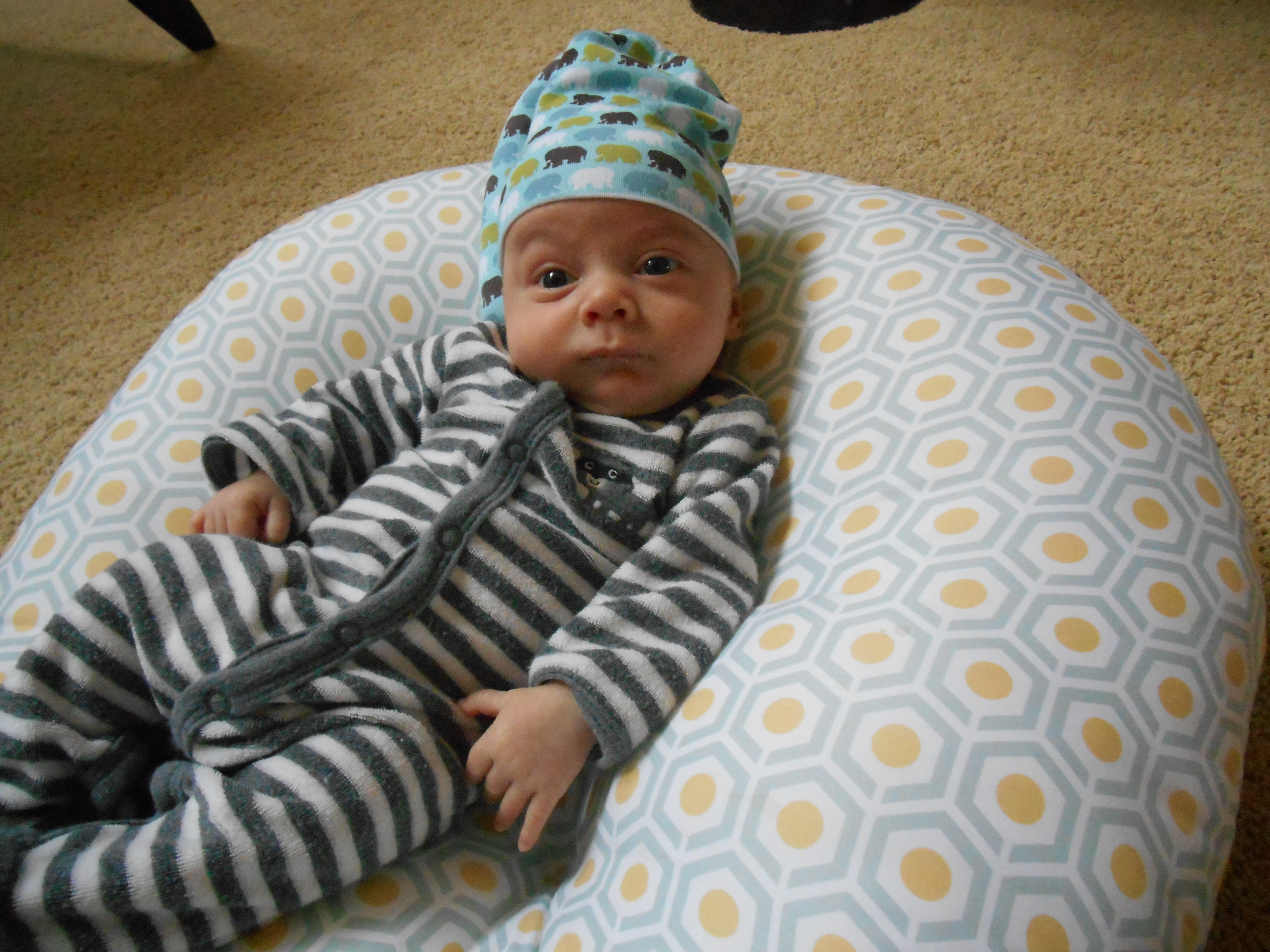 So, Steven seems to favor lying with his head facing to his right. To help correct this, we got him a hat called the Tortle. It prevents him from lying on the side he favors. You can see him in all his Tortle glory below. Pretty adorable! When he’s calm and happy it doesn’t bother him a bit. When he’s fussy, it’s acts as a fuss accelerator. (The issue with so significantly favoring a side is that he can develop a flat head and/or a condition called torticollis. Our neonatologist recommended this hat to us.)