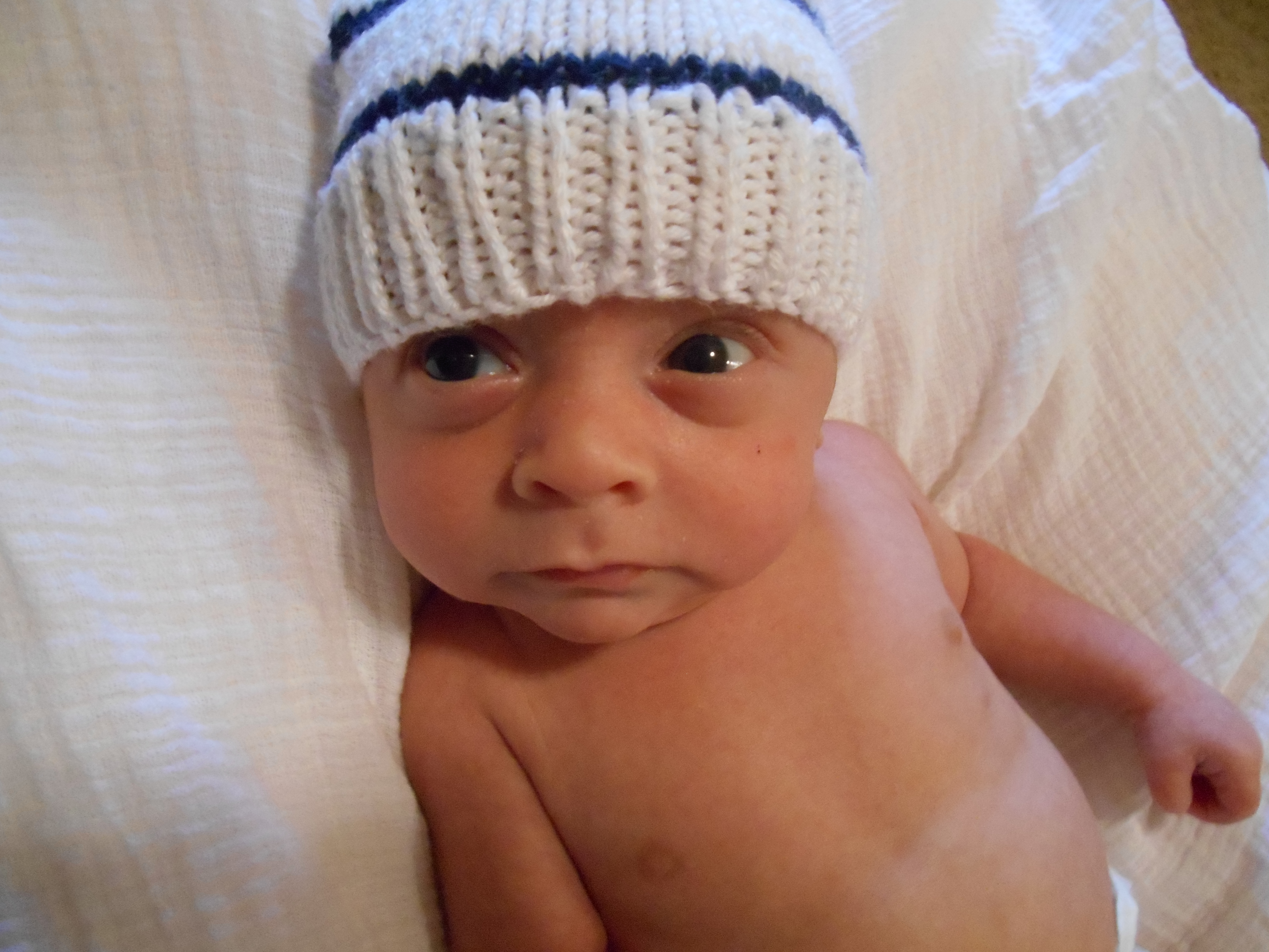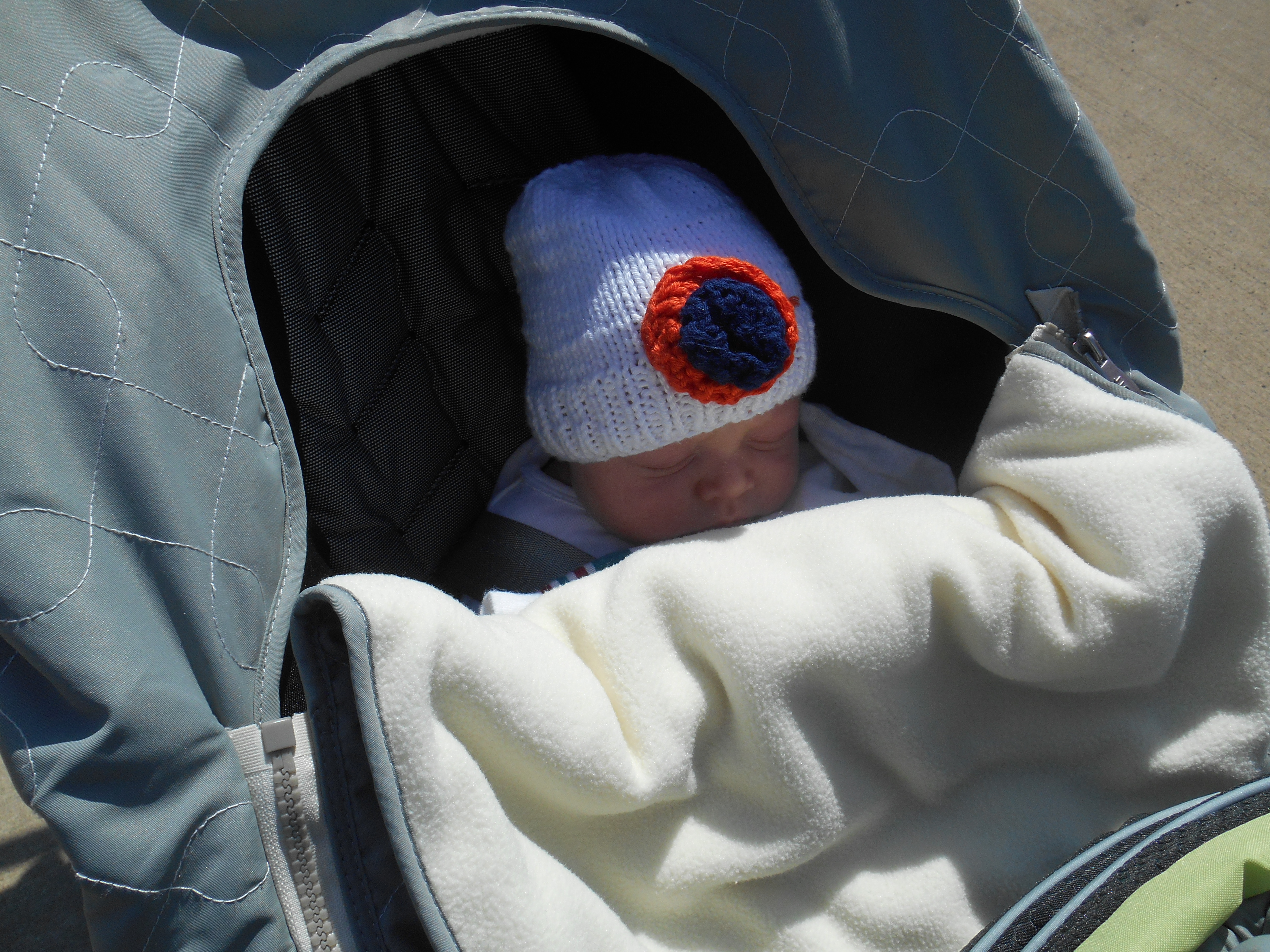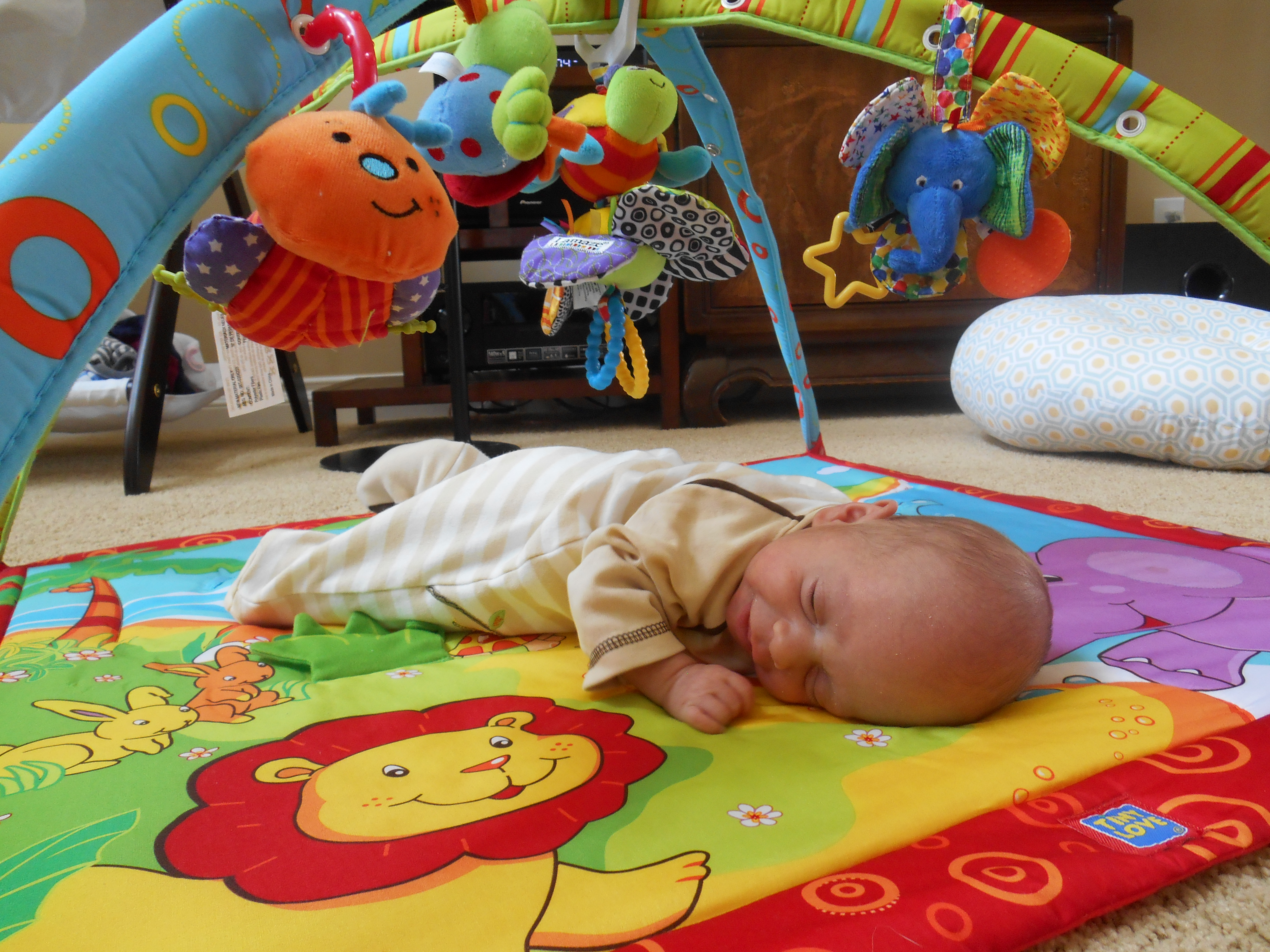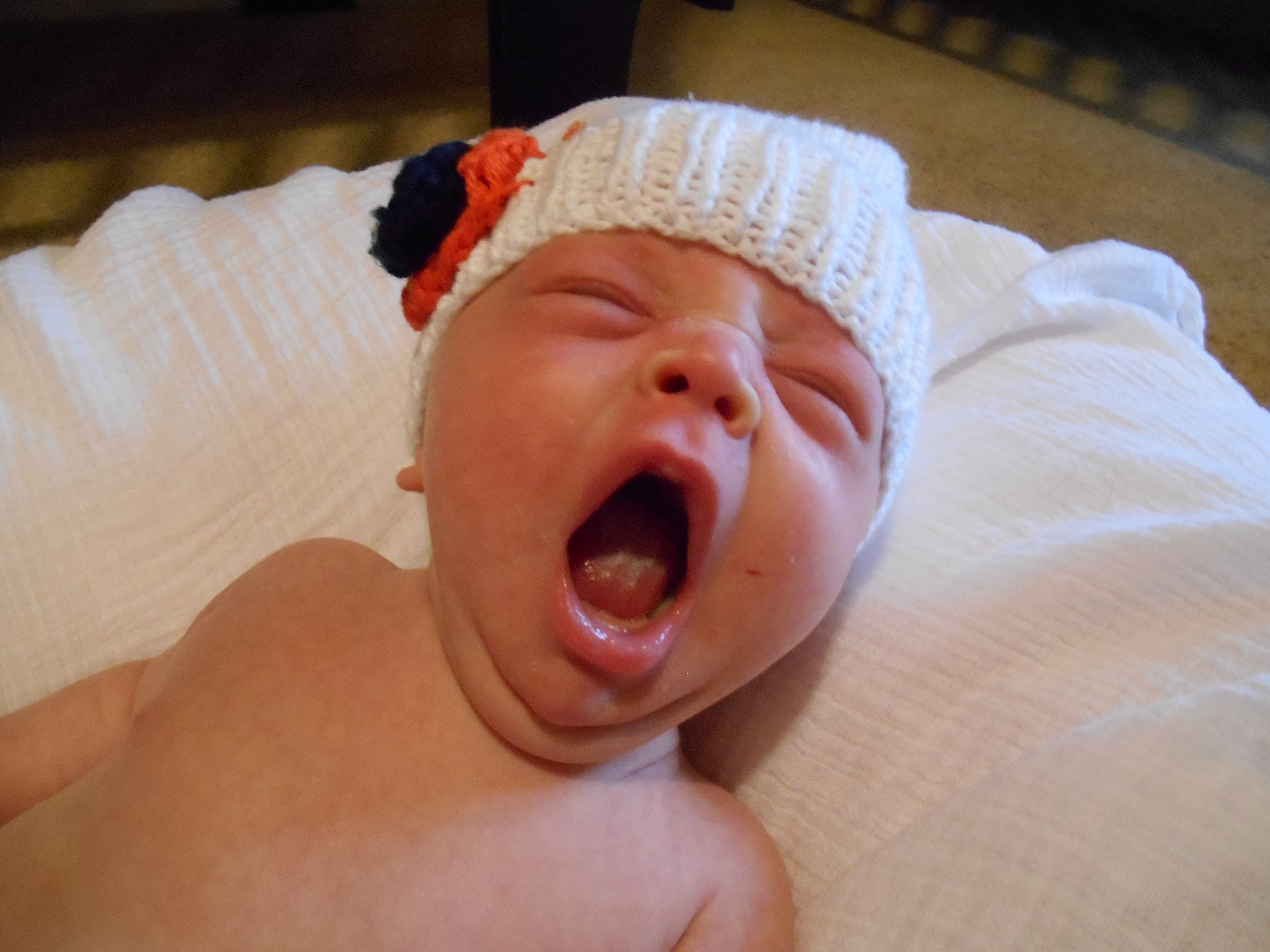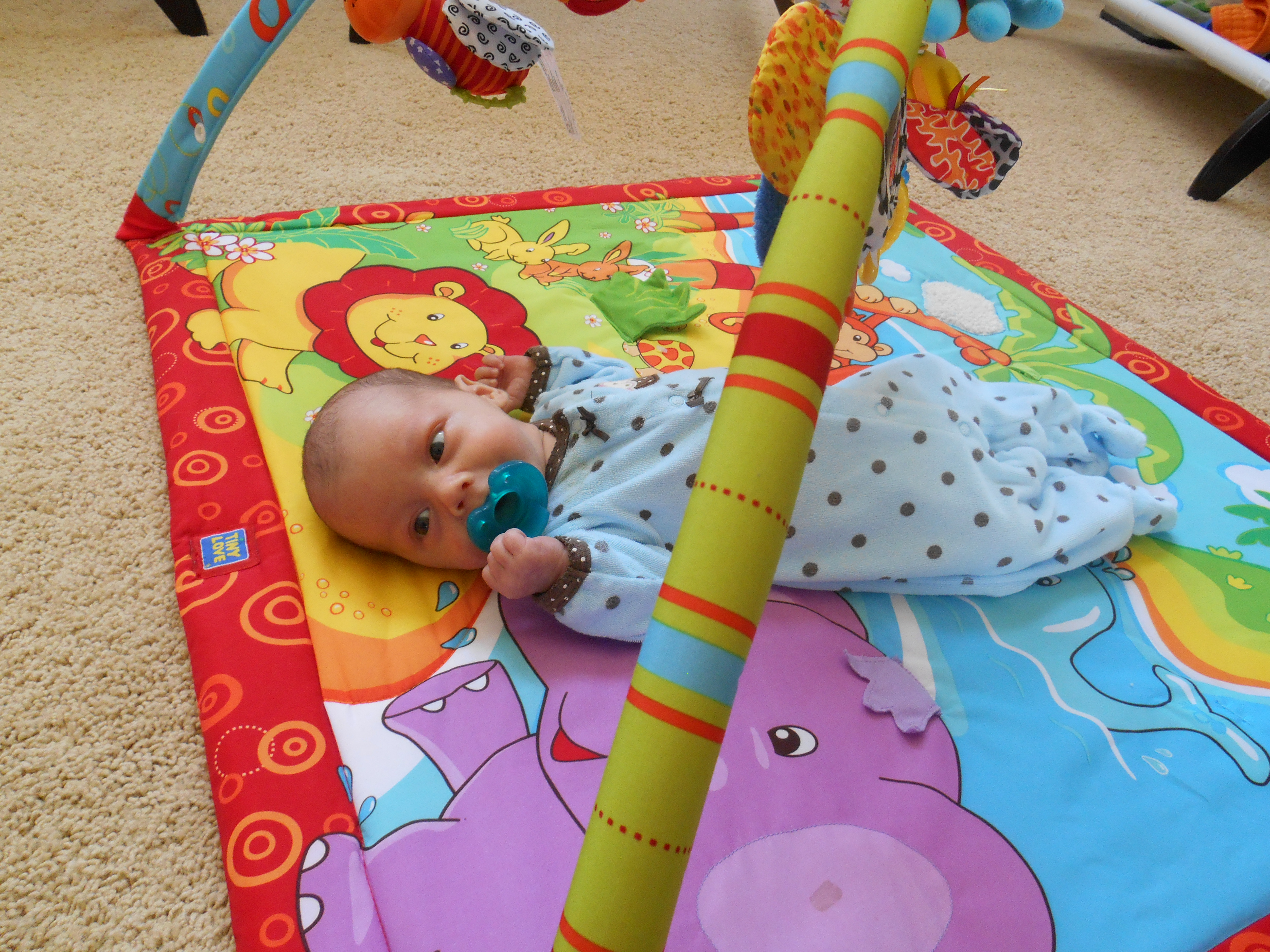 So, Steven seems to favor lying with his head facing to his right. To help correct this, we got him a hat called the Tortle. It prevents him from lying on the side he favors. You can see him in all his Tortle glory below. Pretty adorable! When he’s calm and happy it doesn’t bother him a bit. When he’s fussy, it’s acts as a fuss accelerator. (The issue with so significantly favoring a side is that he can develop a flat head and/or a condition called torticollis. Our neonatologist recommended this hat to us.)
