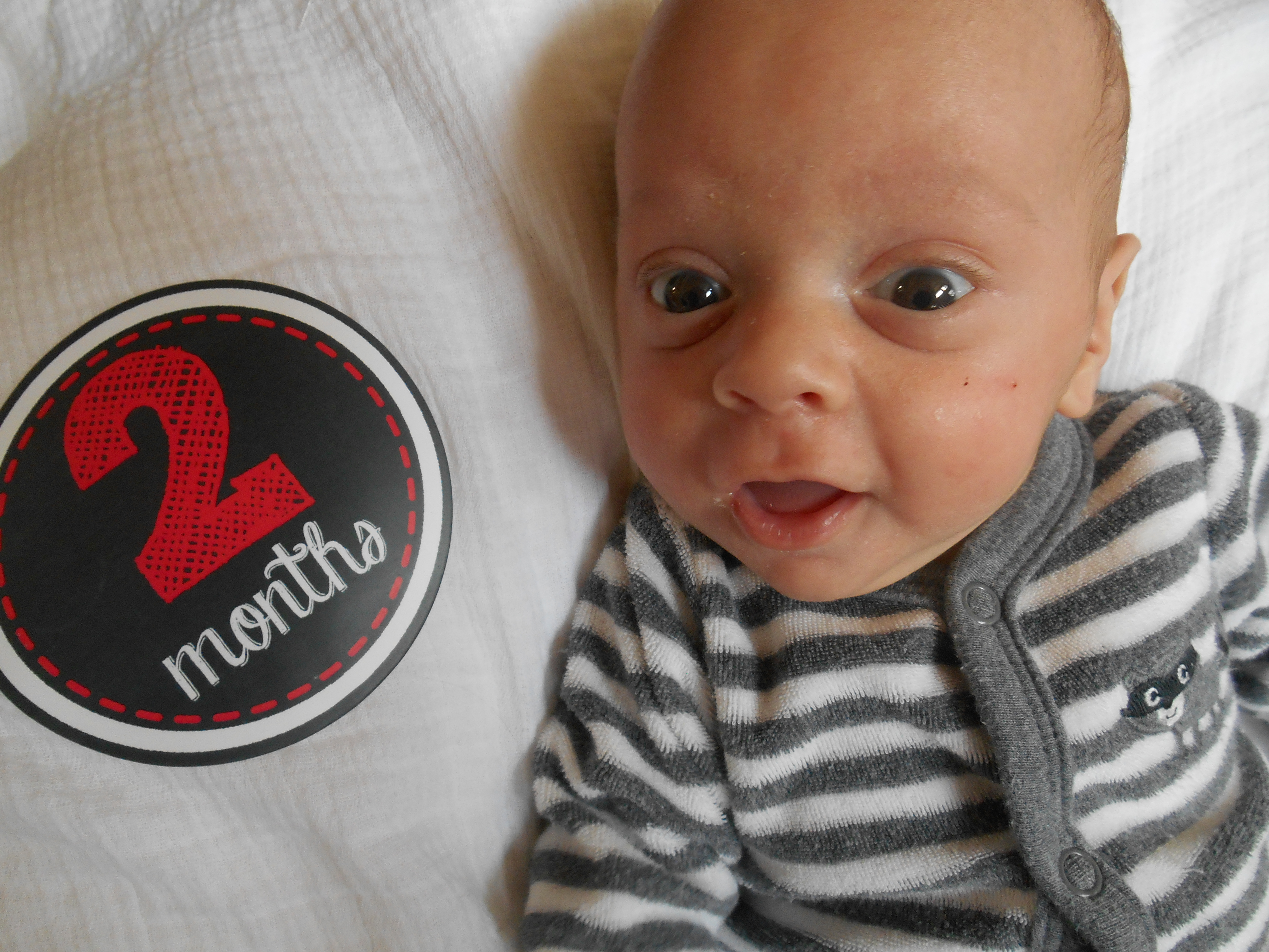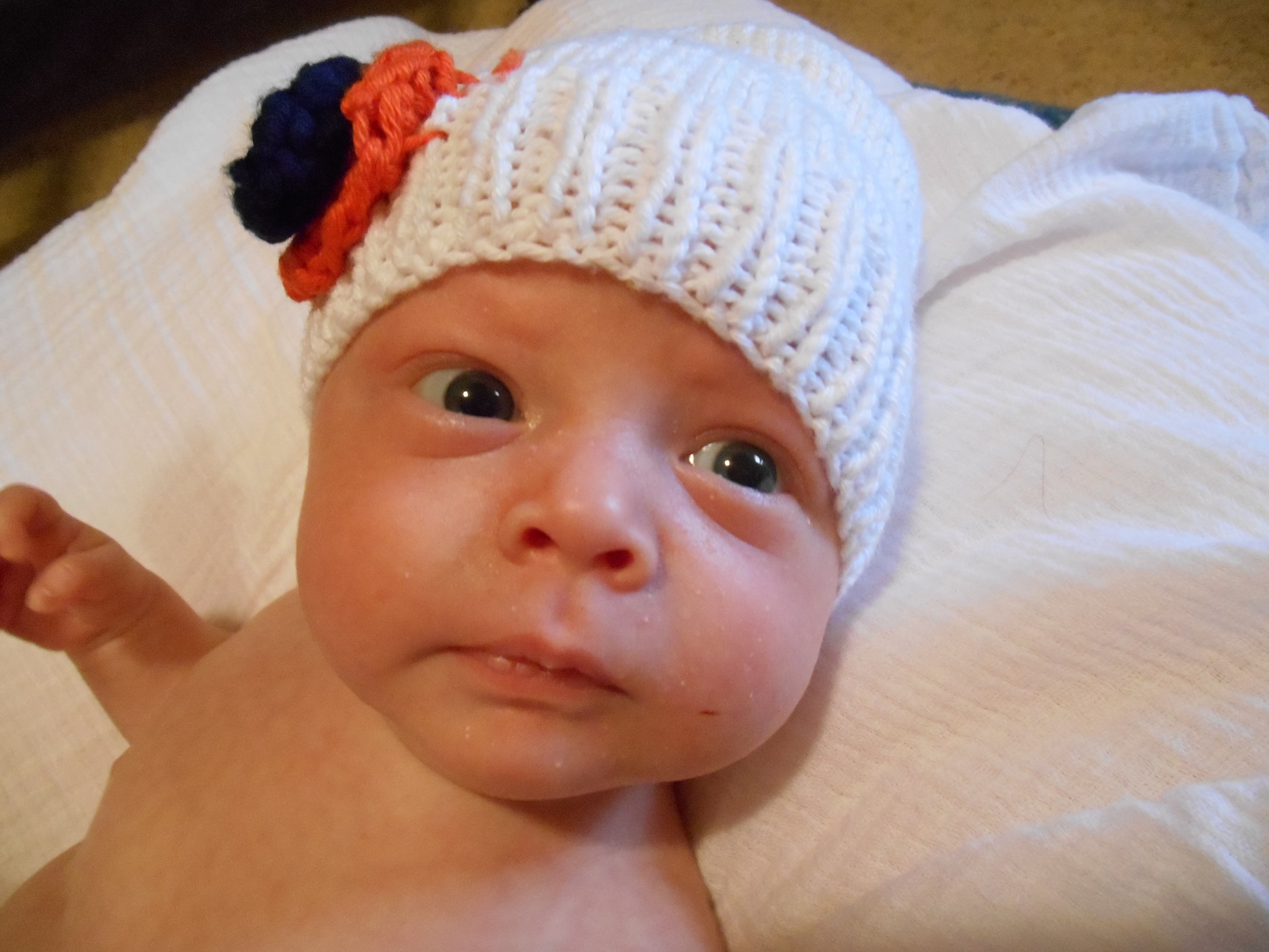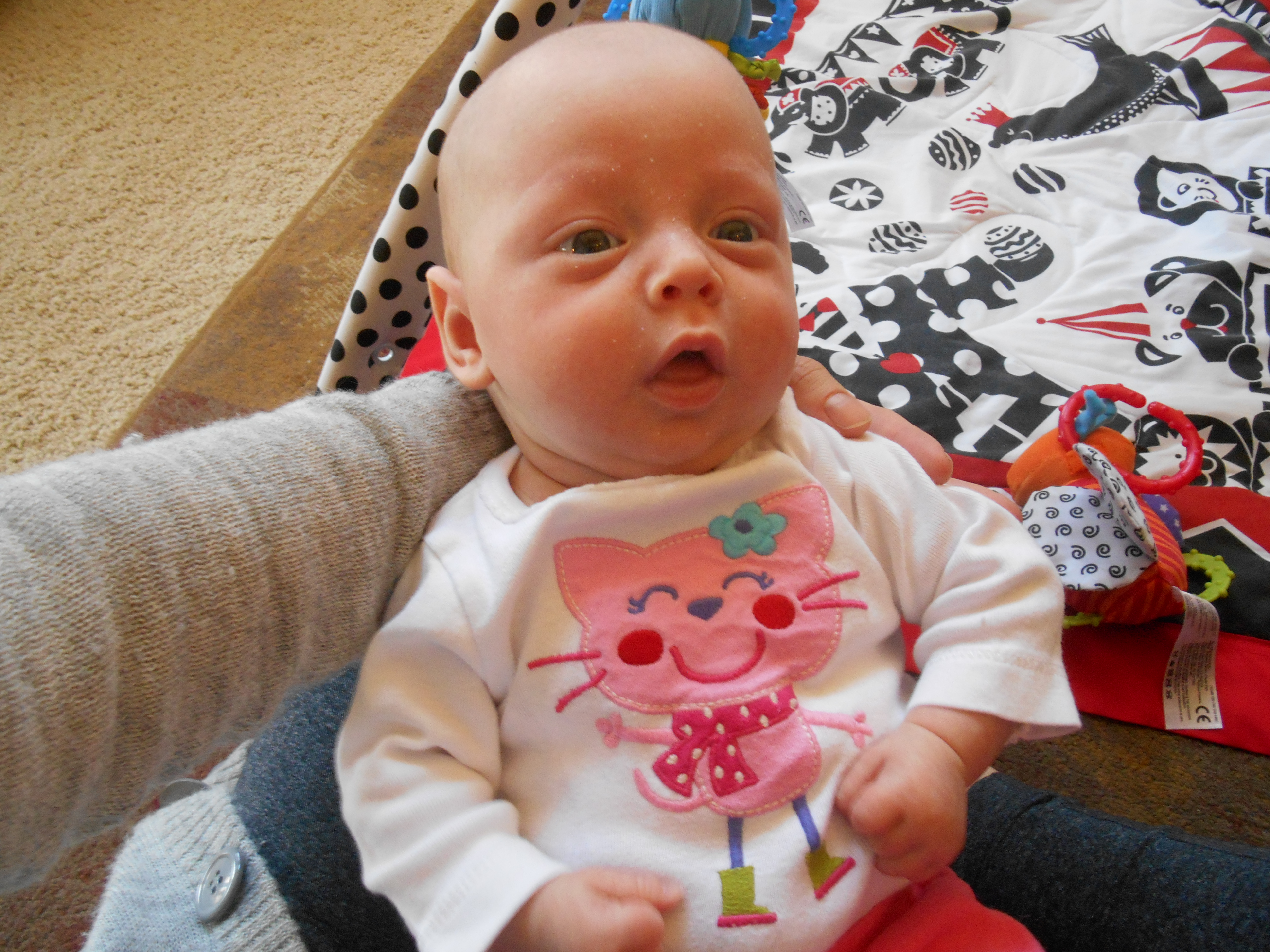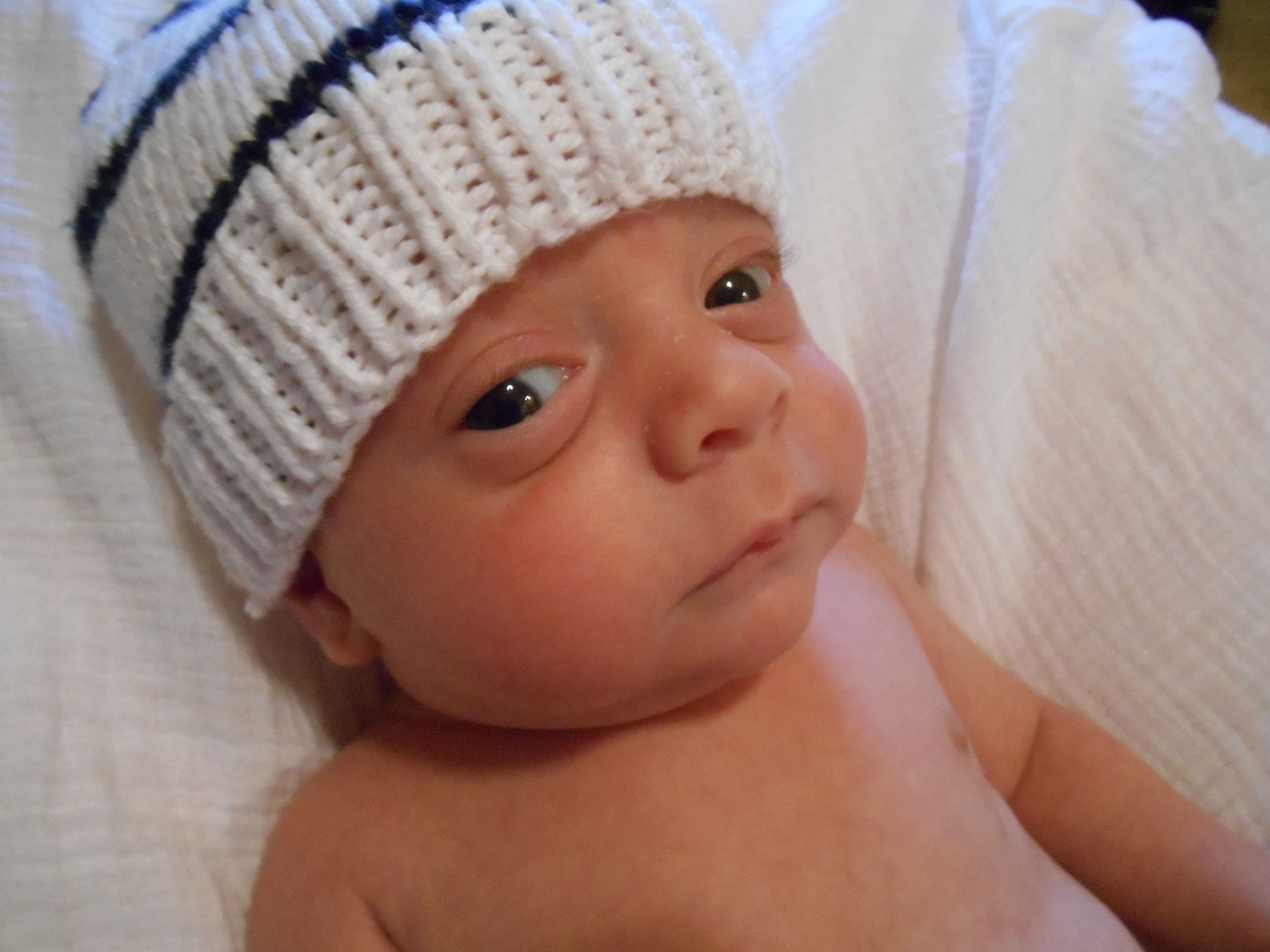 So, Steven seems to favor lying with his head facing to his right. To help correct this, we got him a hat called the Tortle. It prevents him from lying on the side he favors. You can see him in all his Tortle glory below. Pretty adorable! When he’s calm and happy it doesn’t bother him a bit. When he’s fussy, it’s acts as a fuss accelerator. (The issue with so significantly favoring a side is that he can develop a flat head and/or a condition called torticollis. Our neonatologist recommended this hat to us.)