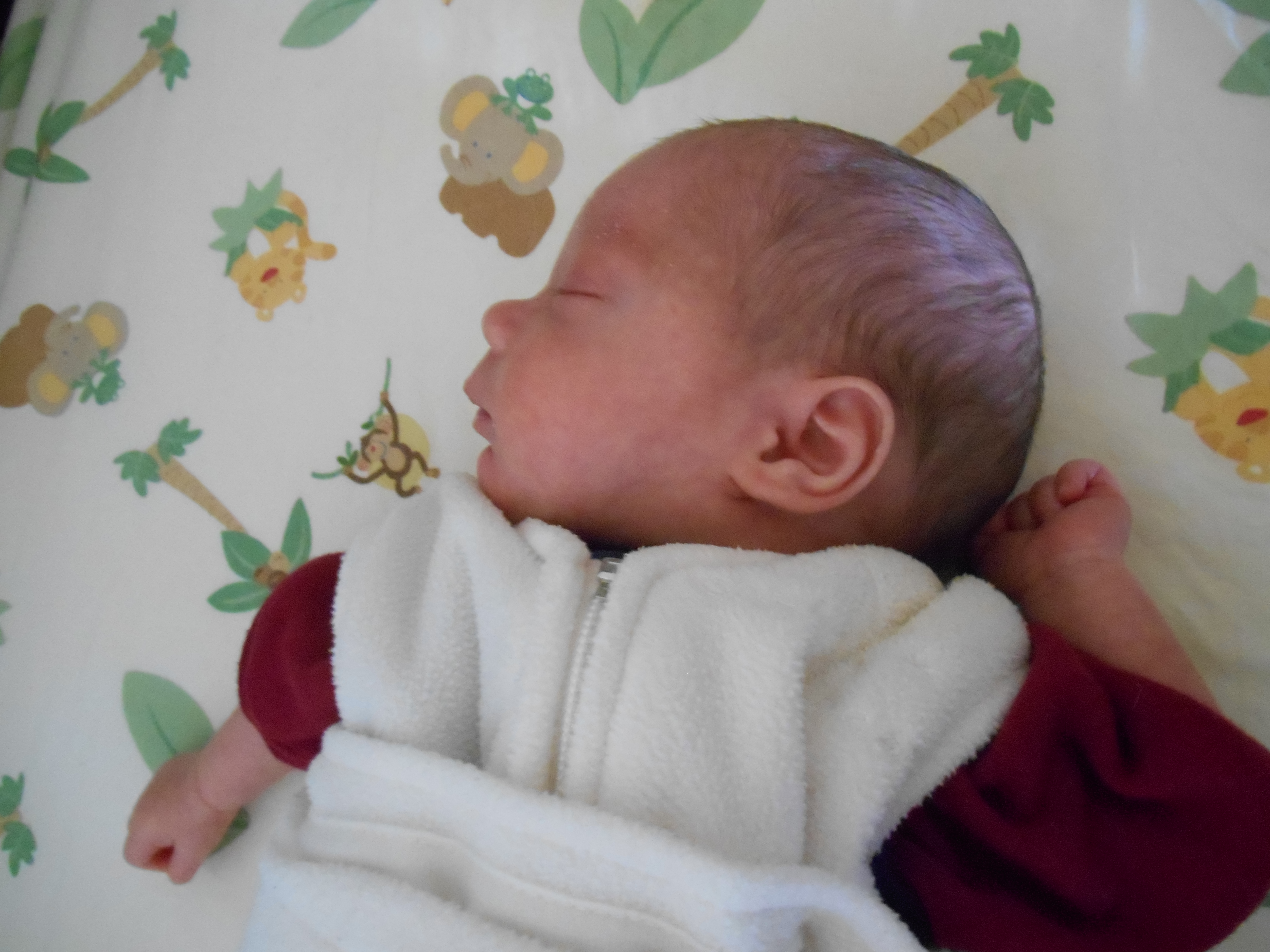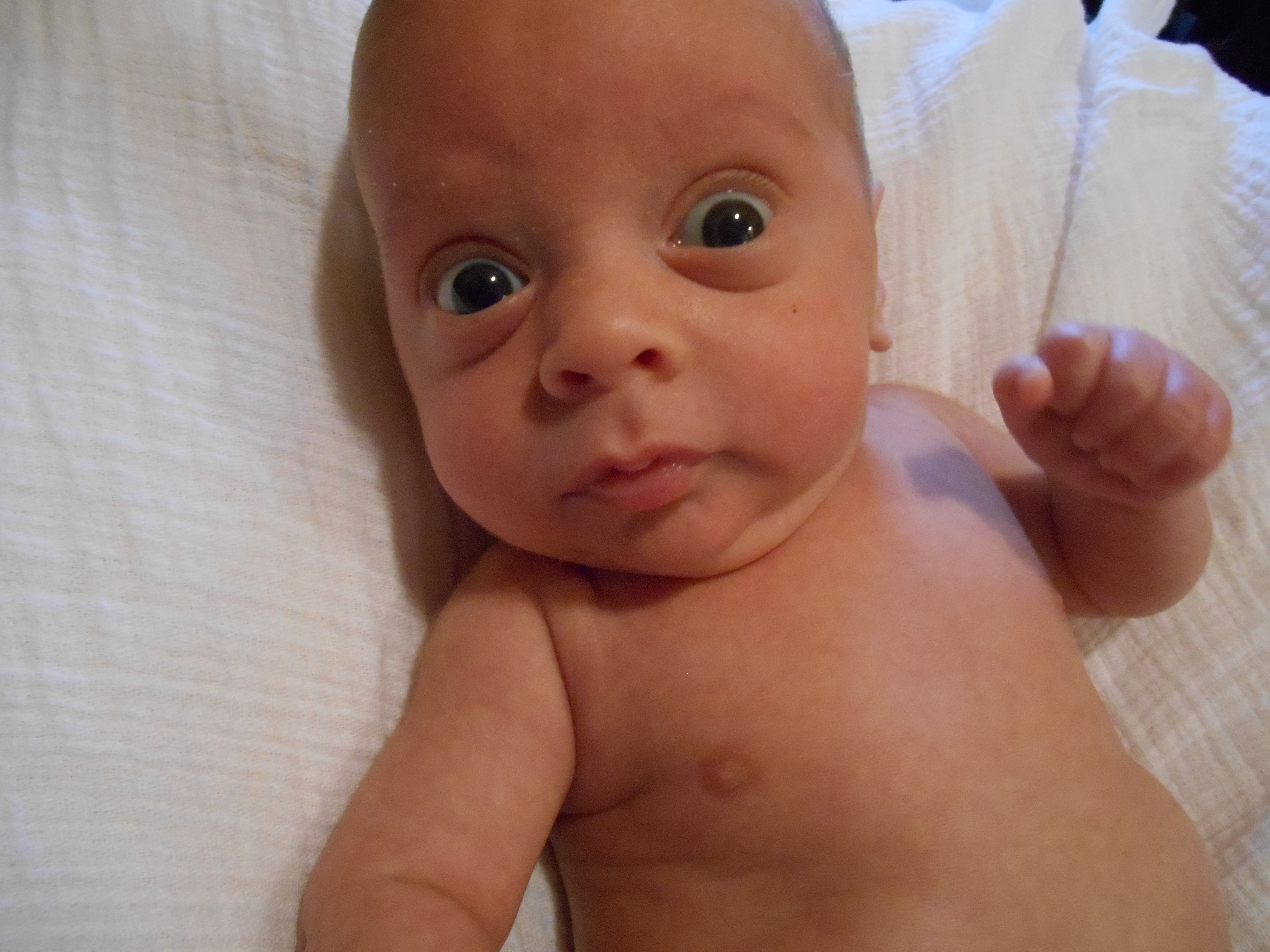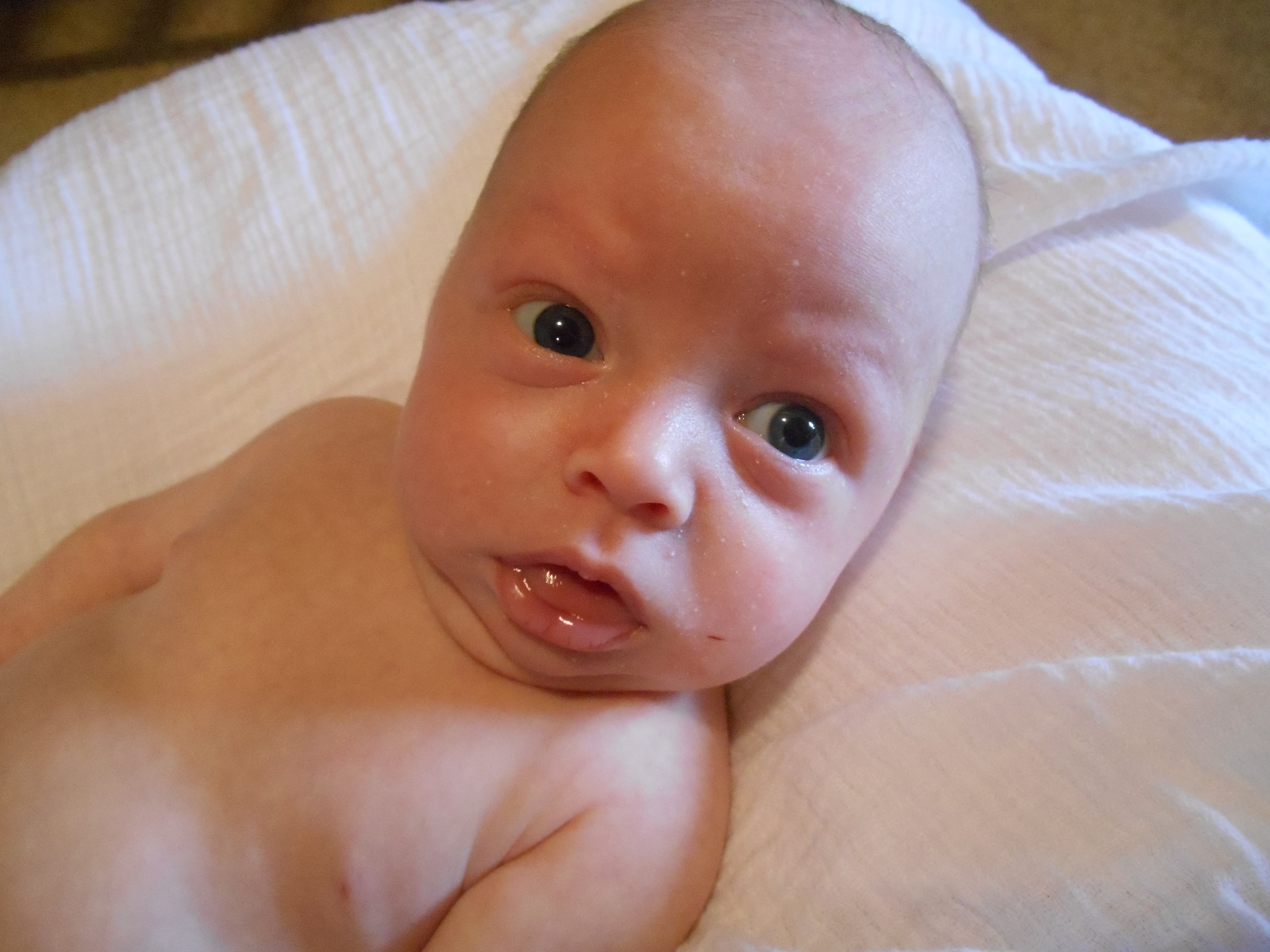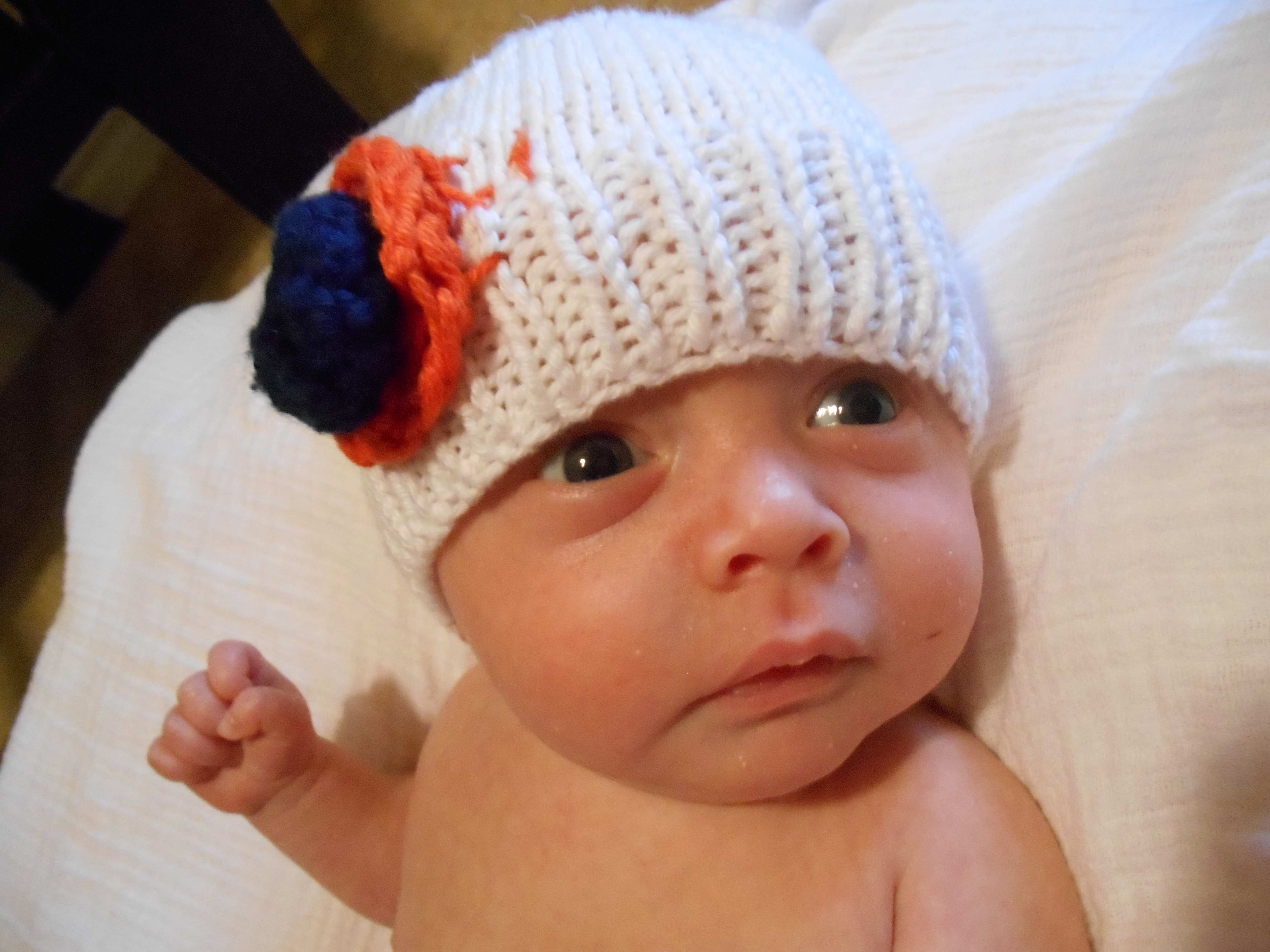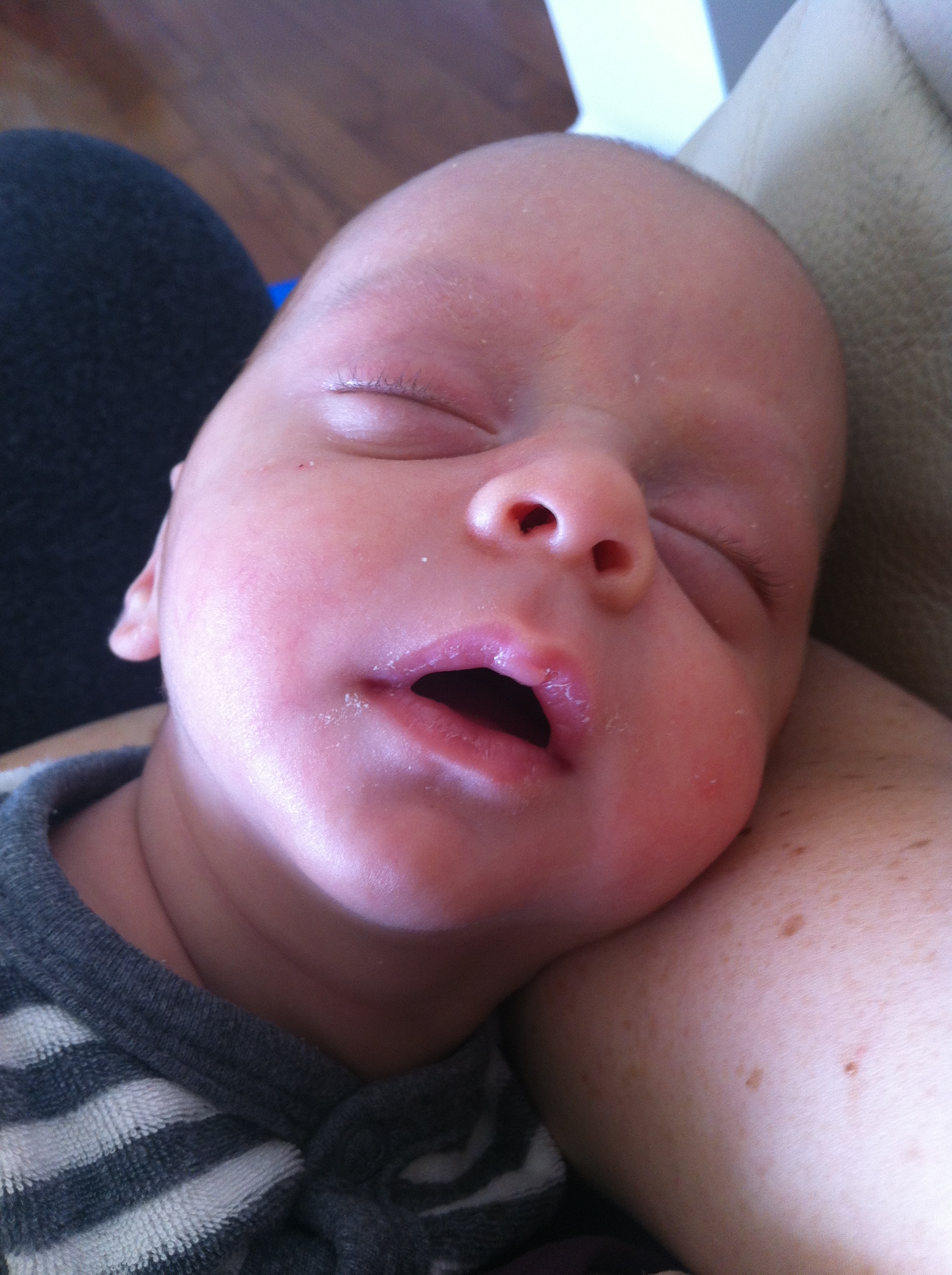 So, Steven seems to favor lying with his head facing to his right. To help correct this, we got him a hat called the Tortle. It prevents him from lying on the side he favors. You can see him in all his Tortle glory below. Pretty adorable! When he’s calm and happy it doesn’t bother him a bit. When he’s fussy, it’s acts as a fuss accelerator. (The issue with so significantly favoring a side is that he can develop a flat head and/or a condition called torticollis. Our neonatologist recommended this hat to us.)