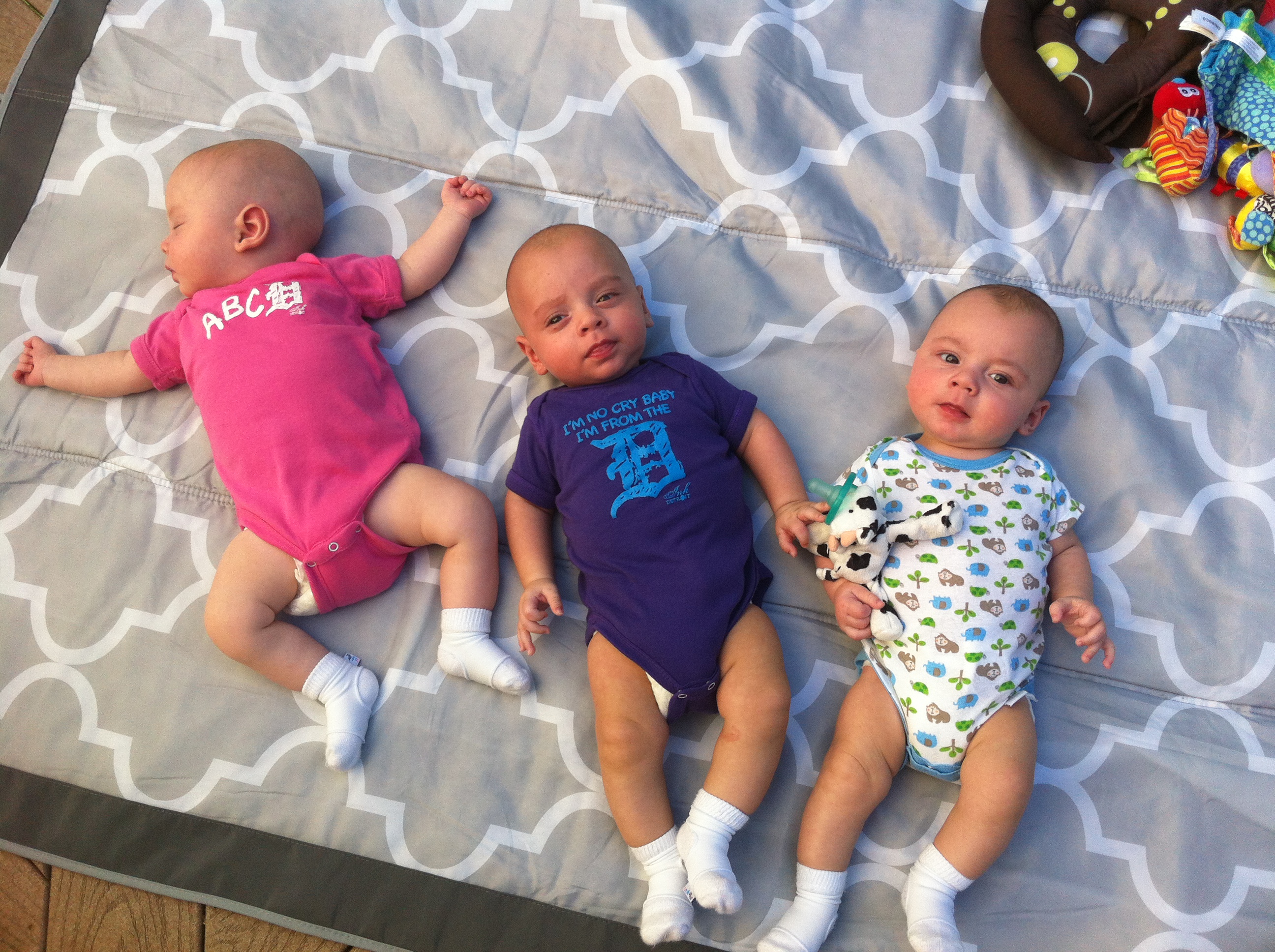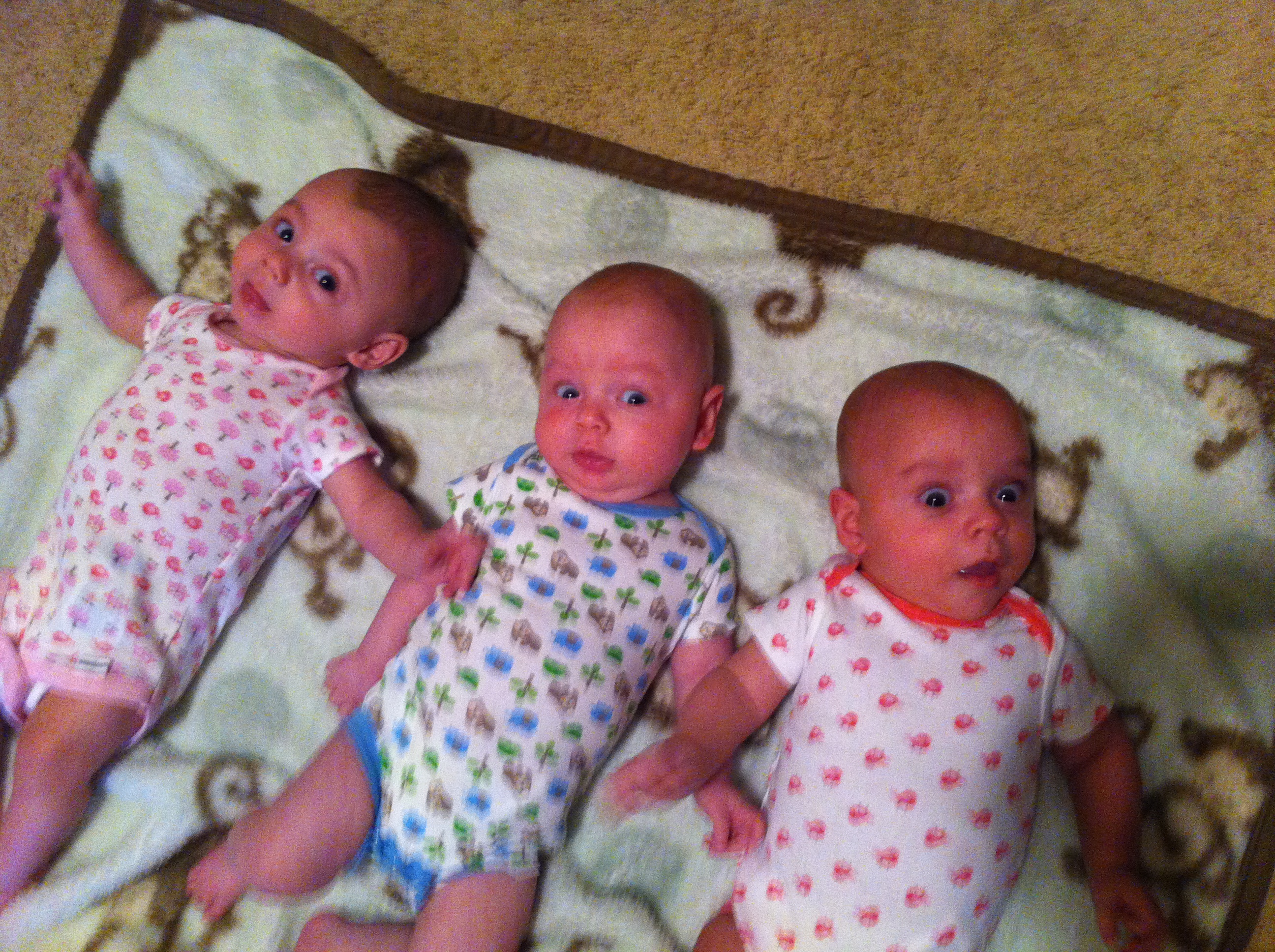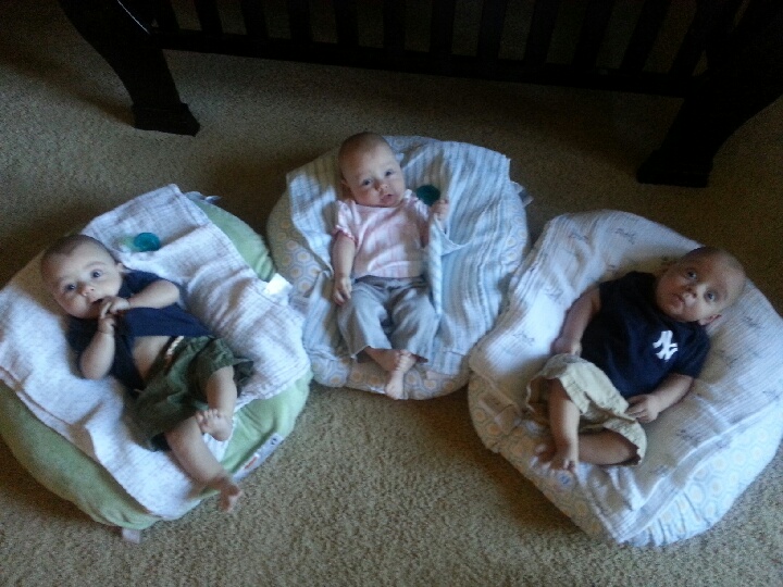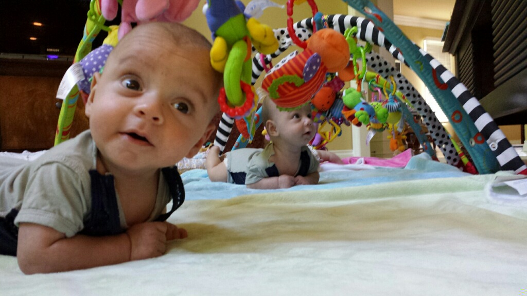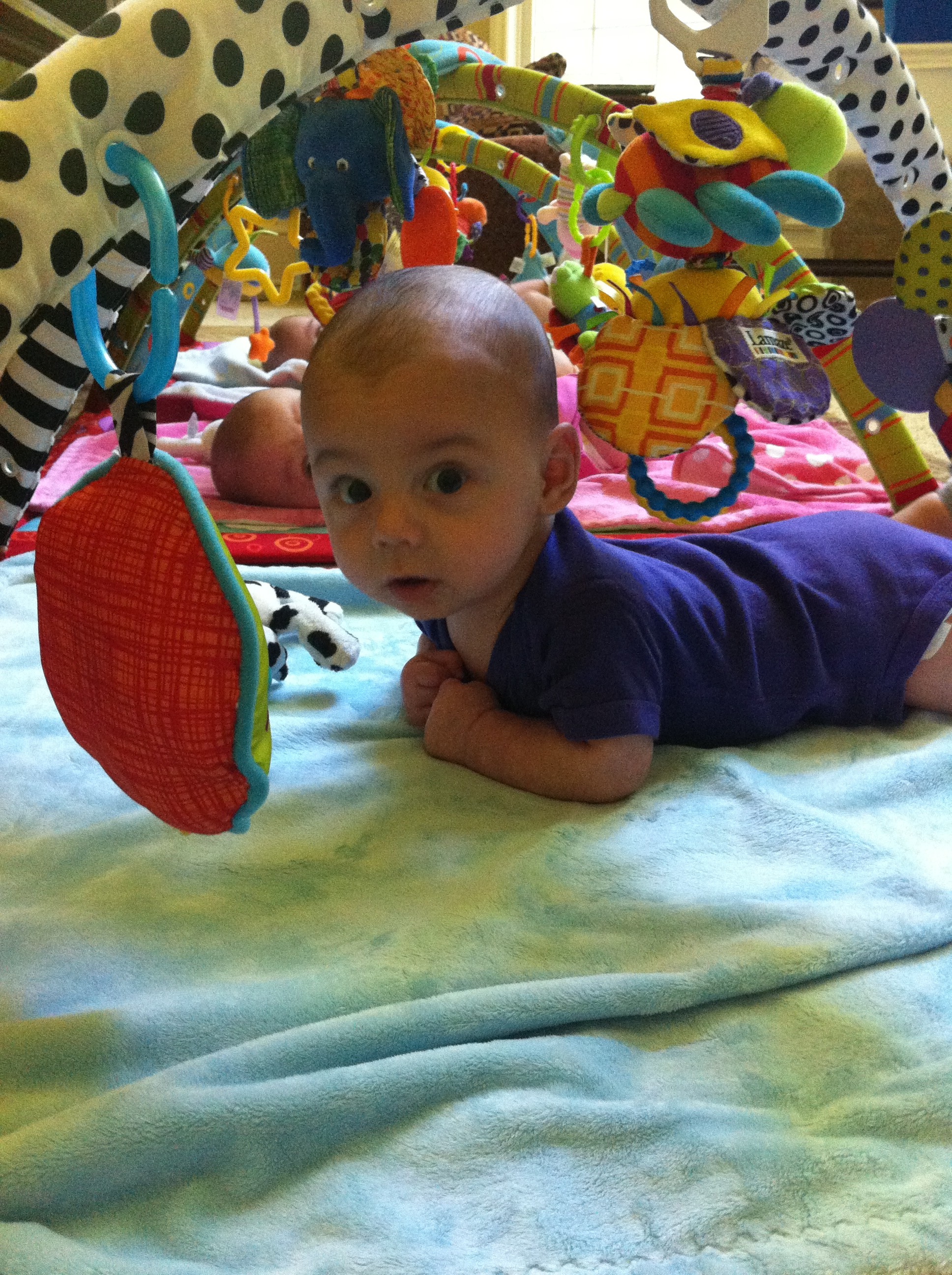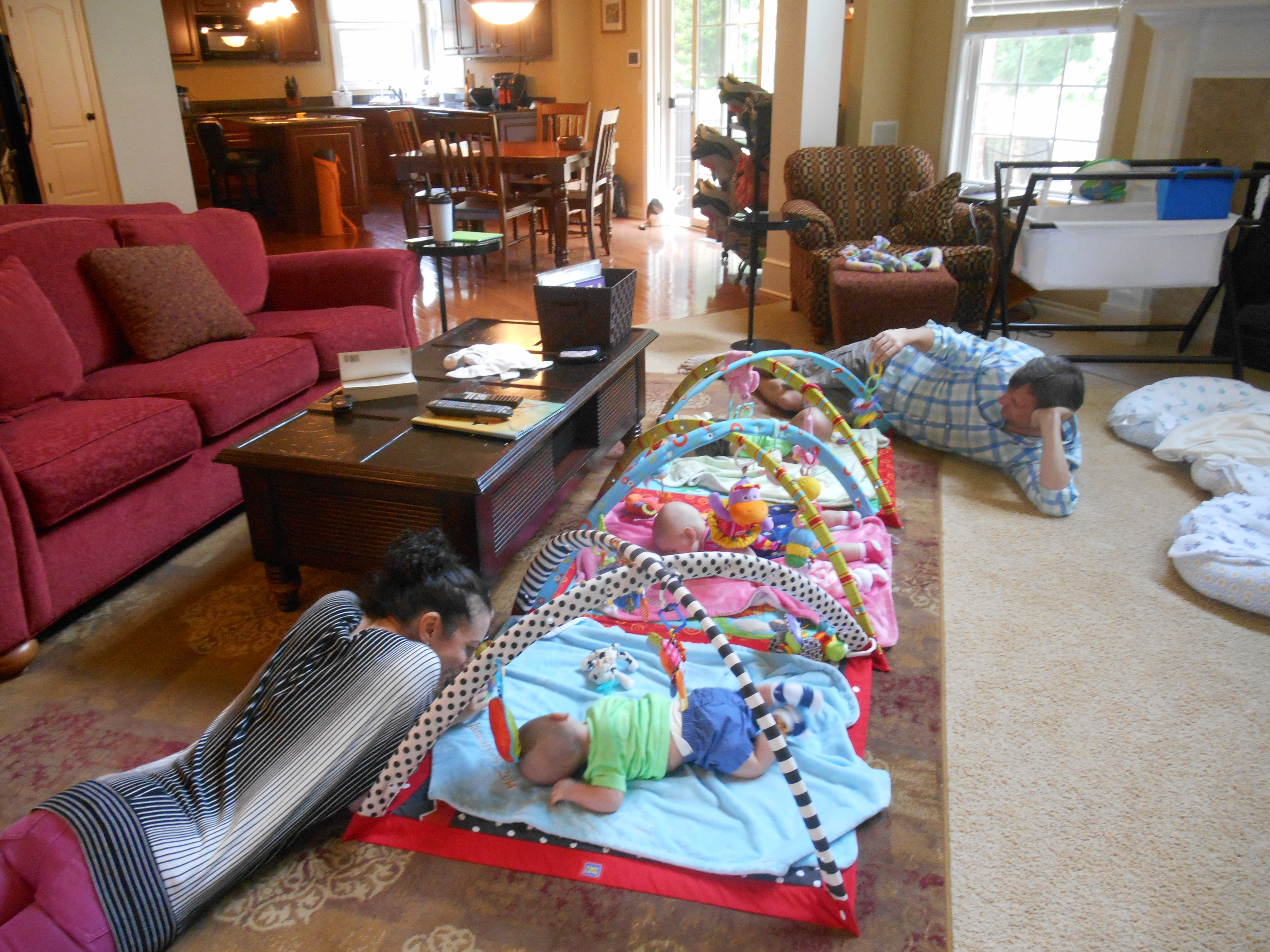 Gene got this photo of us during tummy time. Jason and I are cheering the babies on as they work that upper body strength and head control!
