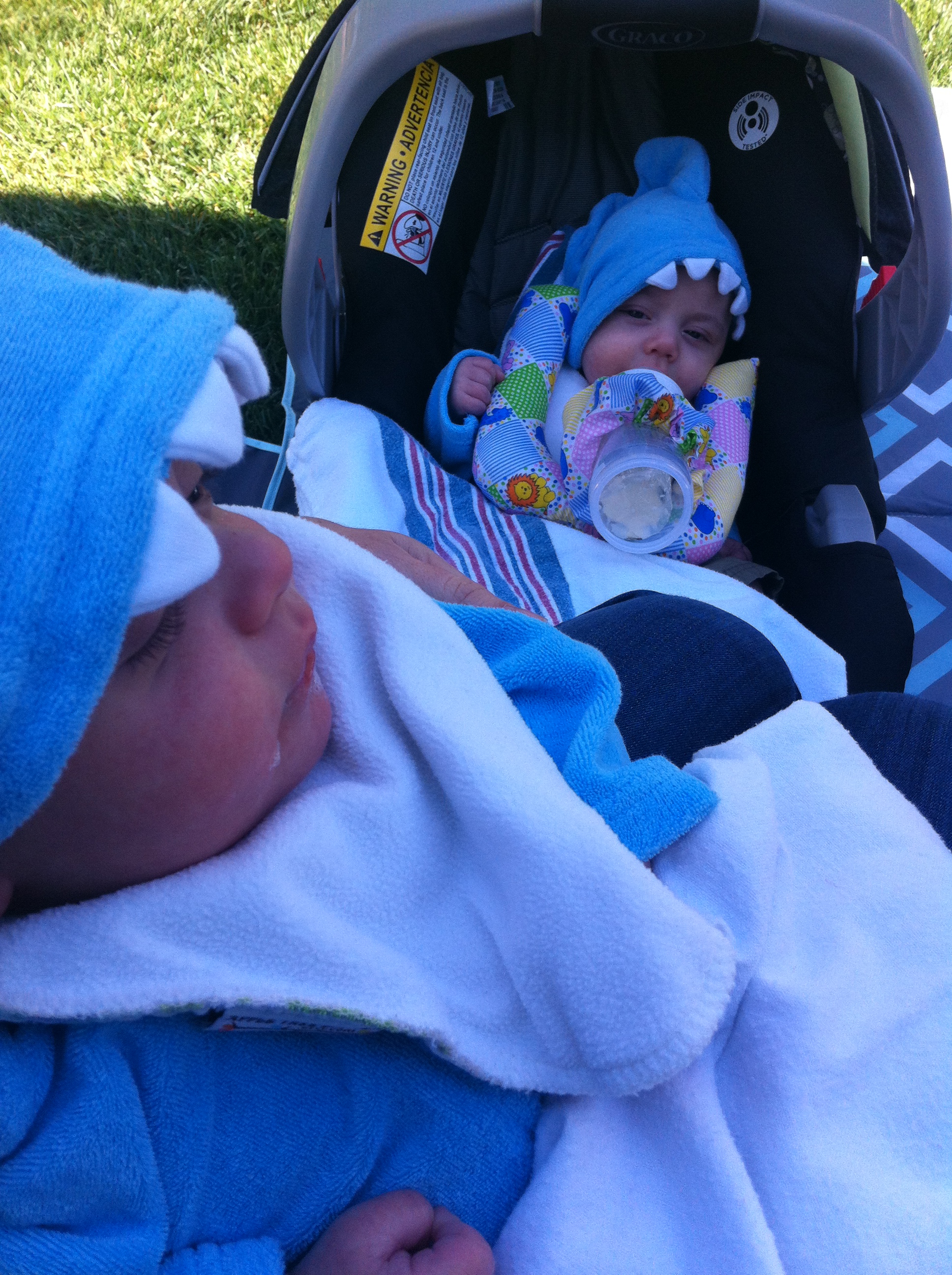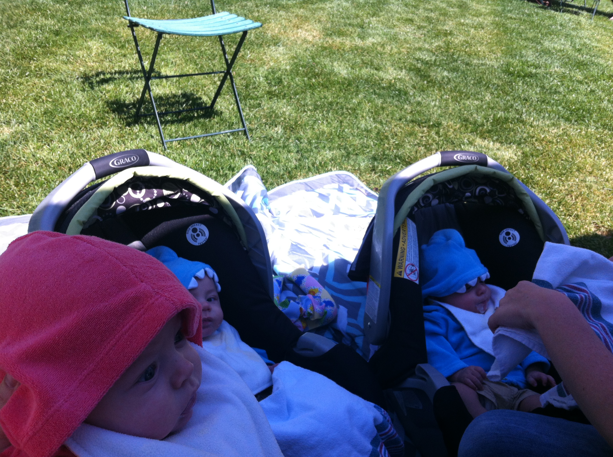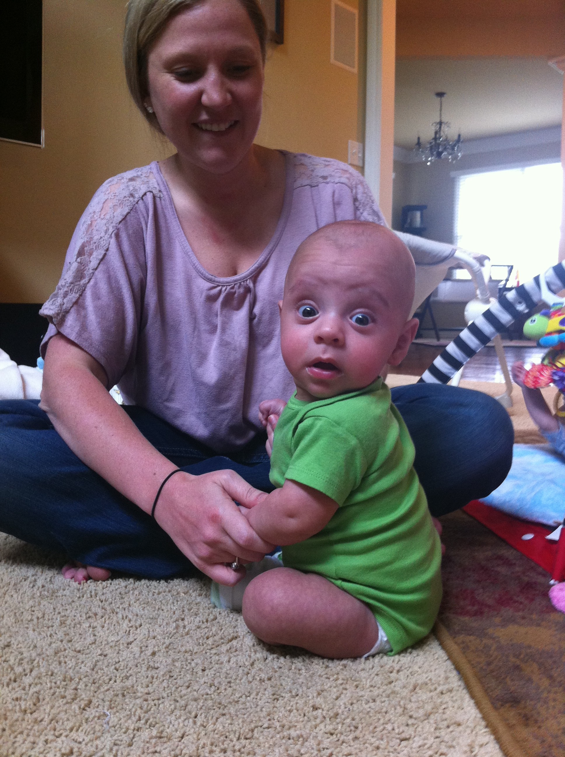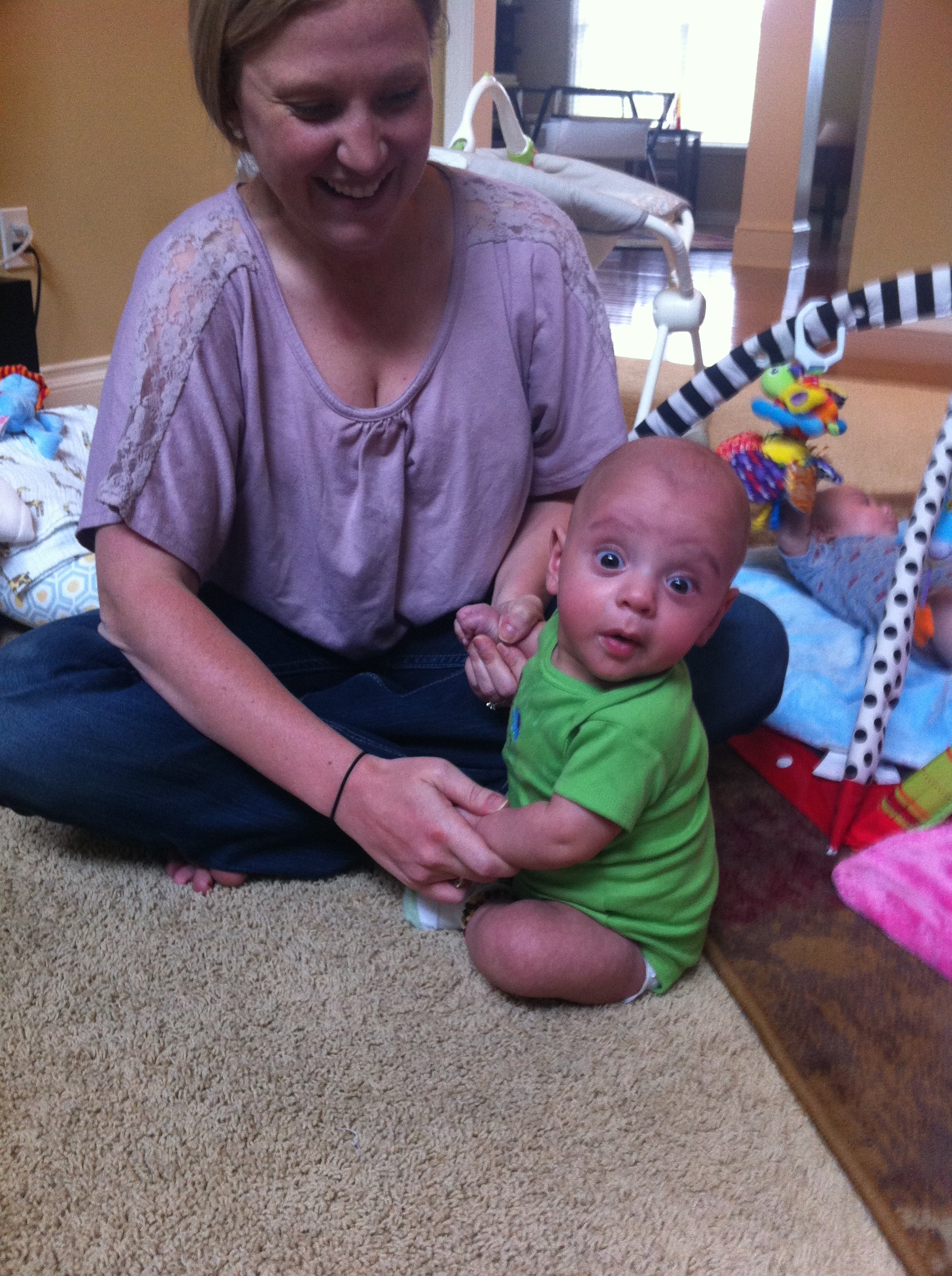 Soooooooo, Jason and I had Steven fitted for a helmet. You know, those helmets you sometimes see babies wear? He was our Baby A and he was down low, smushed against my pelvis with his brother and sister on top of him. We’re pretty sure he was born with his head misaligned (though I do wonder if his positioning in the nicu contributed to it because he could only see out if he looked in one specific direction). It’s purely cosmetic but we decided there’s no reason for him to have a lopsided head if there’s something we can do about it. Frankly, I’m not excited about the additional layer of attention/questions OR the maintenance OR the helmet itself but, as I understand it, the babies adapt really quickly so I’m going to get over it. I keep reminding myself that I’d have wanted my parents to do this for me and, if we don’t do it, there’s no going back later.