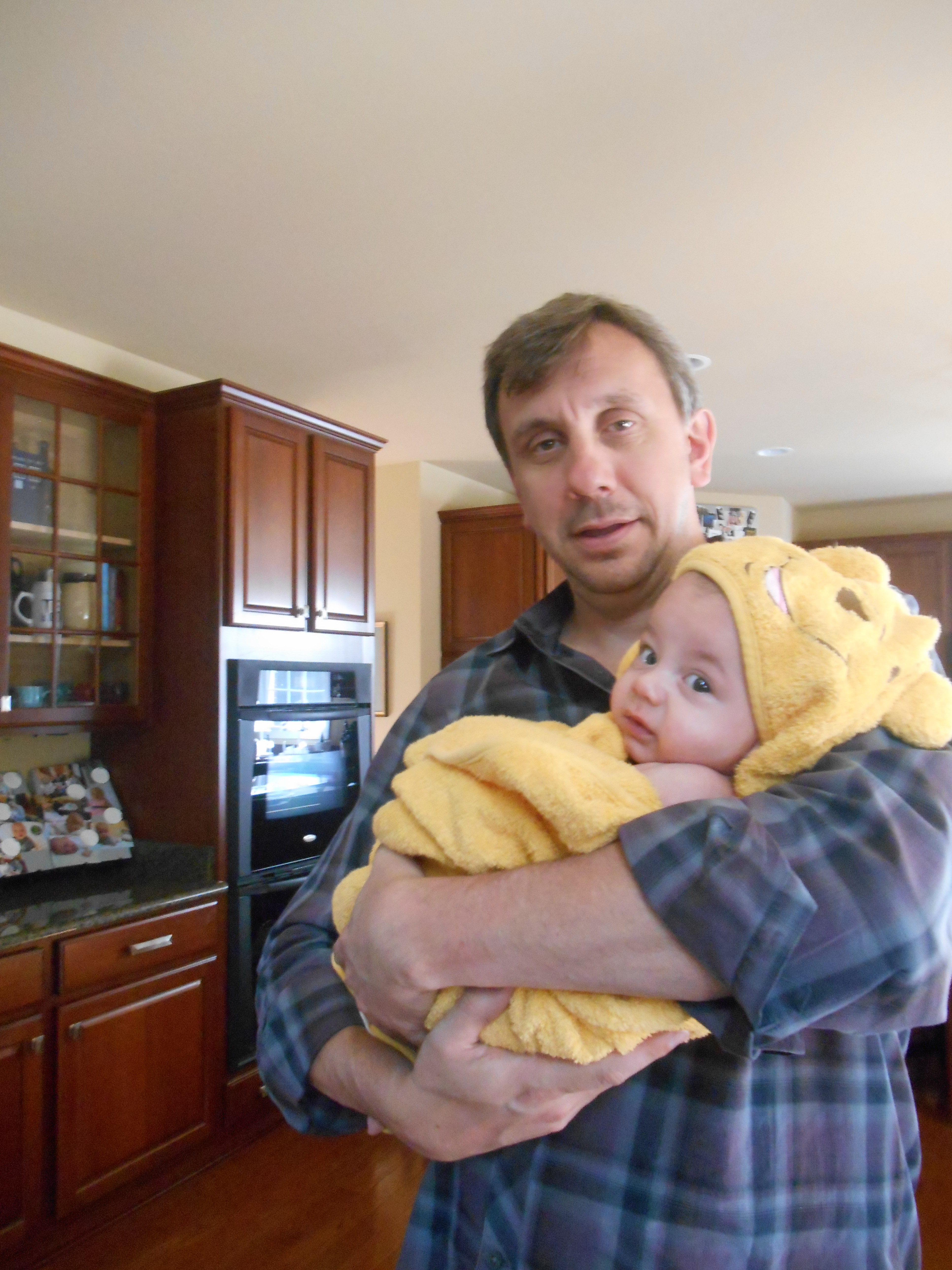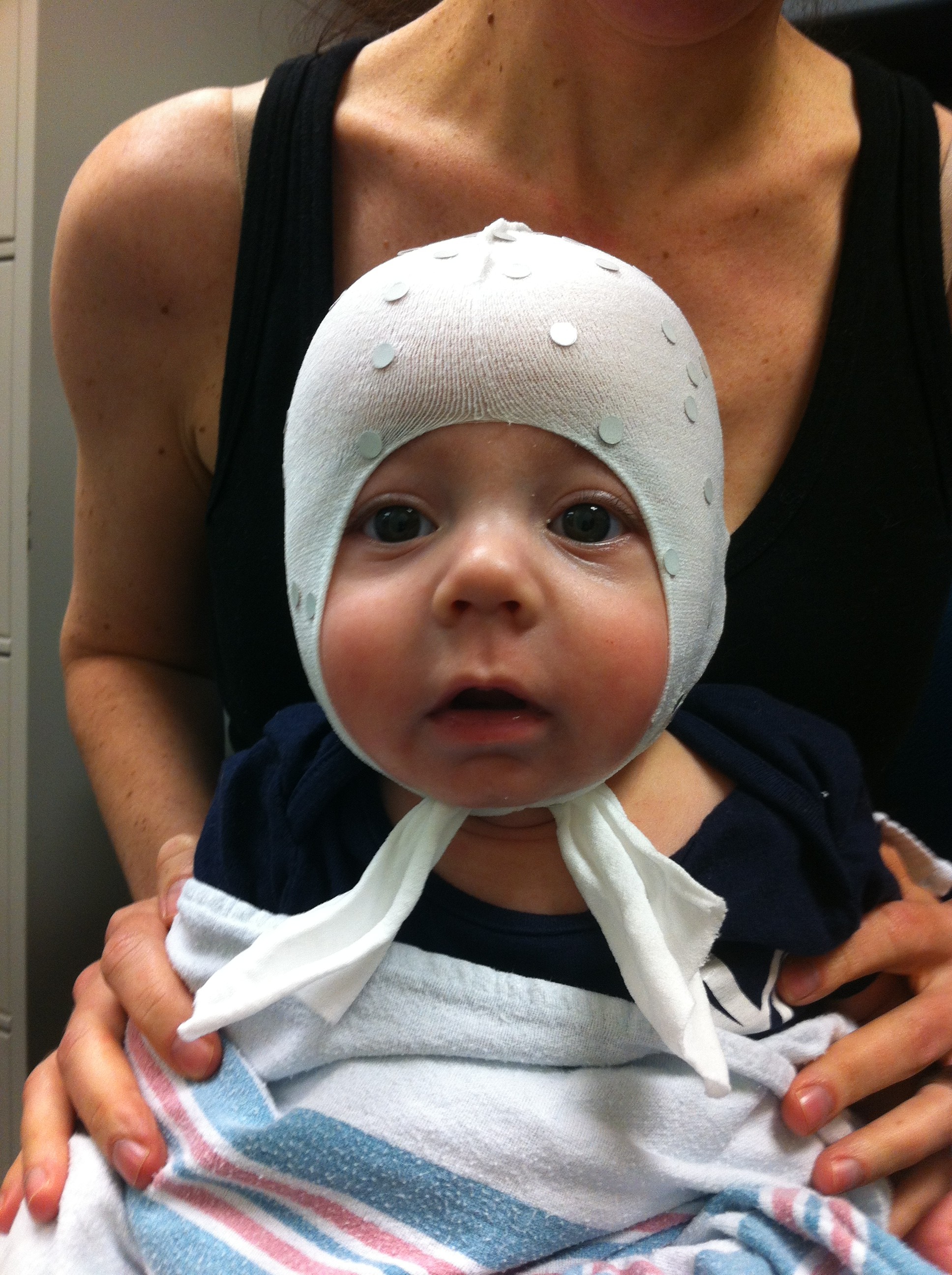 Here’s Steven looking like a little old lady out in the rain. Babushka! Those dots were sensors used to model his head for the helmet. We’ll have it in a week or two and he’ll wear it for 4- 6 months. Look at those cheeks!!