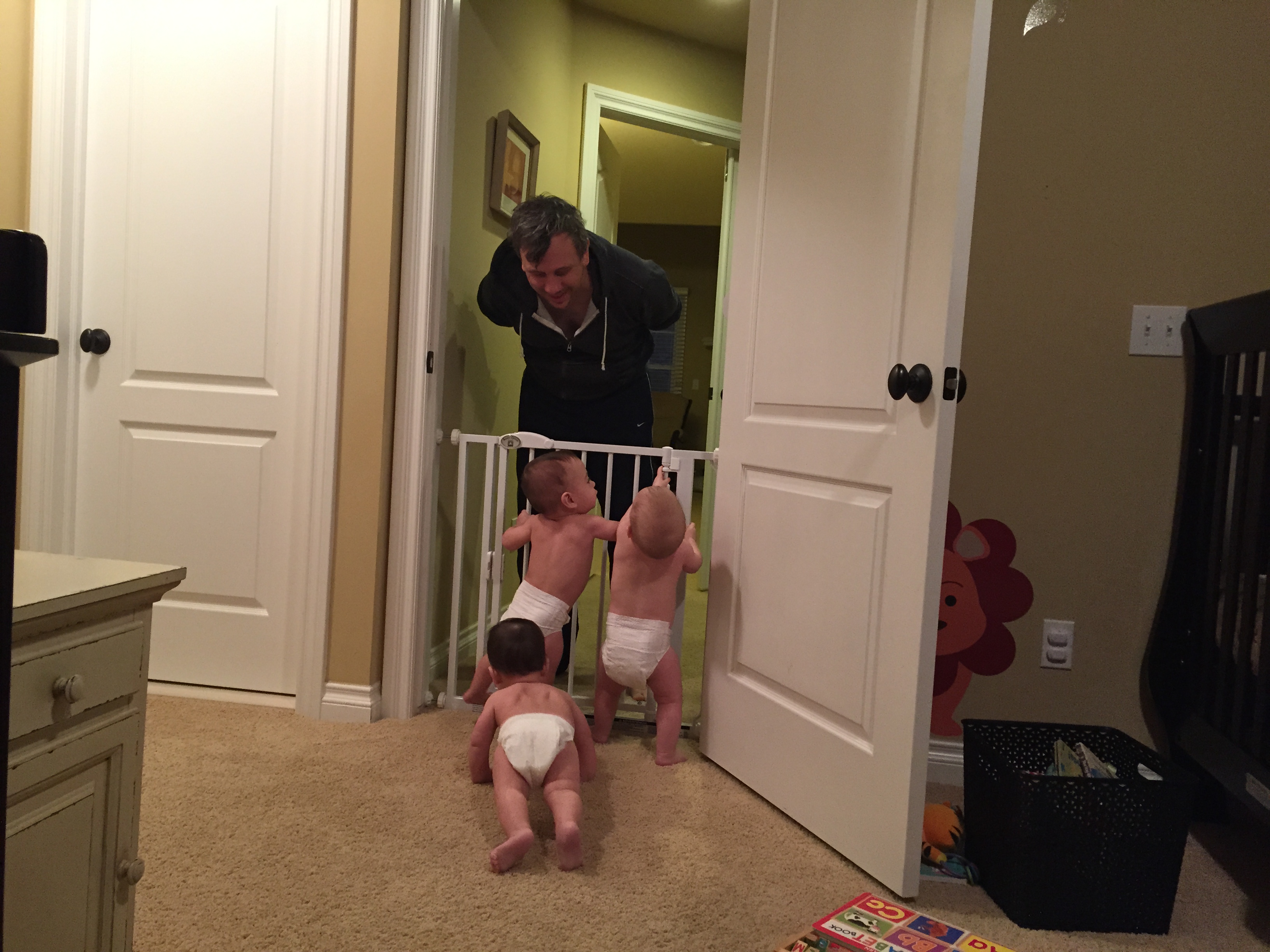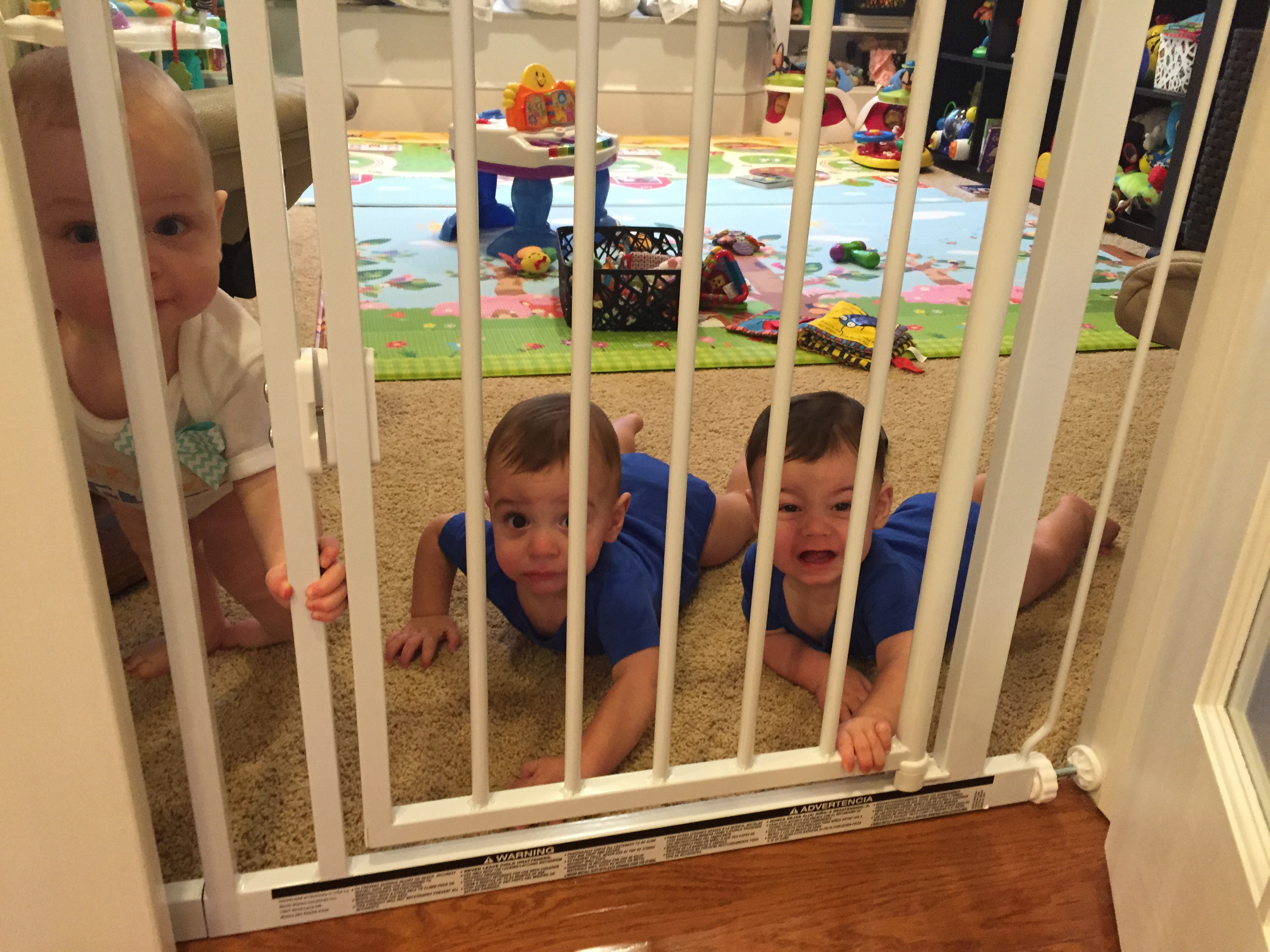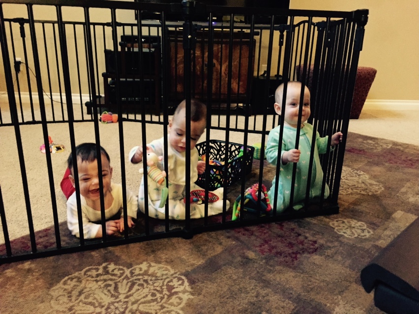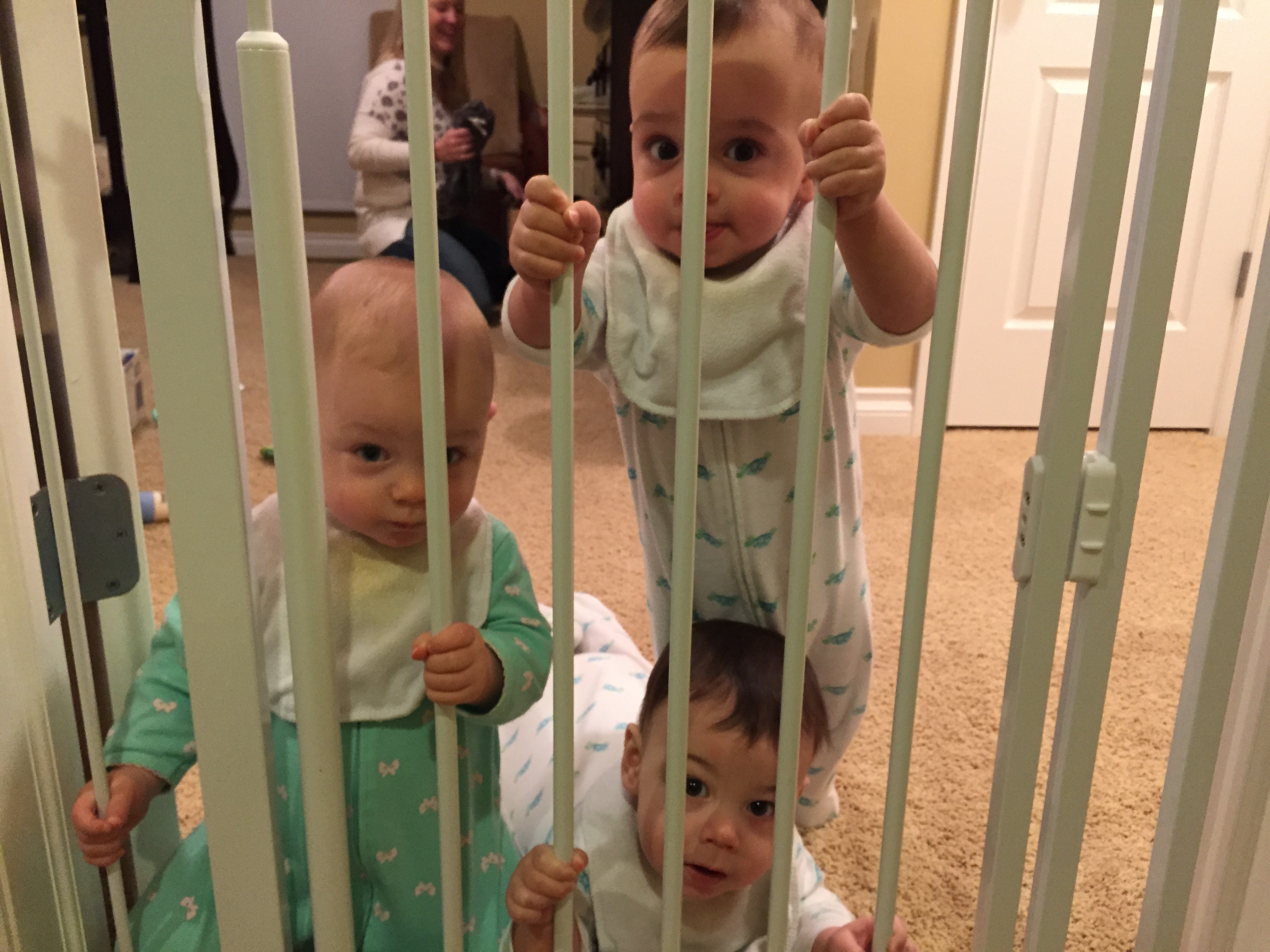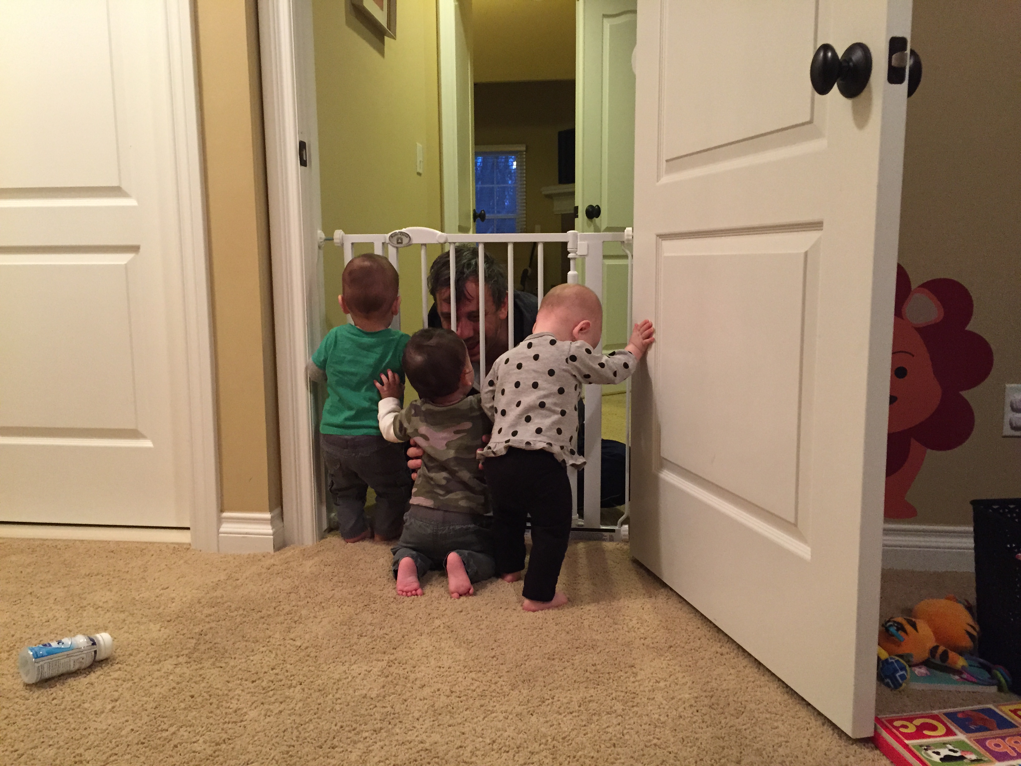 Babies at the gate visiting daddy before breakfast bottles. (Check out Steven planking. He’s working so hard to figure out crawling.)