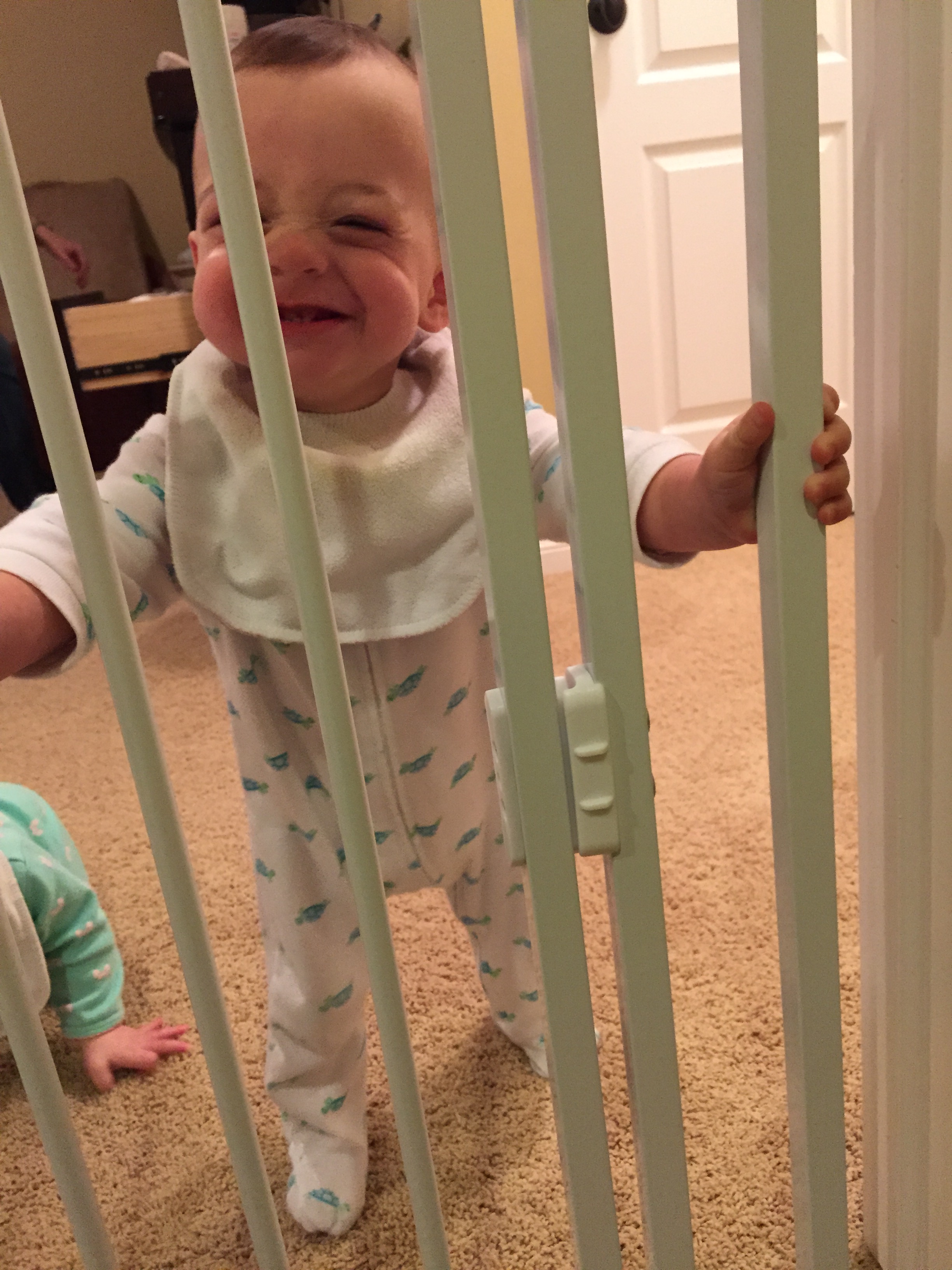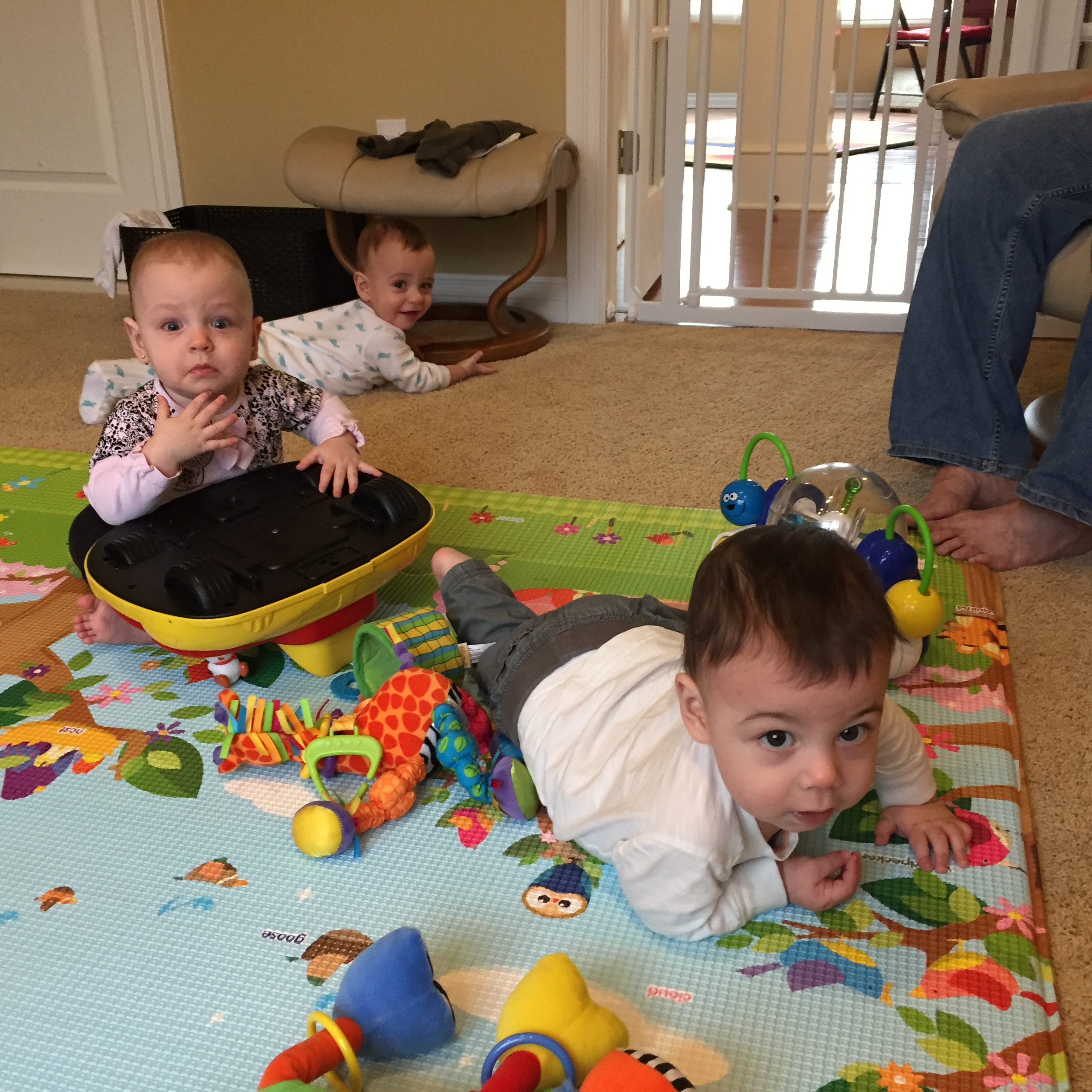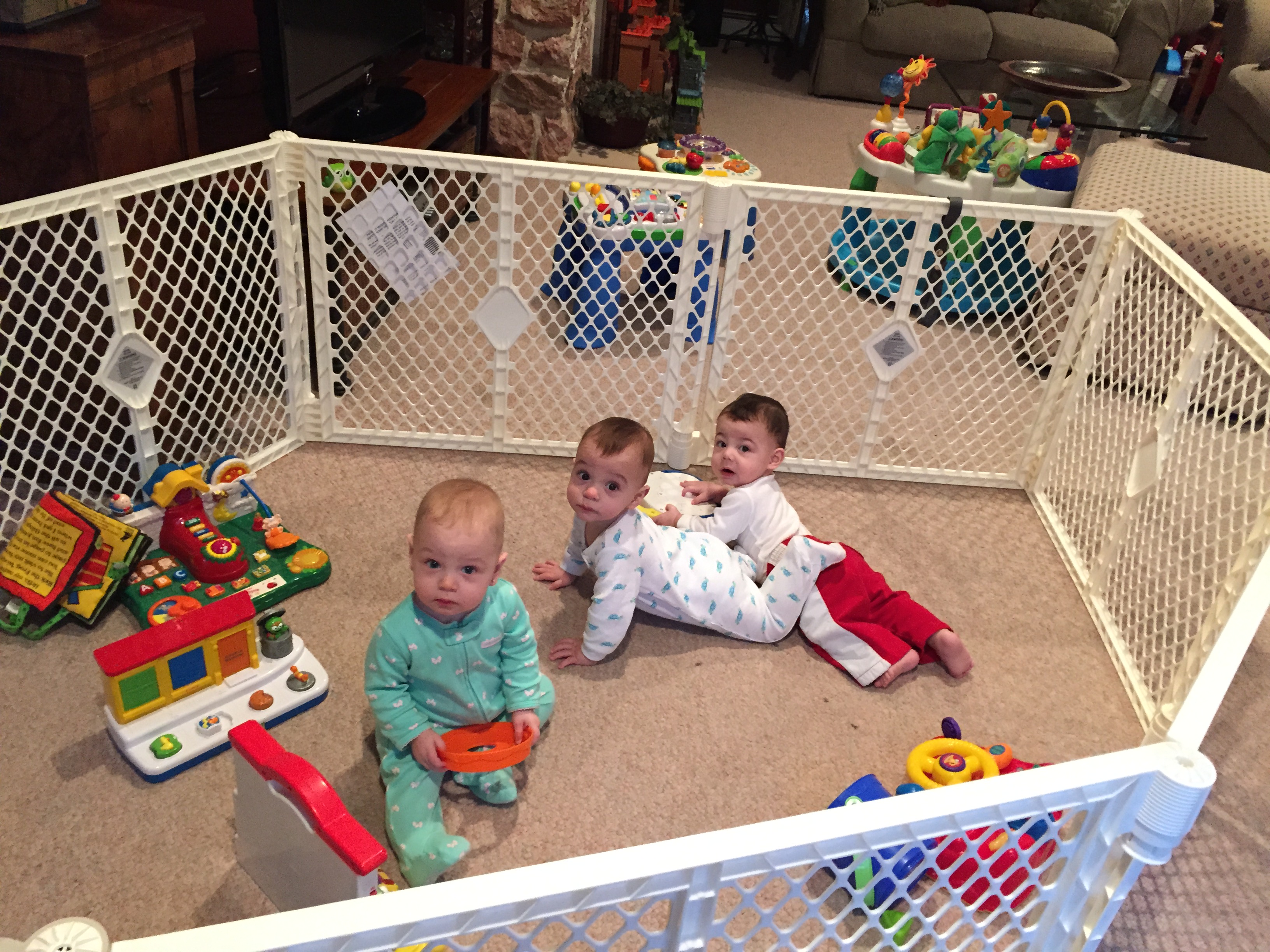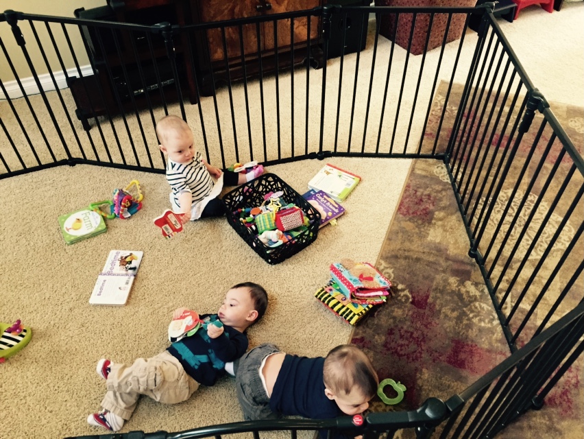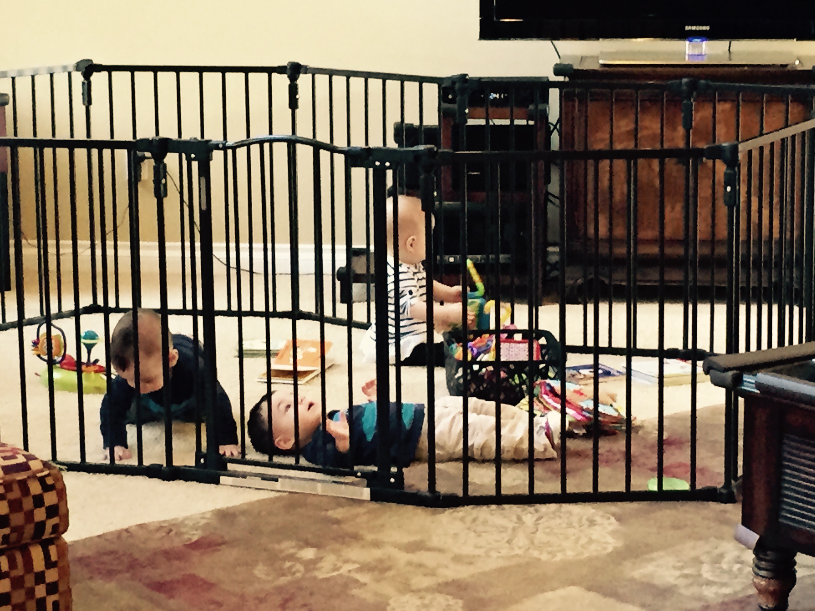 Babies at the gate visiting daddy before breakfast bottles. (Check out Steven planking. He’s working so hard to figure out crawling.)