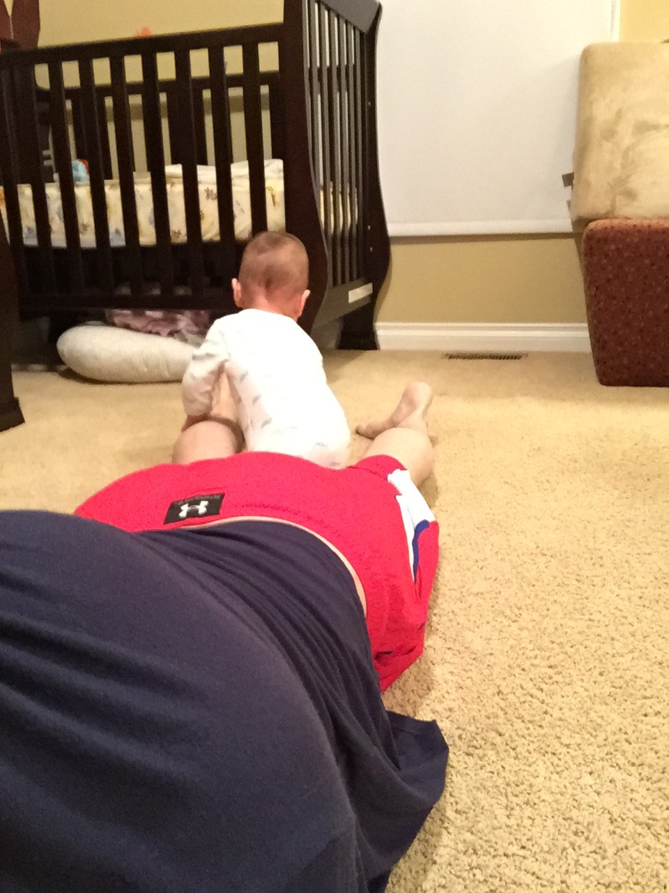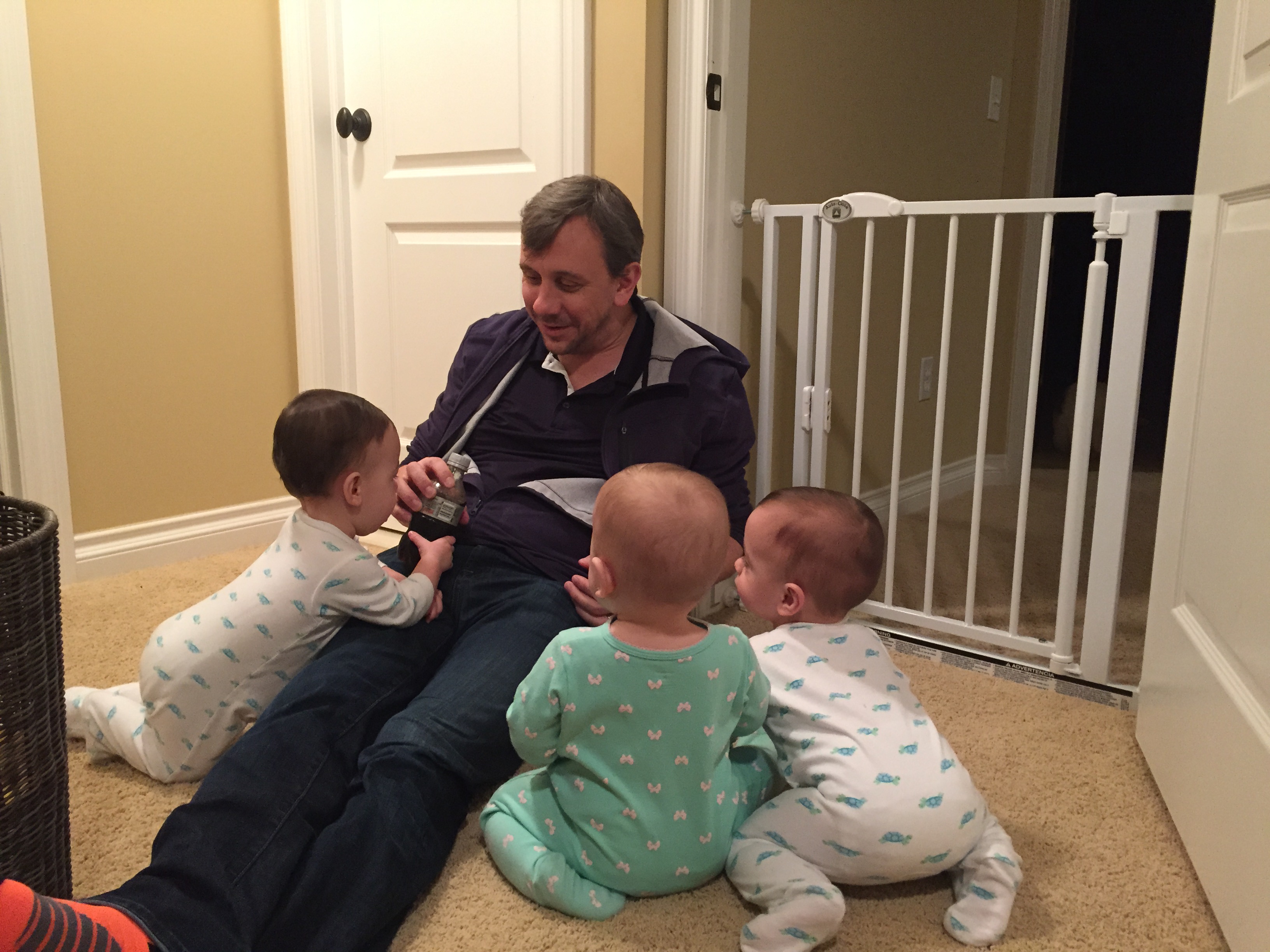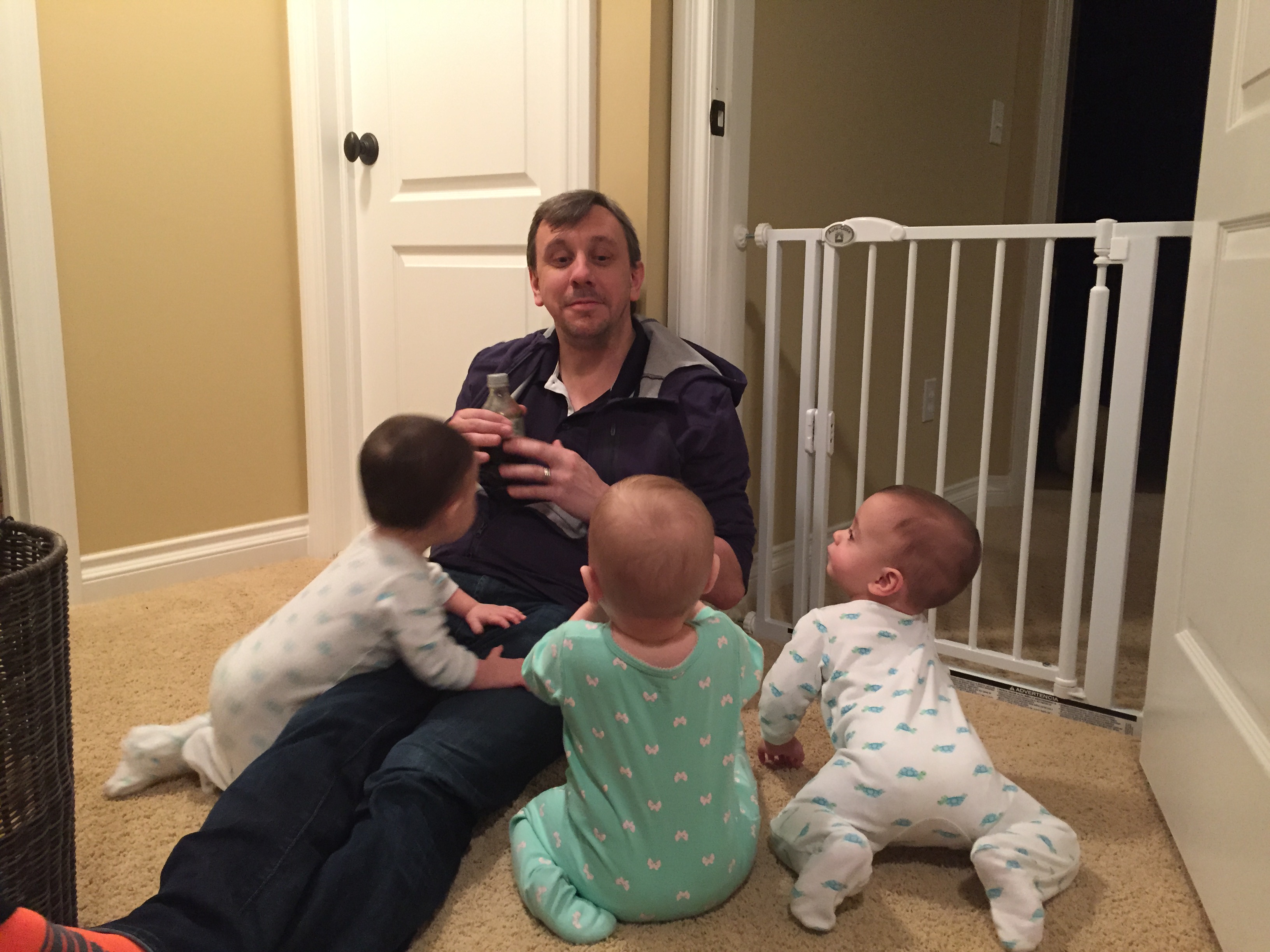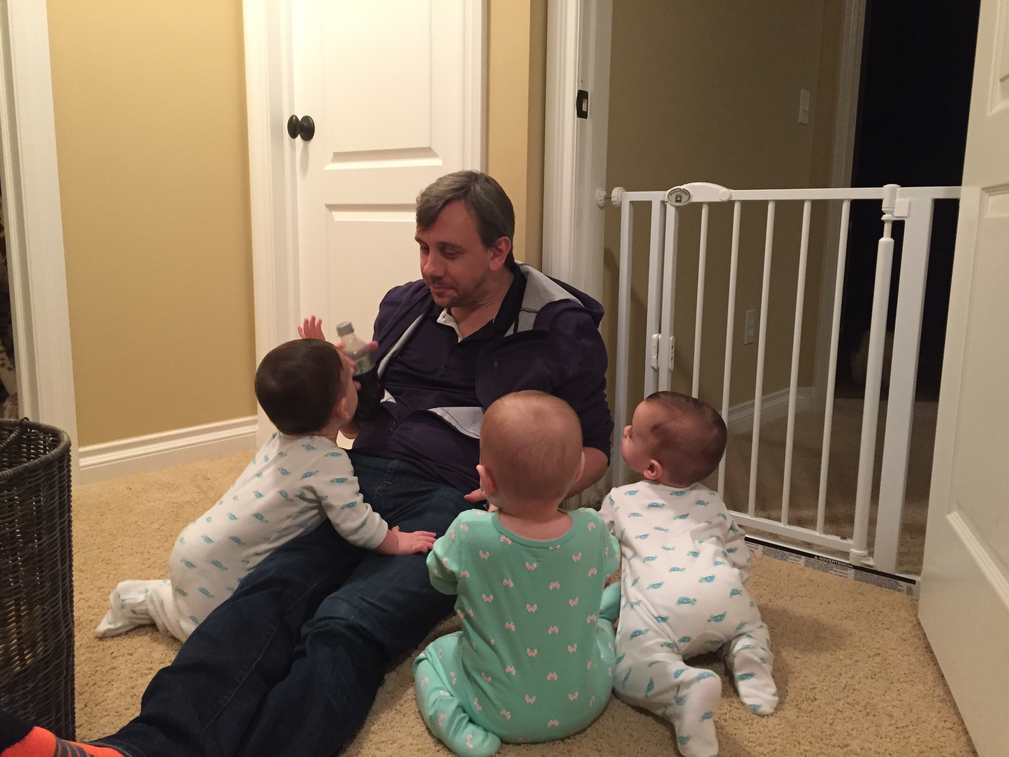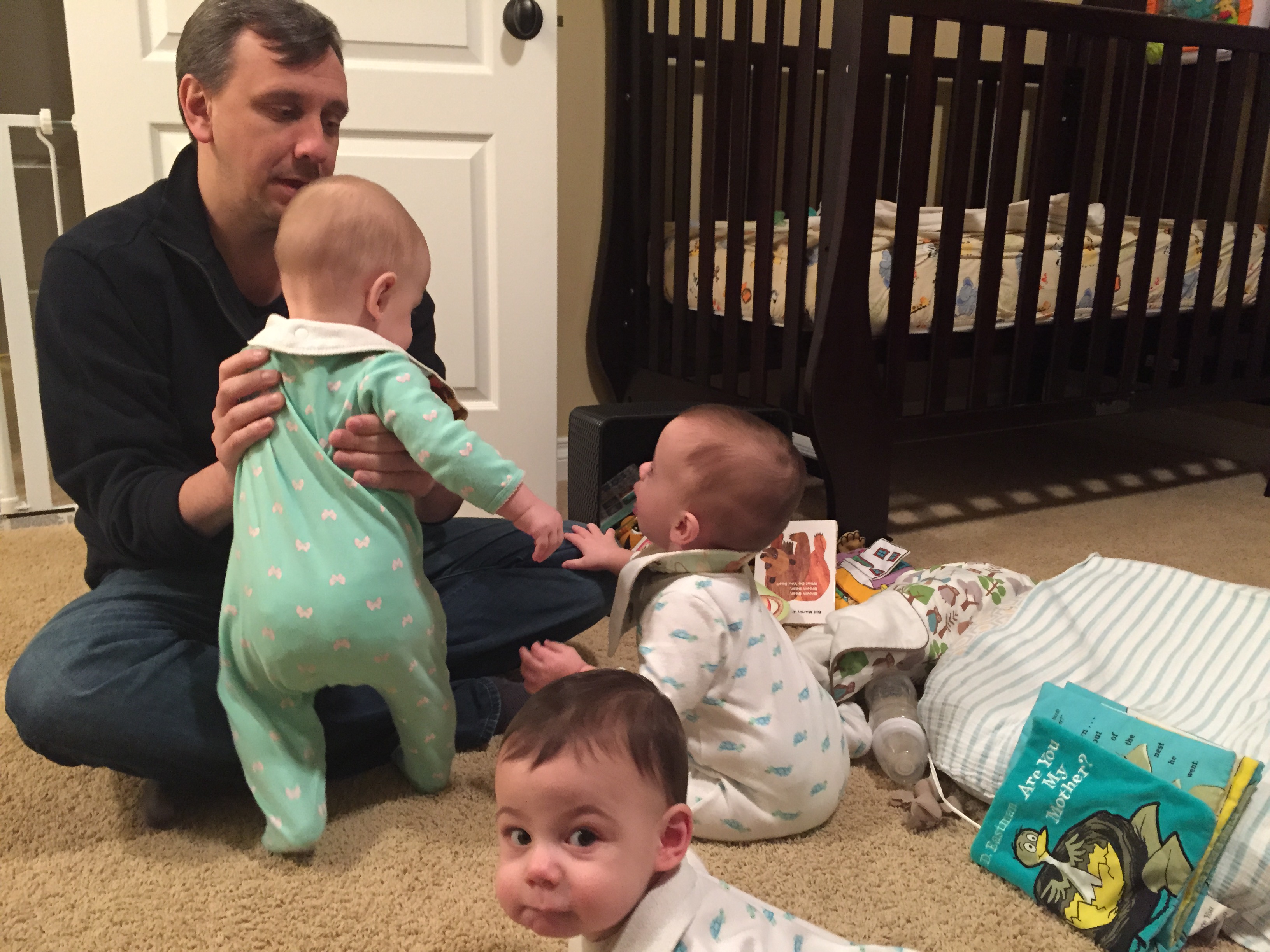 Babies at the gate visiting daddy before breakfast bottles. (Check out Steven planking. He’s working so hard to figure out crawling.)