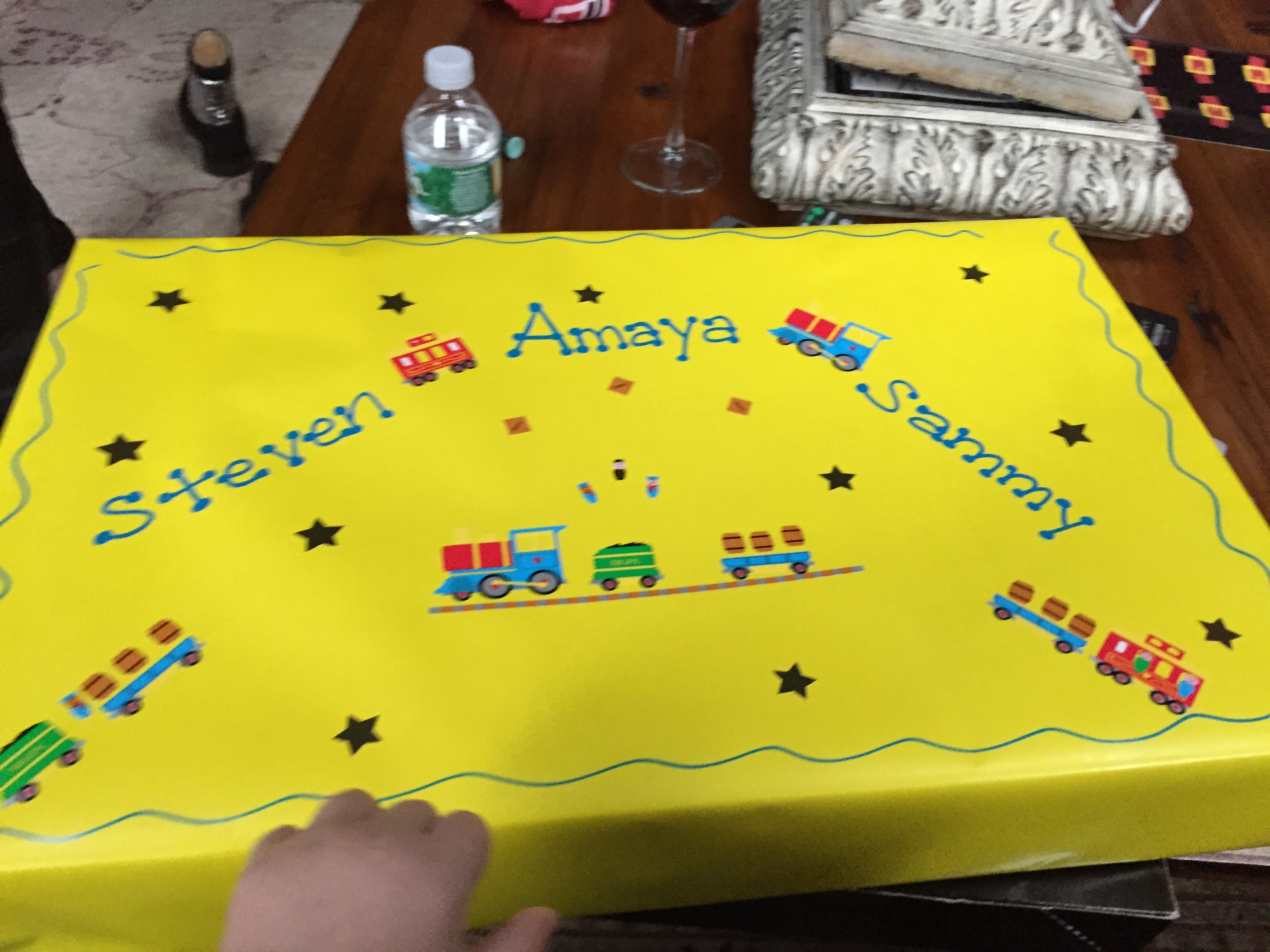 Wednesday was Megan’s birthday! Steven, Sammy and Amaya decided to take some photos holding letters that spell her name. Of course, after their great idea, they sure didn’t make it easy to take the photos. Here’s the gift they picked out.
