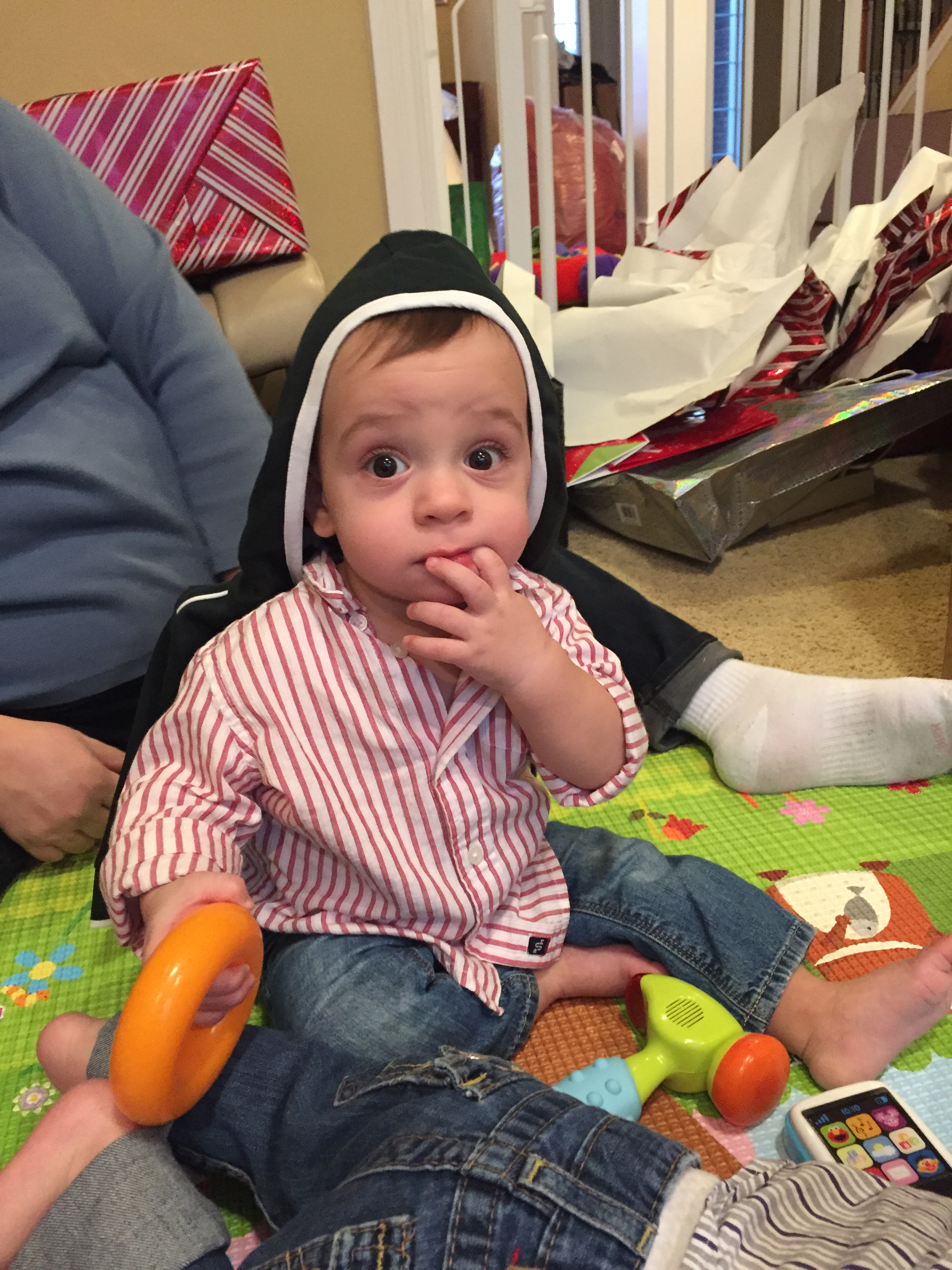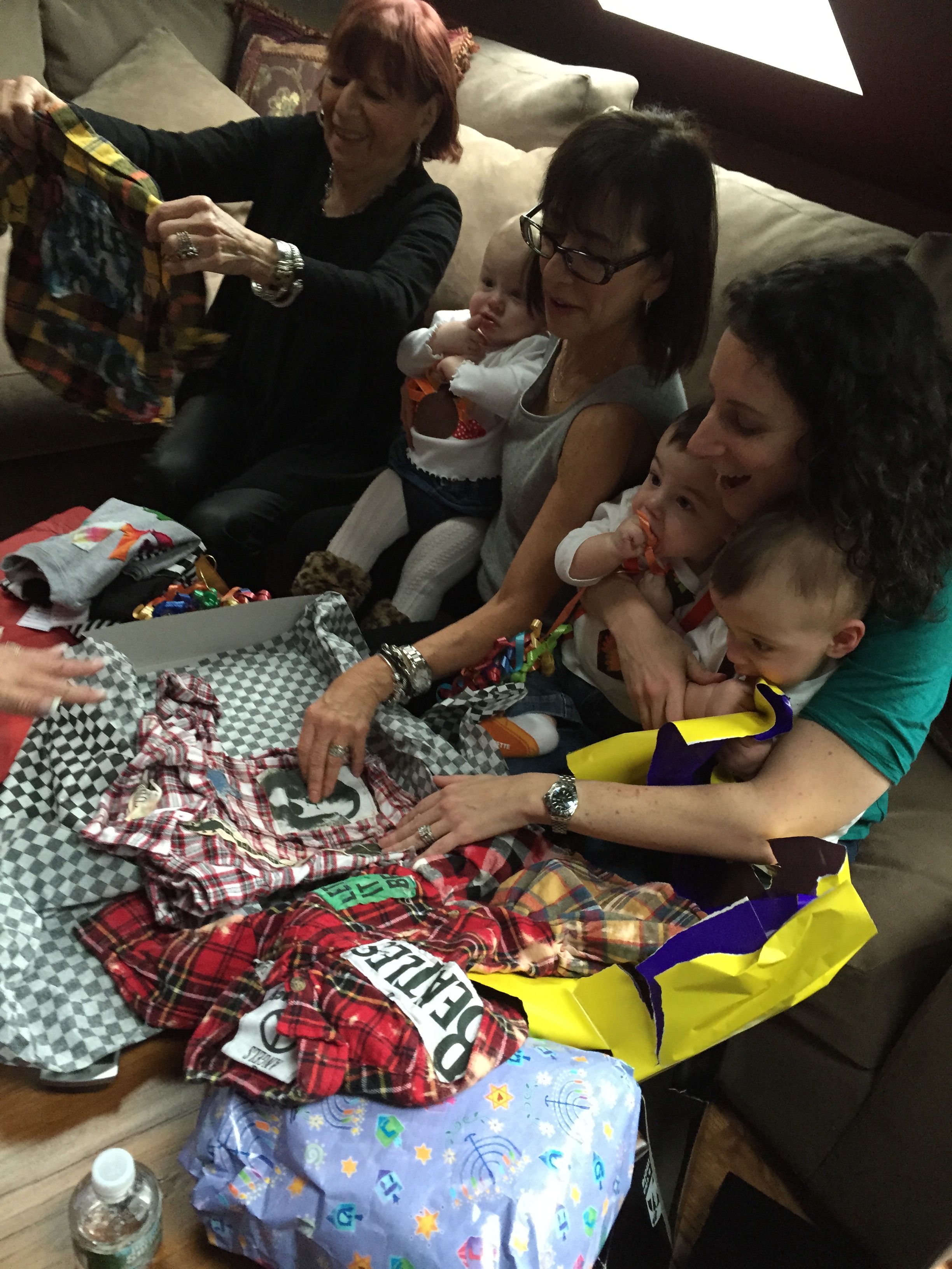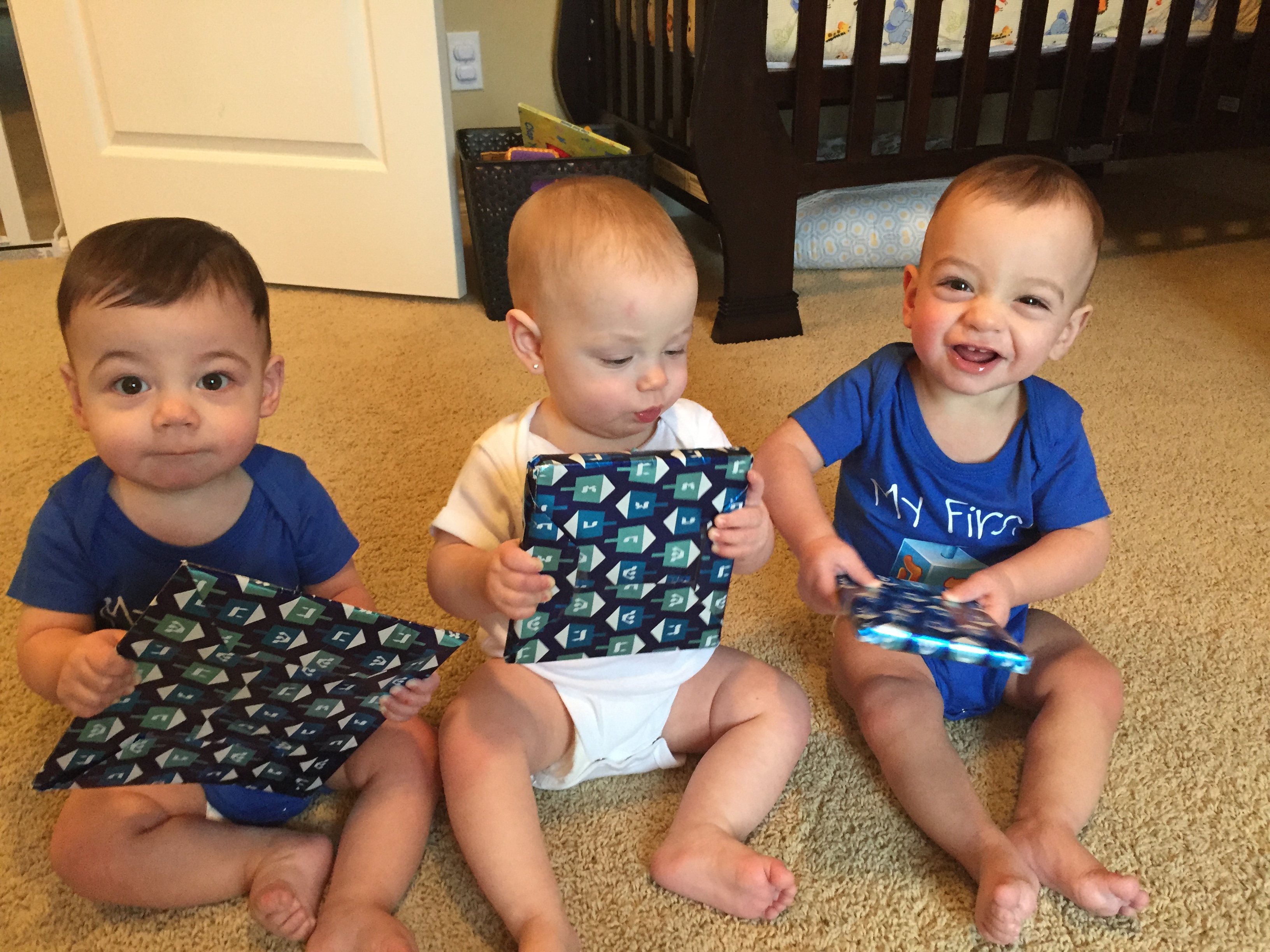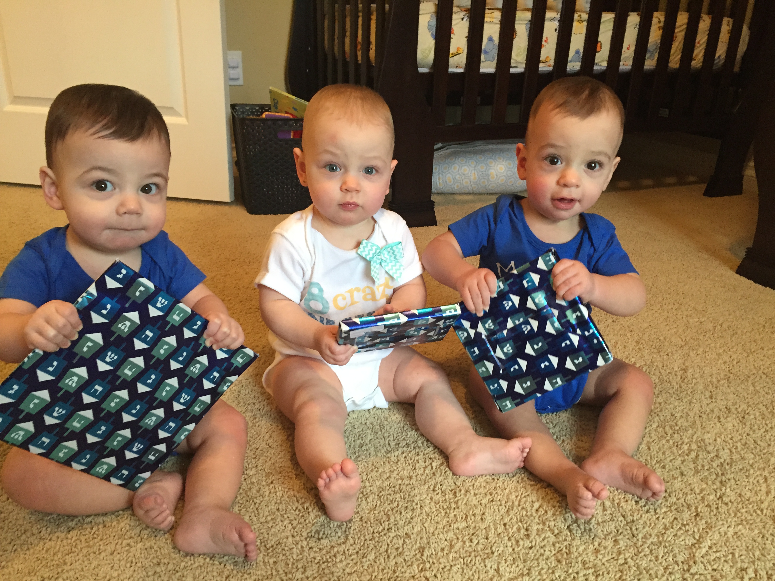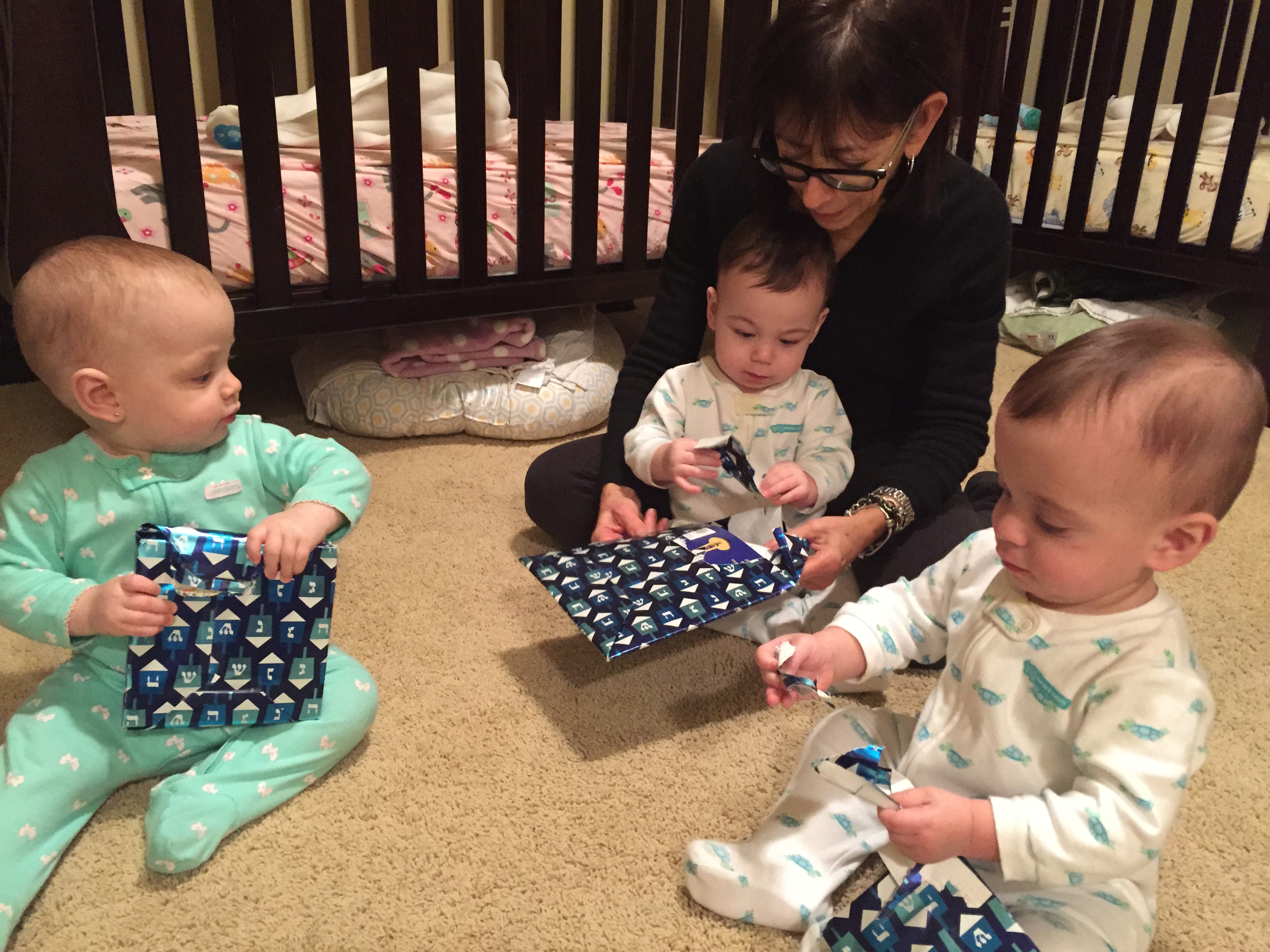 We took some photos with gifts from Uncle Austin, Aunt Dena and Lavinia. The boys’ onesies say “My First Hanukkah” and Amaya’s says, “8 Crazy Nights.”