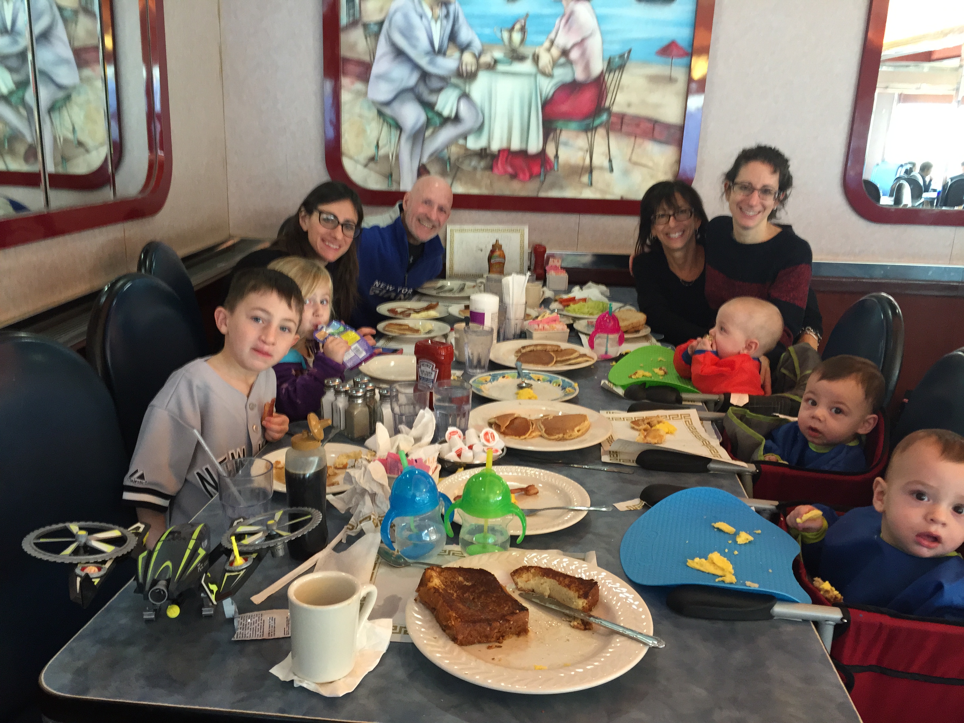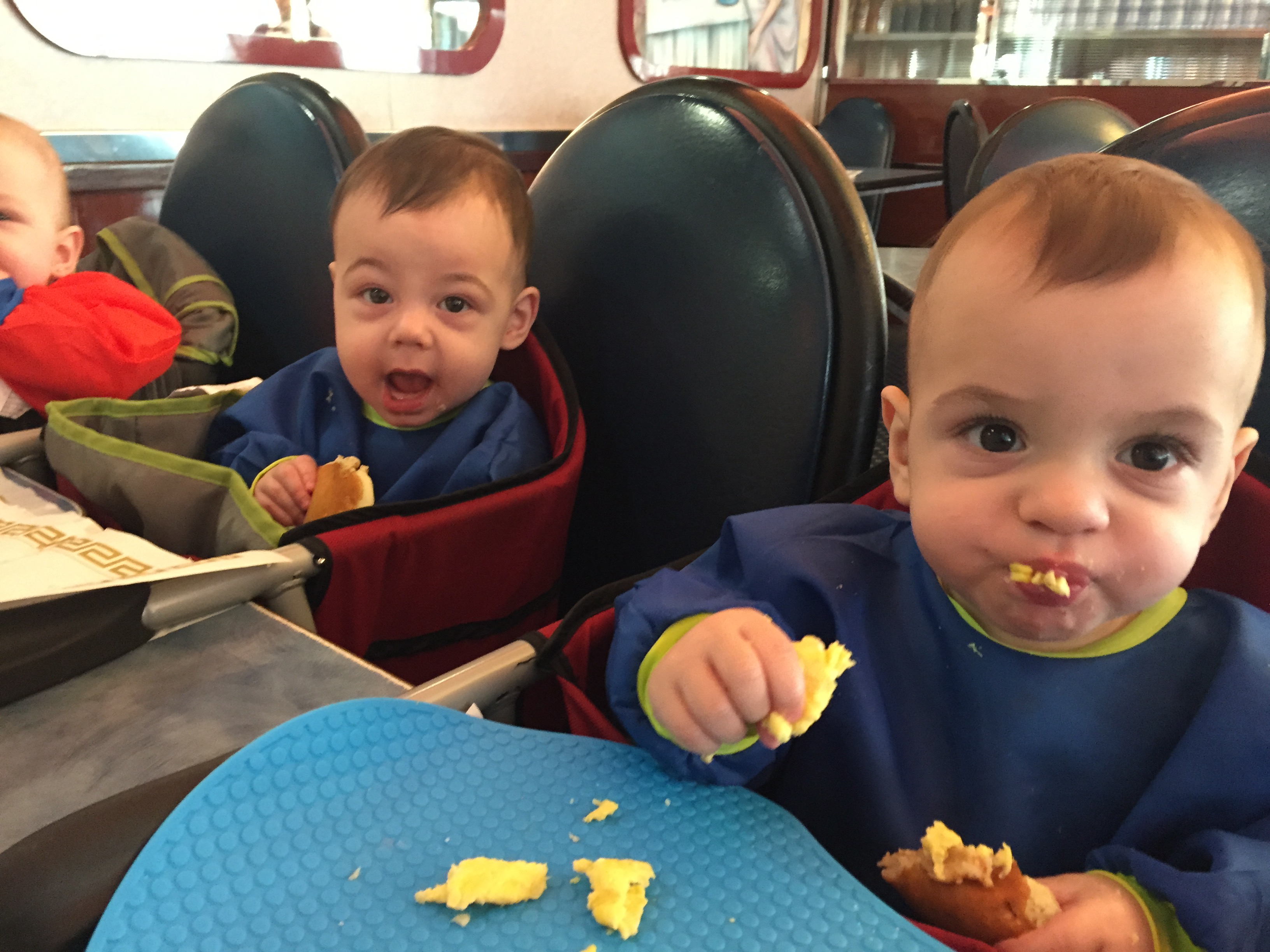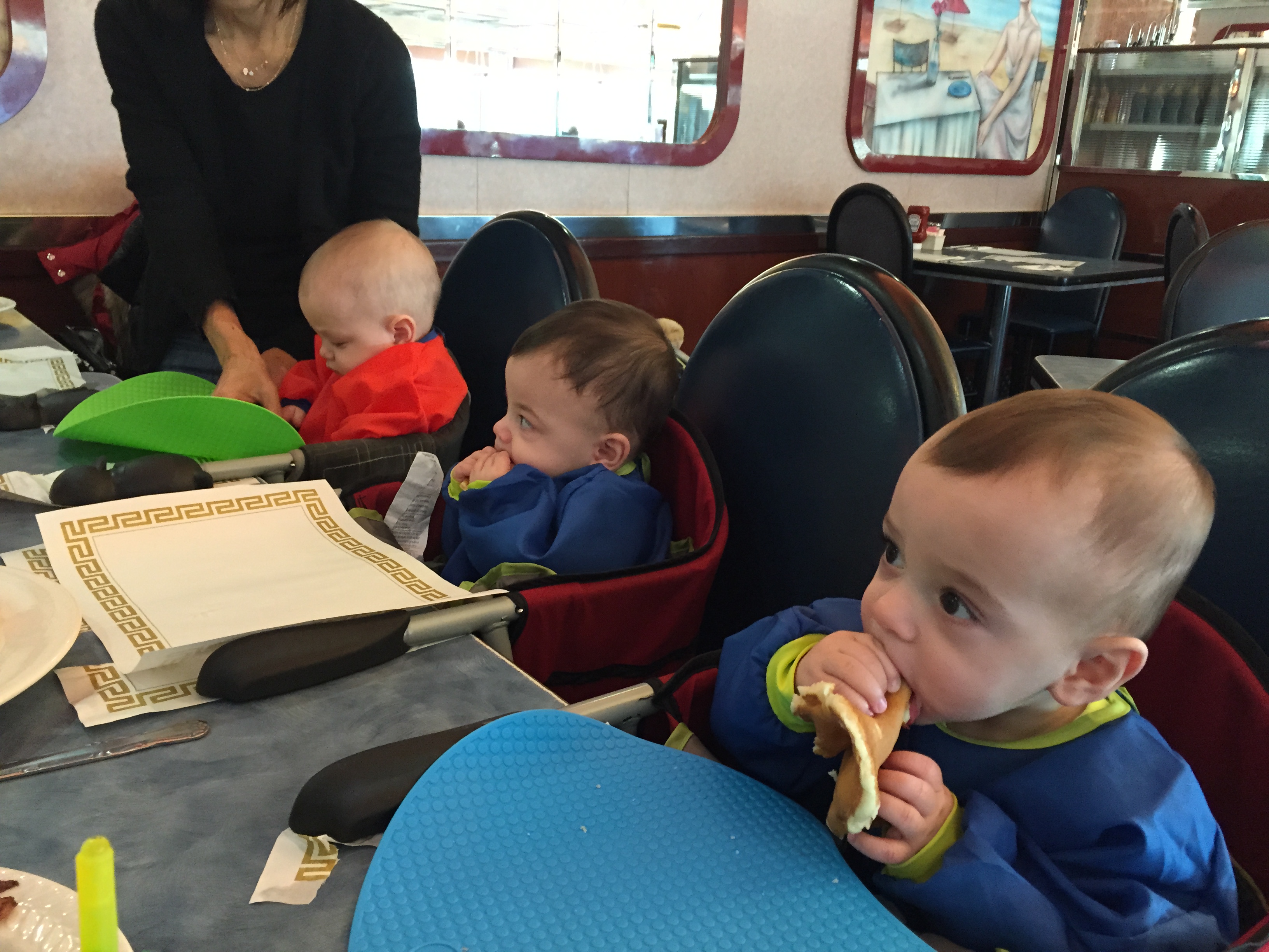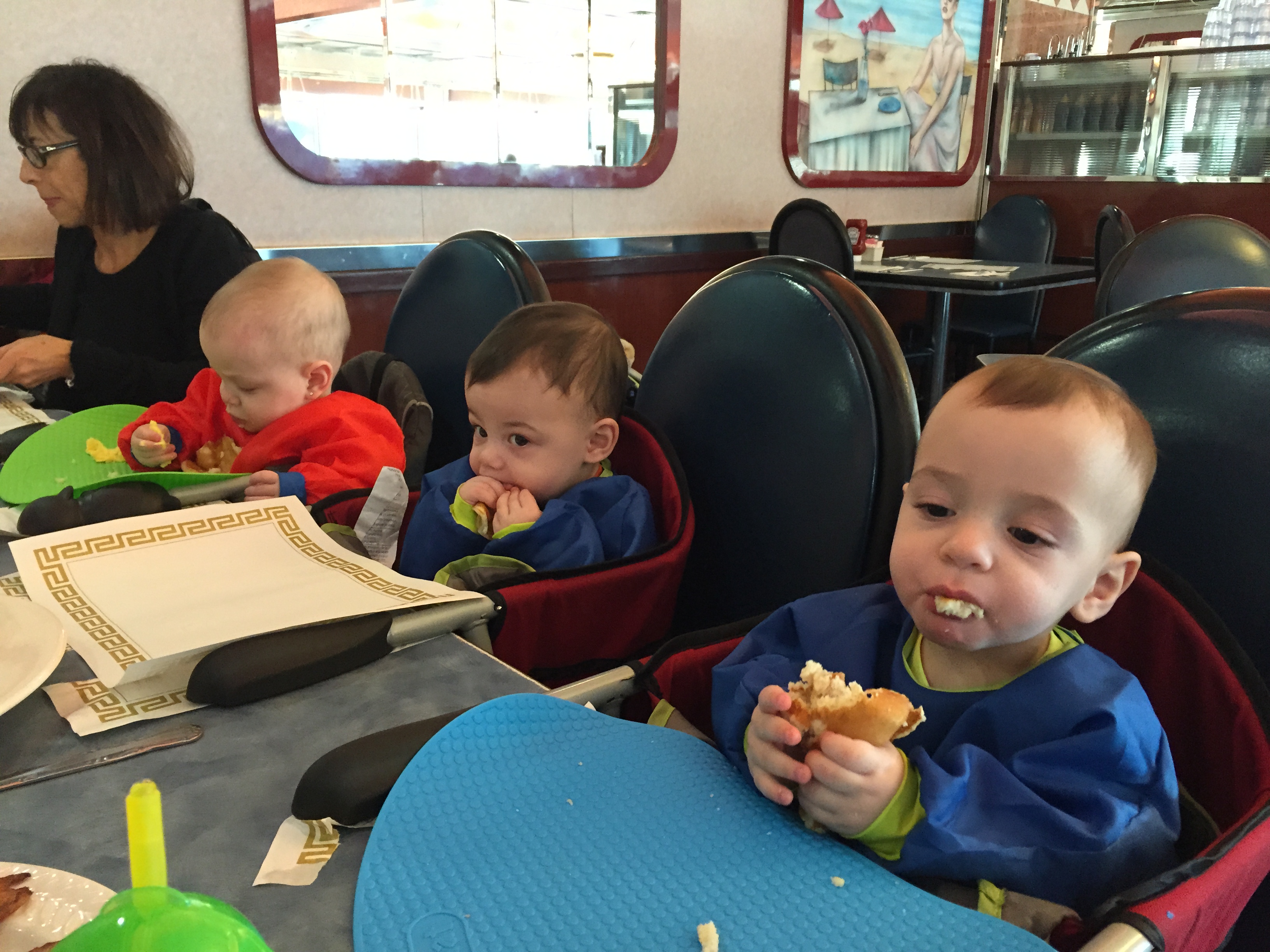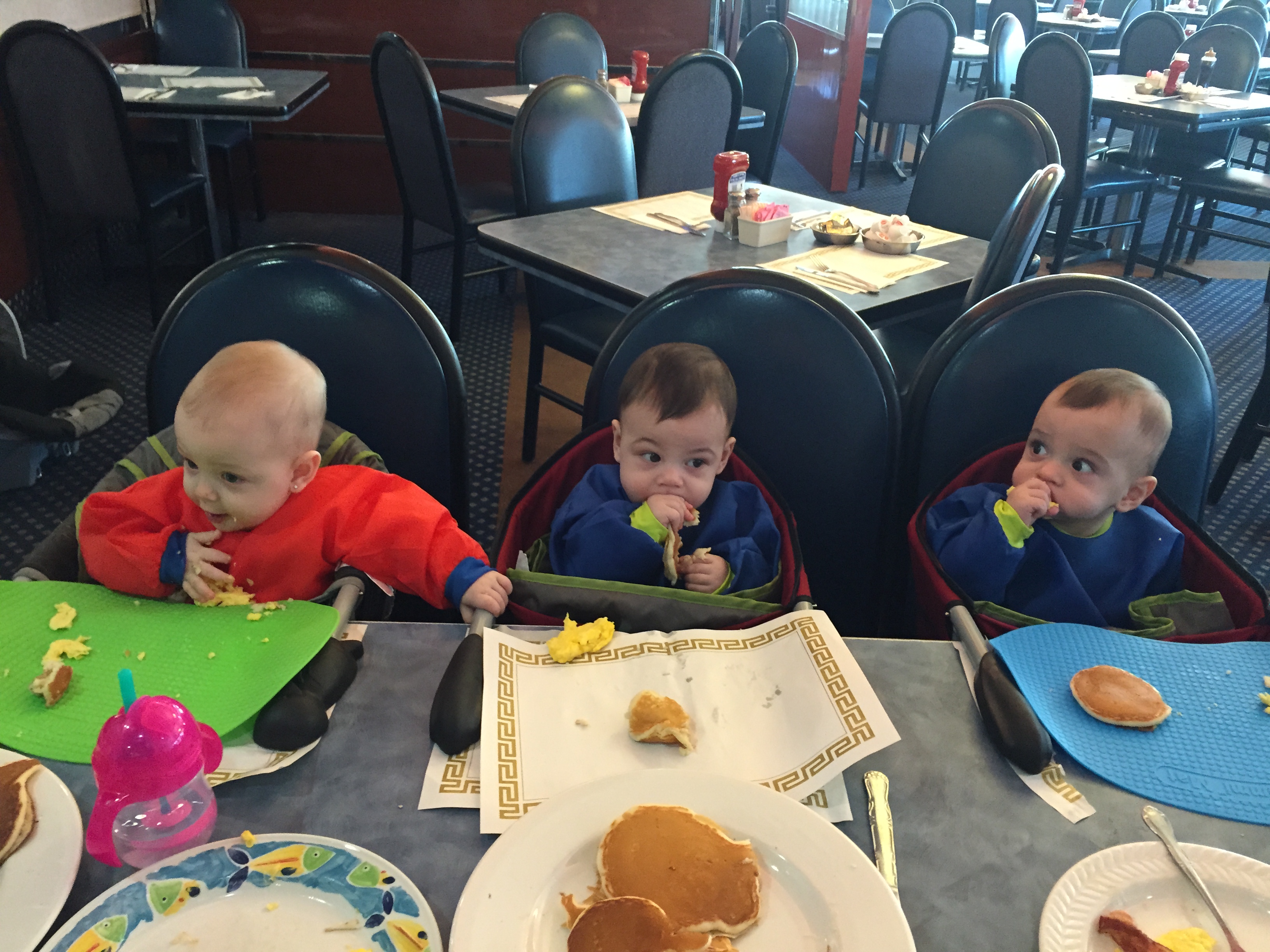 On Friday, we had our first ever meal at a restaurant. A diner, in fact! Jason and I have eaten out with the babies in tow but this was the first time that Steven, Sammy and Amaya got to sit at the table and eat with us. Pancakes and eggs for everyone!! They were so cute sitting at the table eating their breakfast. <3