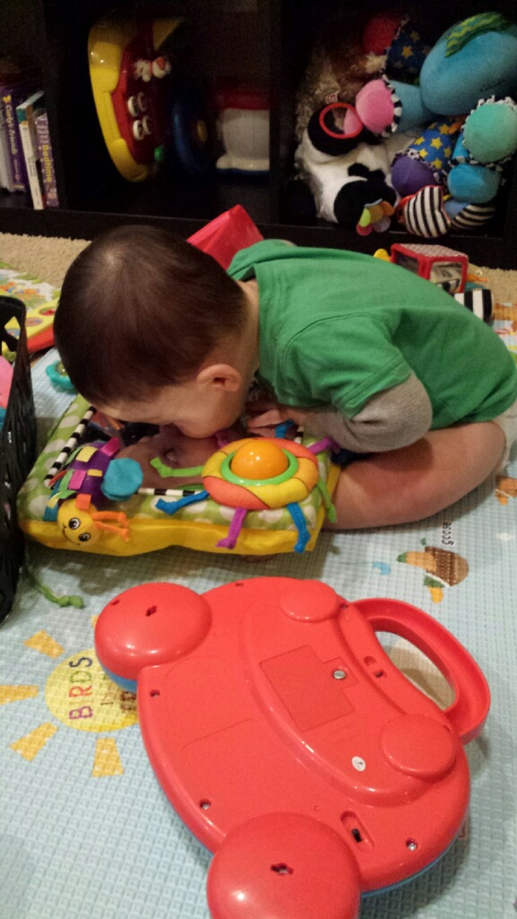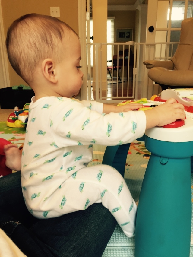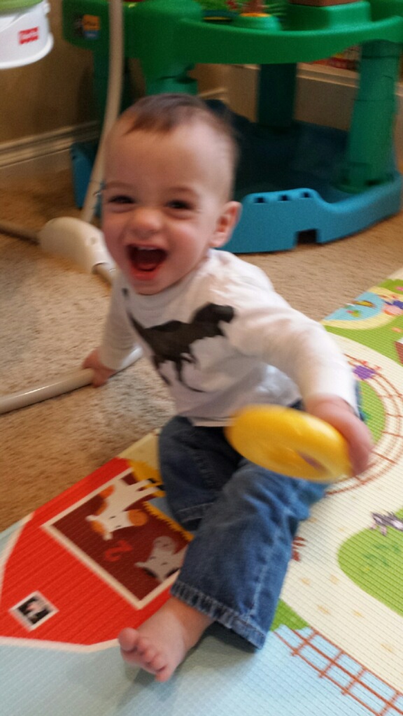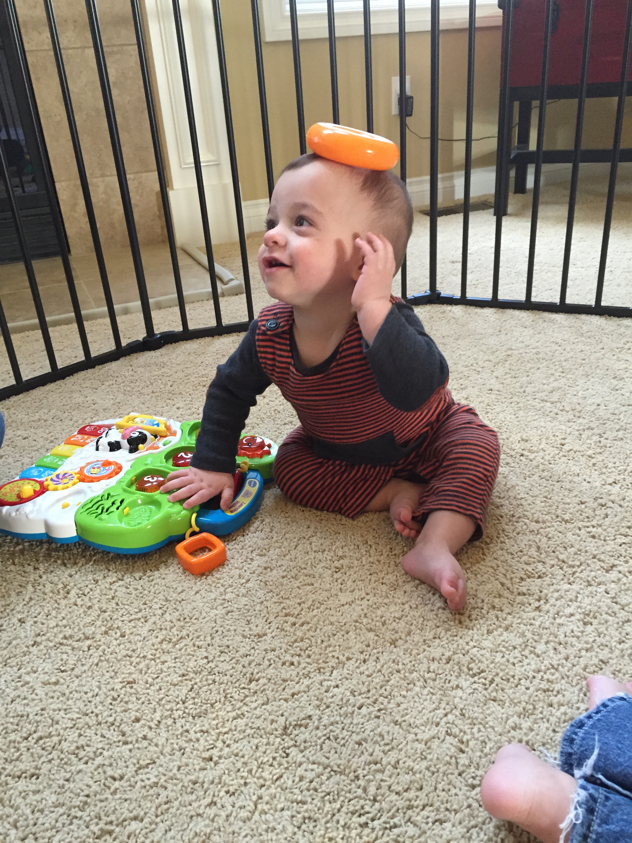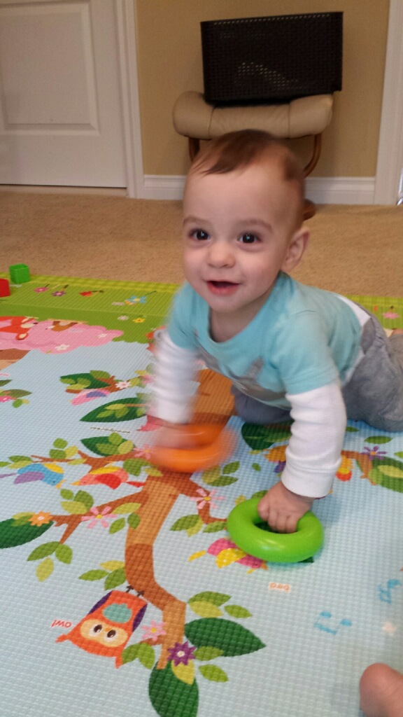 Sammy loooooooves the donuts. In fact, now he crawls around with one in each. It’s so cute.