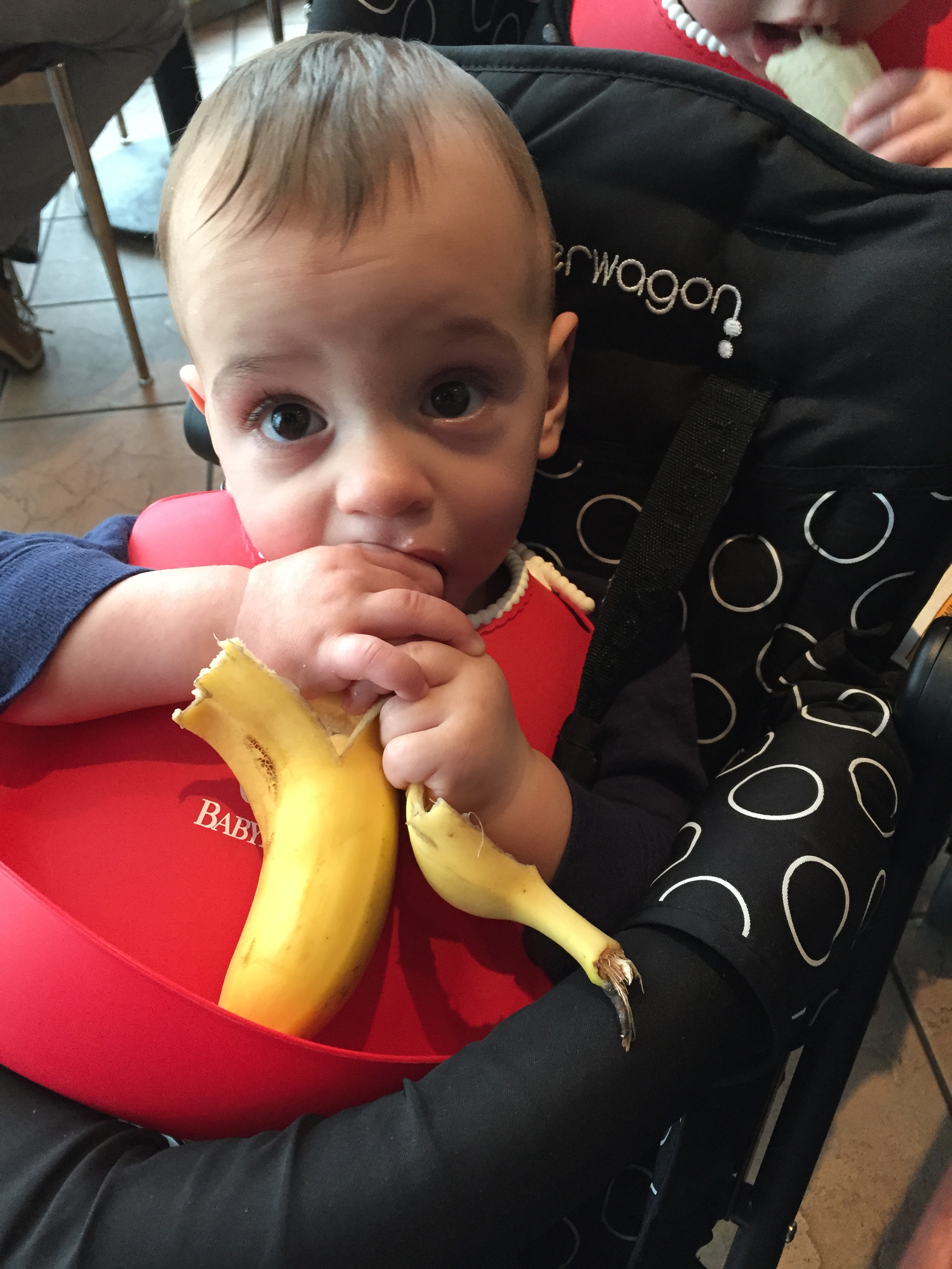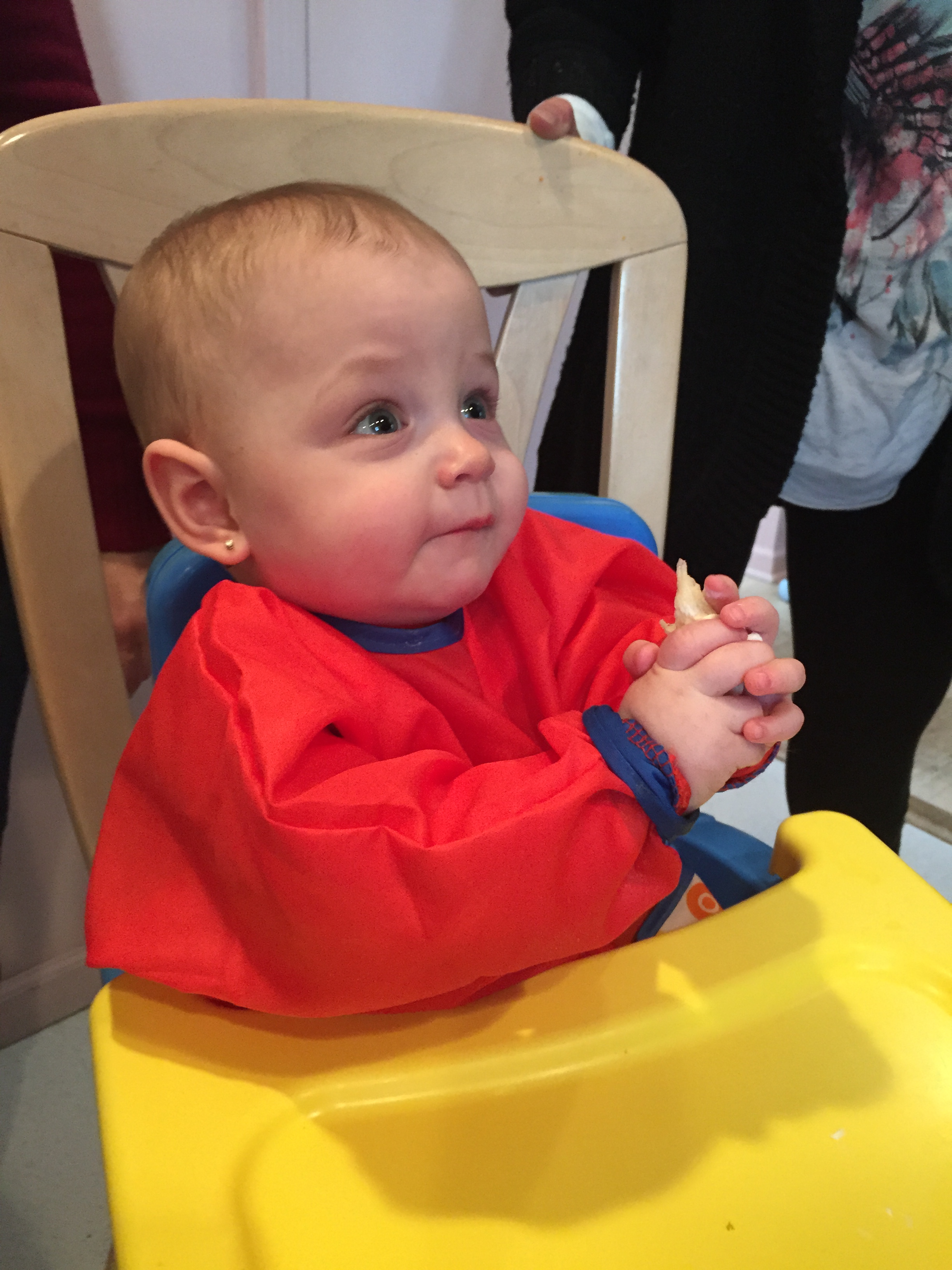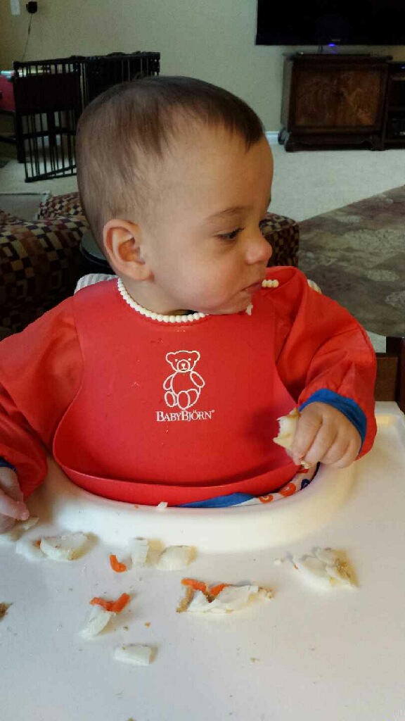 Sammy loooooooves the donuts. In fact, now he crawls around with one in each. It’s so cute.