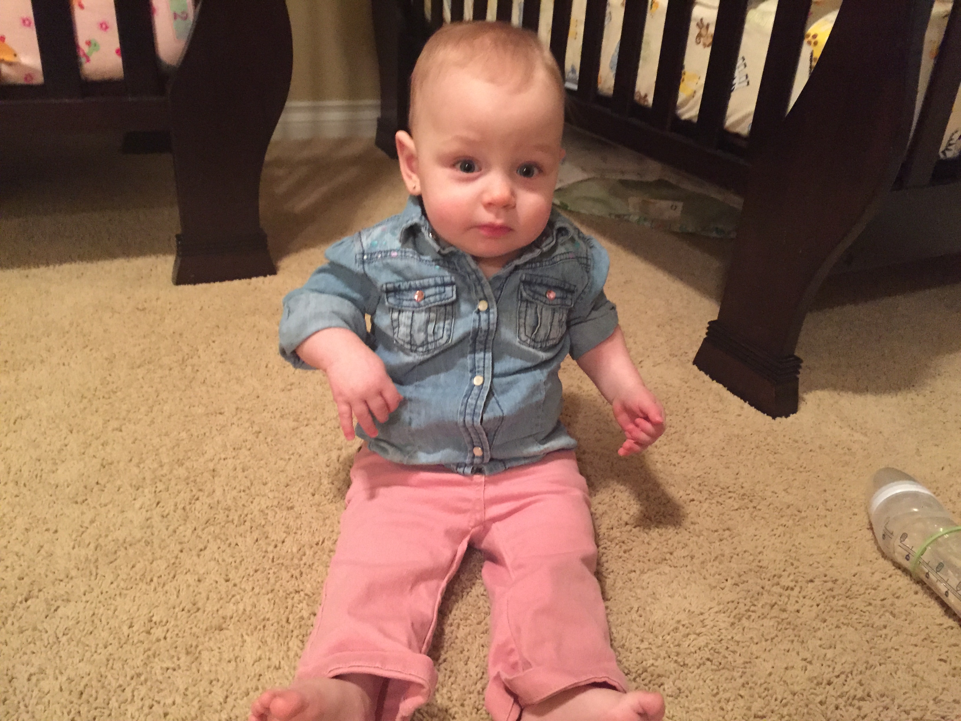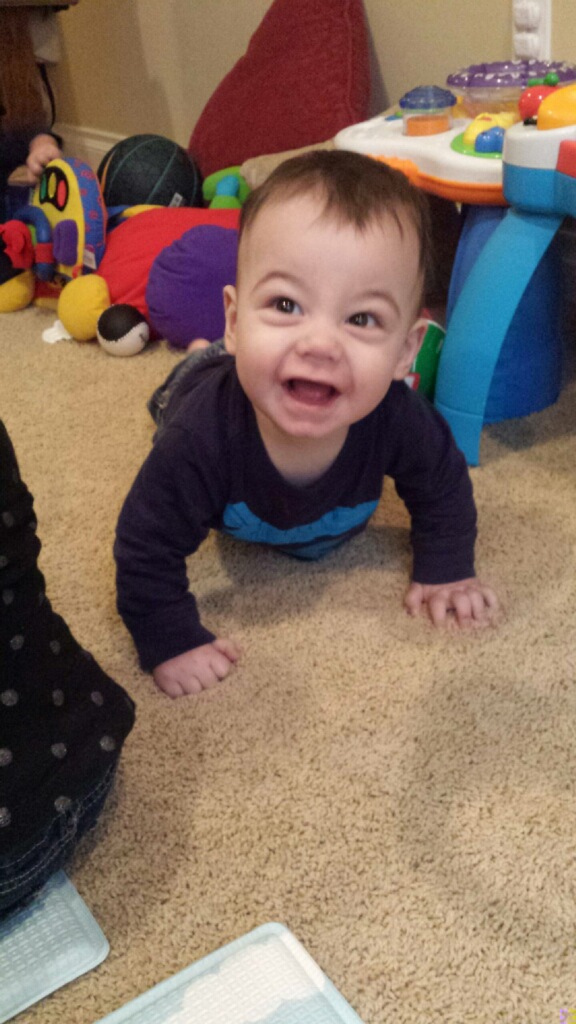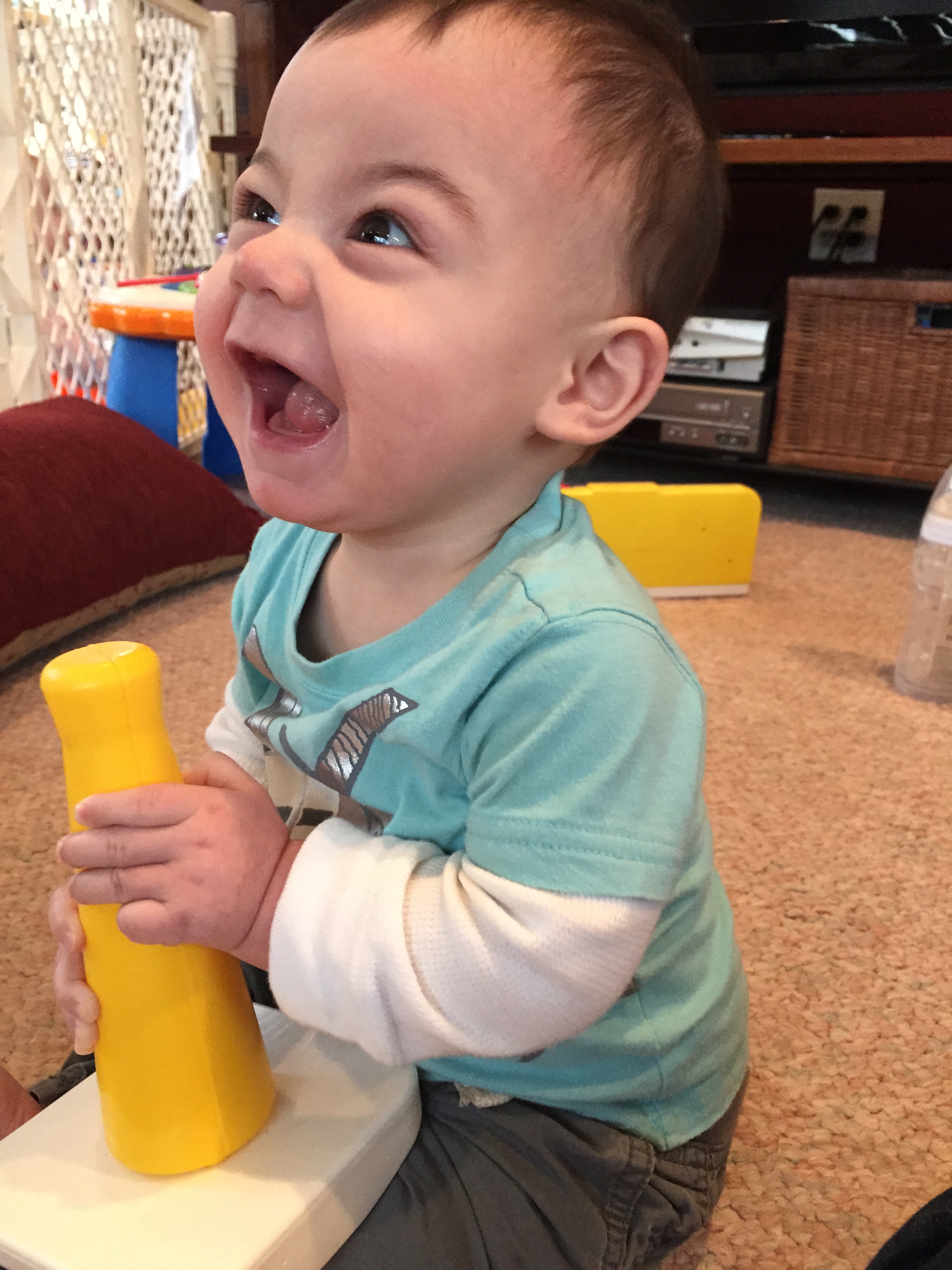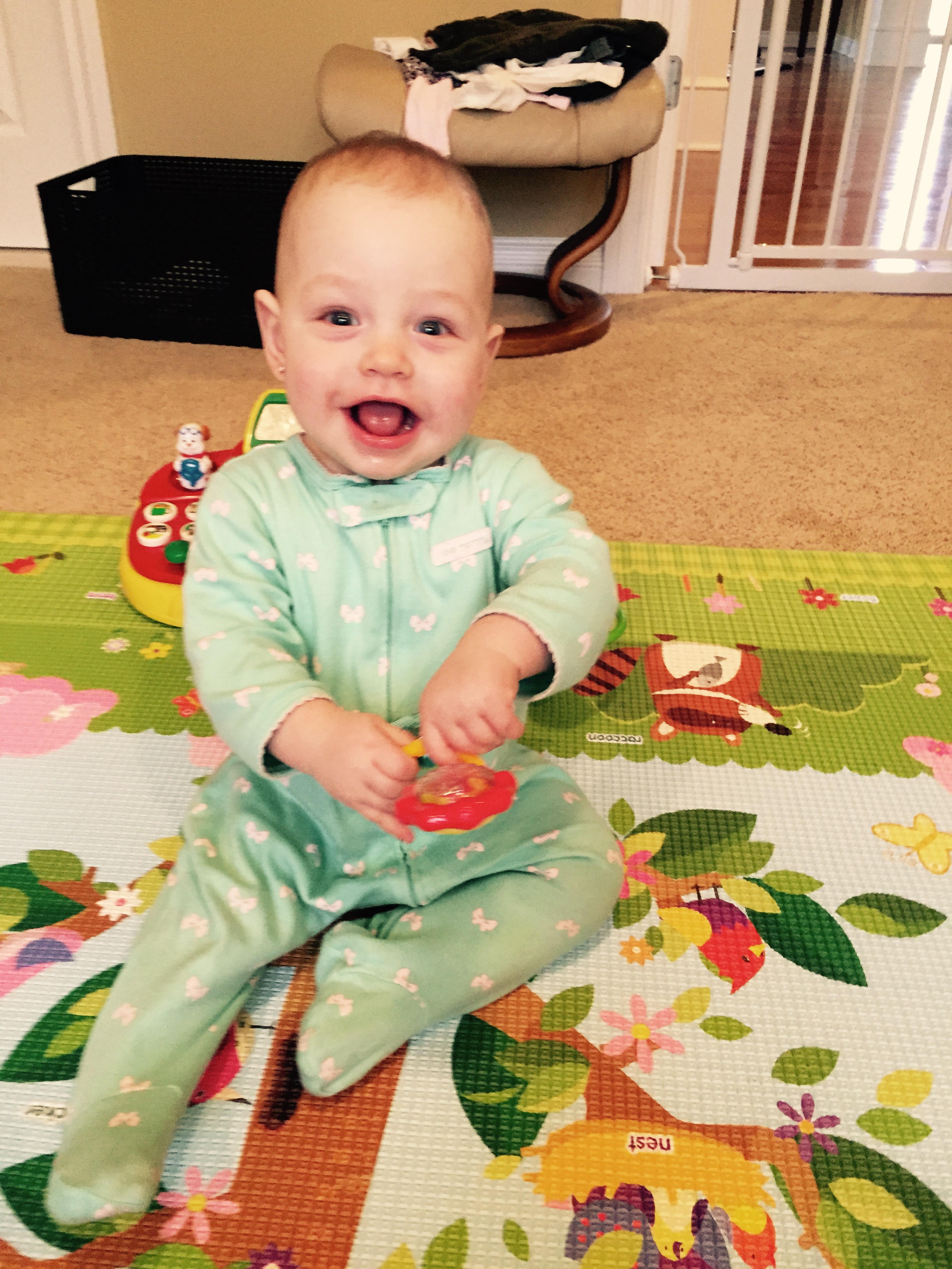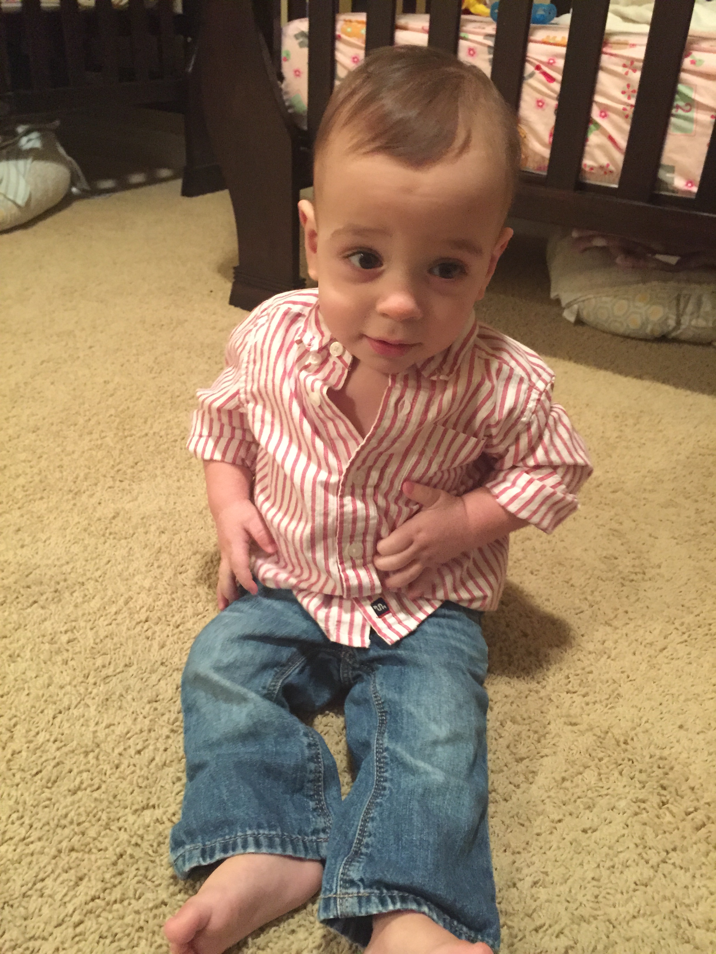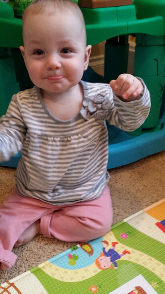 Steven is a sweet little mush ball. He can clap, and go from siting to his belly, and he’s still army crawling but rocking on his hands and knees more regularly. Steven is still the most focused on small details. He can spend ages playing with a mountain dew bottle or the snap on a washcloth. He still doesn’t have any teeth! New, Steven claps!