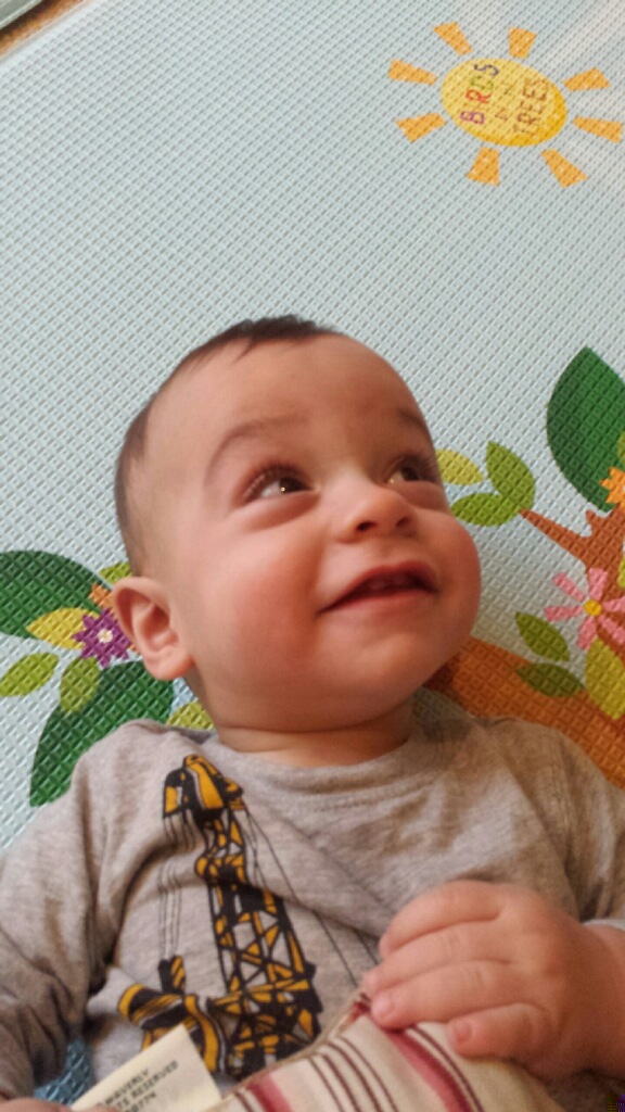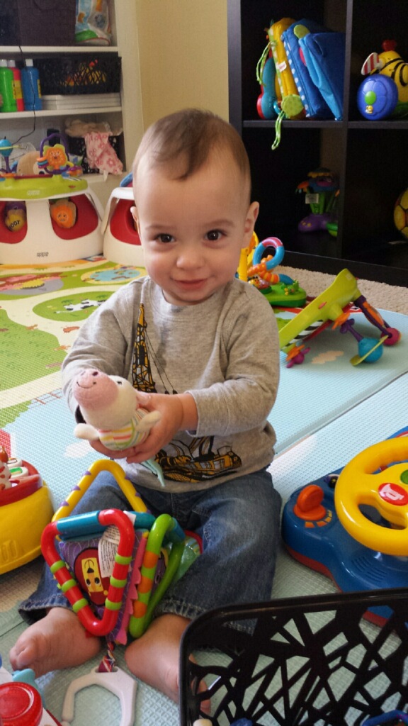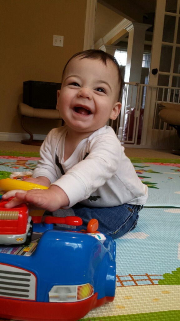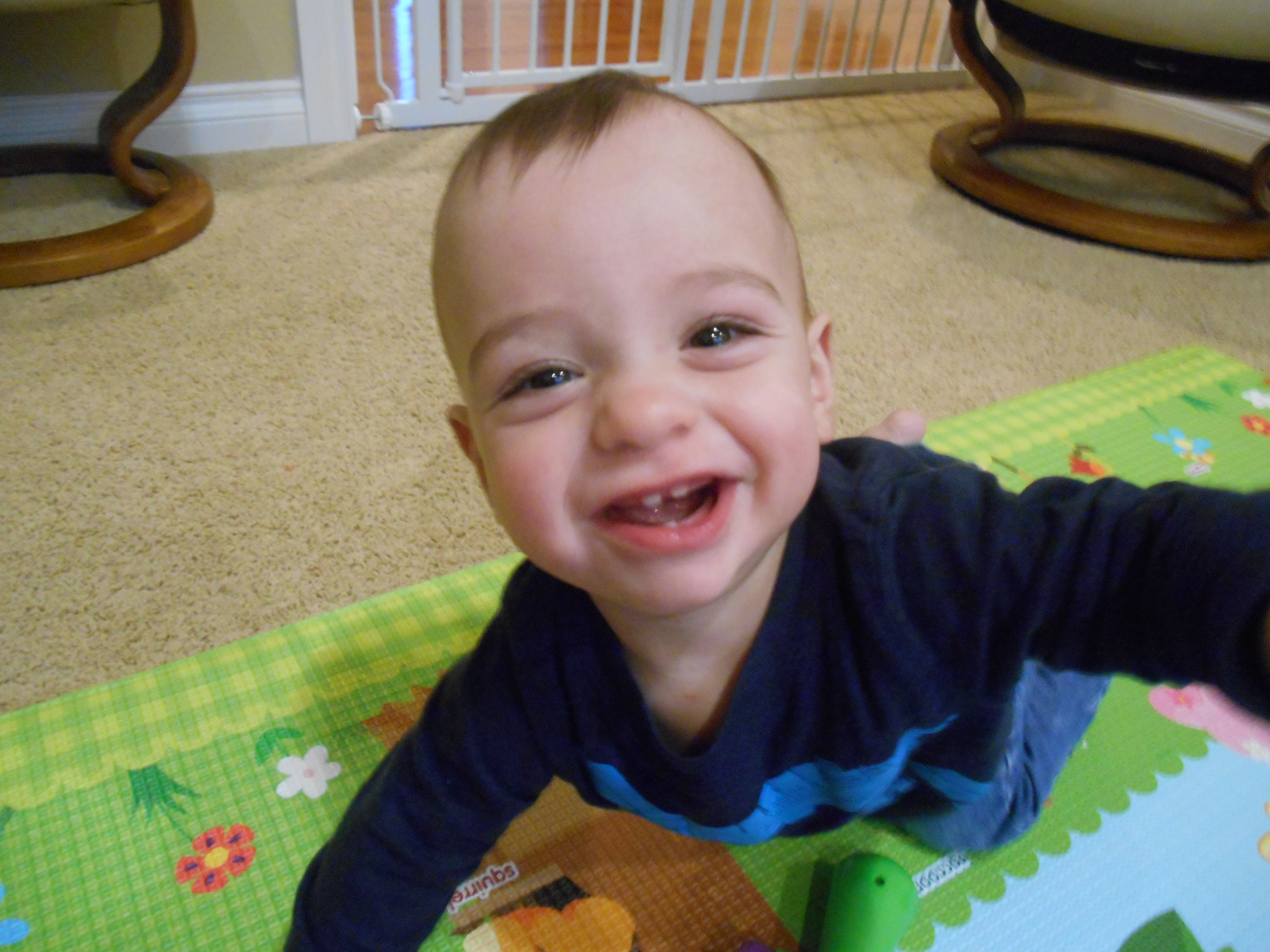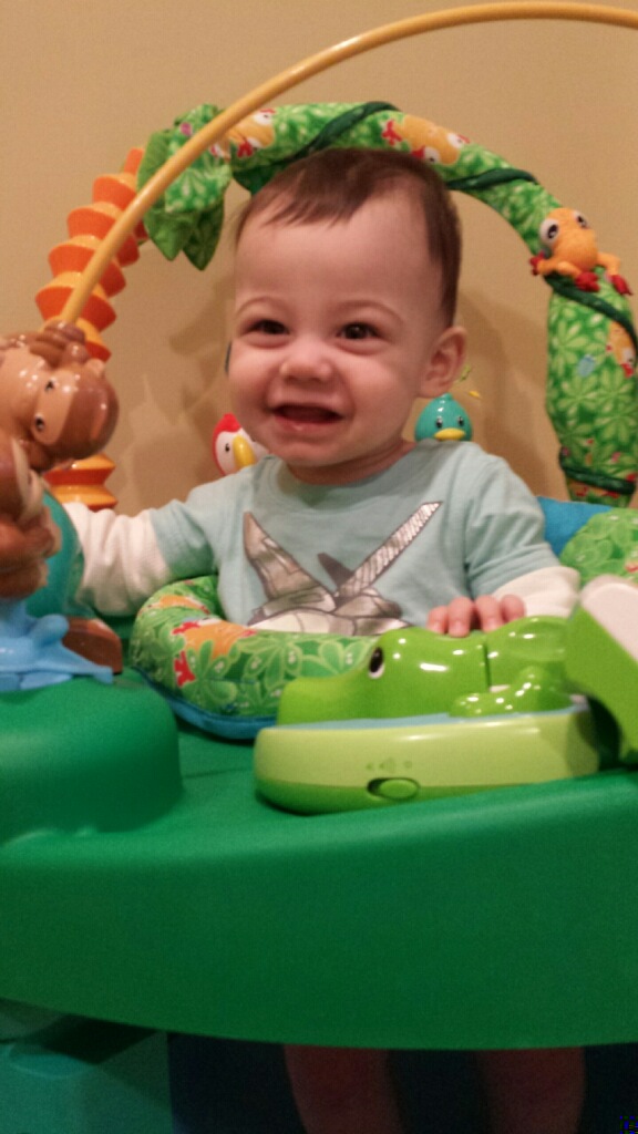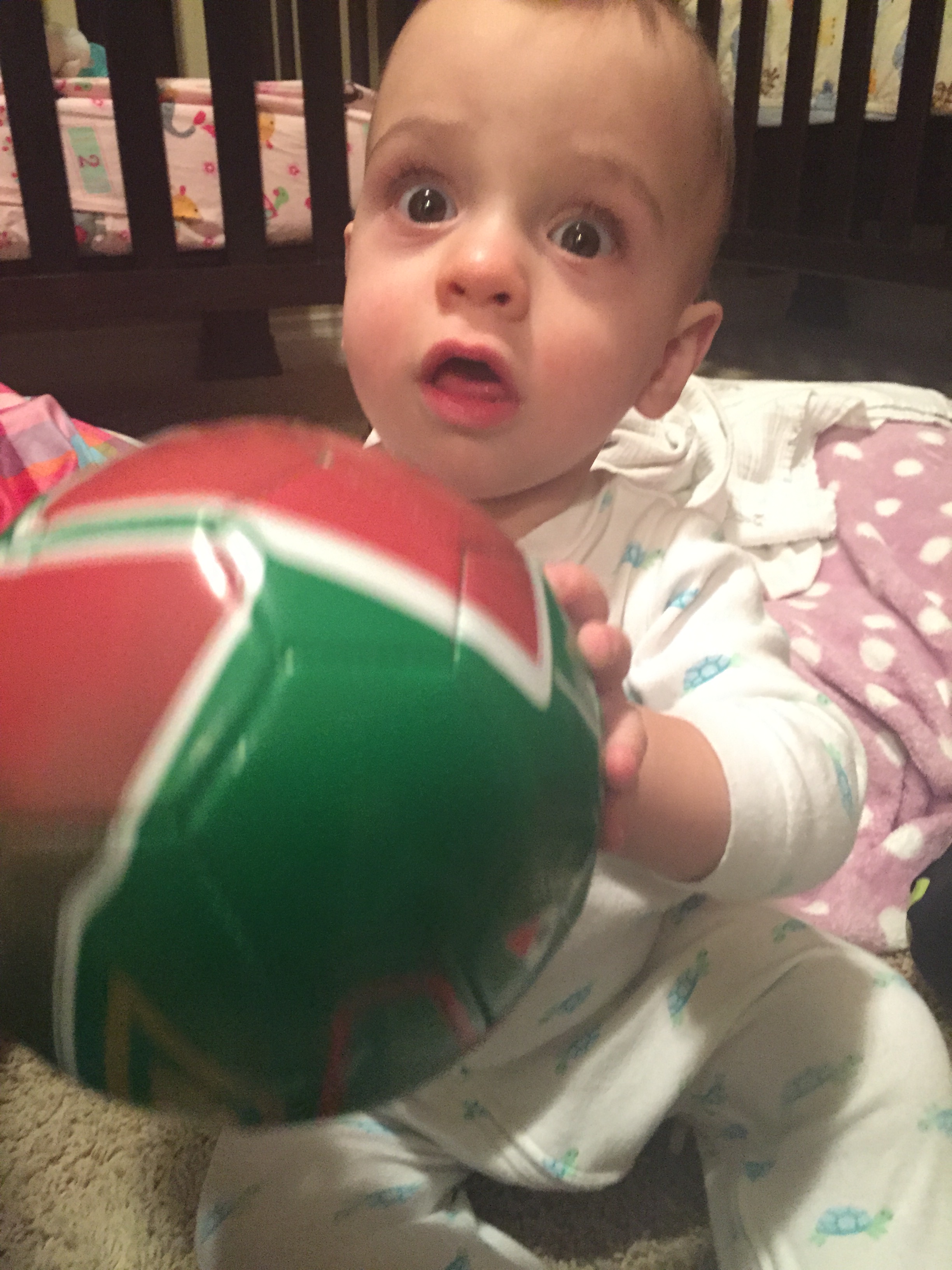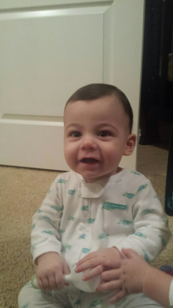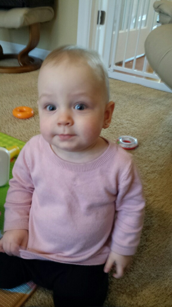 Steven is a sweet little mush ball. He can clap, and go from siting to his belly, and he’s still army crawling but rocking on his hands and knees more regularly. Steven is still the most focused on small details. He can spend ages playing with a mountain dew bottle or the snap on a washcloth. He still doesn’t have any teeth! New, Steven claps!