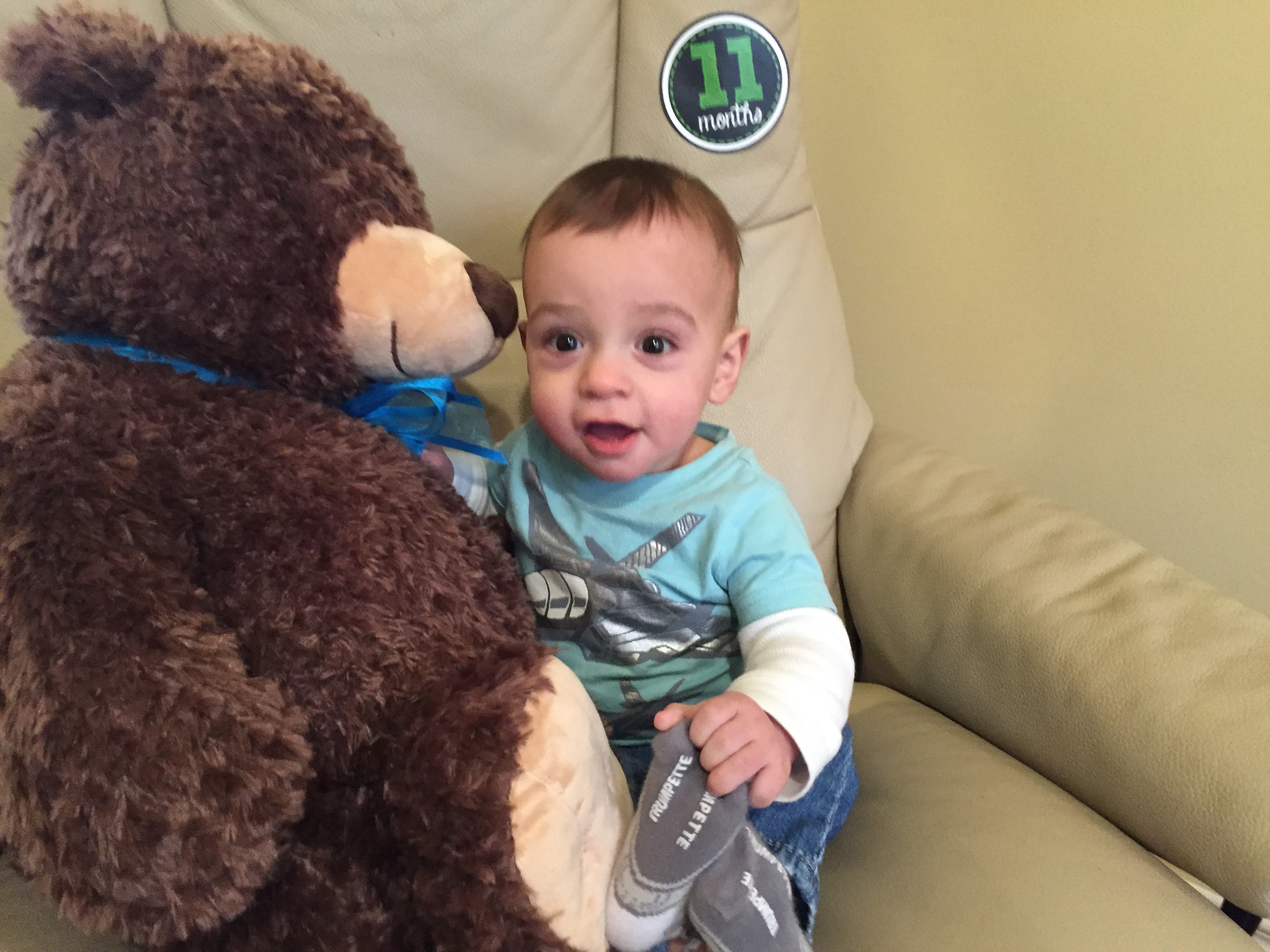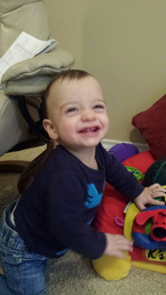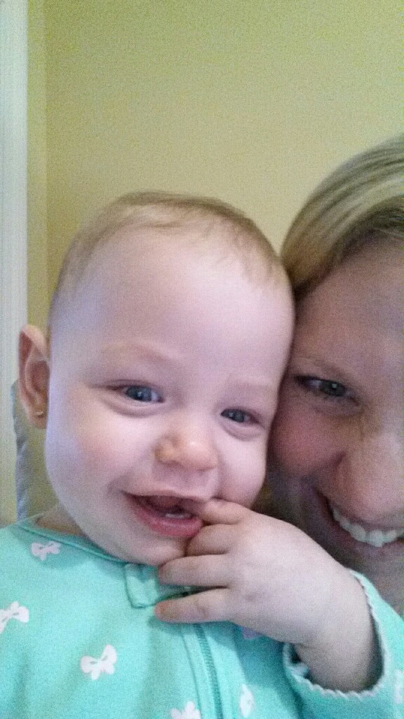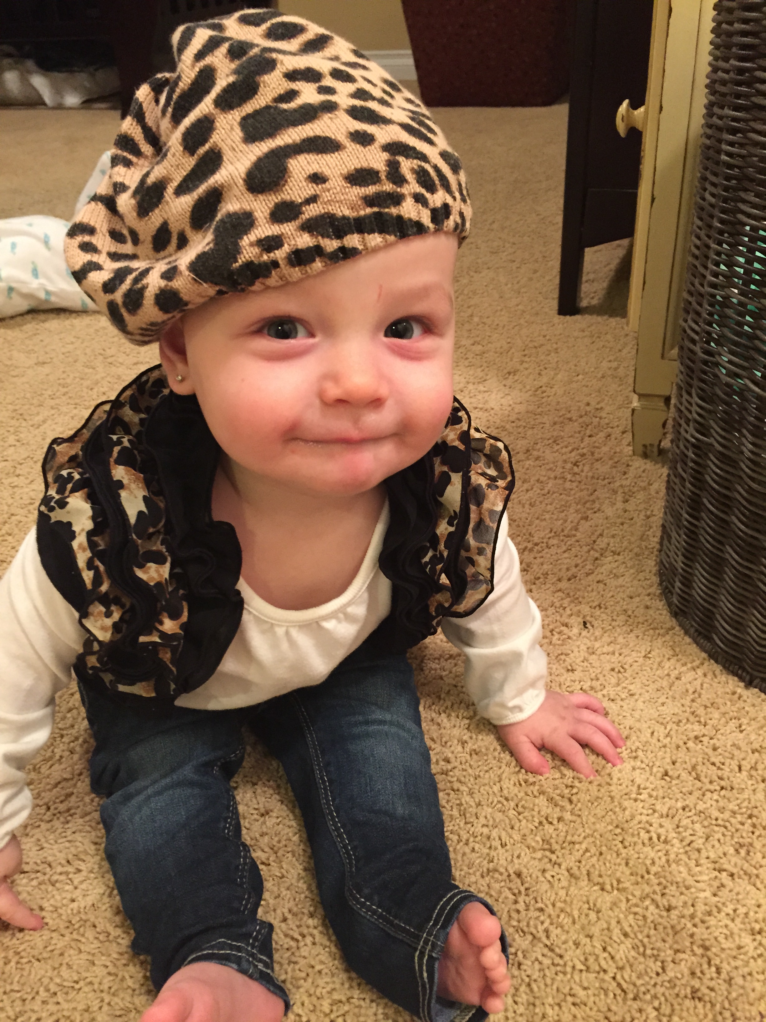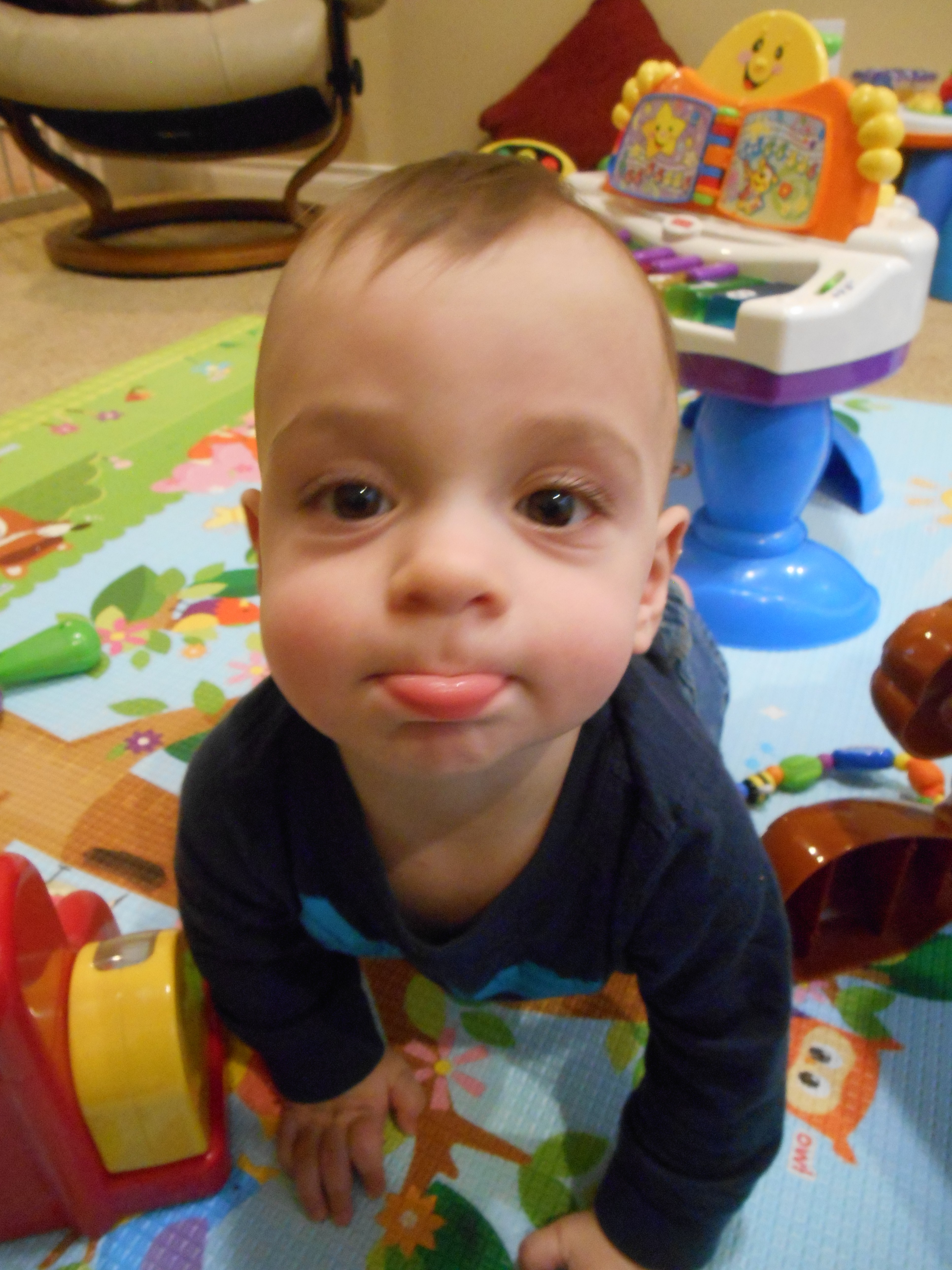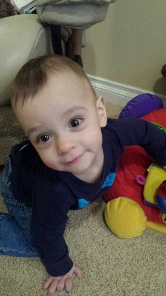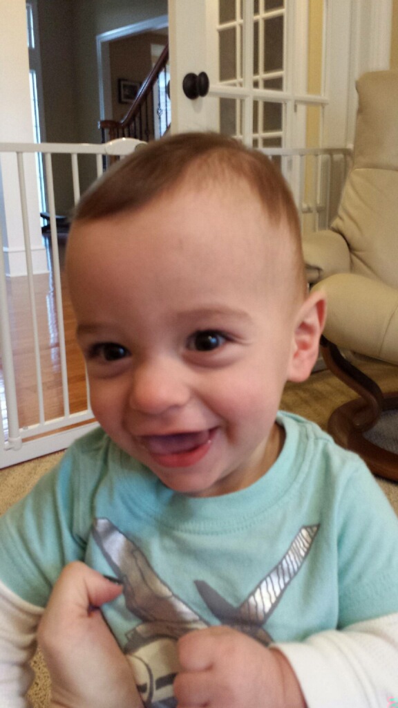 Steven is a sweet little mush ball. He can clap, and go from siting to his belly, and he’s still army crawling but rocking on his hands and knees more regularly. Steven is still the most focused on small details. He can spend ages playing with a mountain dew bottle or the snap on a washcloth. He still doesn’t have any teeth! New, Steven claps!