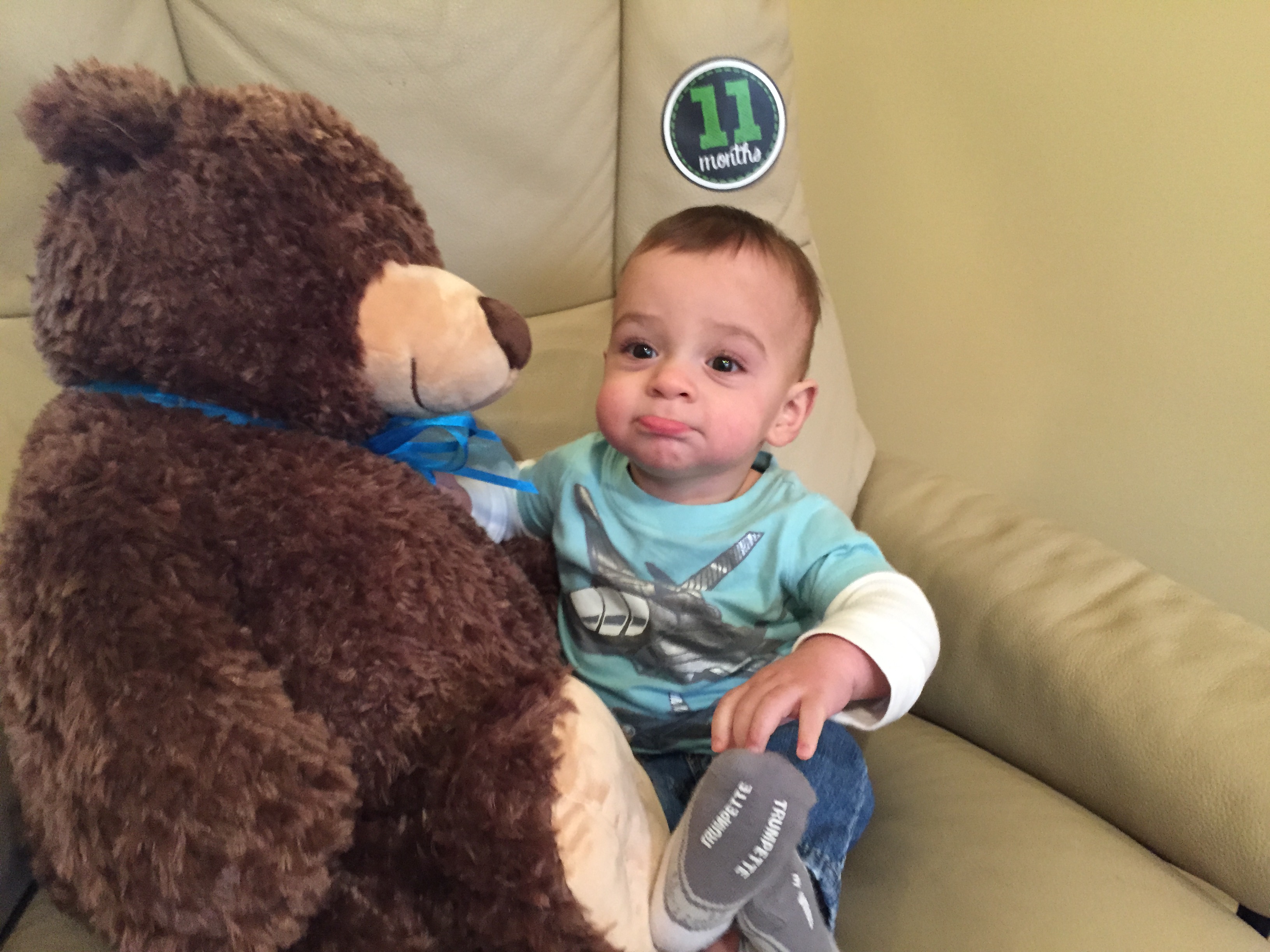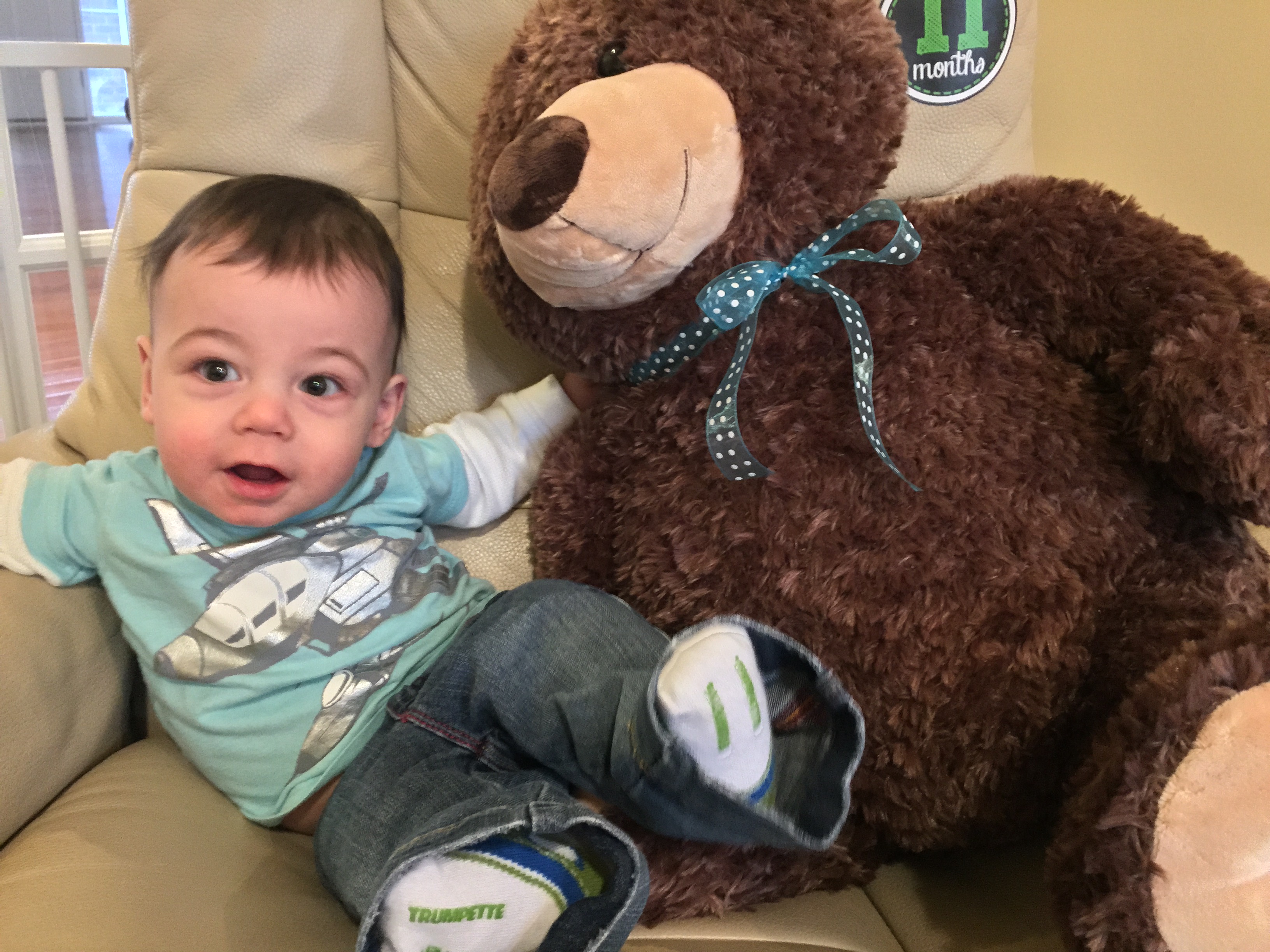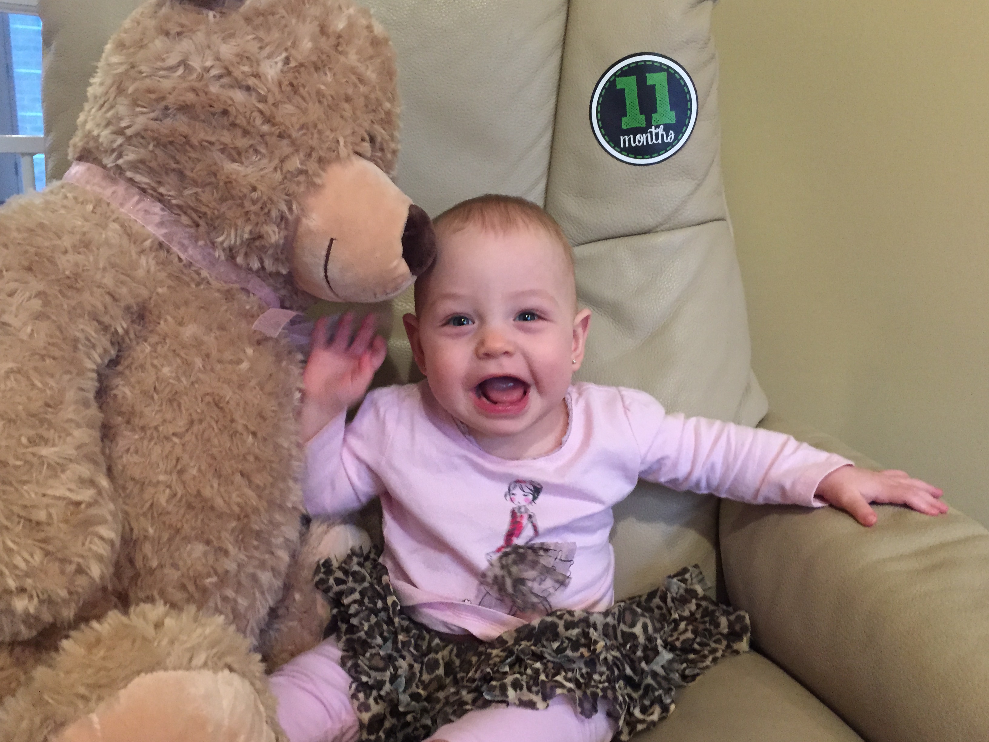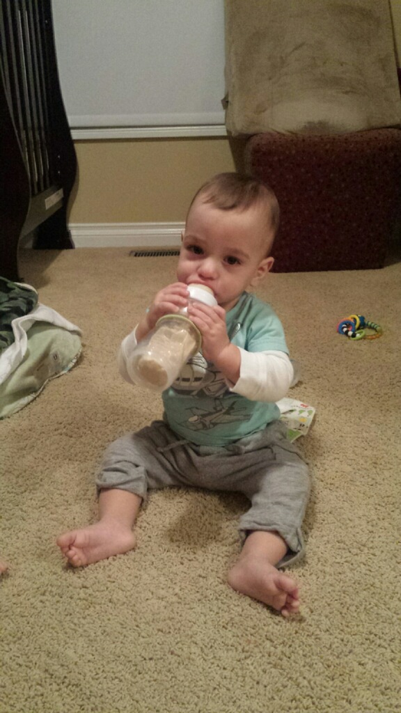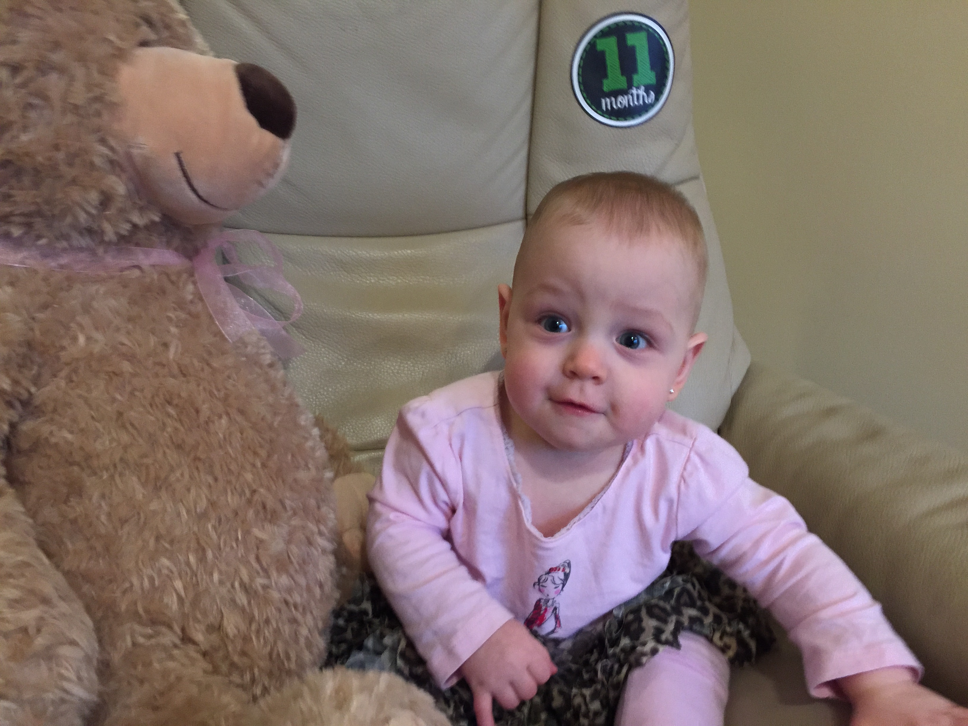 Steven is a sweet little mush ball. He can clap, and go from siting to his belly, and he’s still army crawling but rocking on his hands and knees more regularly. Steven is still the most focused on small details. He can spend ages playing with a mountain dew bottle or the snap on a washcloth. He still doesn’t have any teeth! New, Steven claps!