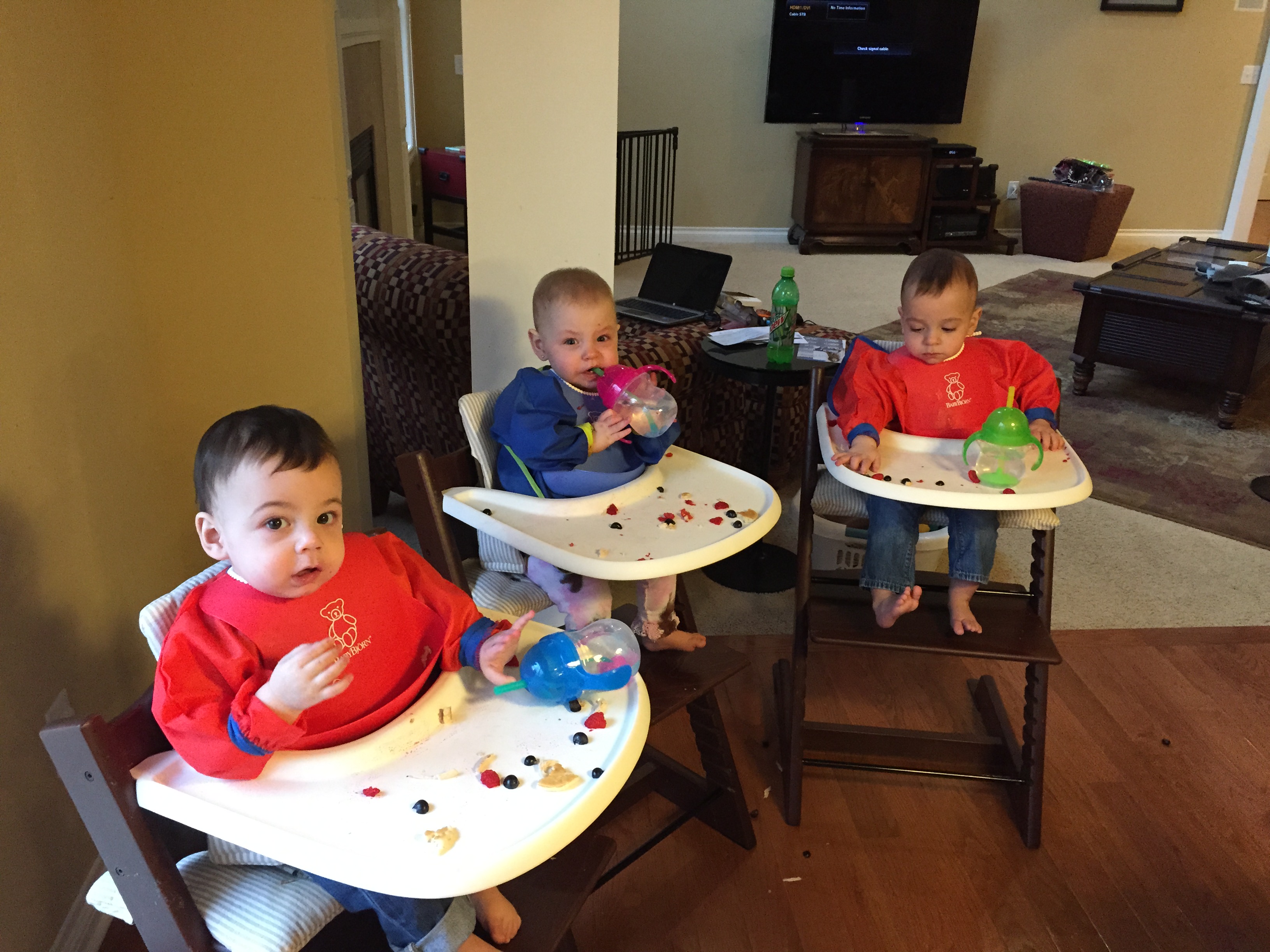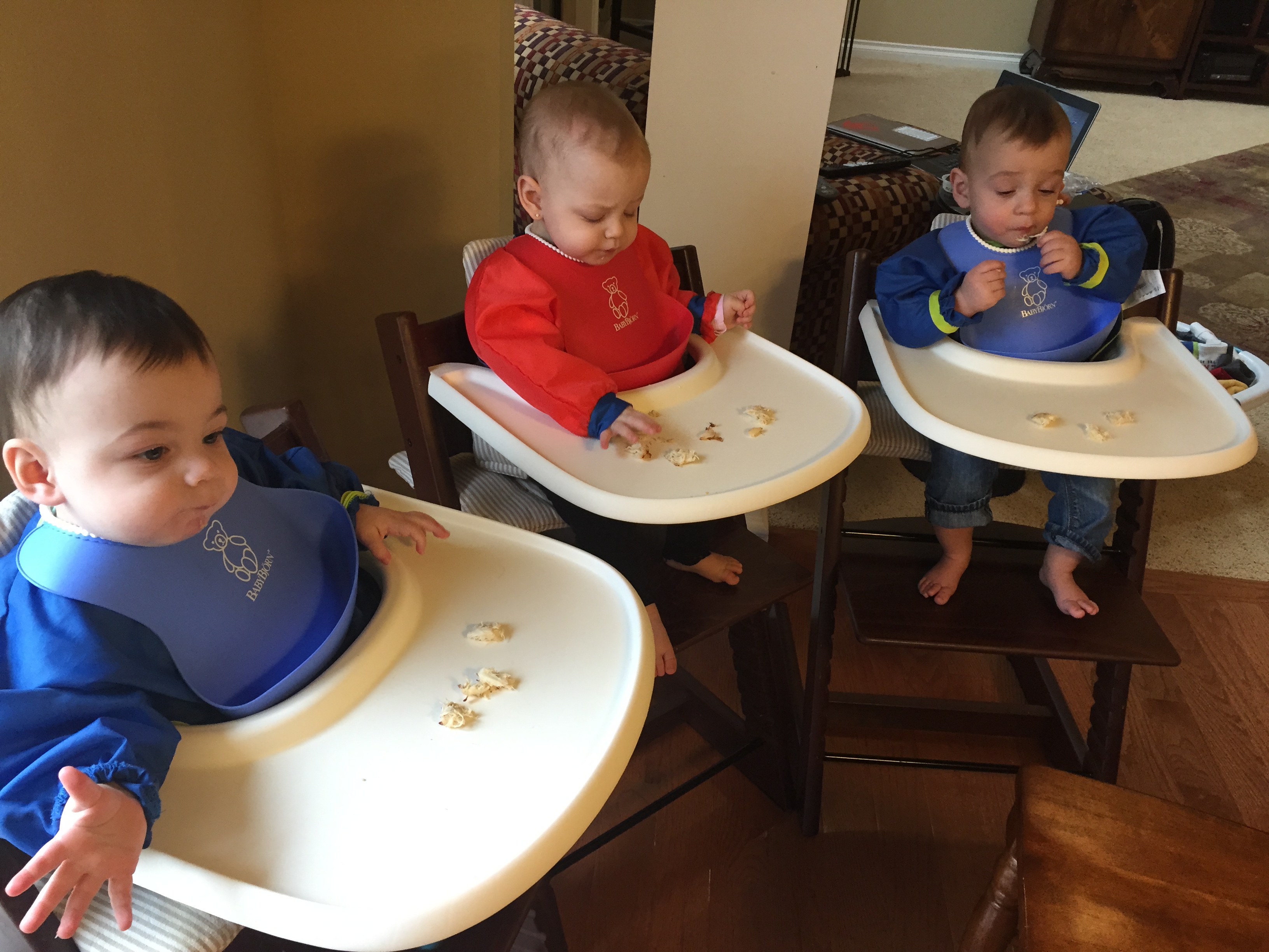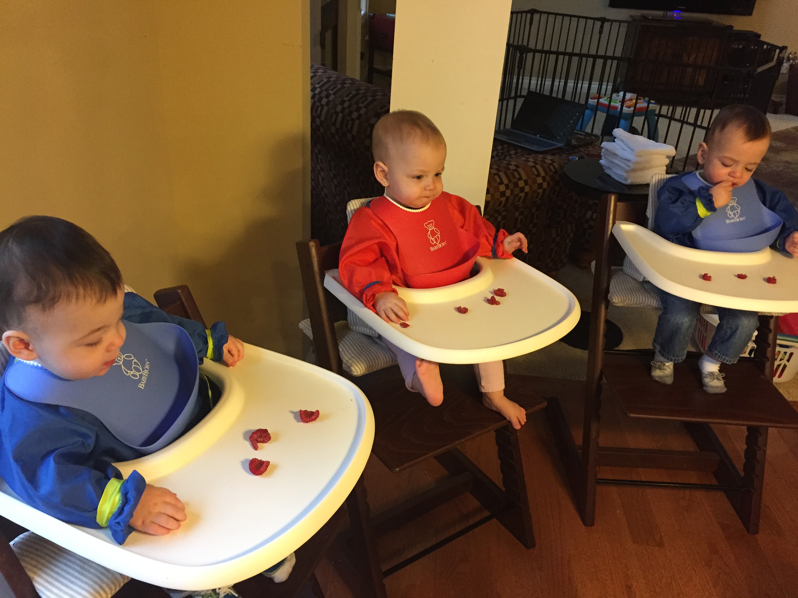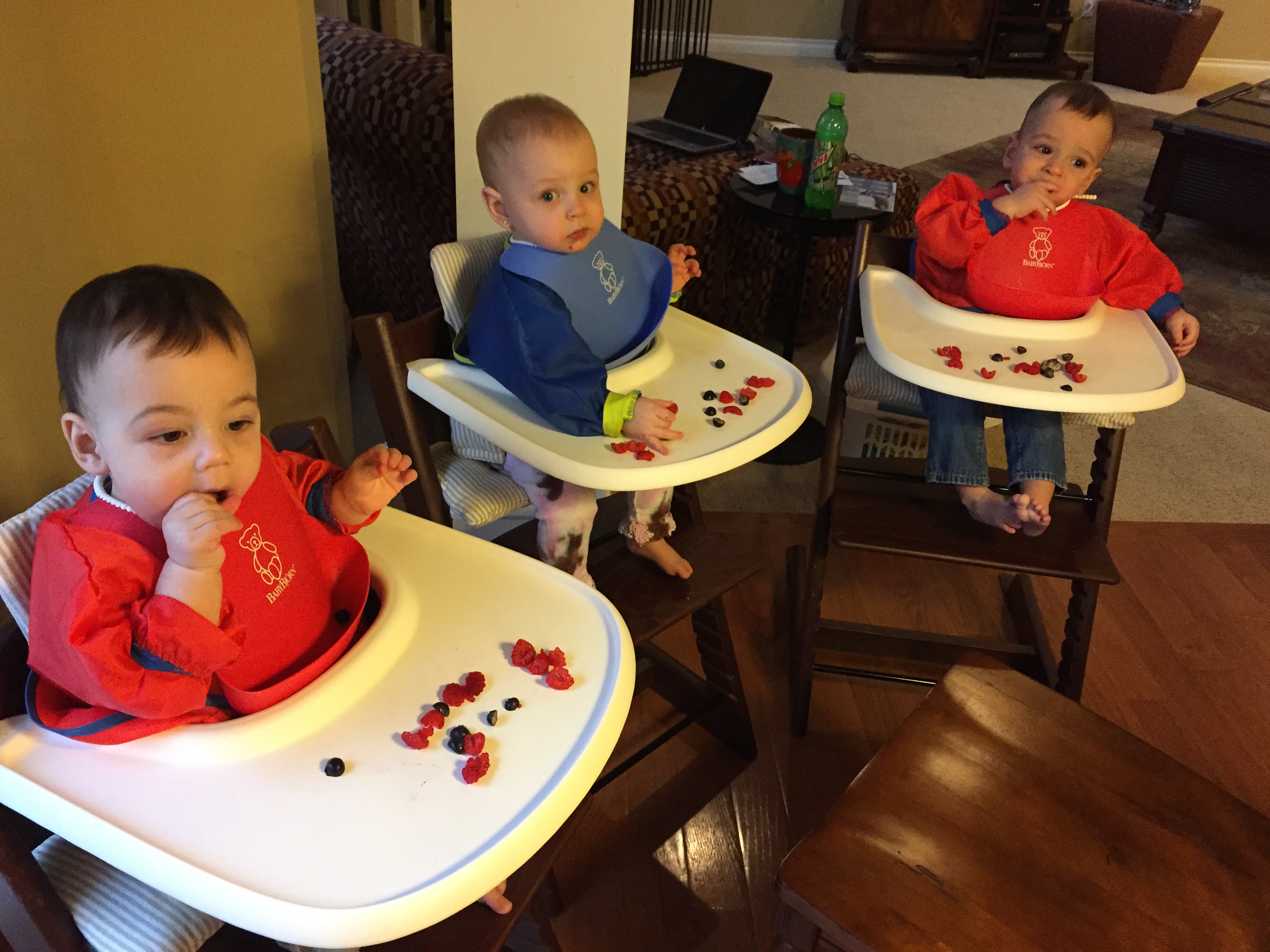 We’re still eating new foods. Today we tried blueberries. I cut them in half to make it easier for them to eat. Small round foods are too nerve wracking. They were served for breakfast with raspberries, pancakes and chicken. When we’re out of eggs, we improvise!