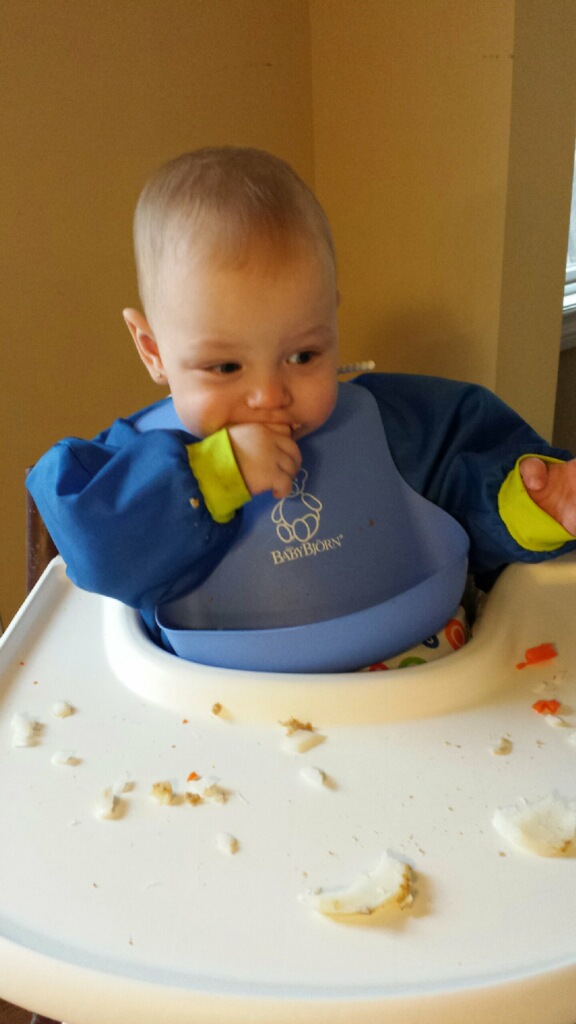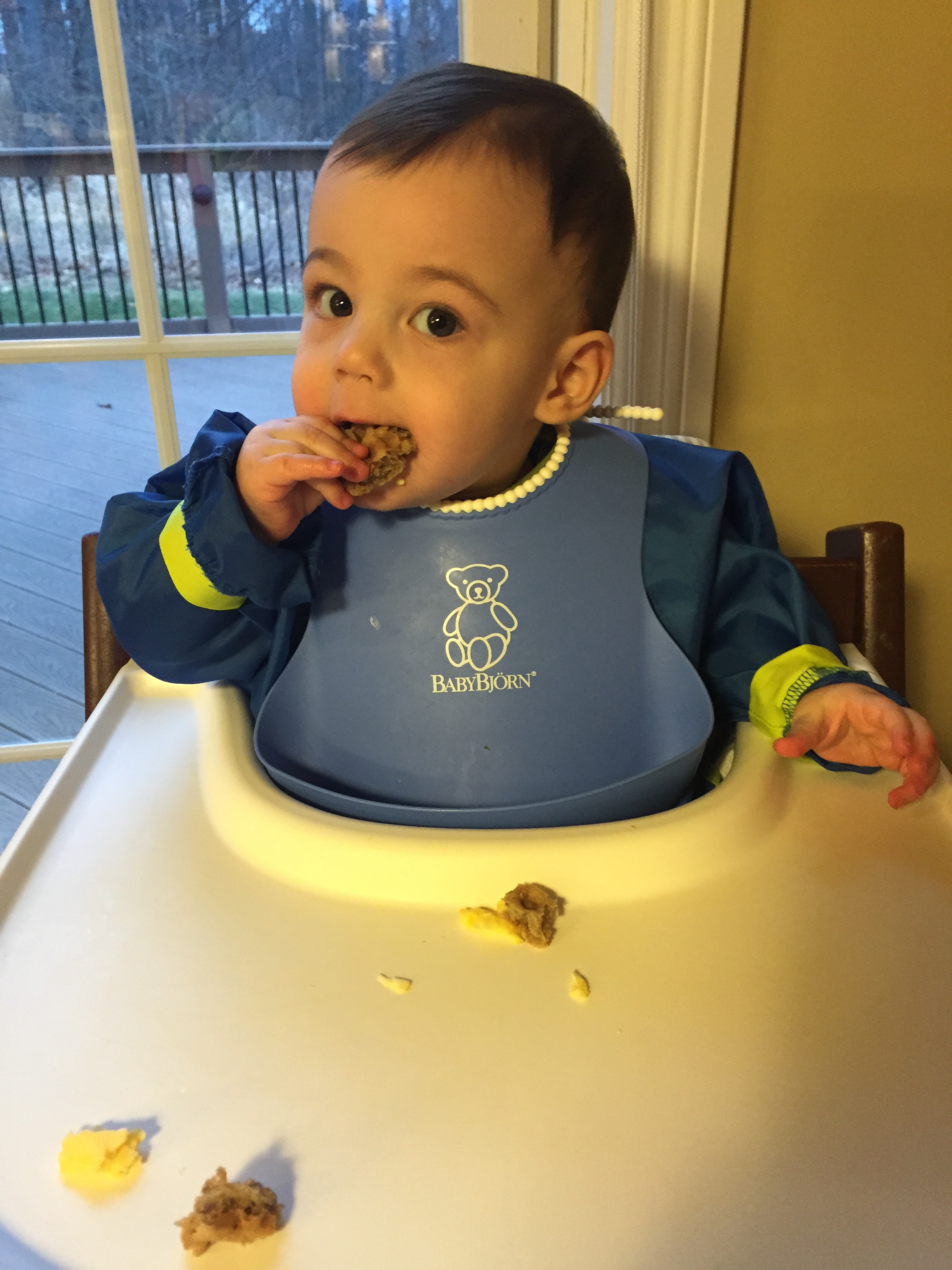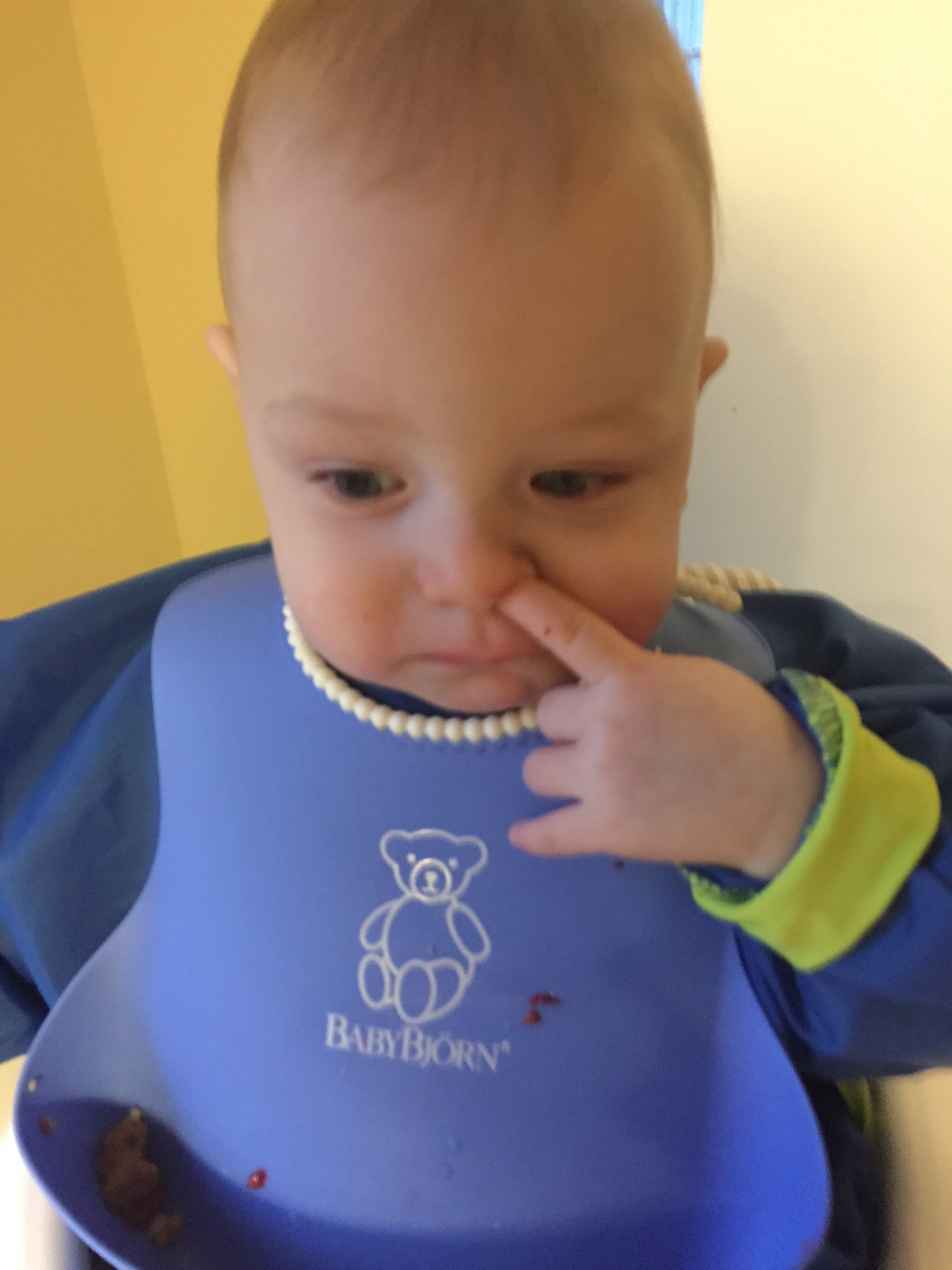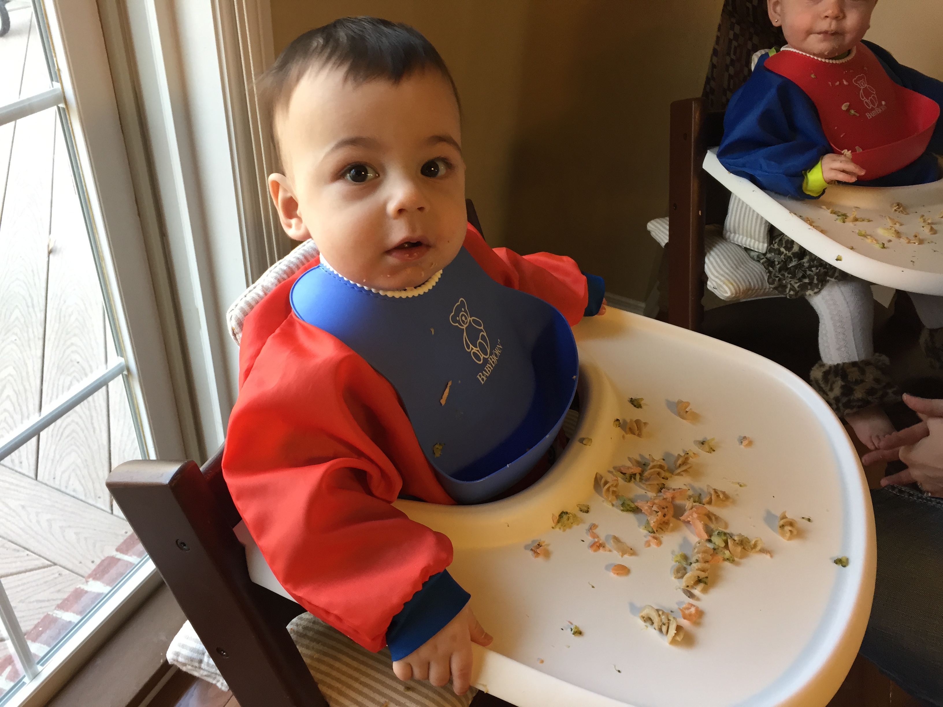 We’re still eating new foods. Today we tried blueberries. I cut them in half to make it easier for them to eat. Small round foods are too nerve wracking. They were served for breakfast with raspberries, pancakes and chicken. When we’re out of eggs, we improvise!
