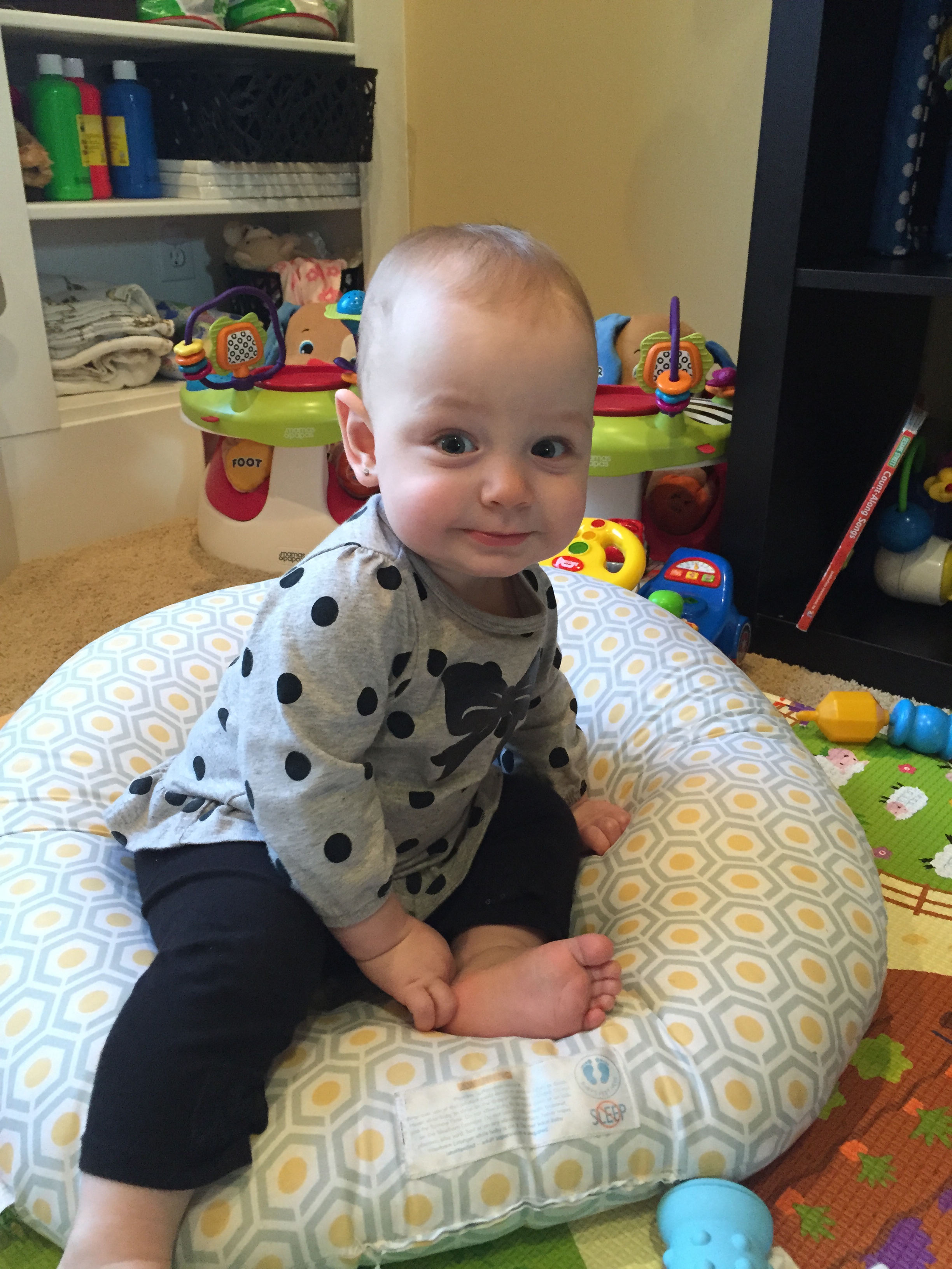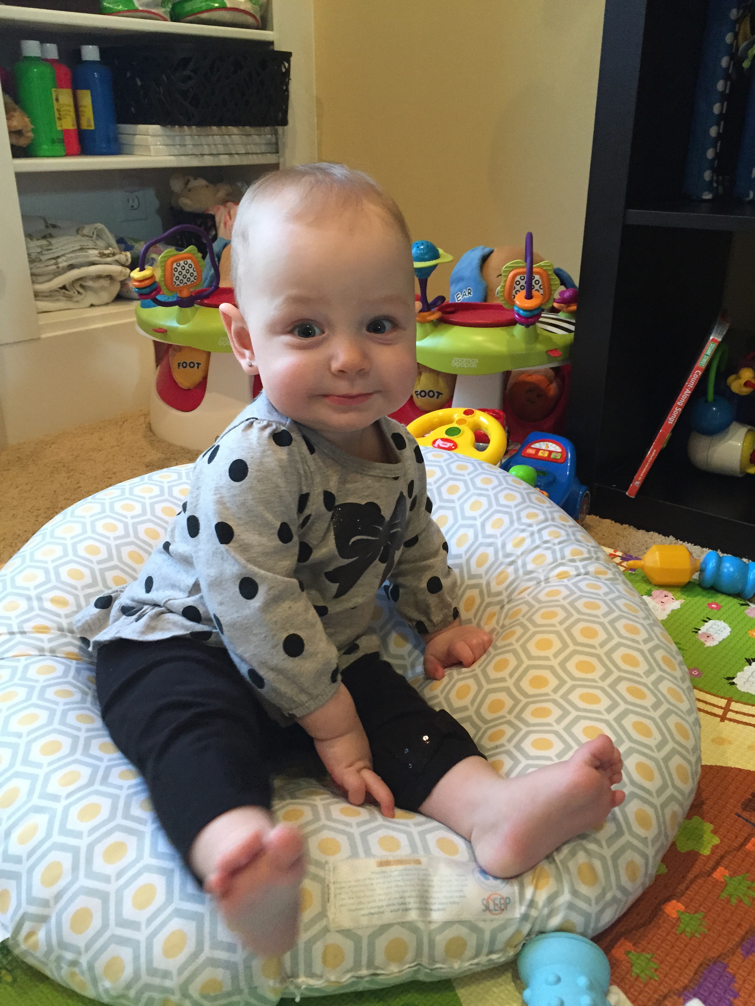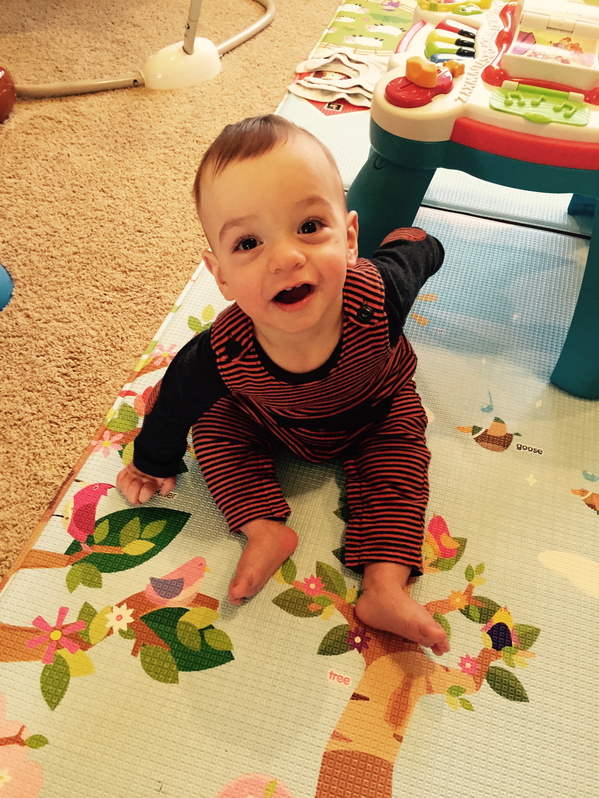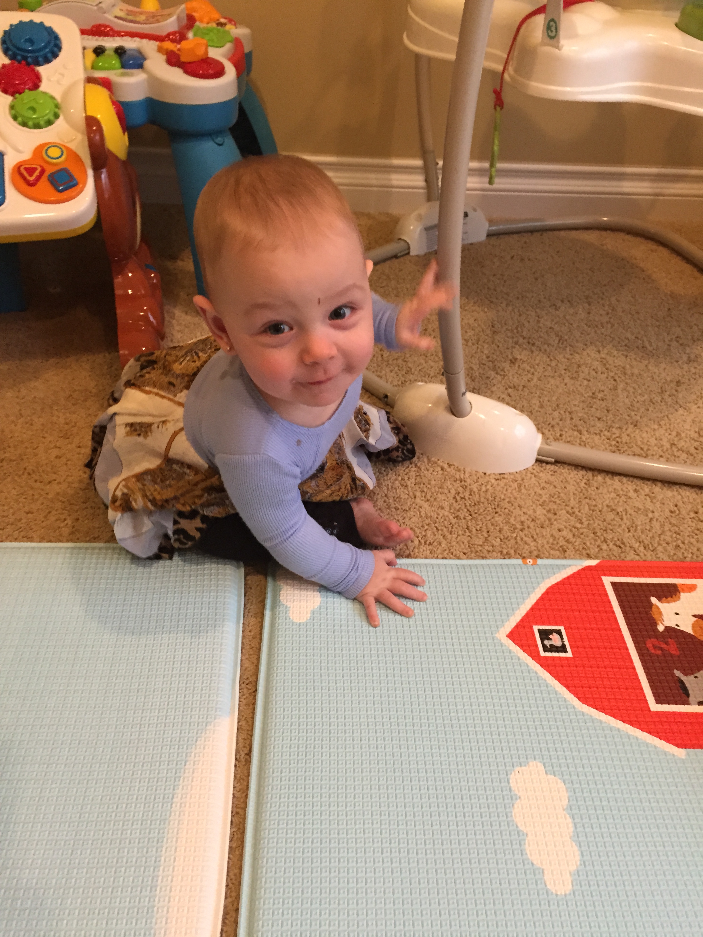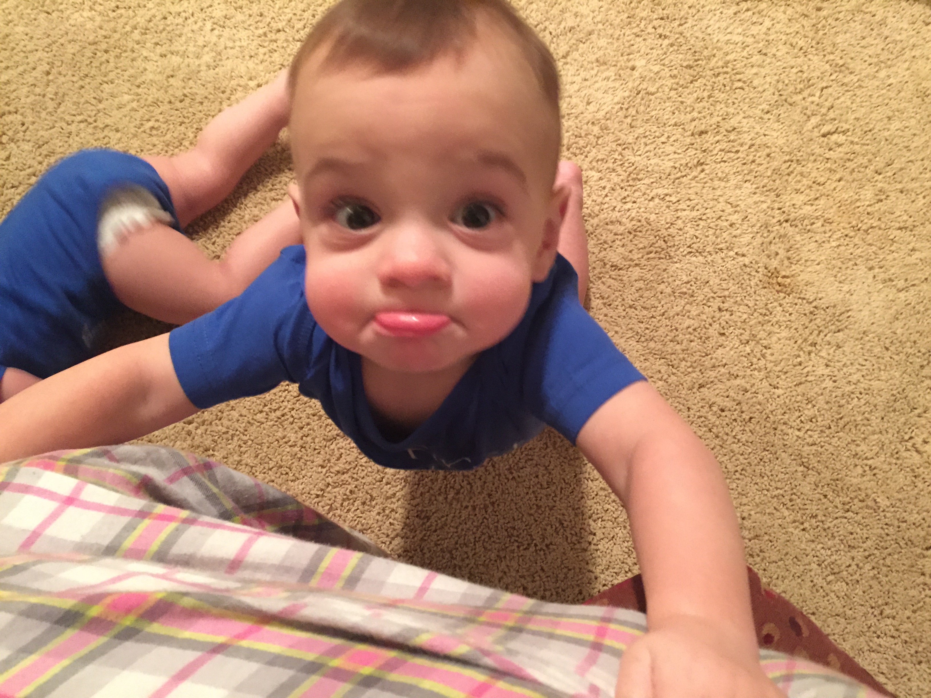 Sammy made huge leaps in the last month. Within a week, he went from doing the worm to crawling, pulling to his knees and pulling to stand. As of yesterday, he can get to sitting by himself, too. Sammy has four teeth and it’s adorable. He’s a big ham and our most sensitive baby.