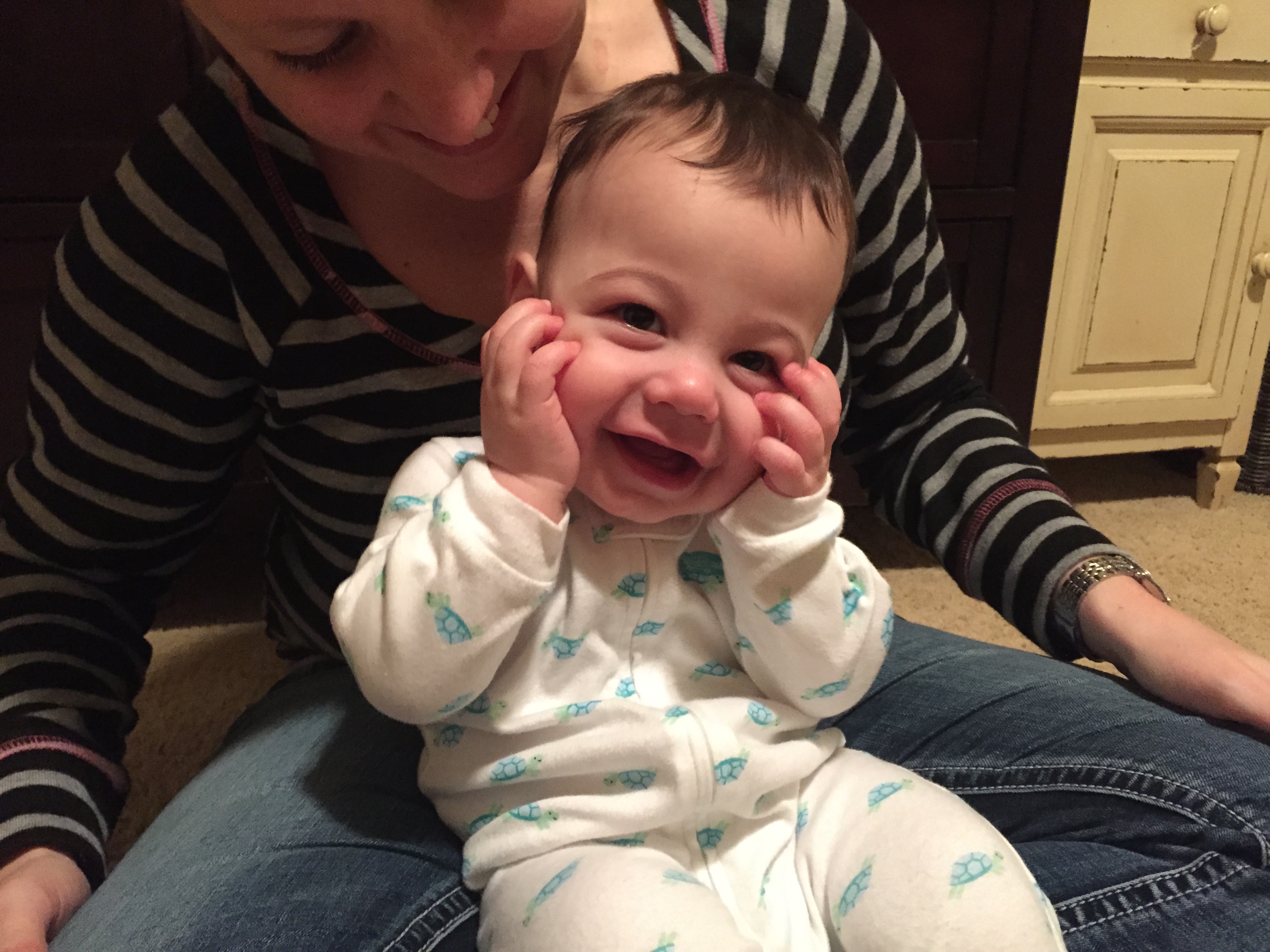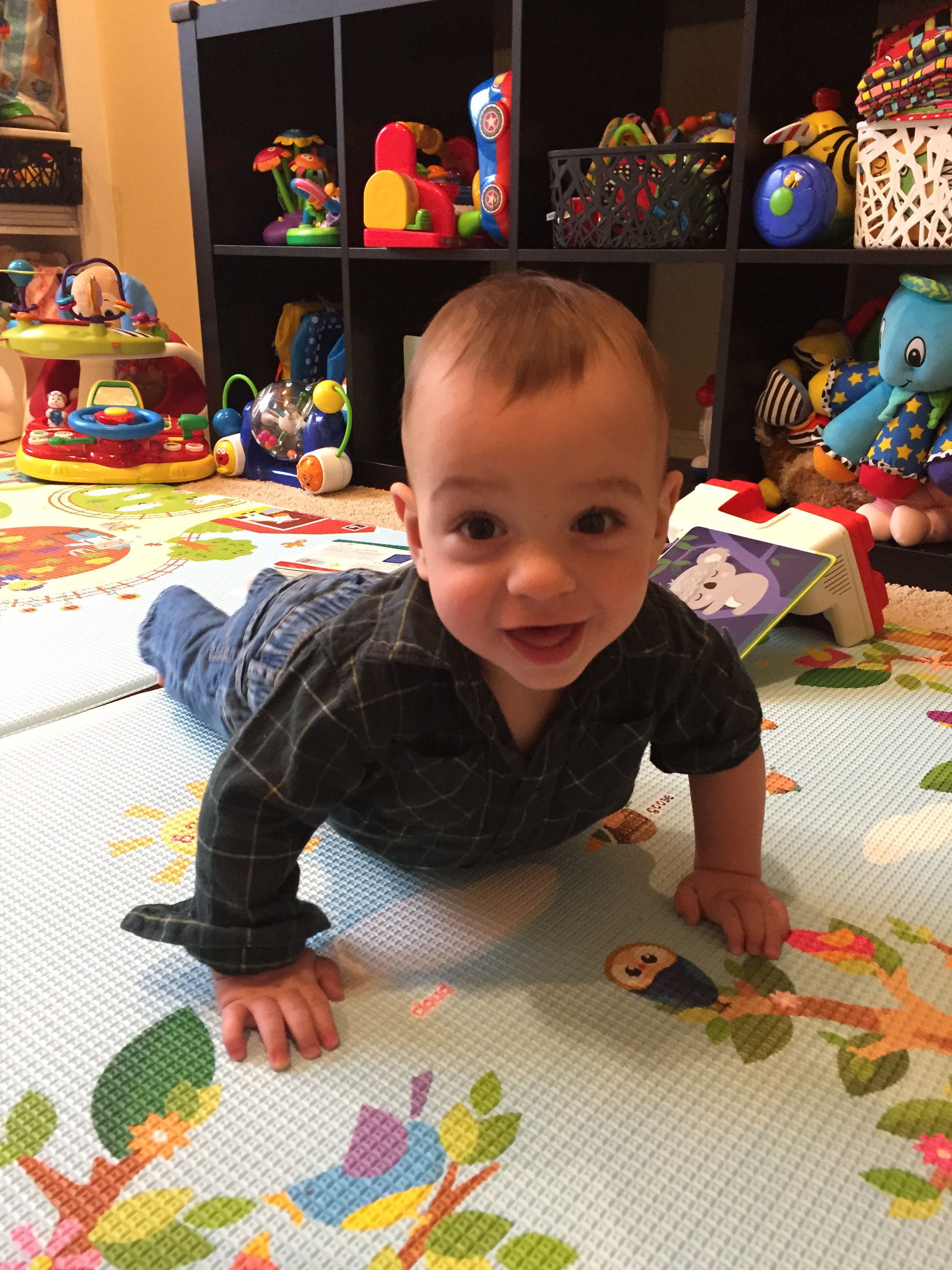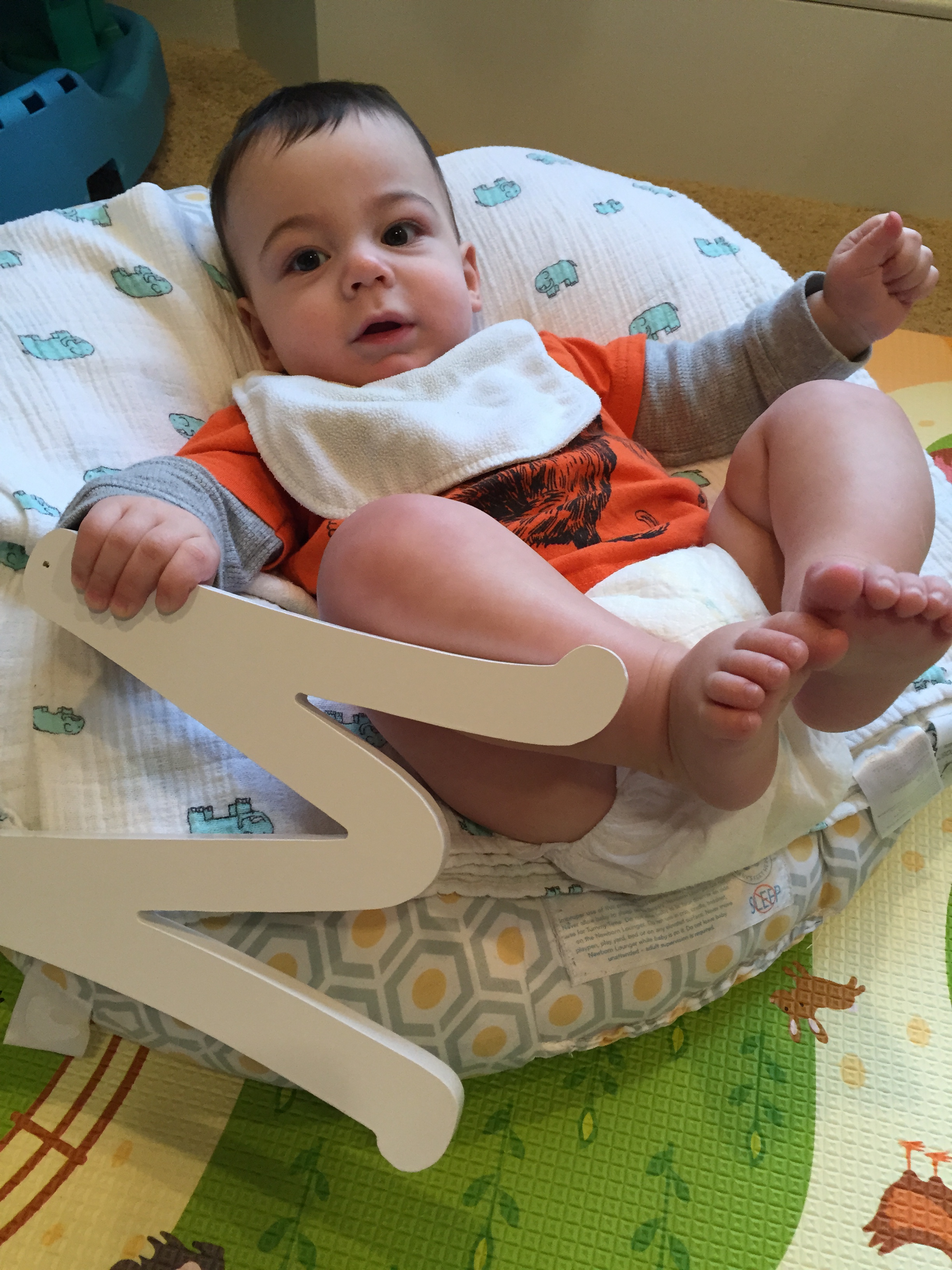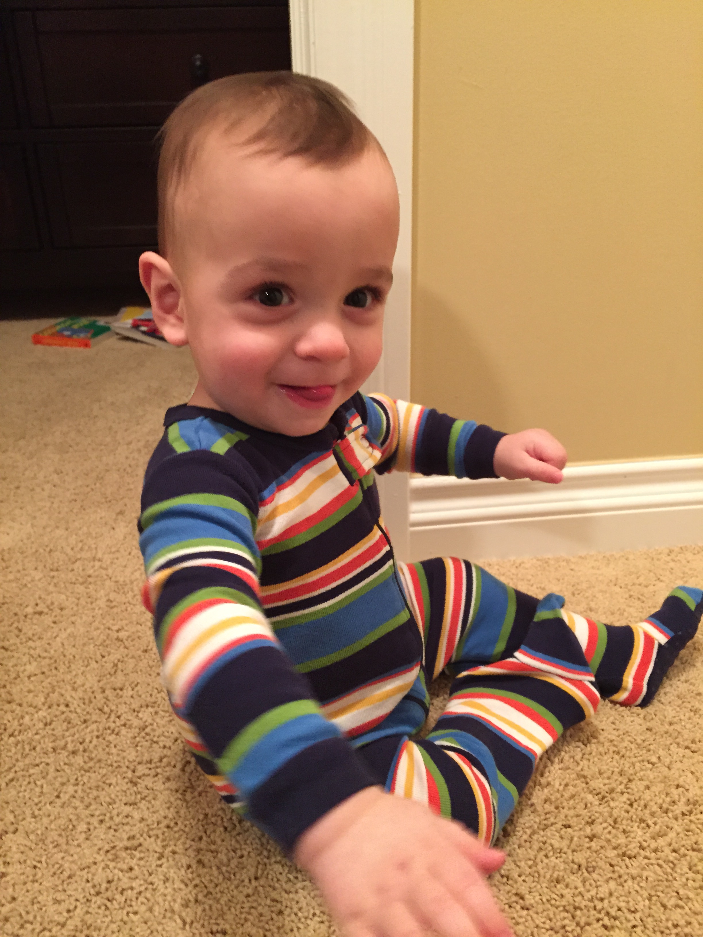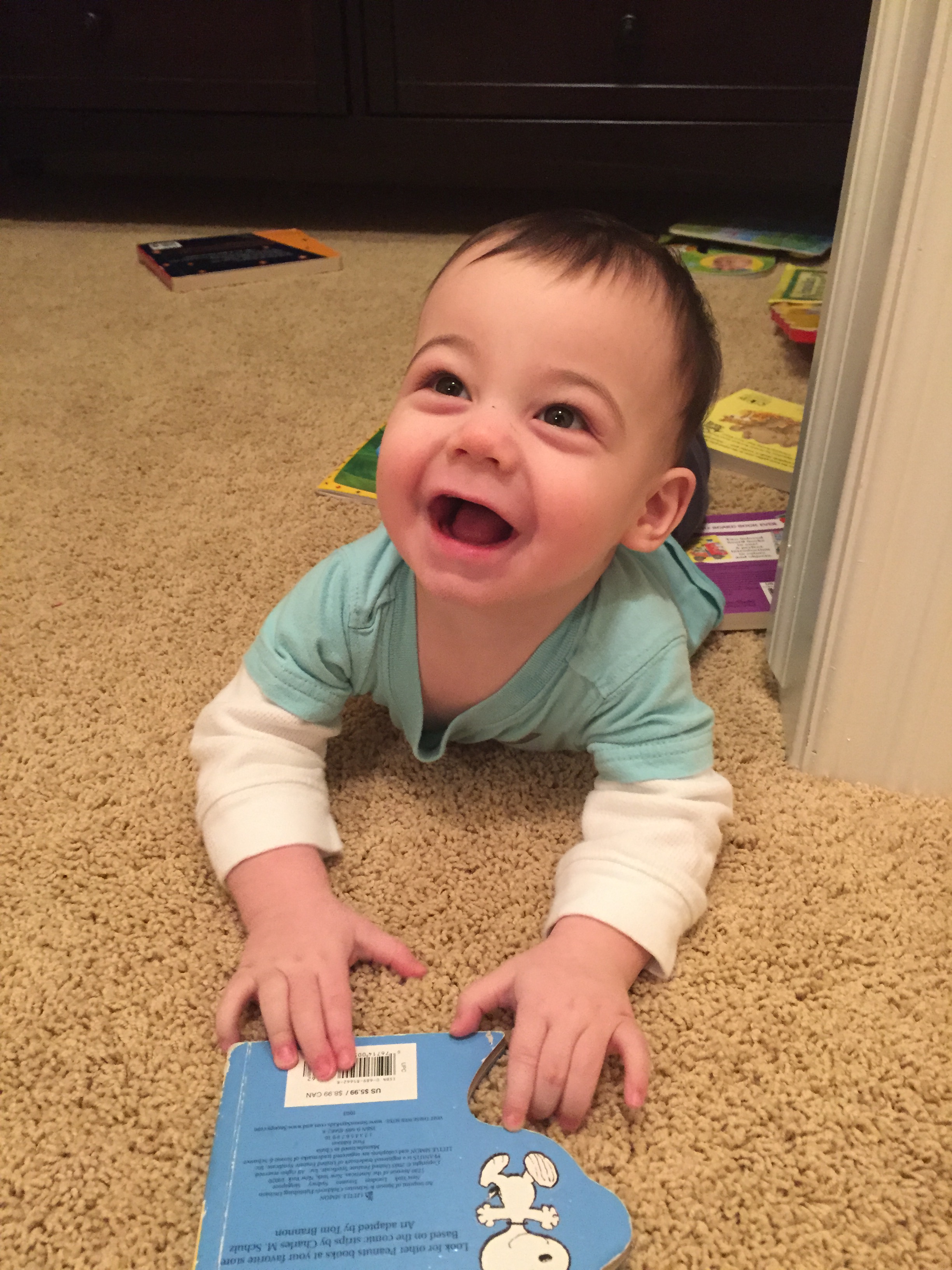 Sammy made huge leaps in the last month. Within a week, he went from doing the worm to crawling, pulling to his knees and pulling to stand. As of yesterday, he can get to sitting by himself, too. Sammy has four teeth and it’s adorable. He’s a big ham and our most sensitive baby.