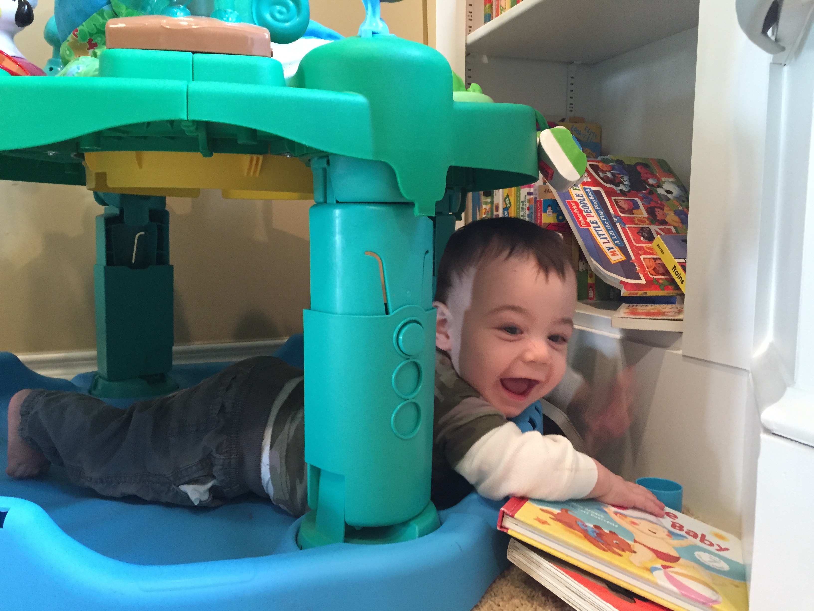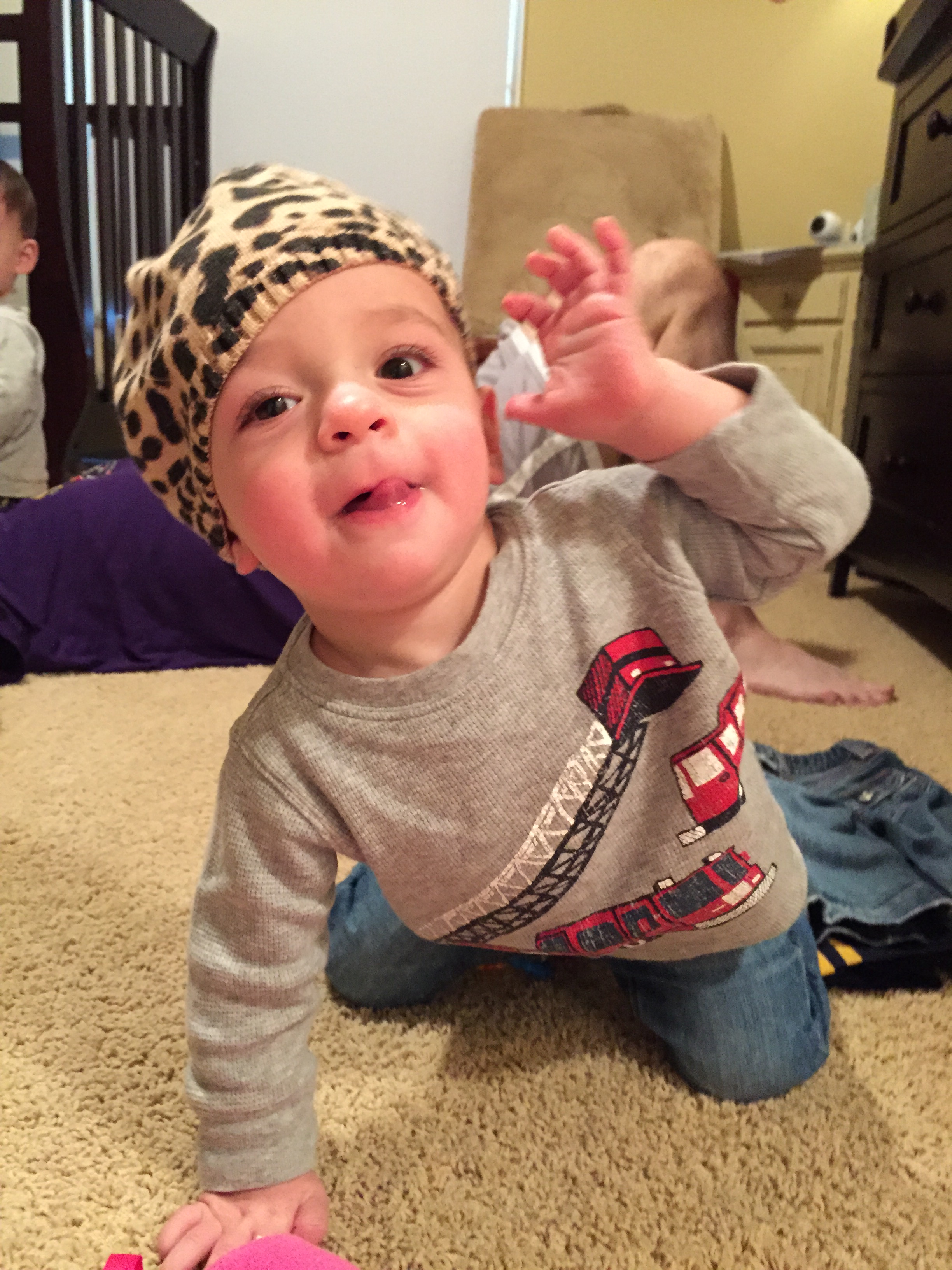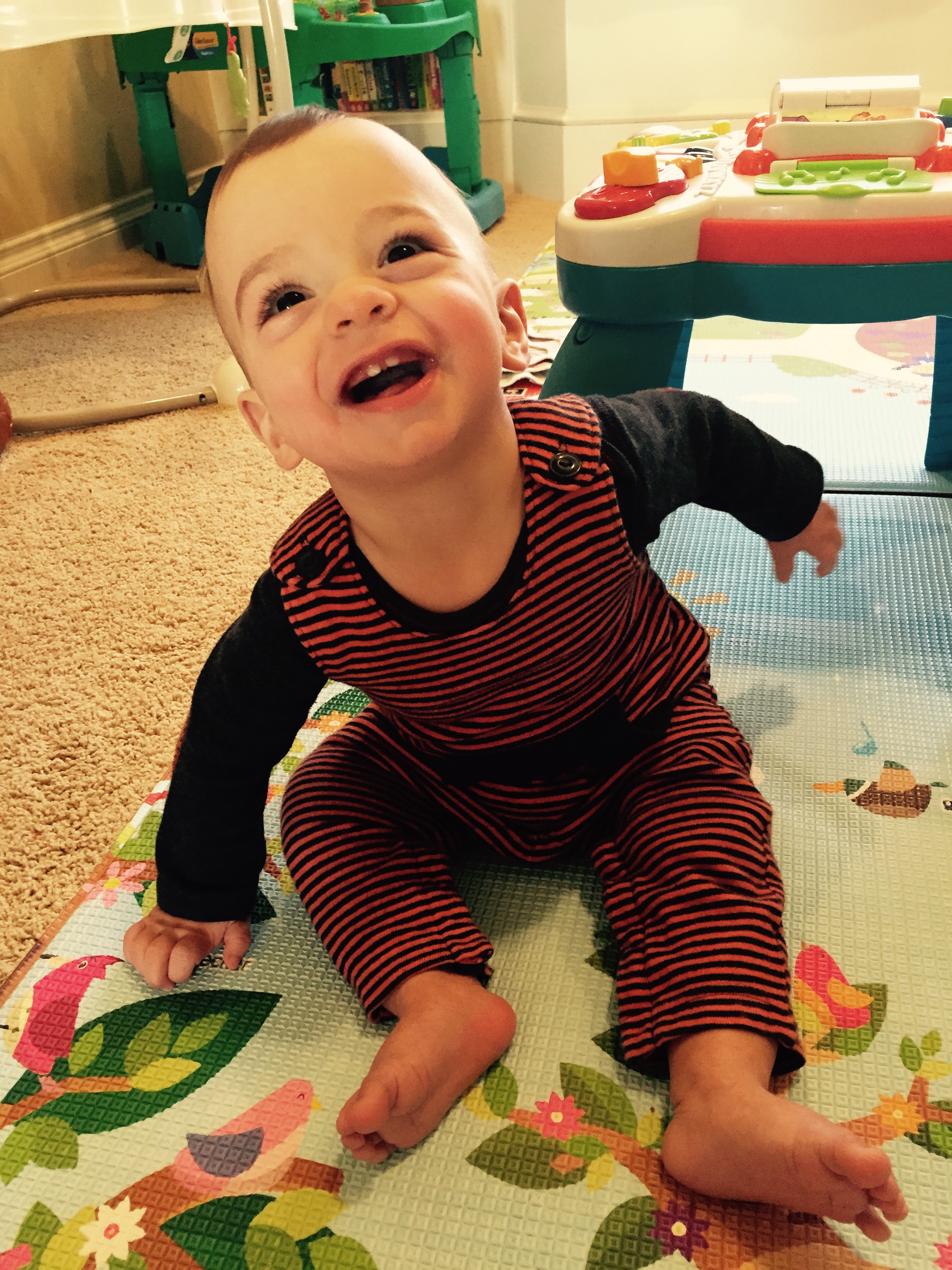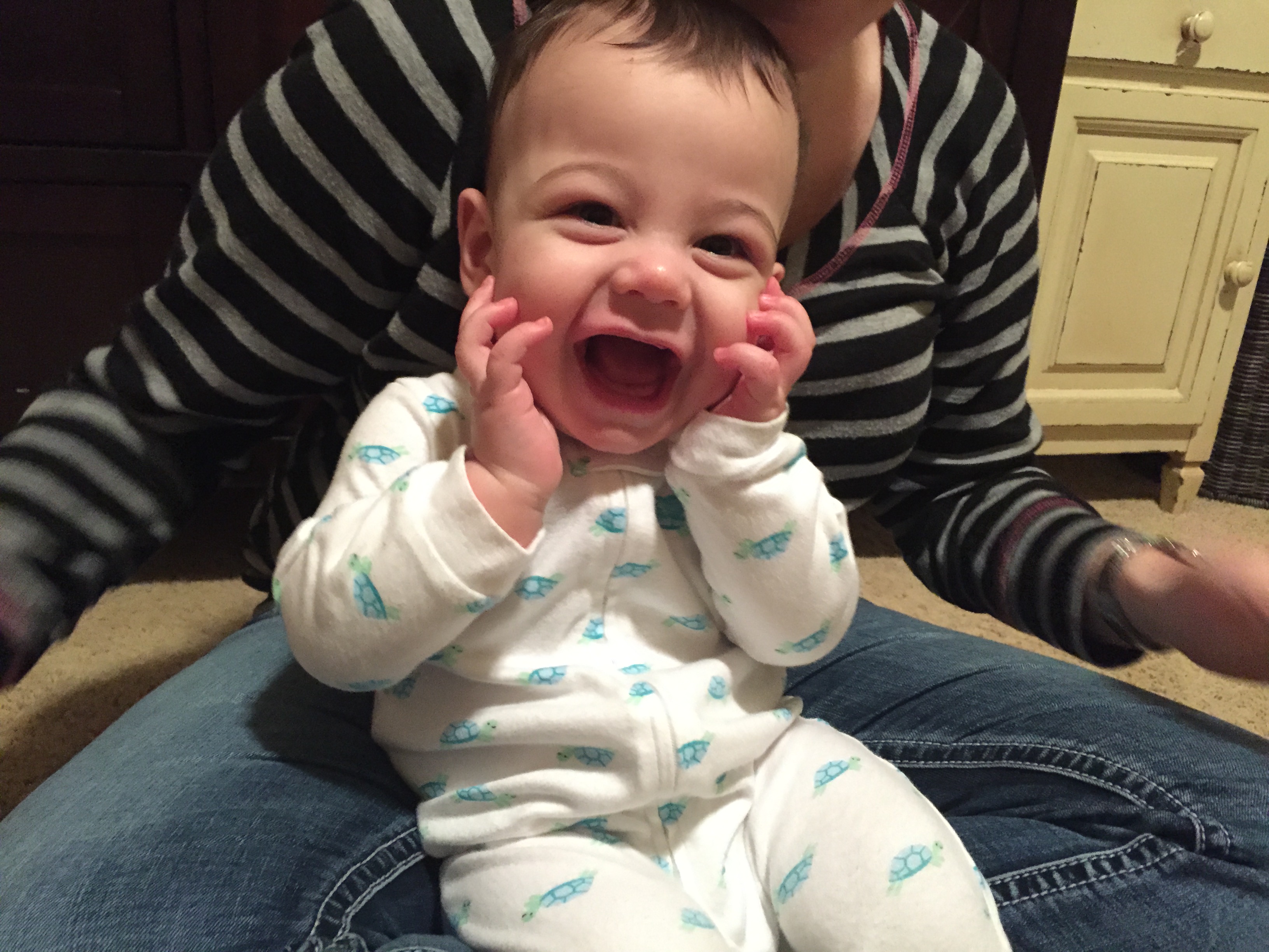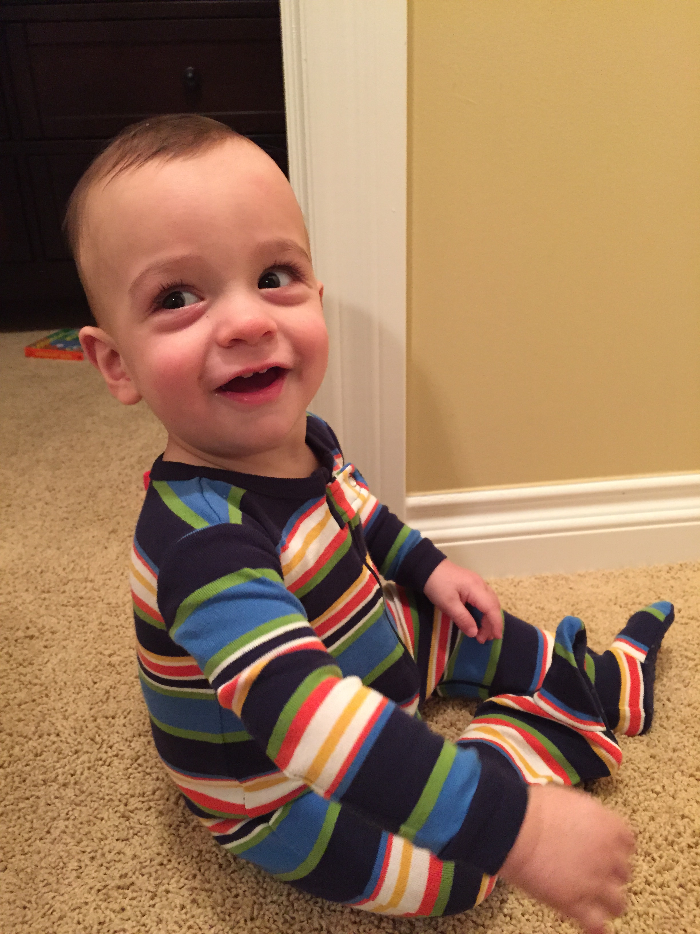 Sammy made huge leaps in the last month. Within a week, he went from doing the worm to crawling, pulling to his knees and pulling to stand. As of yesterday, he can get to sitting by himself, too. Sammy has four teeth and it’s adorable. He’s a big ham and our most sensitive baby.