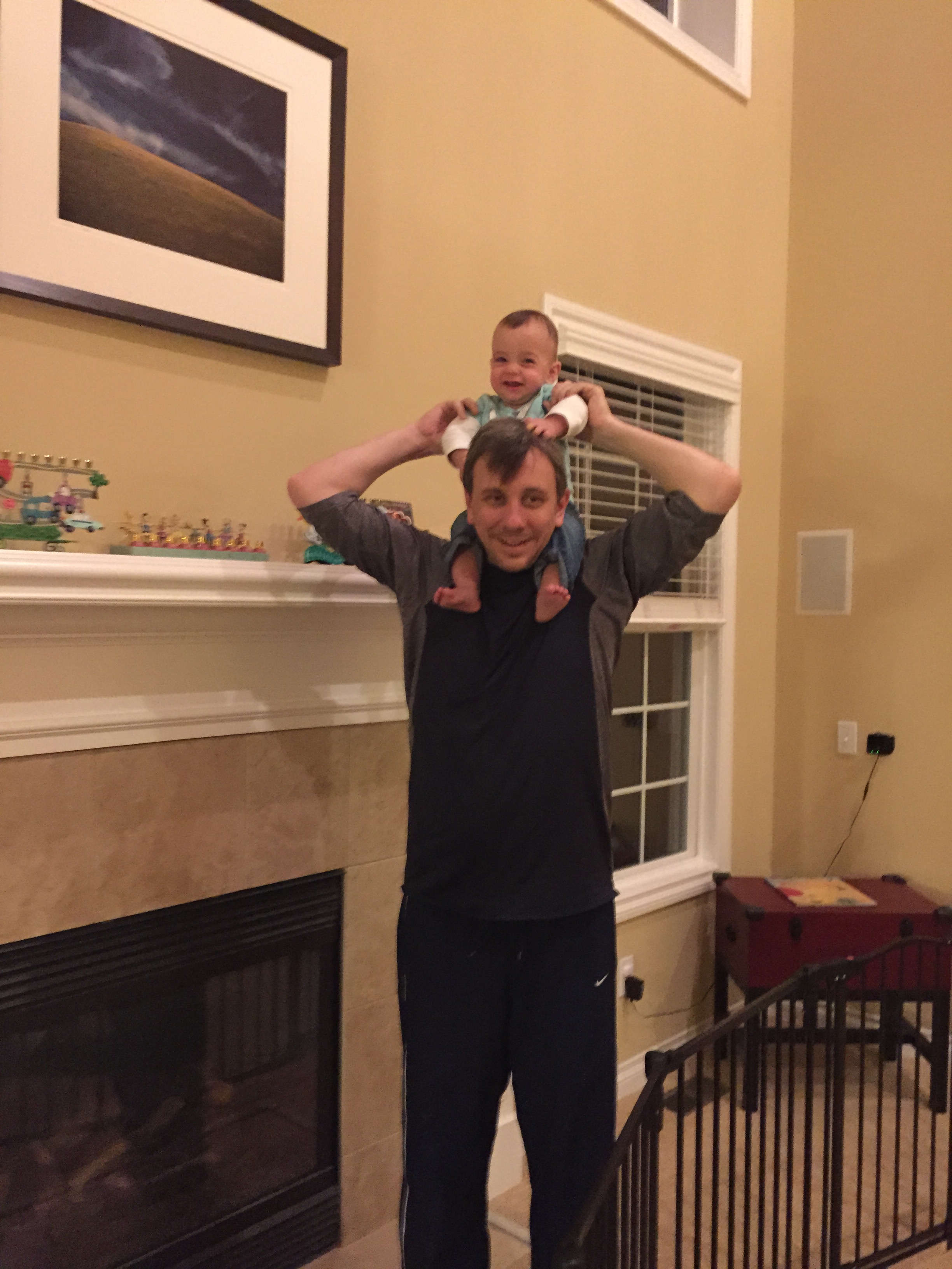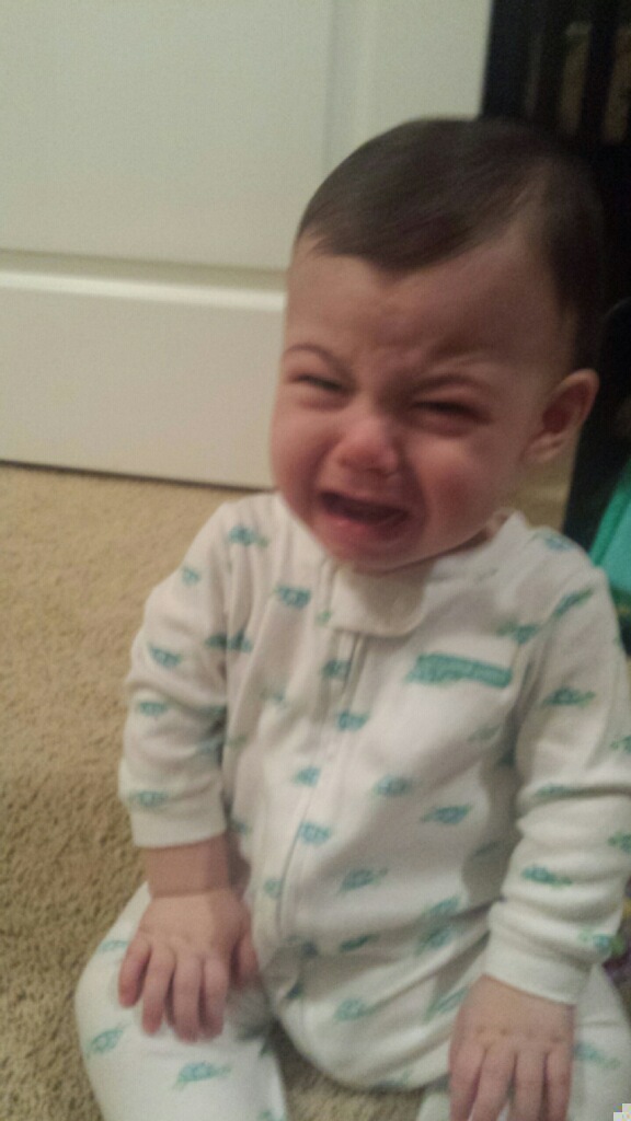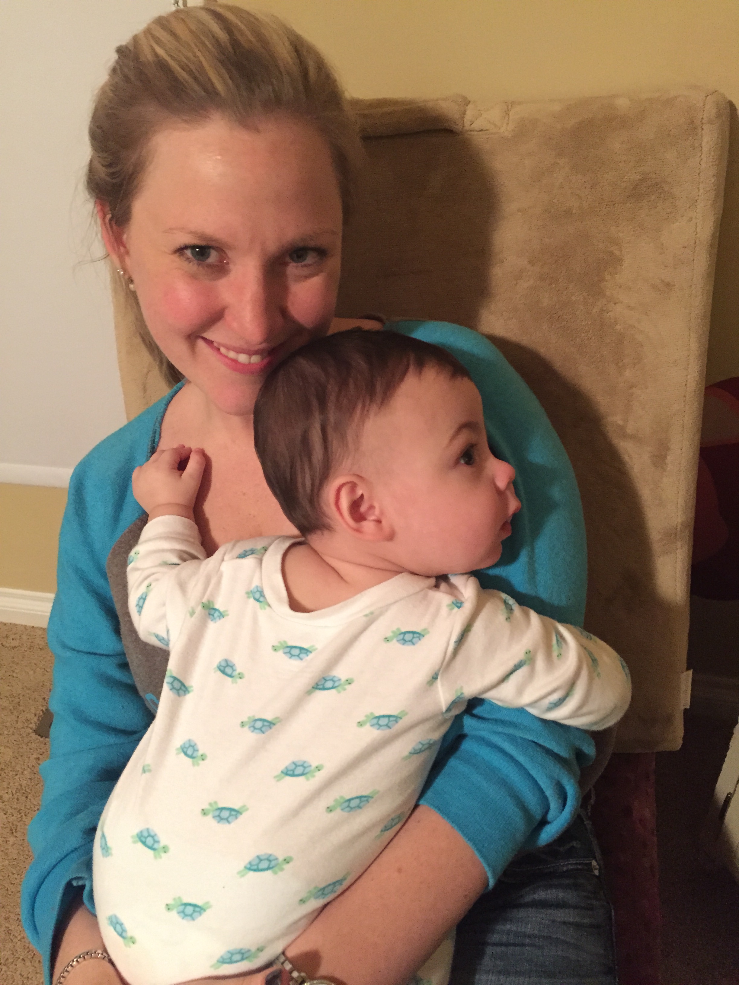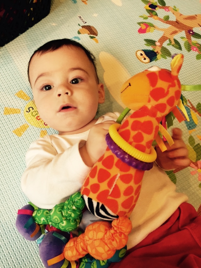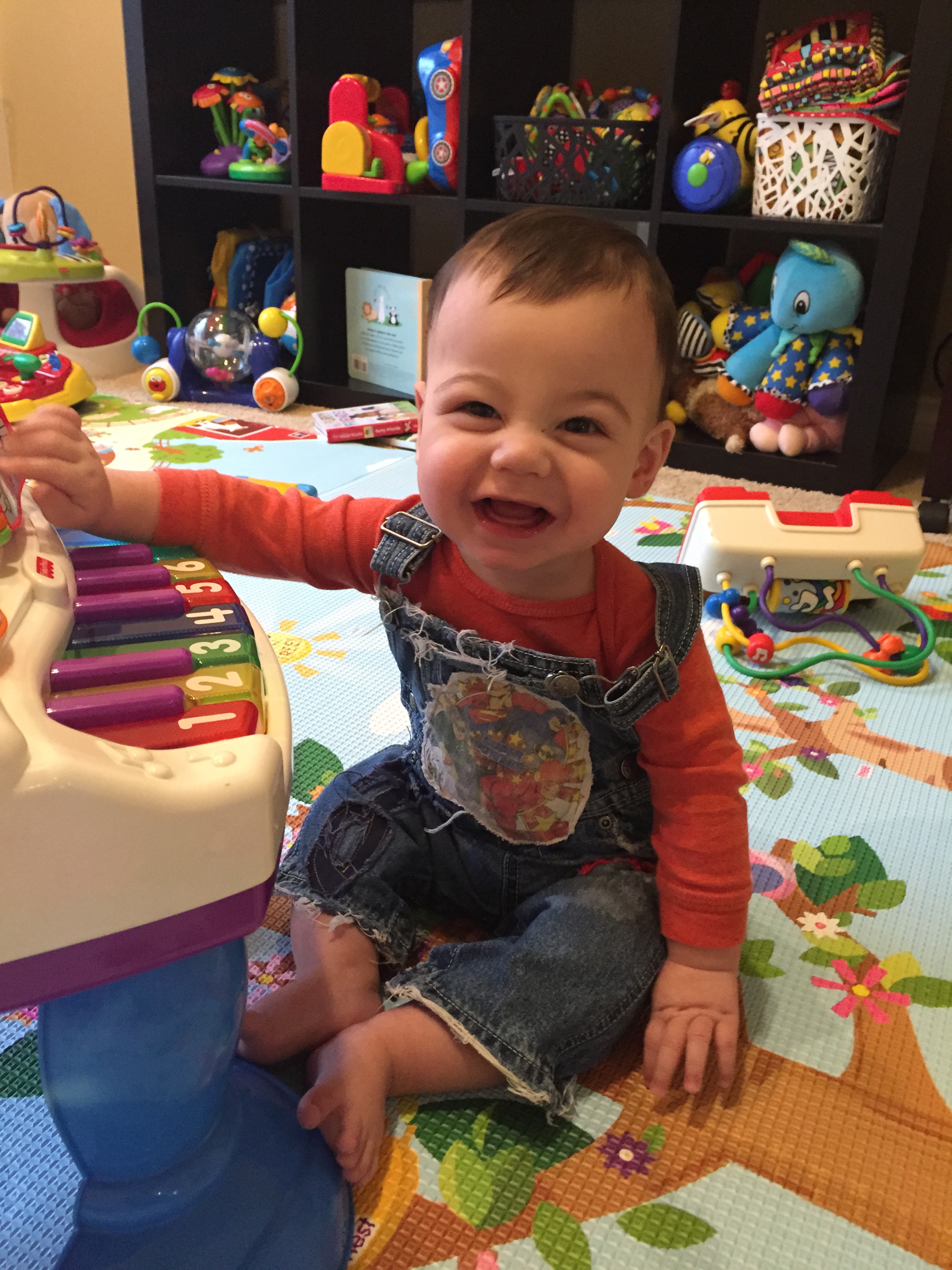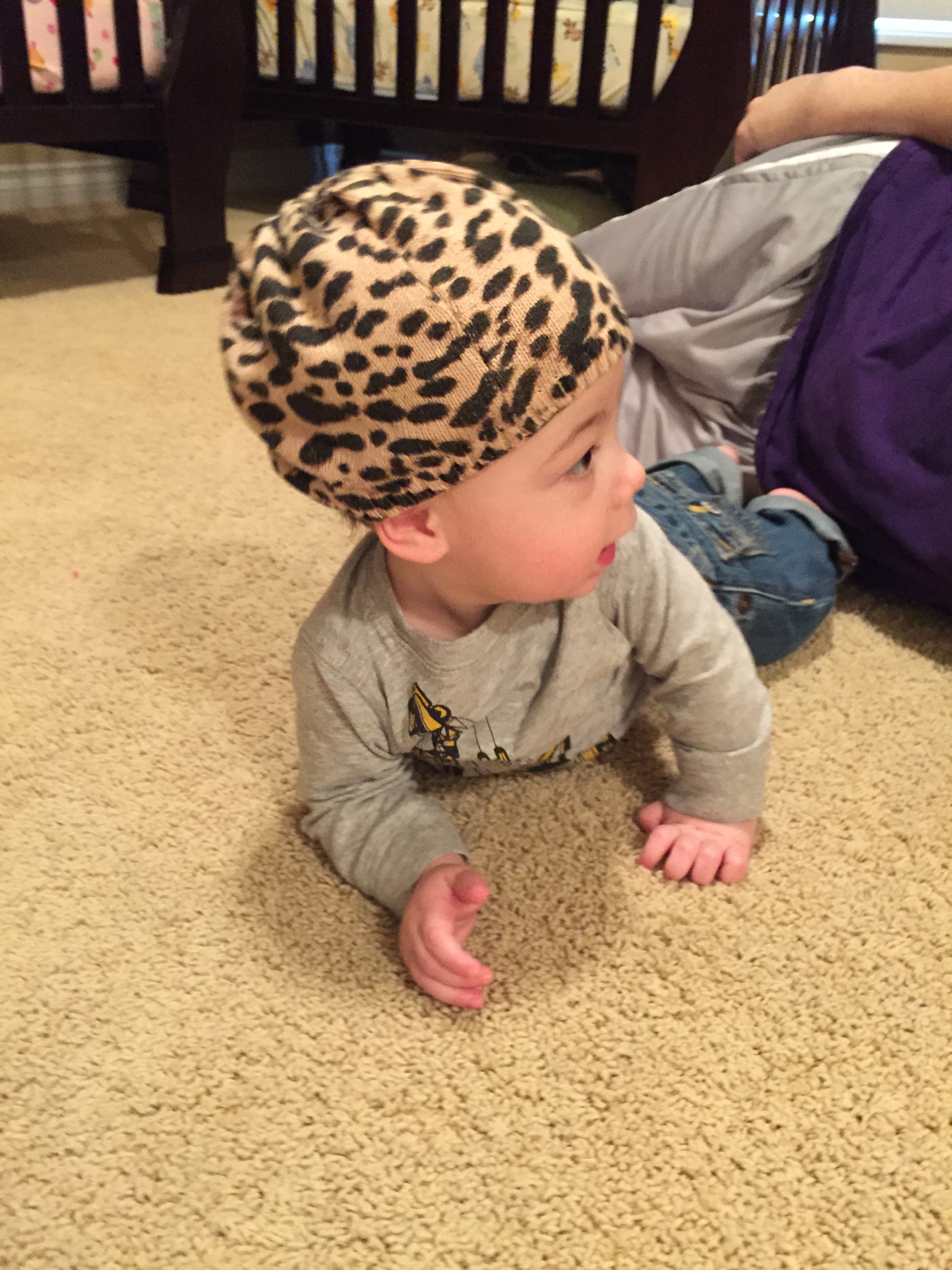 Sammy made huge leaps in the last month. Within a week, he went from doing the worm to crawling, pulling to his knees and pulling to stand. As of yesterday, he can get to sitting by himself, too. Sammy has four teeth and it’s adorable. He’s a big ham and our most sensitive baby.