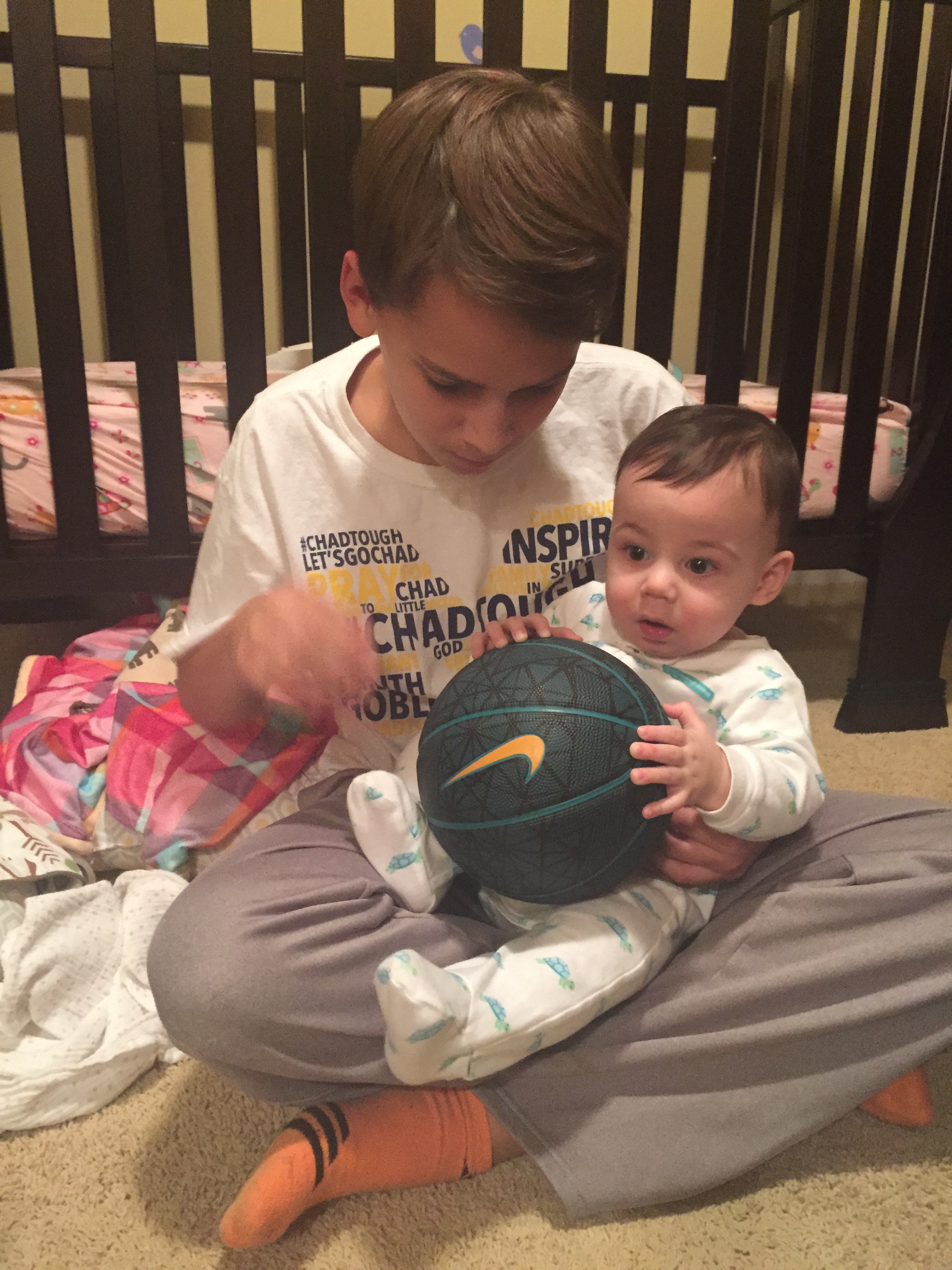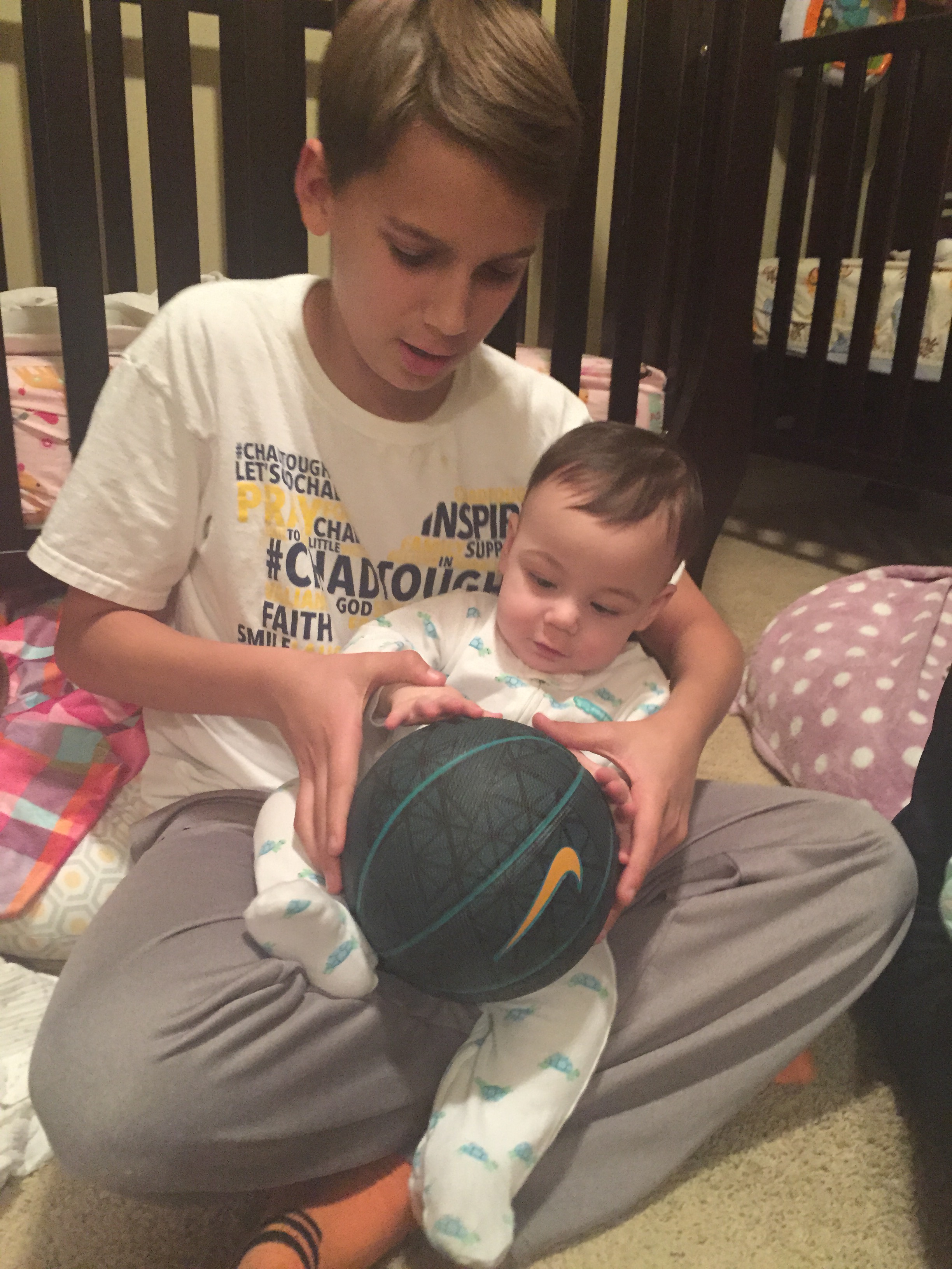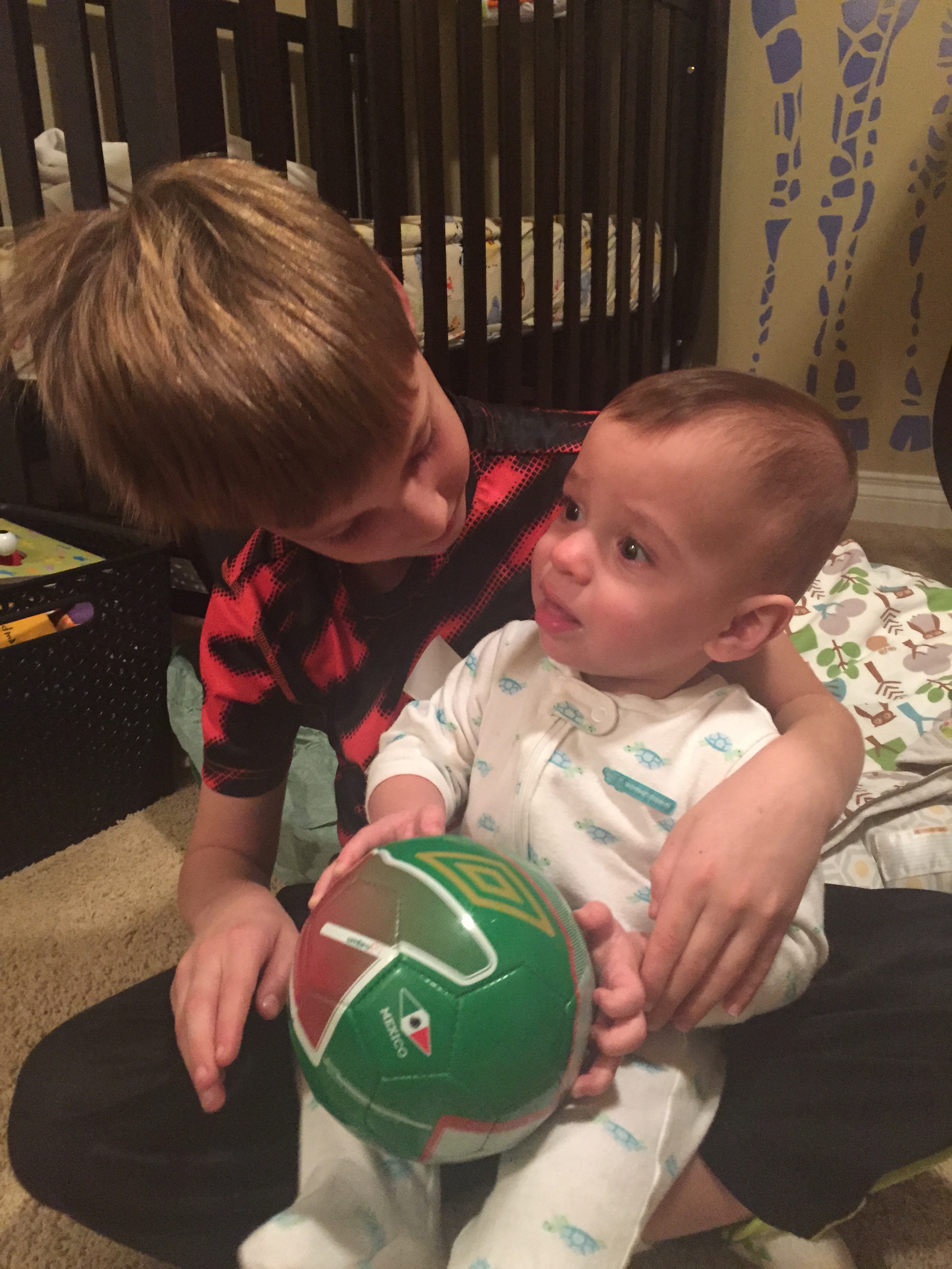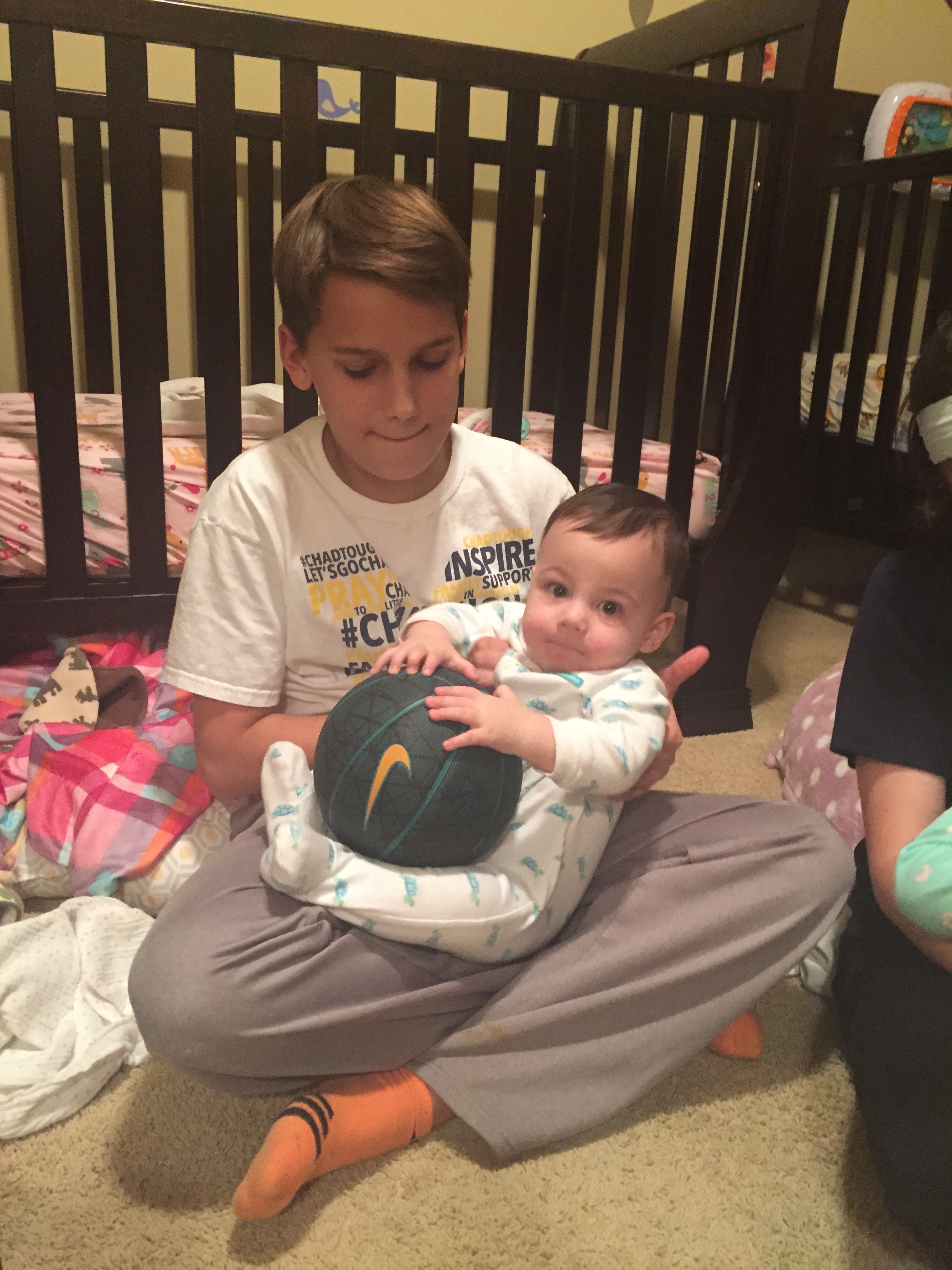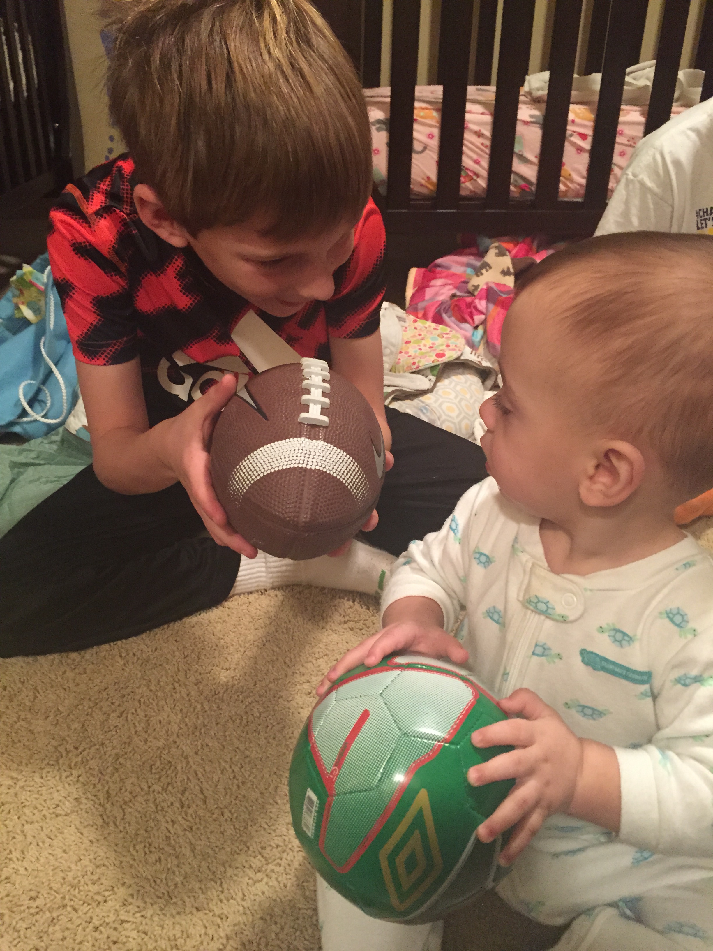 On Friday night, Jason and I had dinner plans with our friends Doug & Sue Karsch. (Doug was Jason’s best man at our wedding.) Before we went out, the Karsch family came over to give Steven, Sammy and Amaya some gifts. Sports balls!