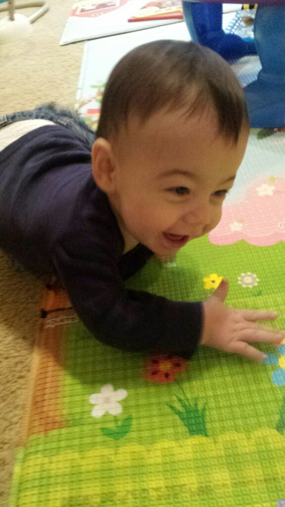 Steven first. This week, he figured out how to clap and TONIGHT he crawled, REALLY CRAWLED, for the first time. Yay Steven!!