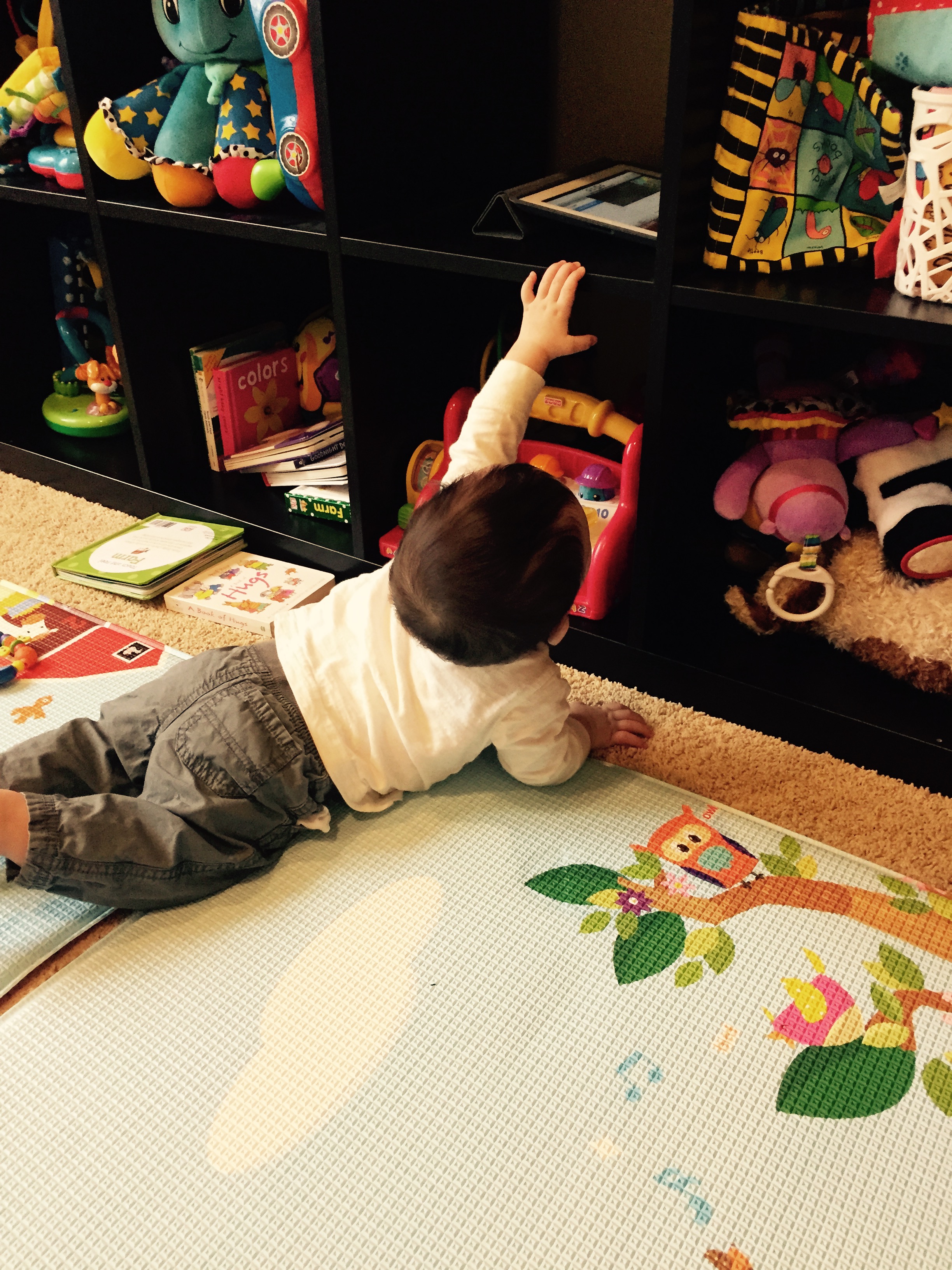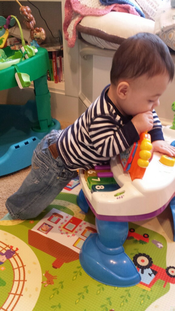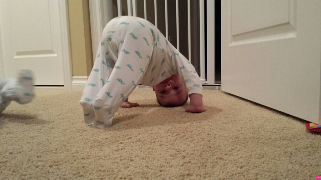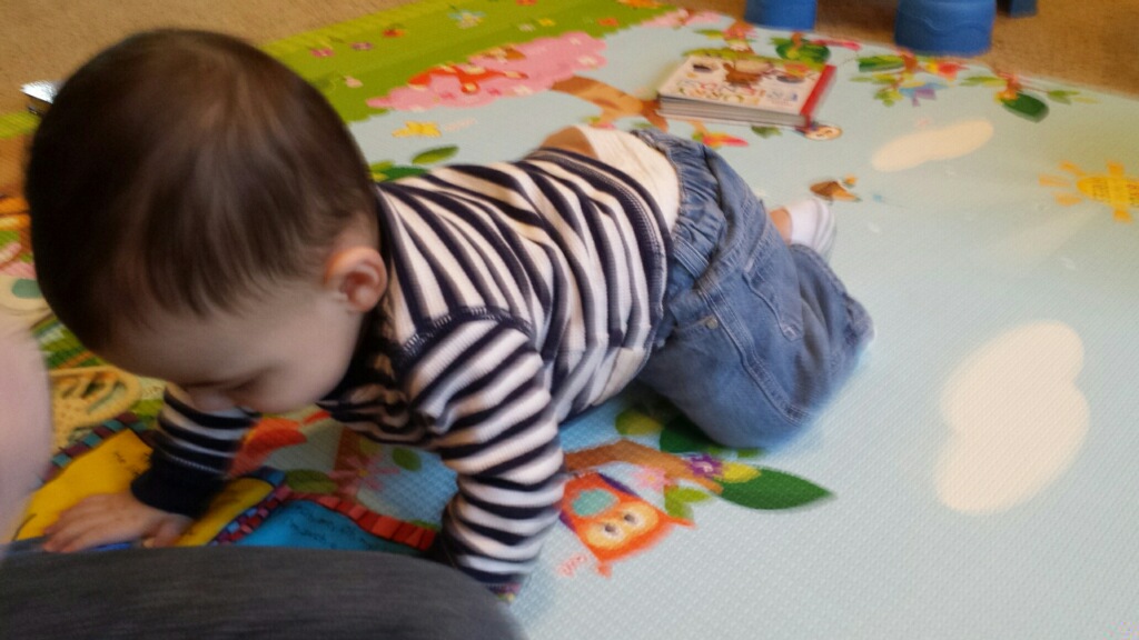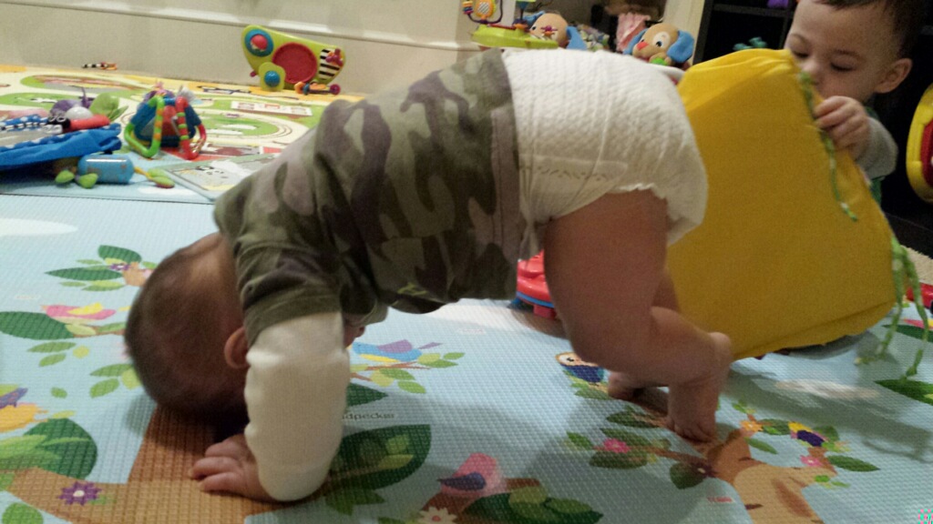 In one week he figured out how to crawl (vs. doing the worm), how to pull himself to his knees and how to stand. Rapid fire progression!