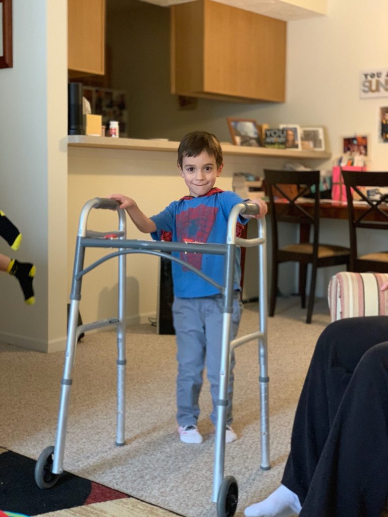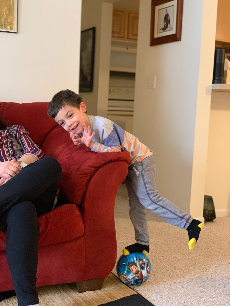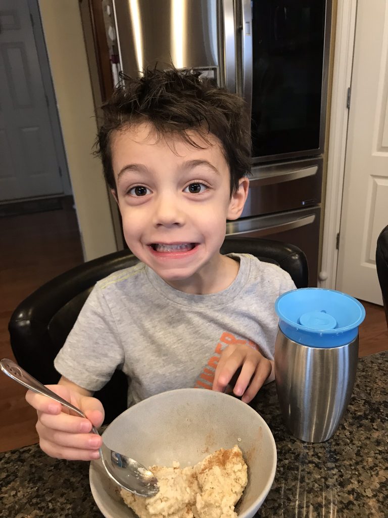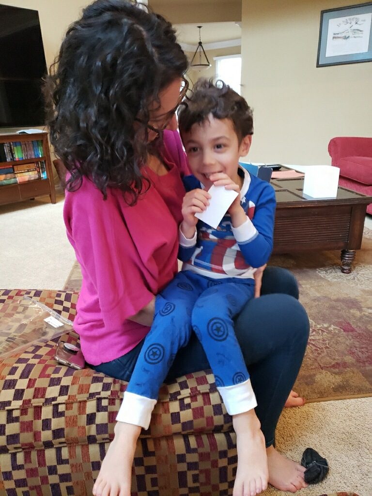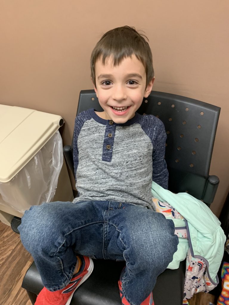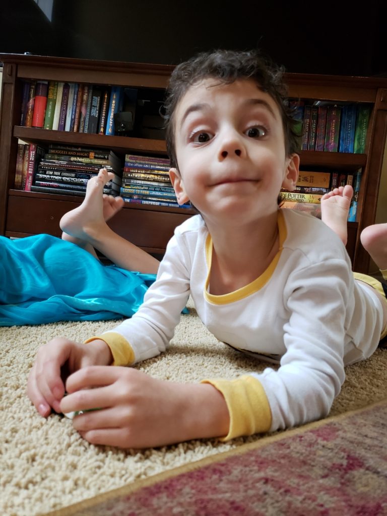 Sammy is a sweet child in the classroom. He is more likely to play independently or side-by-side with another quite child than to get into the middle of louder kids. There’s a small red couch in the reading area and the teachers often find Sammy there first thing in the morning either playing quietly, lounging or “reading” a book. They said that he seems to value that quiet transition time unlike some others who just want to run in and play. While I tend to see Sammy lose interest in projects at home, his teachers said that he is often the last to get up from a project at school. Looking at his art and handwriting, it’s obvious how far he’s come in the past 6 months. At the beginning of the year his drawings were scribbles and he struggled to write his name but both skills have really evolved. He still has some challenges holding his pencil correctly so we’re going to use thicker pencils and try a pencil grip. Sammy also has a tendency to move slowly so Ms. Jena was proud to tell me about the day, last week, when Sammy was the first to get dressed after swim. Just like at home, Sammy loves water and is generally last to the table because he spends so much time washing his hands. Ms. Bri joked that they want to use Sammy as the example of hand washing practices when licensing comes to visit the school.
