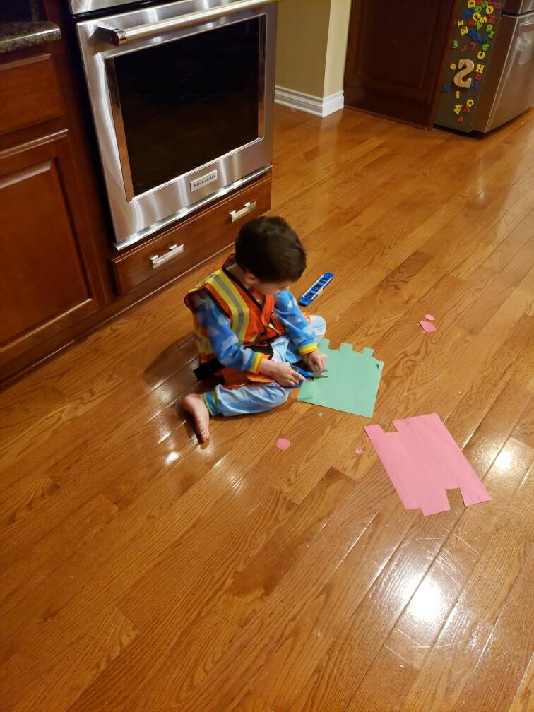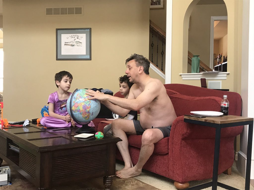 Learning with Daddy about volcanoes and tornadoes and tsunamis and the movement of tectonic plates.