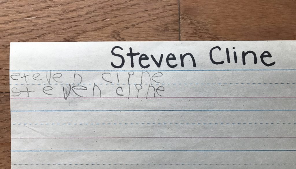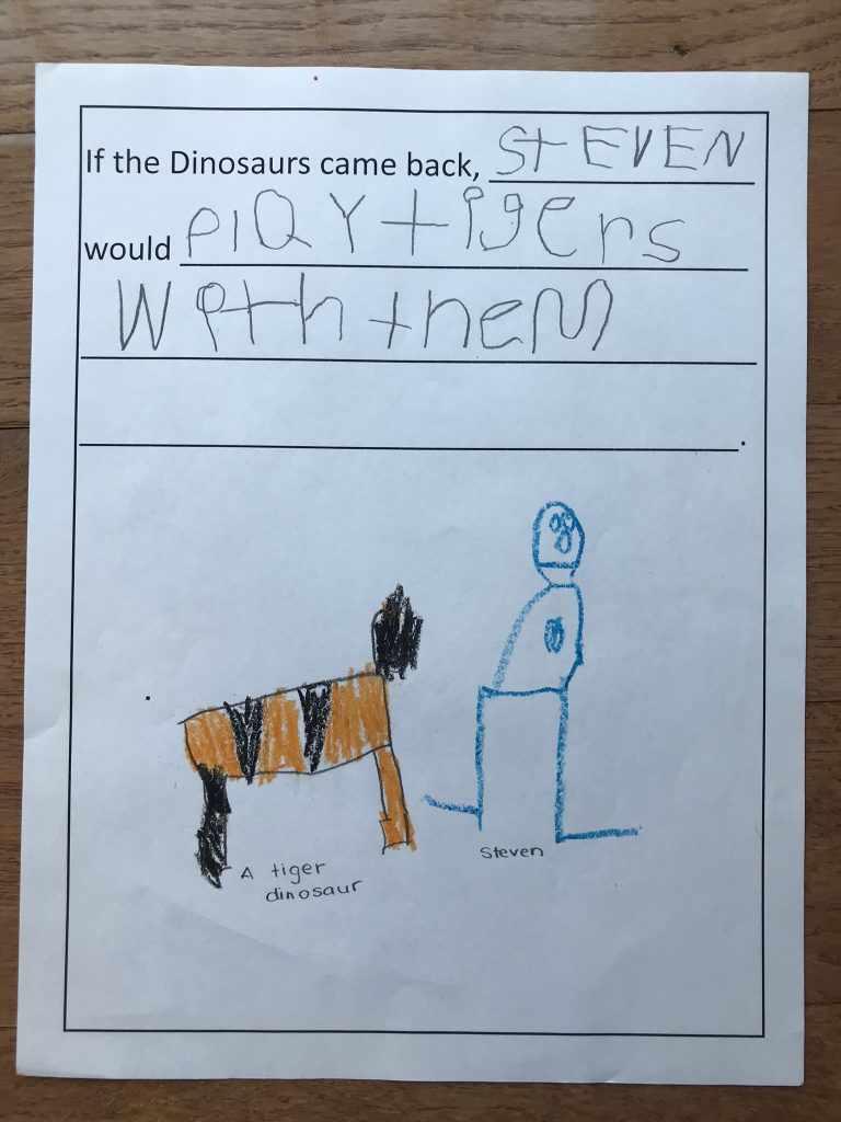 Steven would “play tigers with them.” (You can see the kids working on their lowercase letters.)