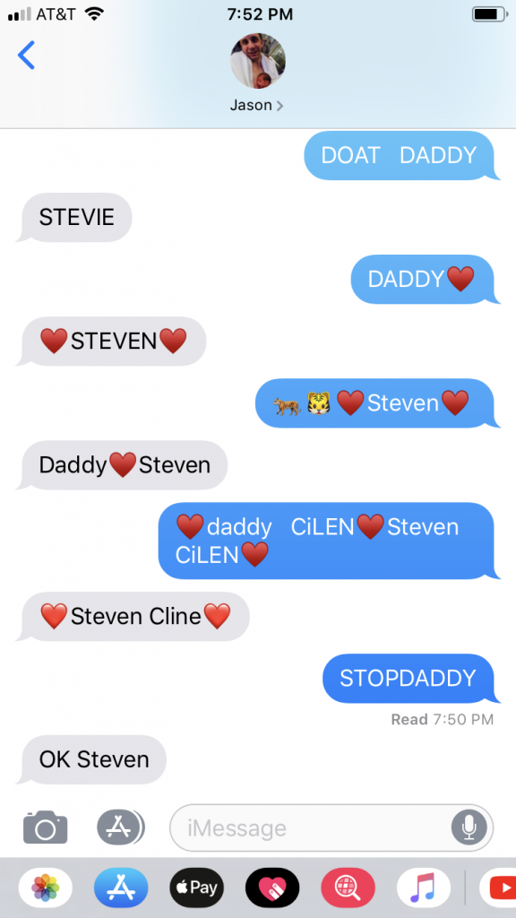 Side note: earlier this week, Steven was texting with Jason and Jason got a text that said, “STOPDADDY”. Jason texted back, “OK Stevie.” Steven called Jason and said, “Did you text ‘OK Stevie” because you saw my text that said ‘Stop Daddy” and knew I wanted to go to bed?” He’s legitimately communicating via text!