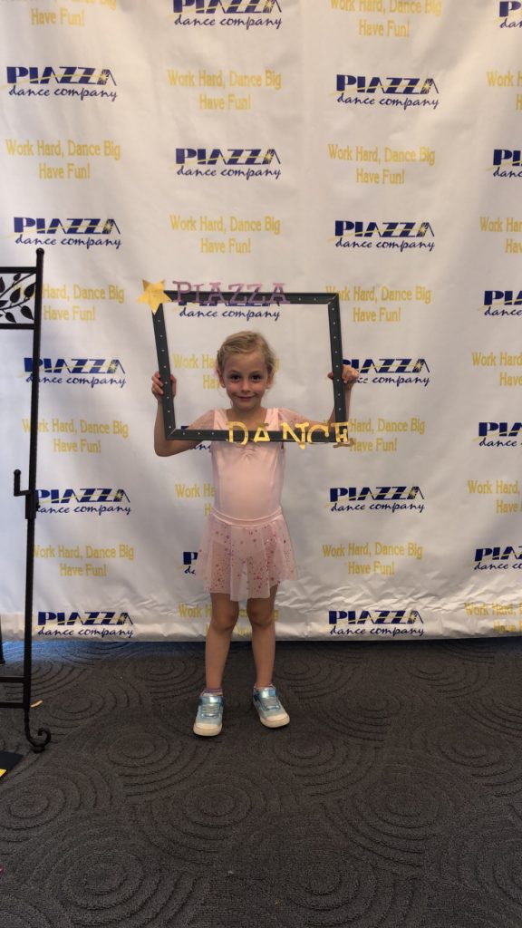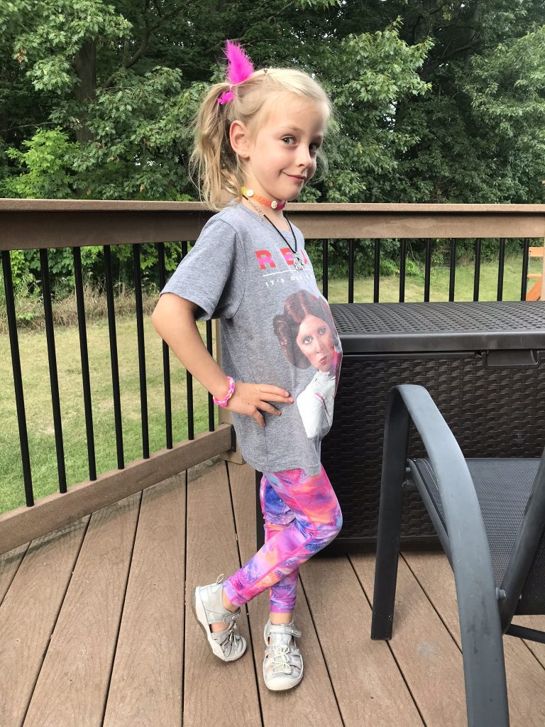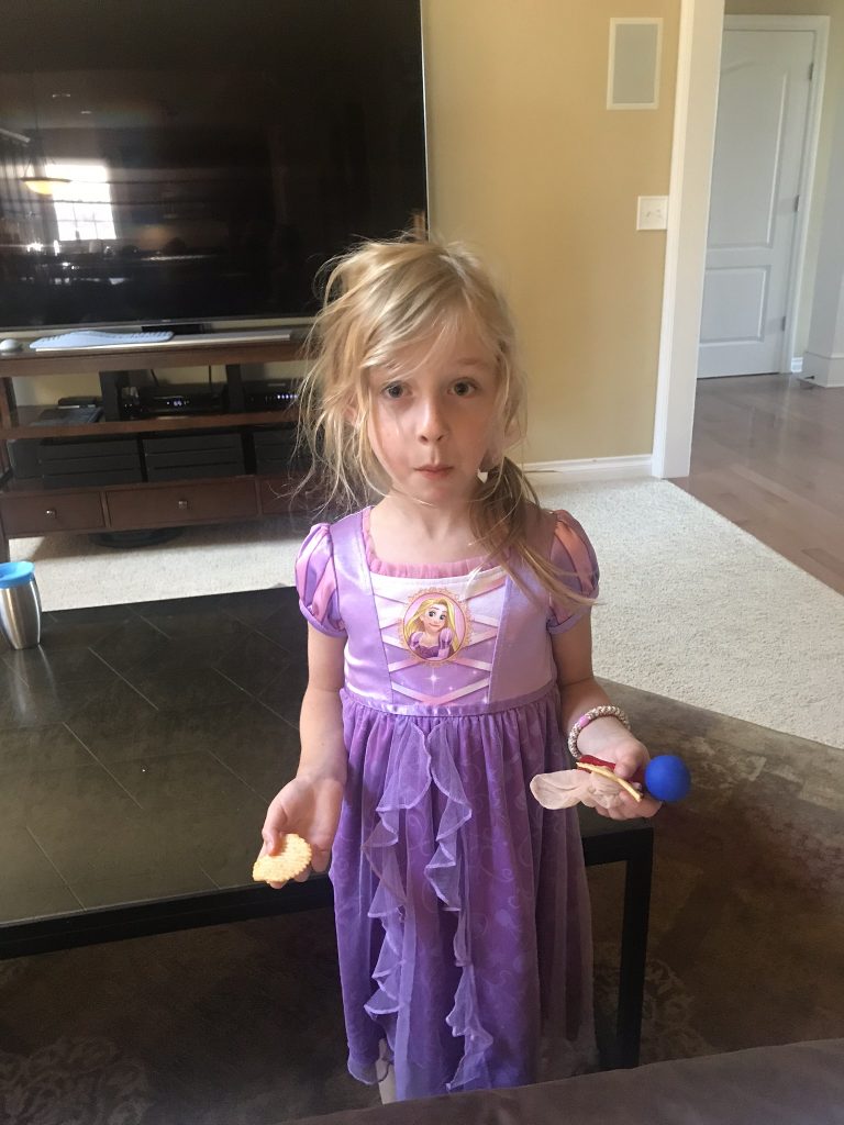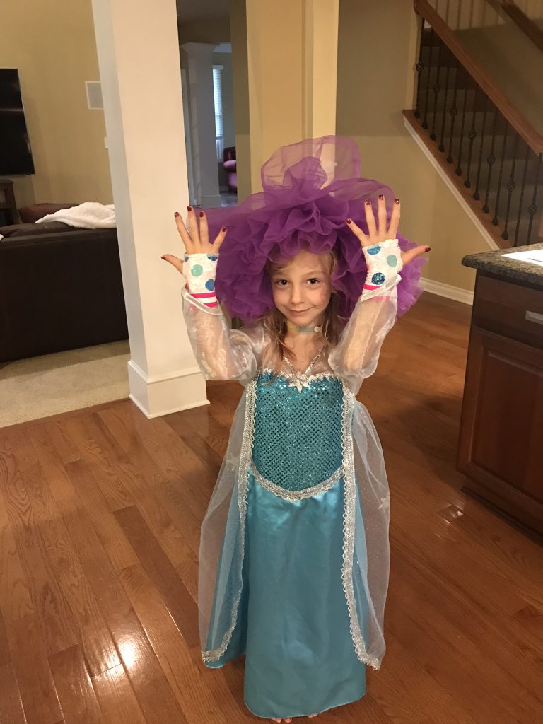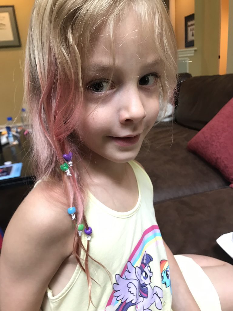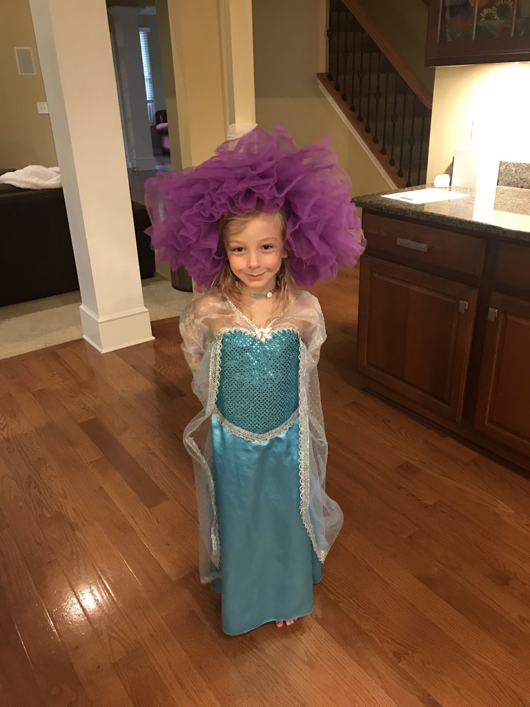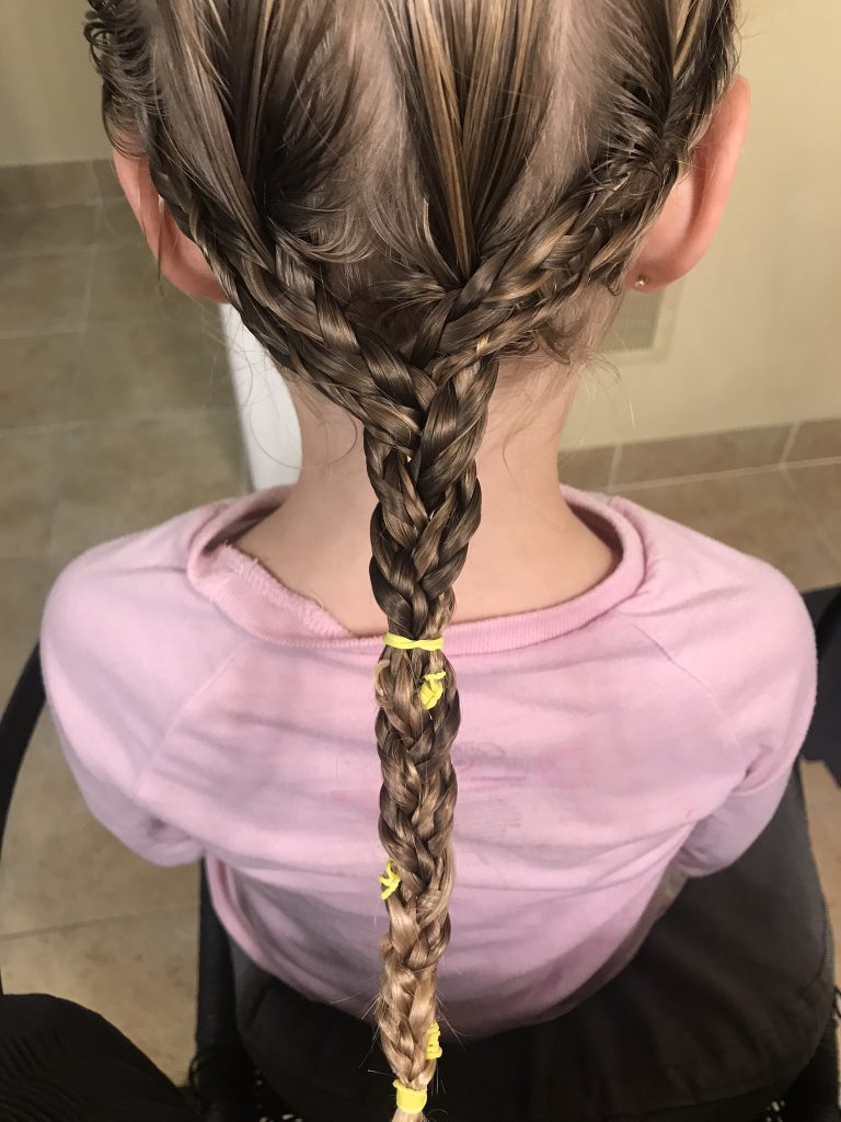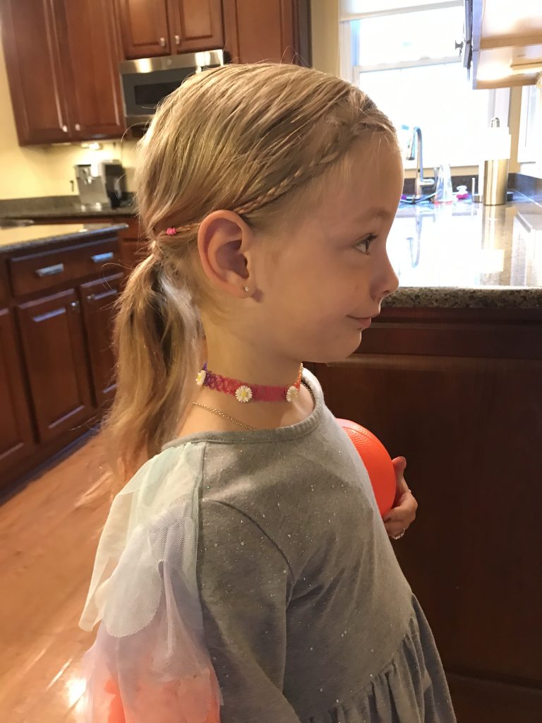Amaya picked out this dress and asked for two small braids that meet in a pony tail.