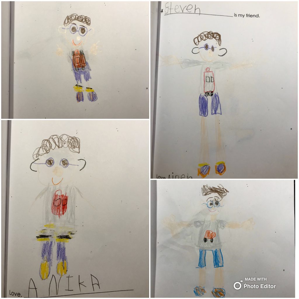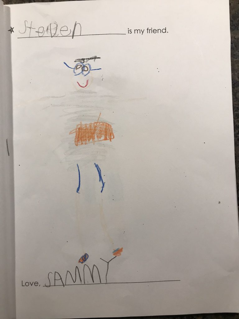 Mrs. M, the boys’ teacher, has a program called “Star of the Day” where a student stands in front of the class and all of the other kids draw a picture of them. The pictures come home in a “friend book” and it’s so cool.