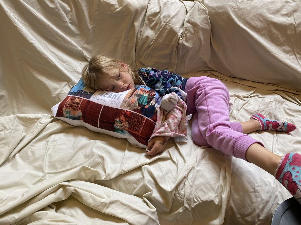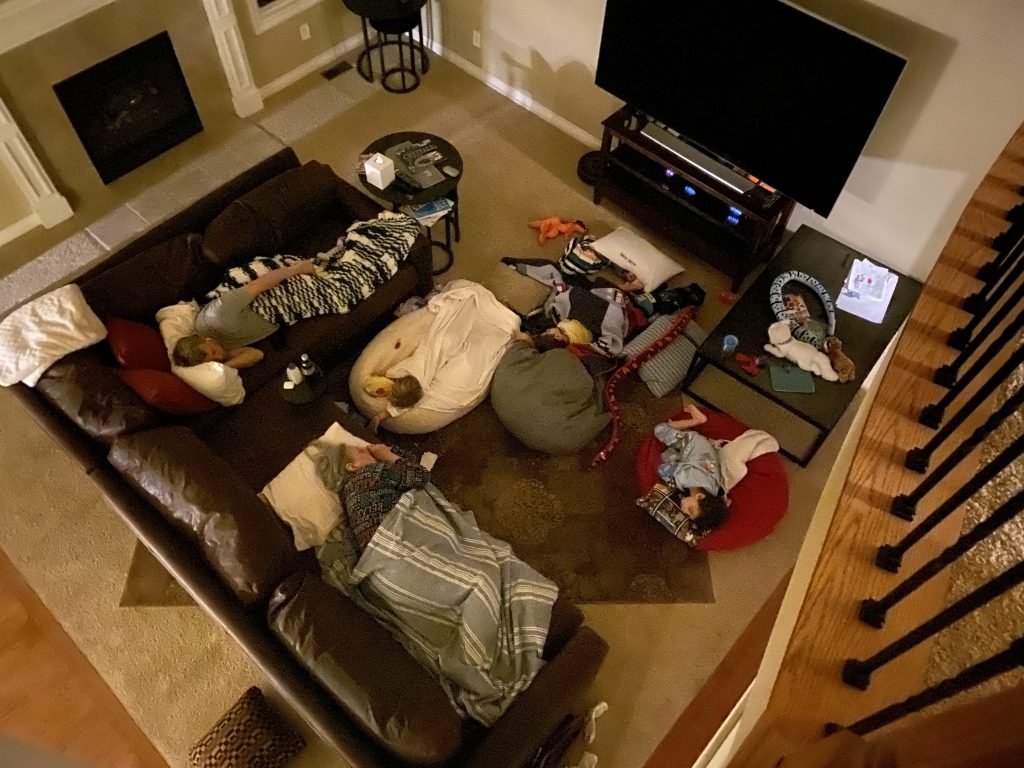 With the night setting on my camera you can’t tell how dark it is downstairs, but I managed to snap this picture of my sleeping family before I went to bed. So sweet, and such a treat for Steven, Sammy and Amaya!
