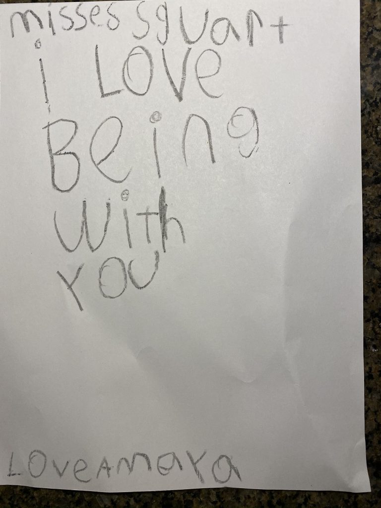 We reviewed some of Amaya’s writing skills and discussed goals for literacy and math for the balance of the year. Mrs. Shuart reinforced the importance of reading to and with the kids, and making sure it stays fun for them. She also reminded us that they should be trying to spell words themselves, and we should praise their attempts even when they’re not quite right. Or far from it. 🙂
