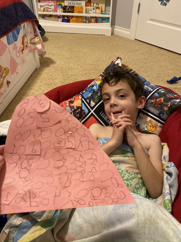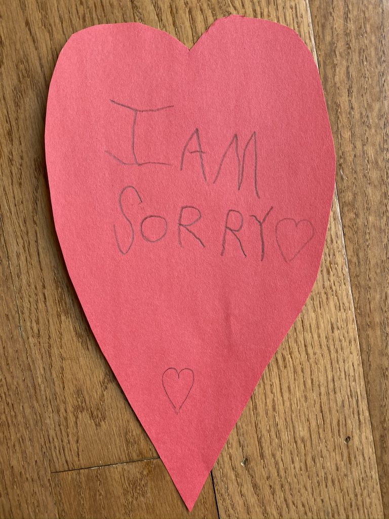 At breakfast time, Sammy was frustrated with a decision I made and he hit me. Jason worked with him on ways to apologize and they agreed on writing it down. Sammy brought him this red paper and asked if Jason would cut it into a heart after he wrote his apology.