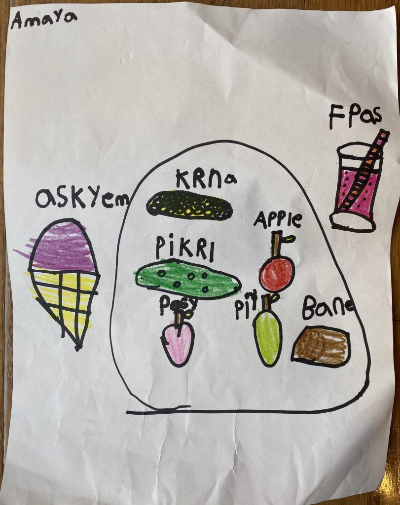 Here’s an example from this week. (I have a hunch that she had some help with “apple”.)