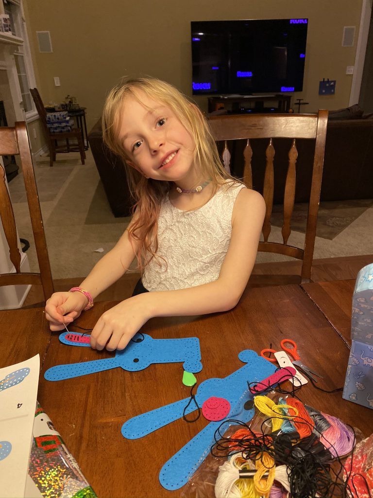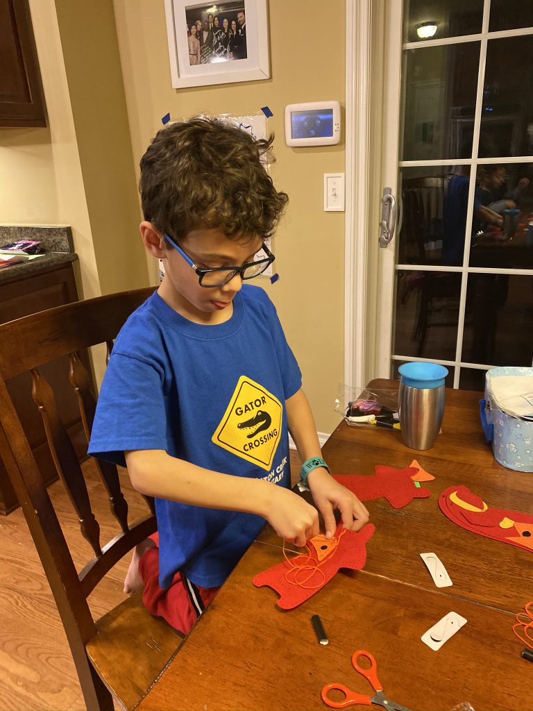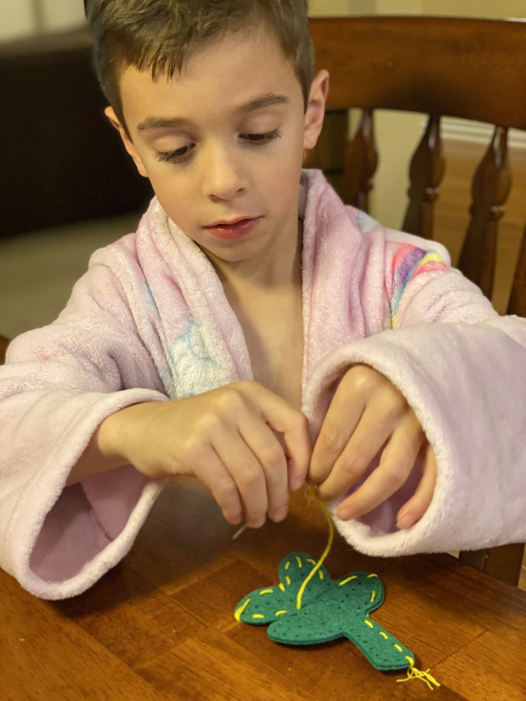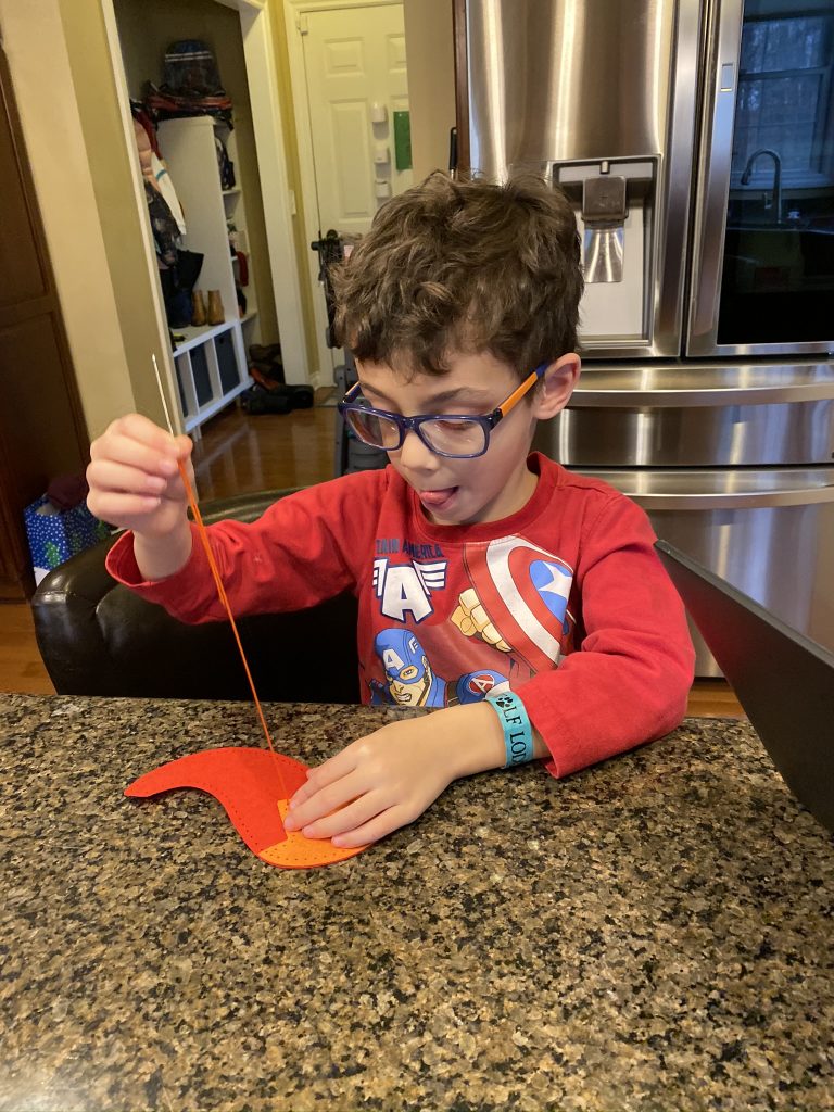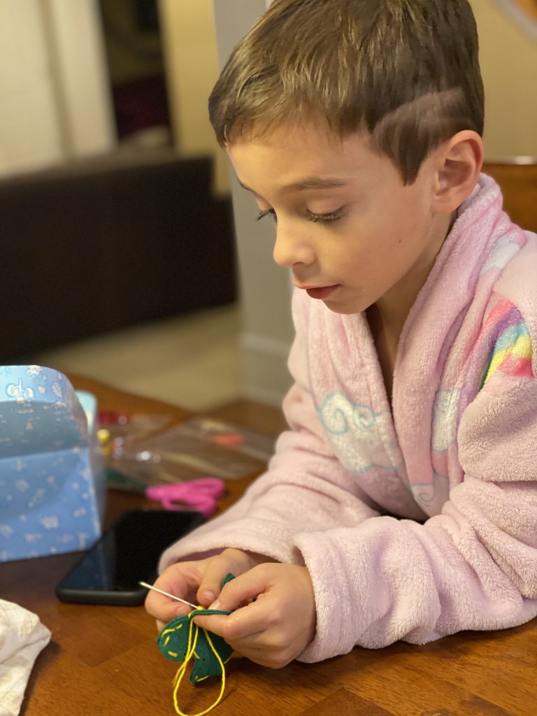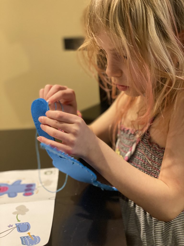 The kits come with blunted metal needles and patters with the holes already cut It was a slow start with lots of “the thread fell out” comments but practice makes better! Once these three can thread their own needles (Sammy is getting it) and tie their own knots, they’ll be totally independent.