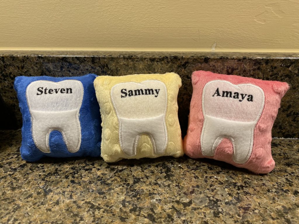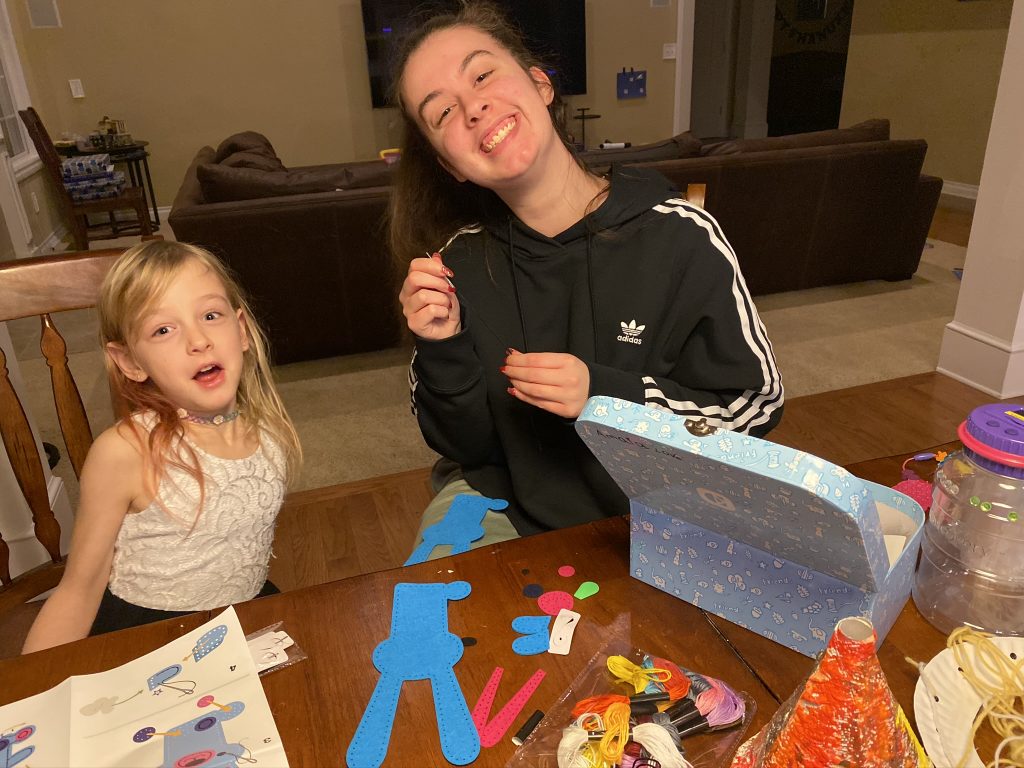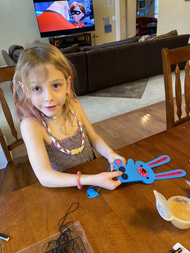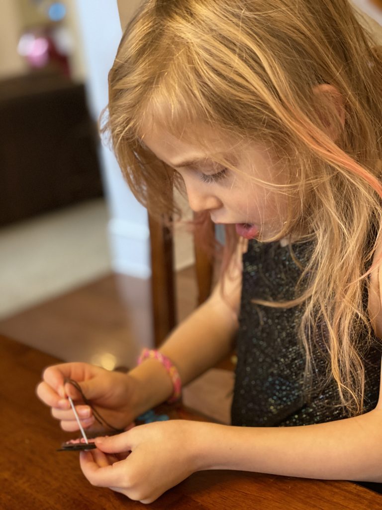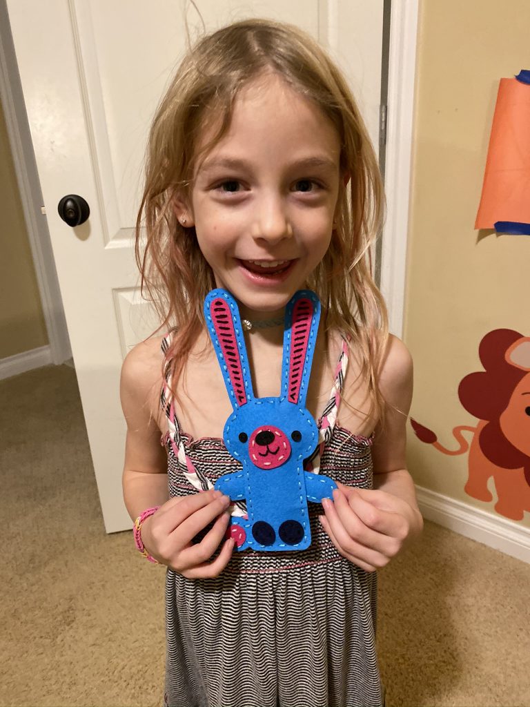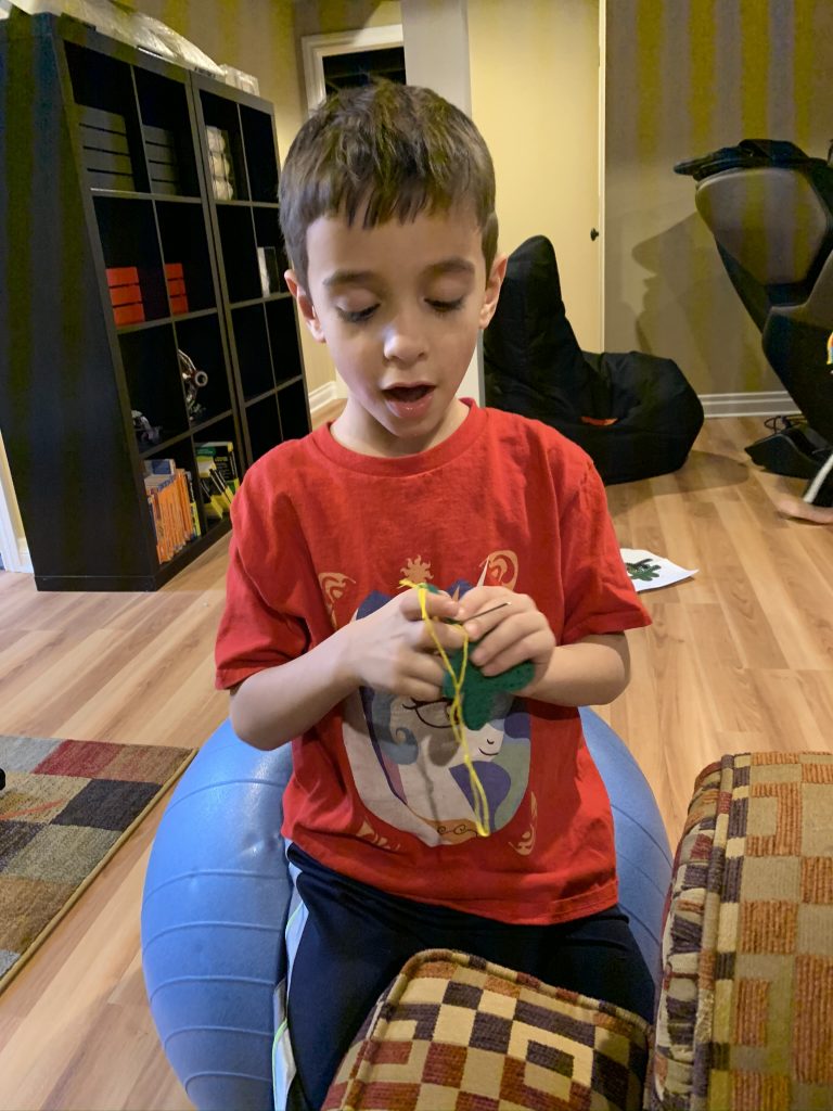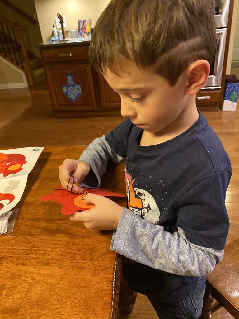 The kits come with blunted metal needles and patters with the holes already cut It was a slow start with lots of “the thread fell out” comments but practice makes better! Once these three can thread their own needles (Sammy is getting it) and tie their own knots, they’ll be totally independent.