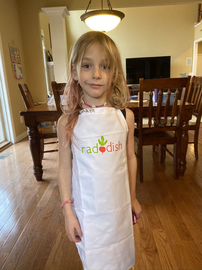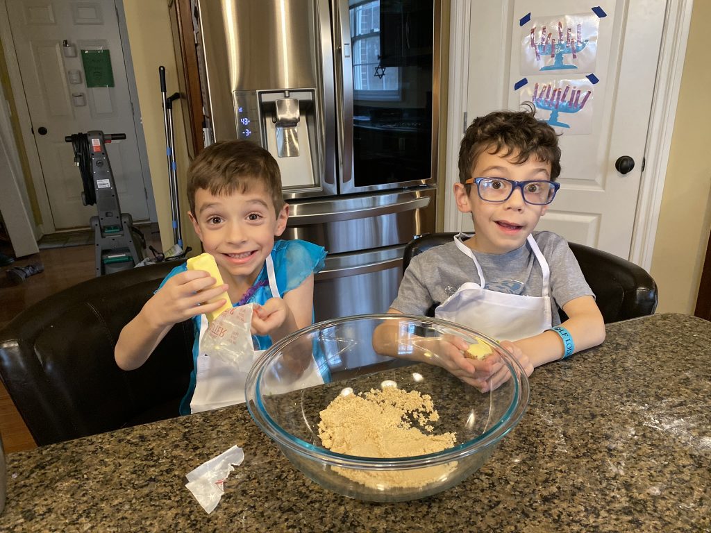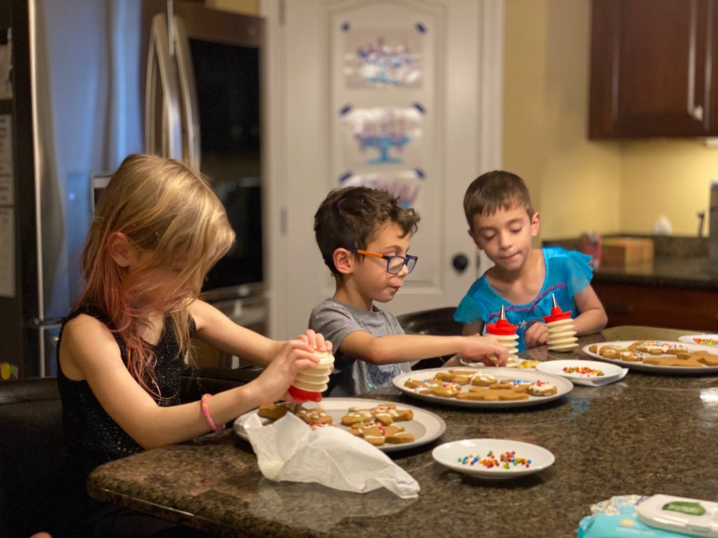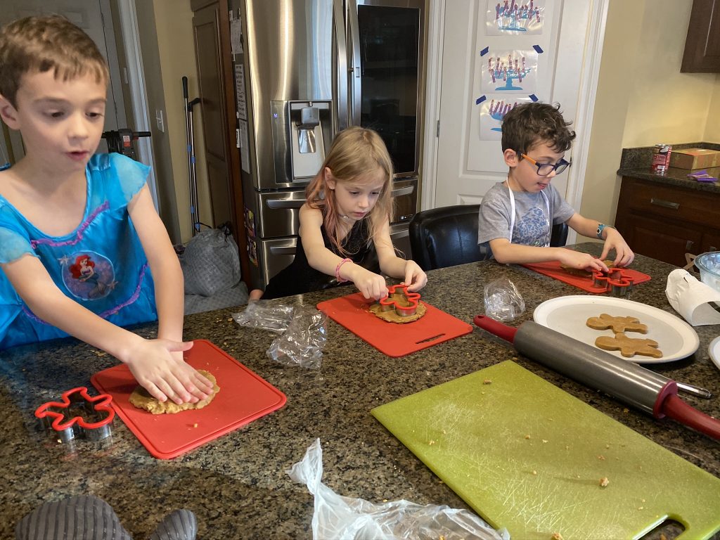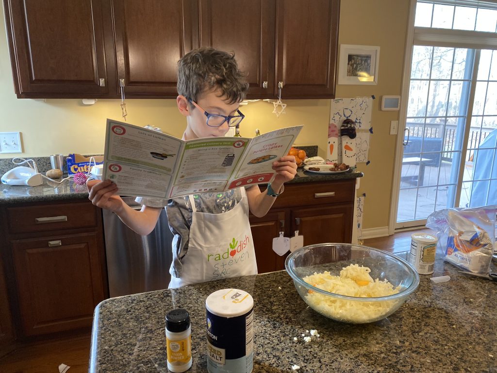 For Hanukkah (night 7!), Nana and Papa got the kids a Raddish Kids subscription. It’s a cooking club and every month we get three new recipes. They also get their own apron, a new iron-on apron patch each month and cooking tools to use with that months’ recipes. This month’s theme was Holiday Traditions Around the World and the recipes were for latkes, gingerbread cookies and tamales. Yesterday we spent about 2 hours making the latkes and cookies.