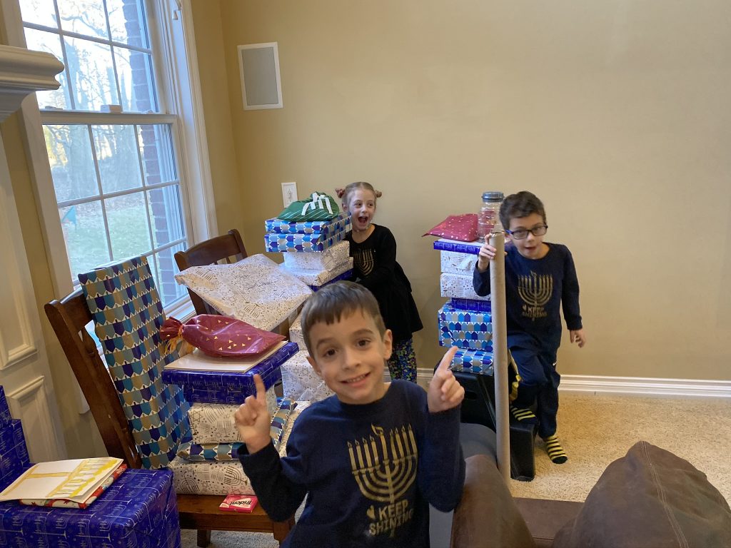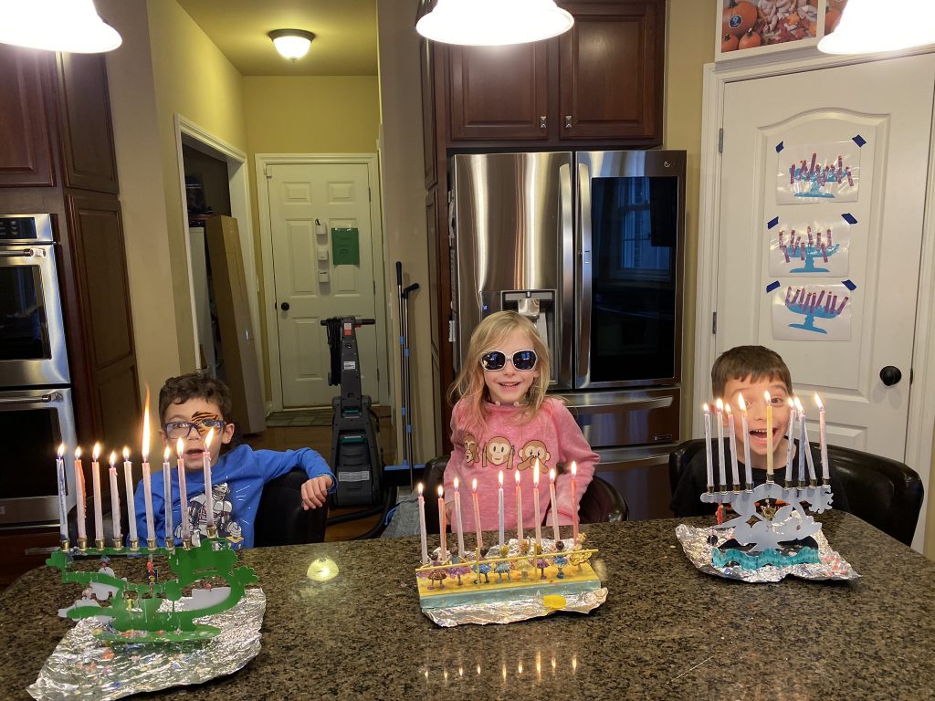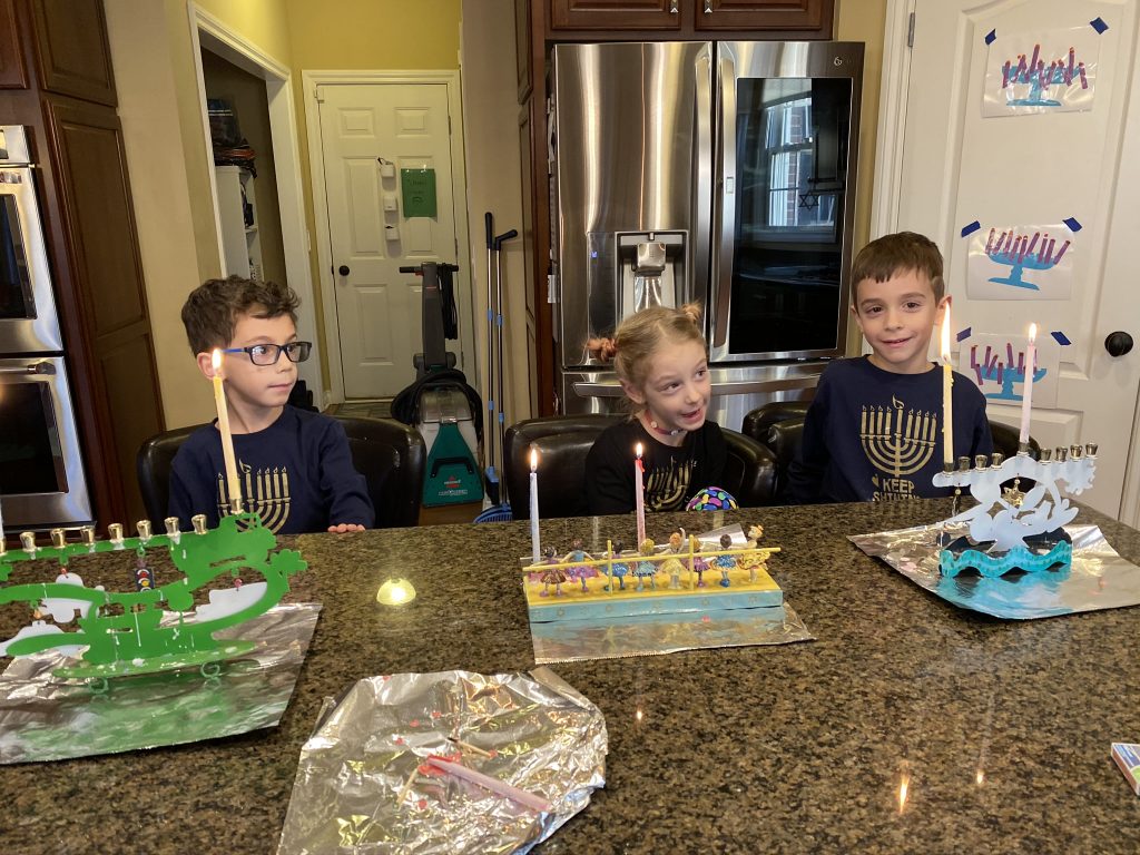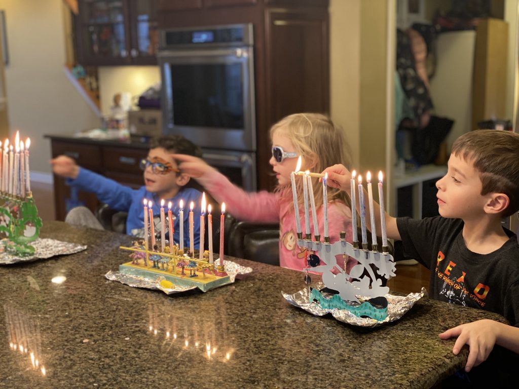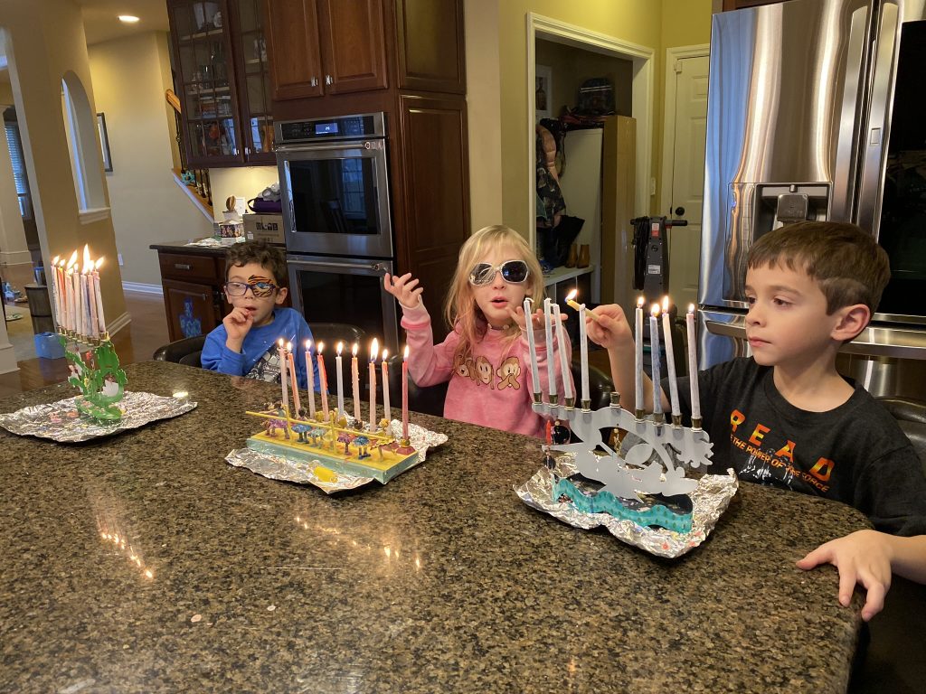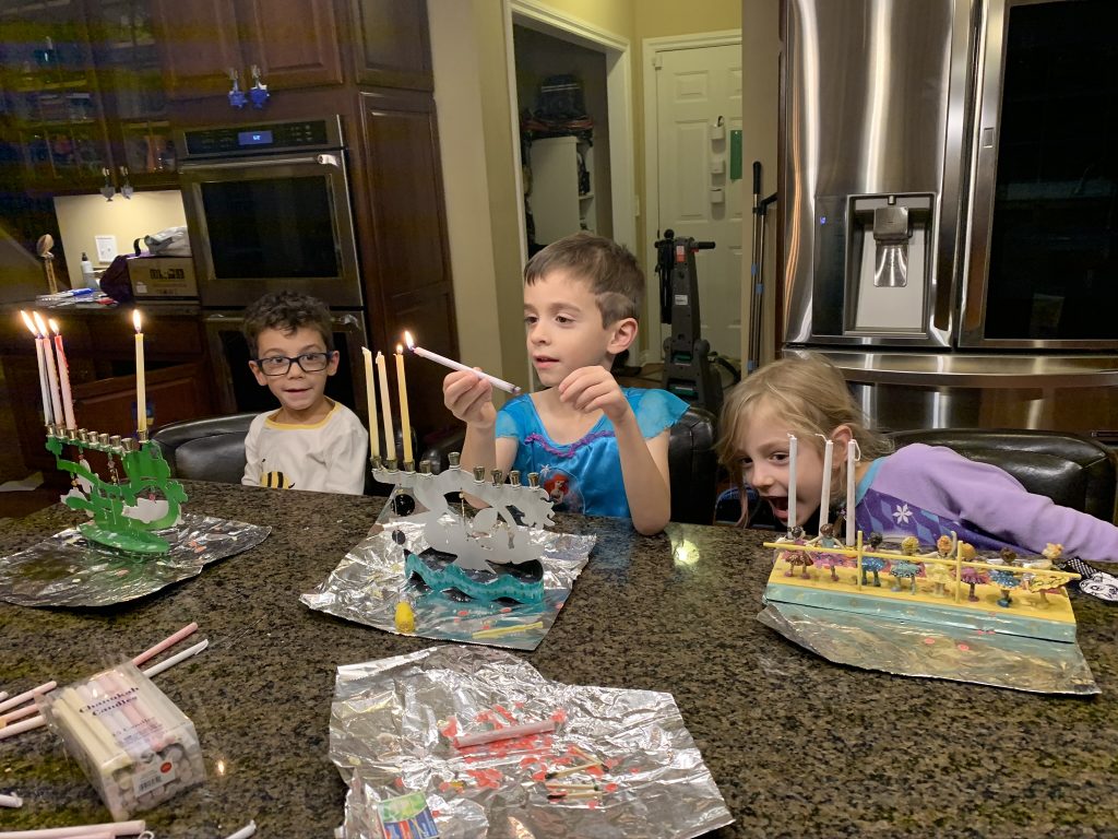 And on to celebrating night 4! Steven, Sammy and Amaya are now quite proficient at lighting their menorahs and, this year, they even know the second blessing that we say each night.