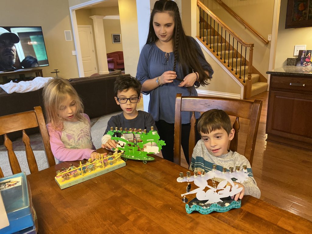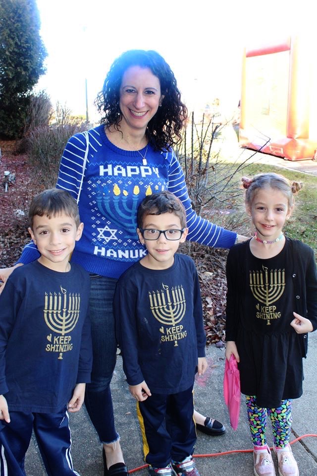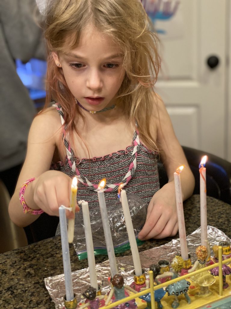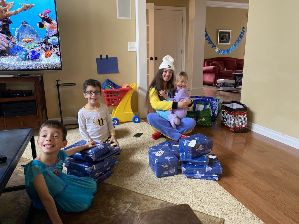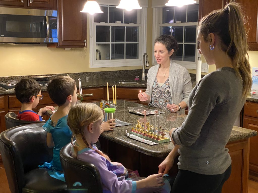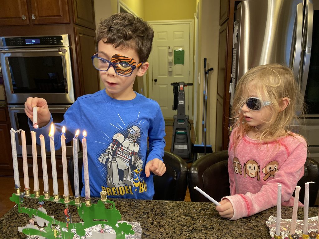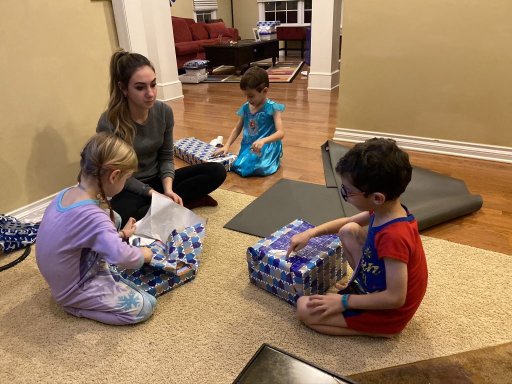 And on to celebrating night 4! Steven, Sammy and Amaya are now quite proficient at lighting their menorahs and, this year, they even know the second blessing that we say each night.
