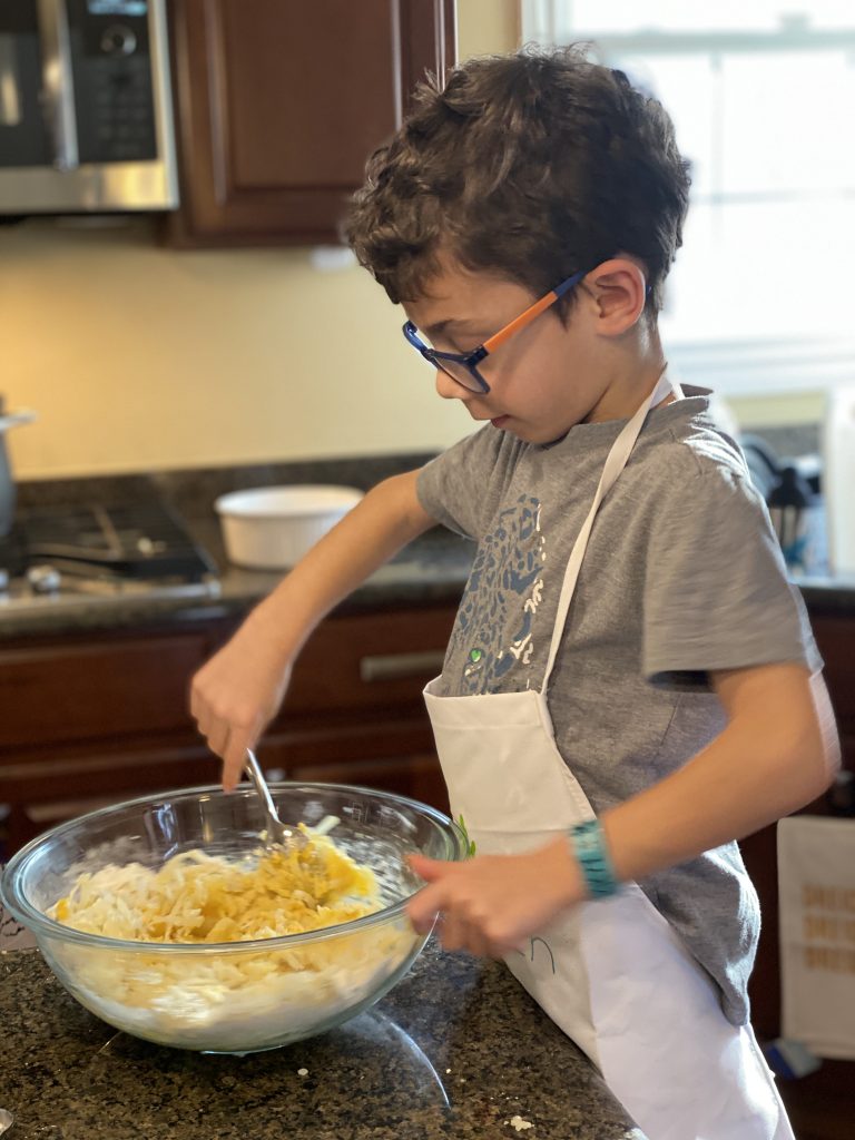 Mixing ingredients for the latkes. It was my first time making the, too, and they were delicious.