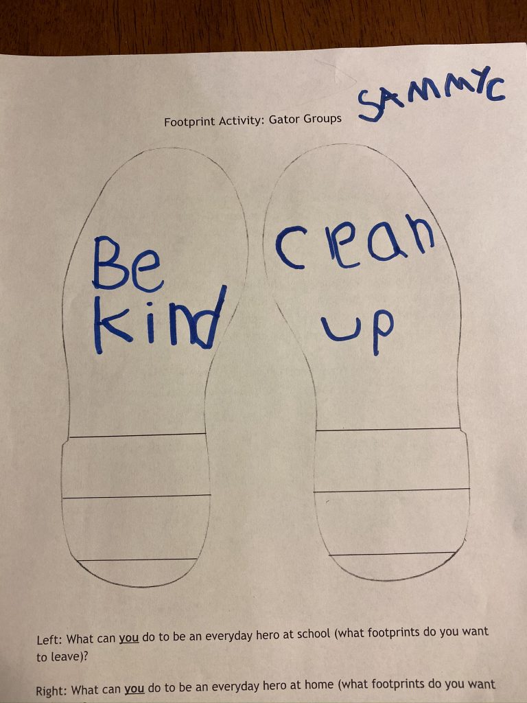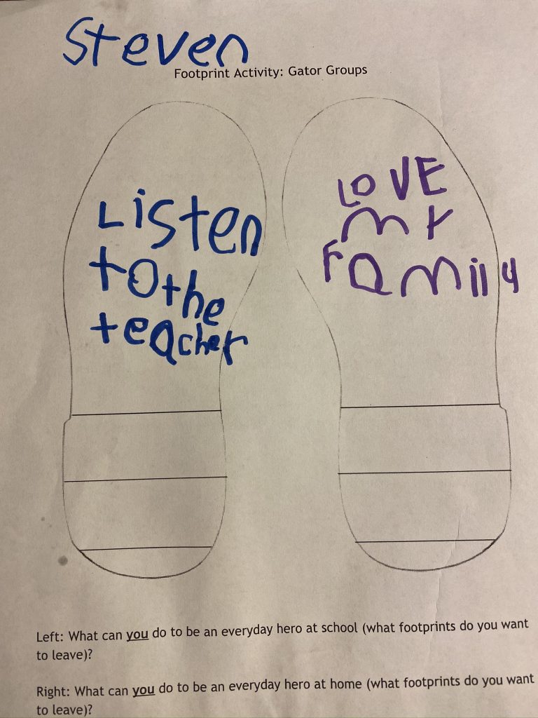 We also have a school wide project, following a assembly, to complete a footprint activity where you write how you’ll be a hero at school and a hero at home. Amaya only gets materials sent home on Mondays but the boys got to complete their footprints this weekend.