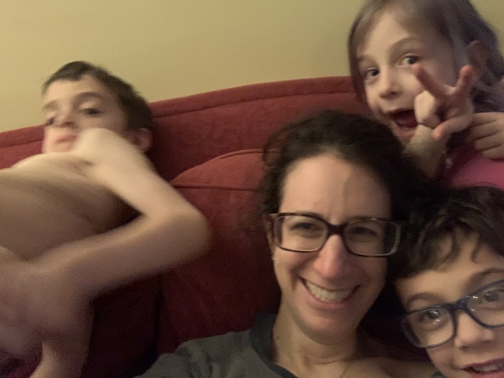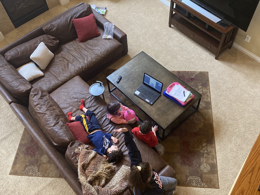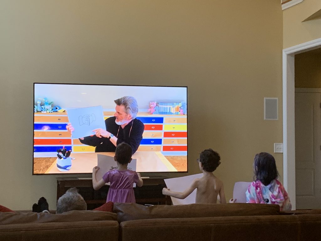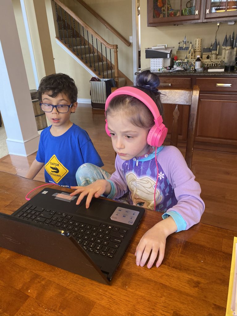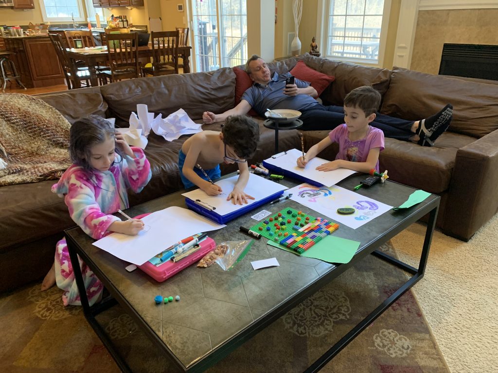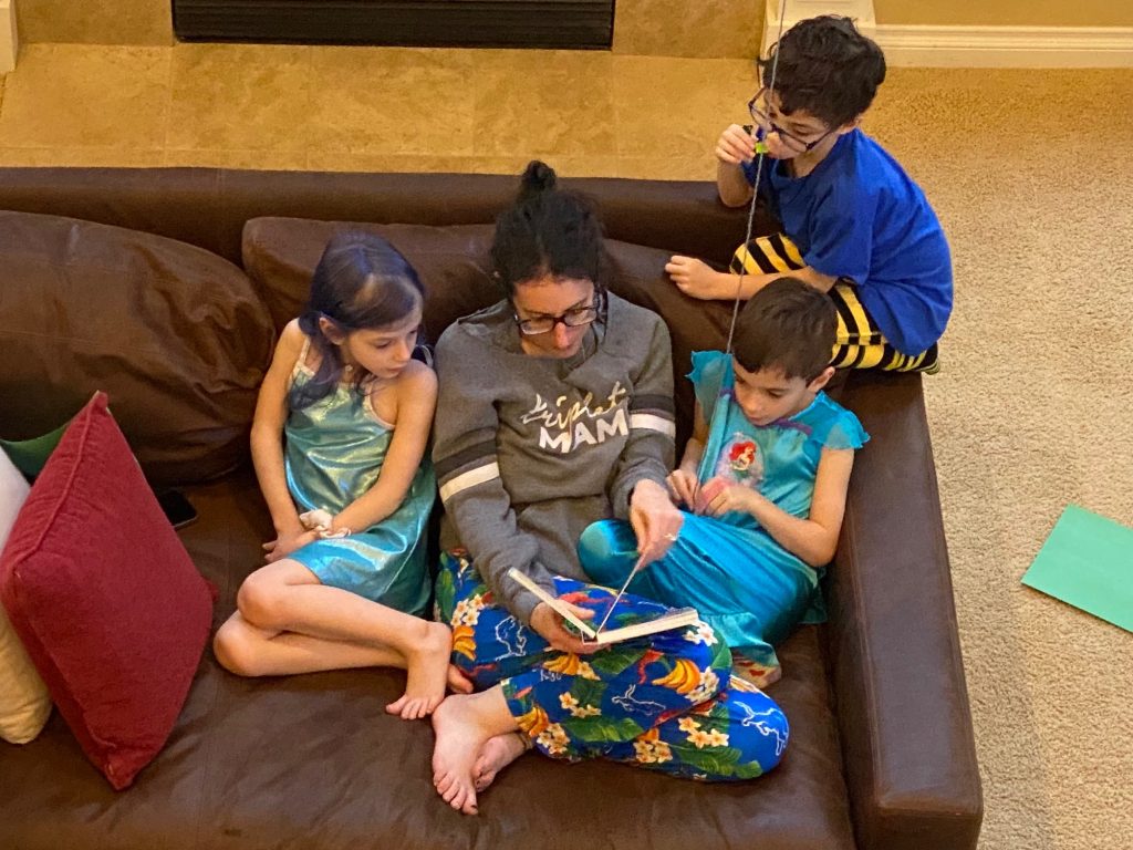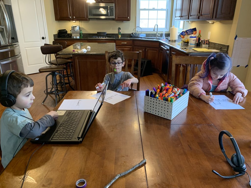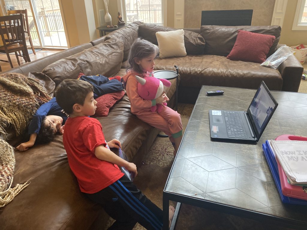 Temple Israel is doing their best to stay connected to families, including through the religious school. On Wednesday morning, the kids had a Zoom class with Ms. Amy. I was working through it but they seemed to enjoy the time, though Amaya asked why they had Sunday School on a day that wasn’t Sunday. Fair enough.