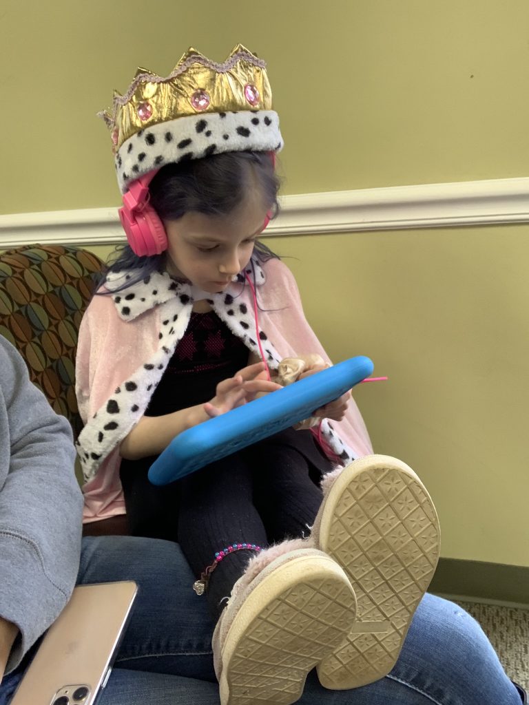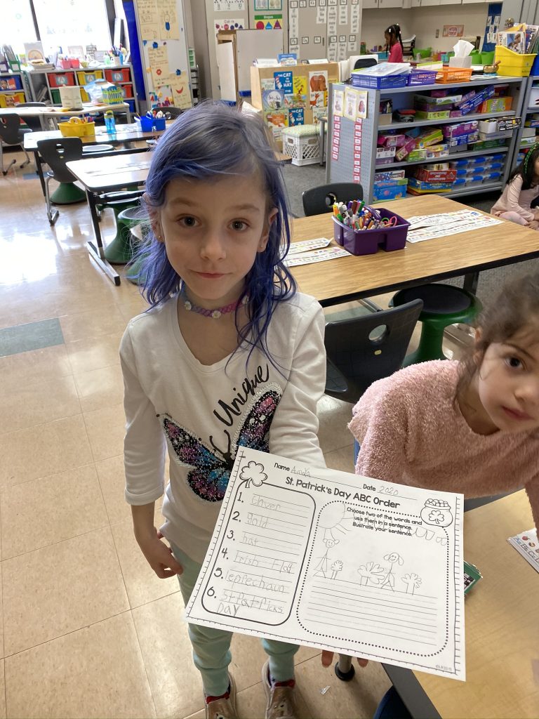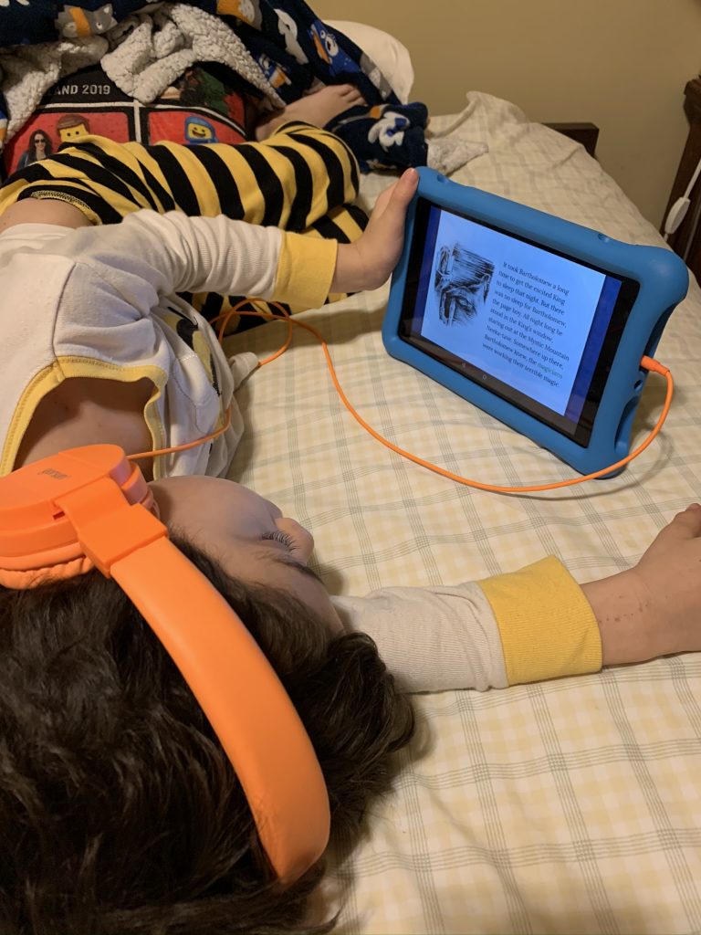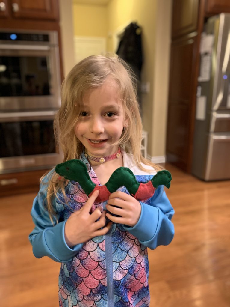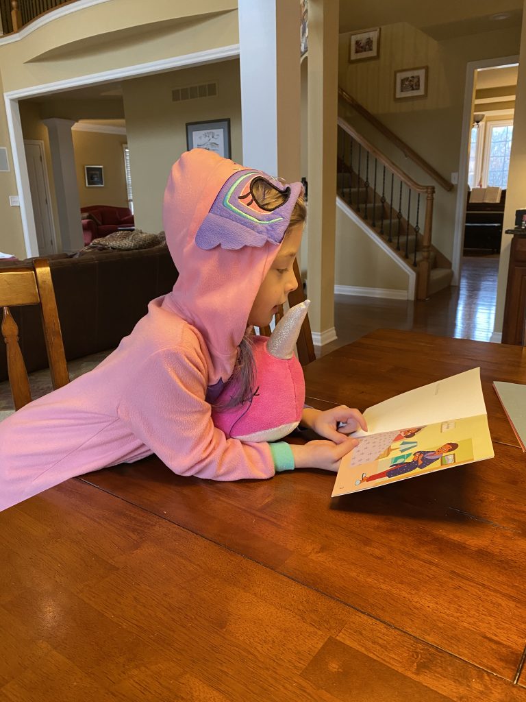 Mrs. Shuart is using photo albums on Member Hub (our school parent portal) to try to engage the kids in activities. On Wednesday she asked everyone to submit a photo of their kindergartner reading to a stuffed animal. Amazingly, when I texted Gabby to take a photo of Amaya she was already sitting at the table reading to her narwal, Leelee.