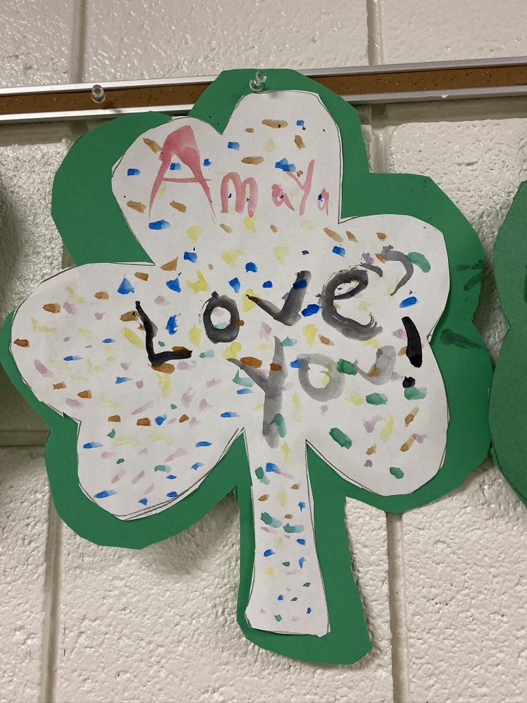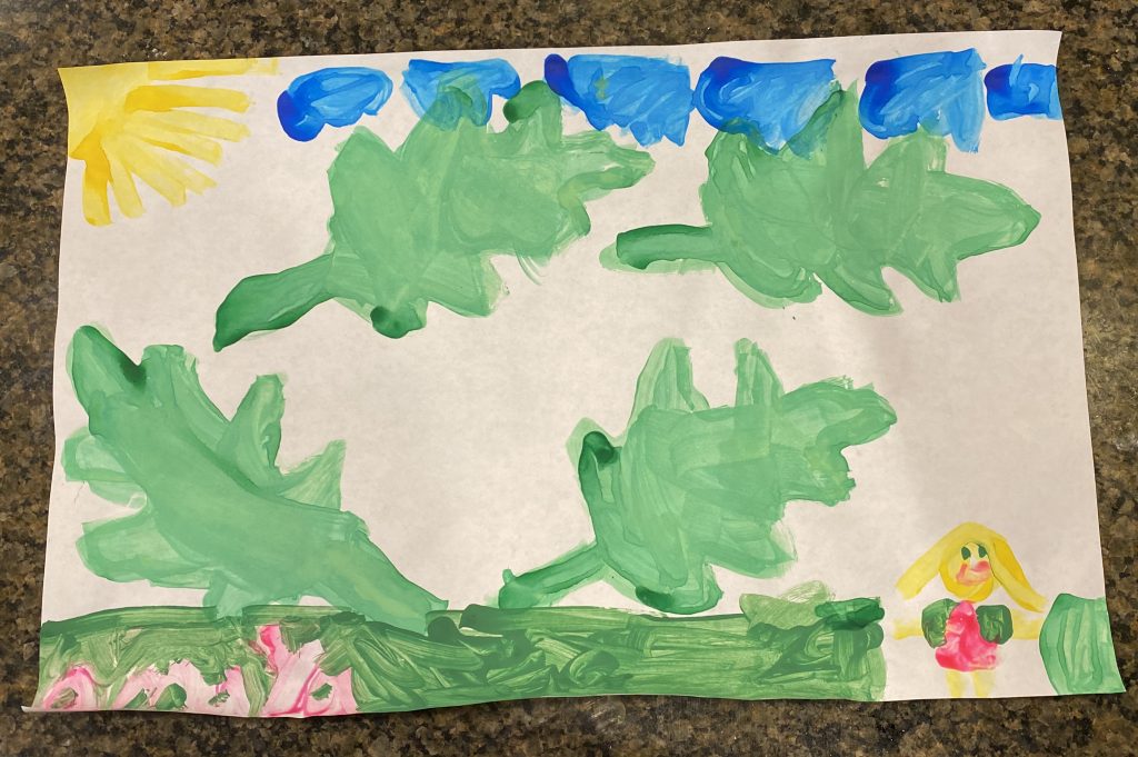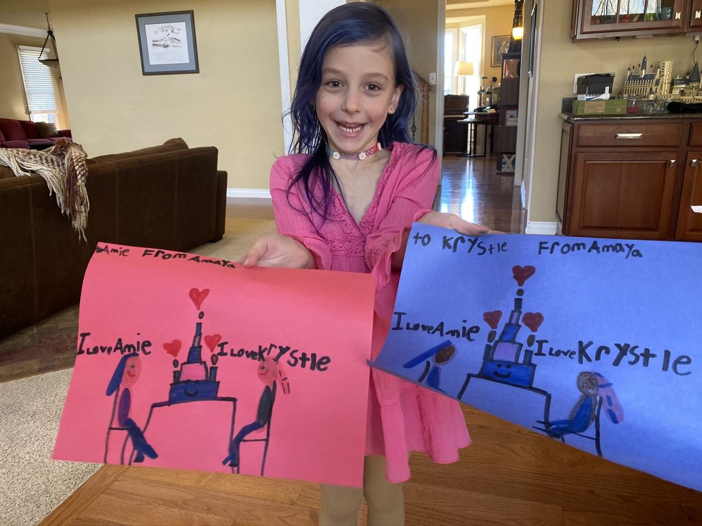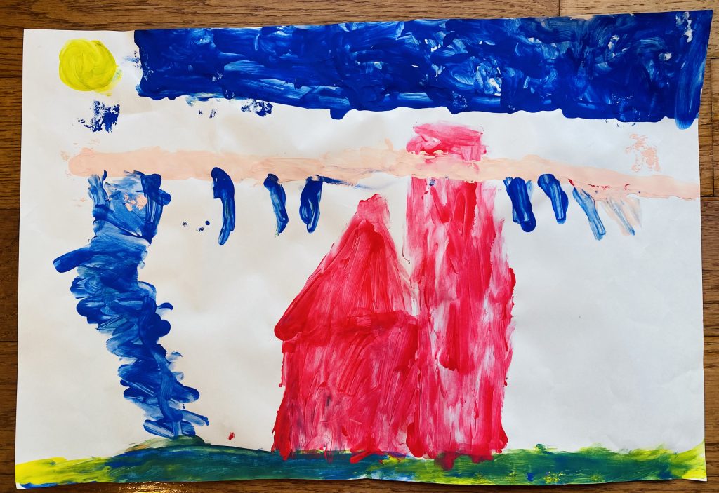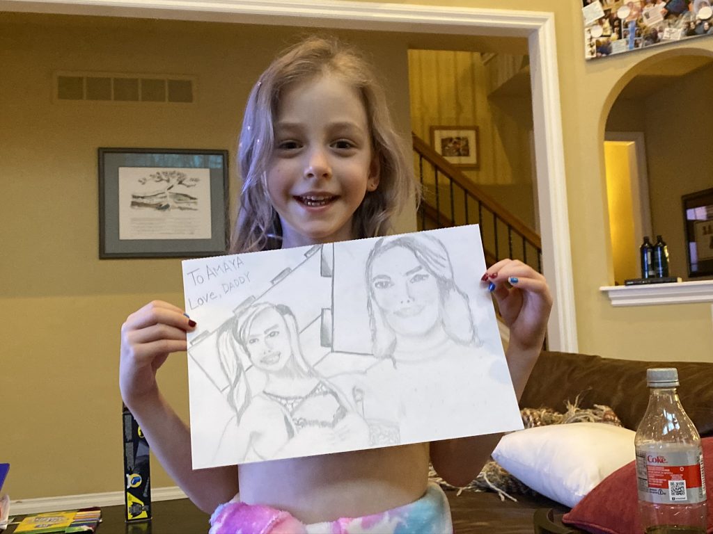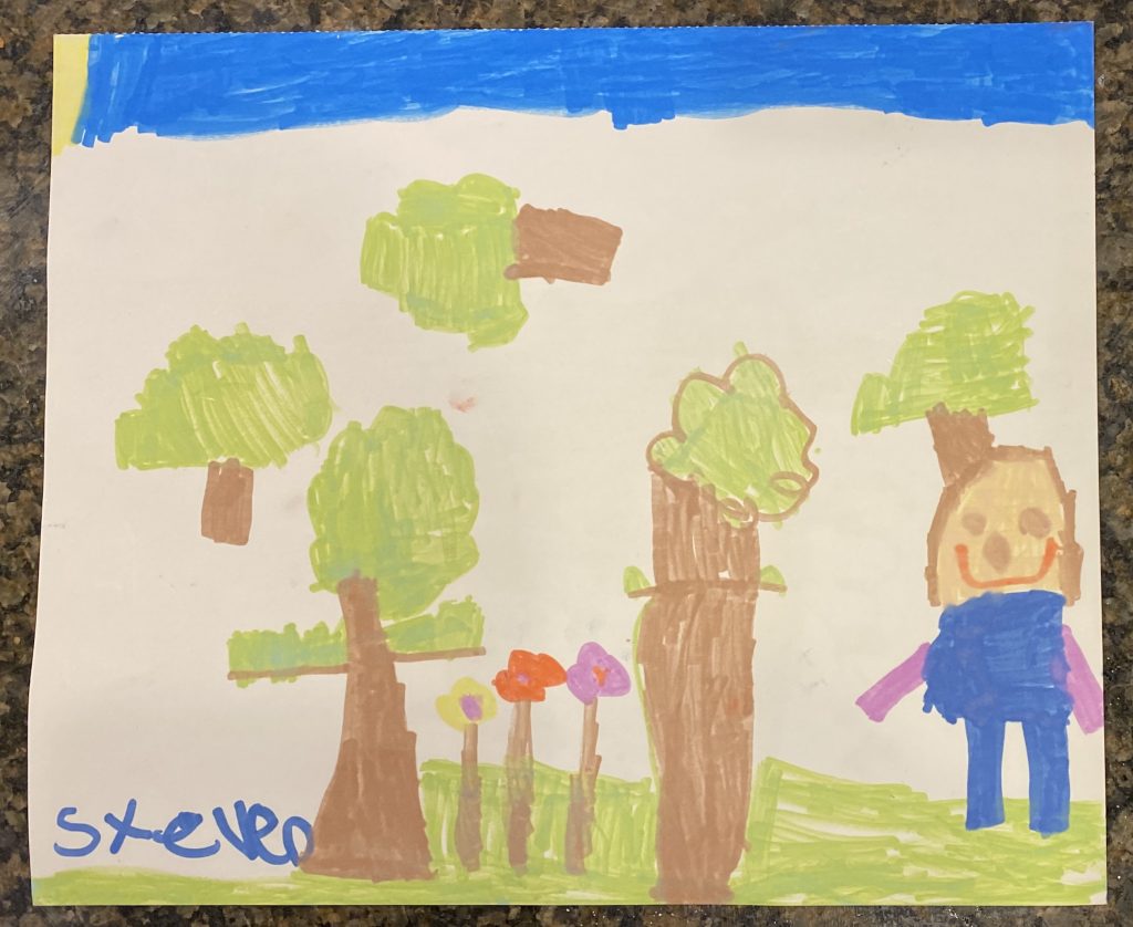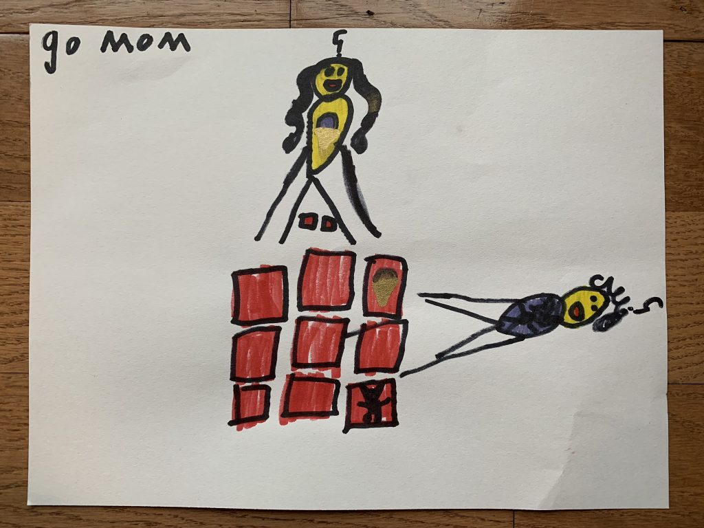 Amaya drew this one today. It’s me playing Memory with Steven. I have two cards, Steven has 0. (Though we ended up tying.) The designs on our shirts match our first match. And we have question marks over our heads because we’re guessing. Go mom.