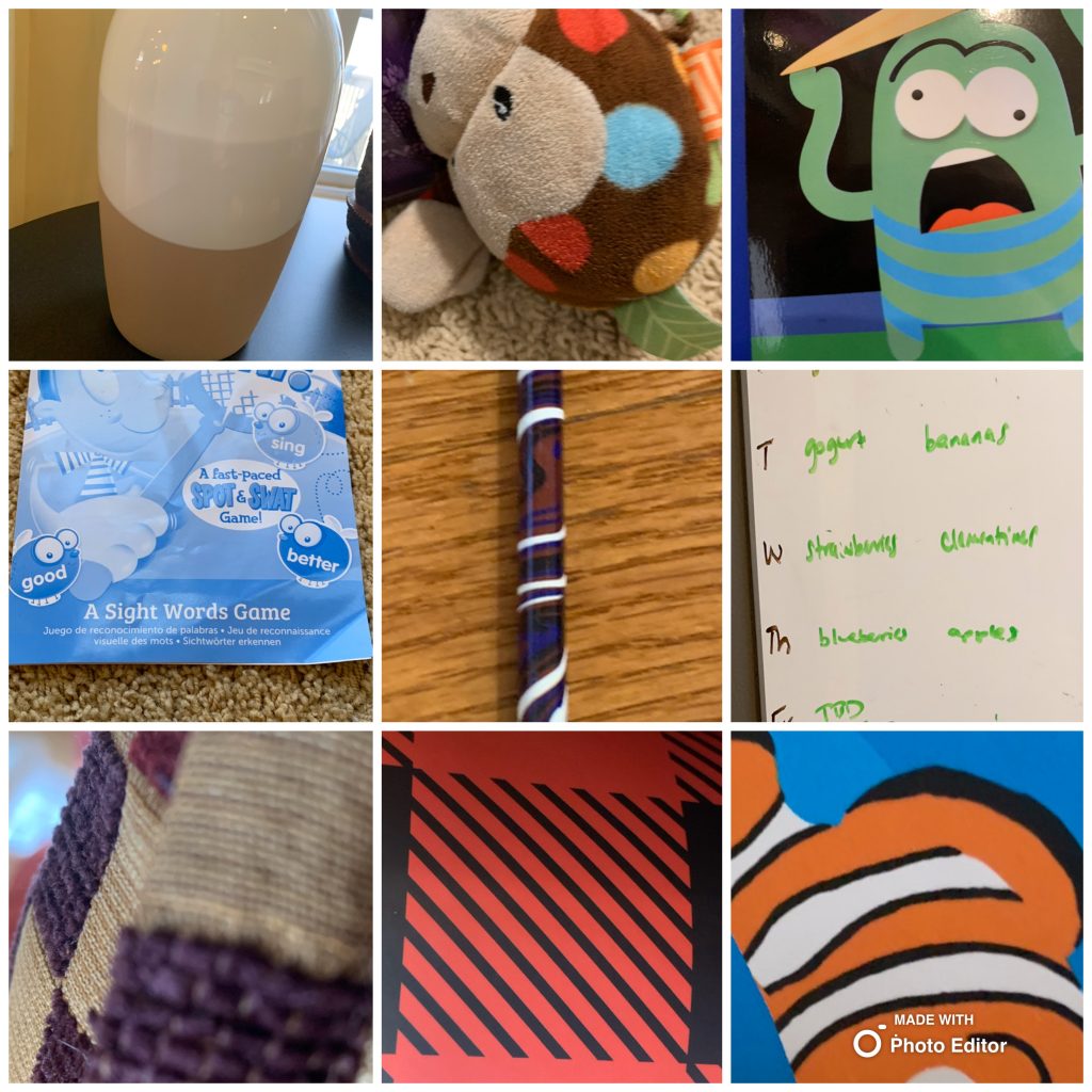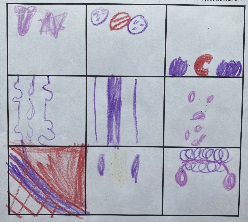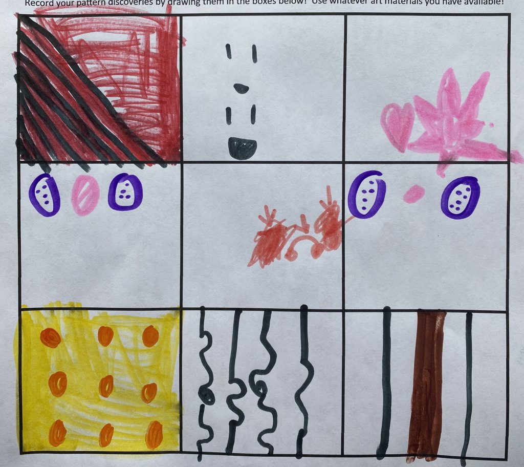 First, they walked around the house and drew patterns that they saw. Then I gave them my phone and let them take photos of the same patterns and made the photos into a matching 9 box.