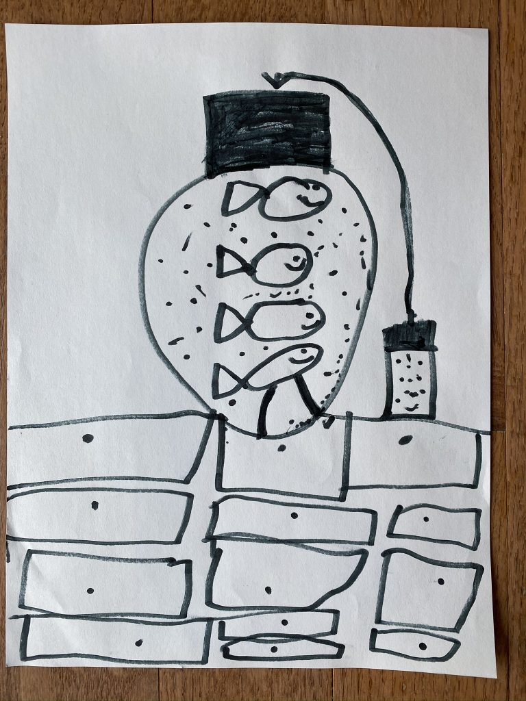Steven drew fish in a fishbowl on Mo’s counter. The one at the bottom is just decoration which you can tell from the sticks holding it to the bottom of the bowl.